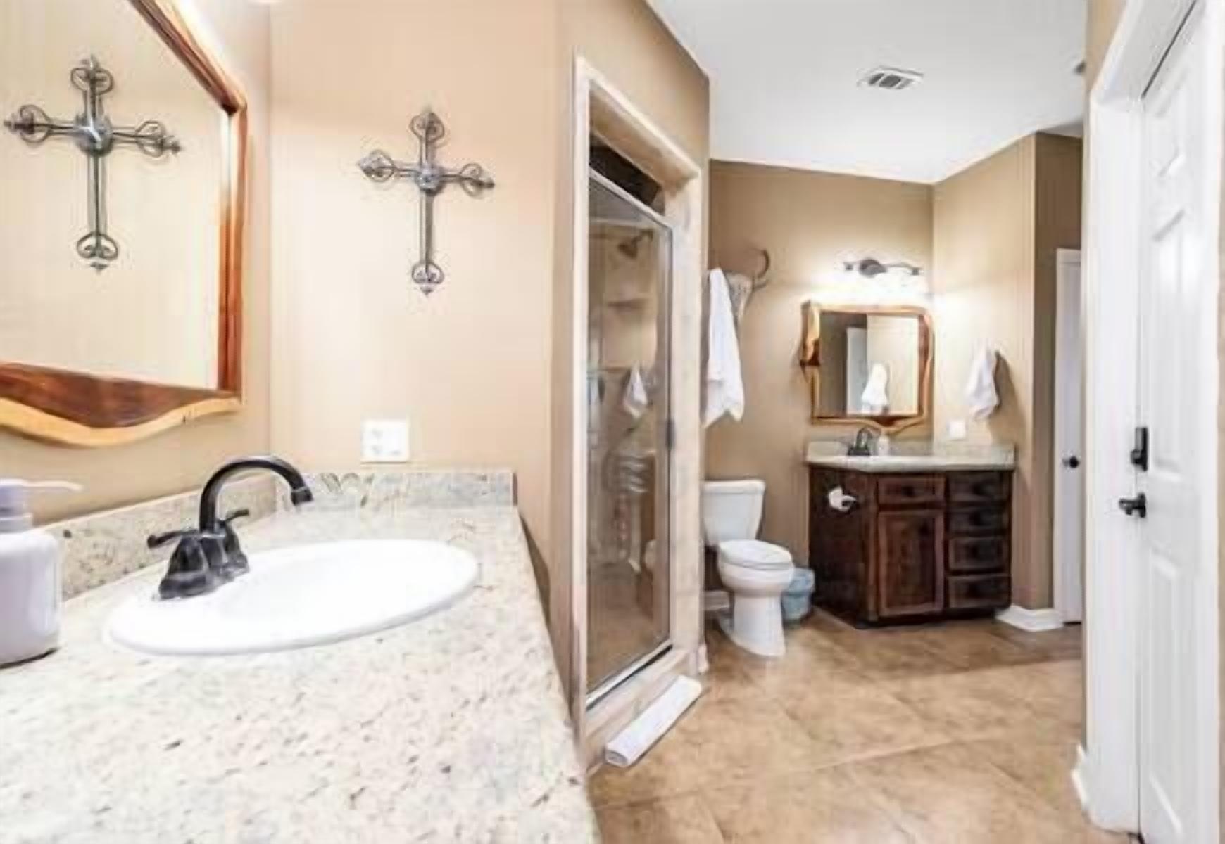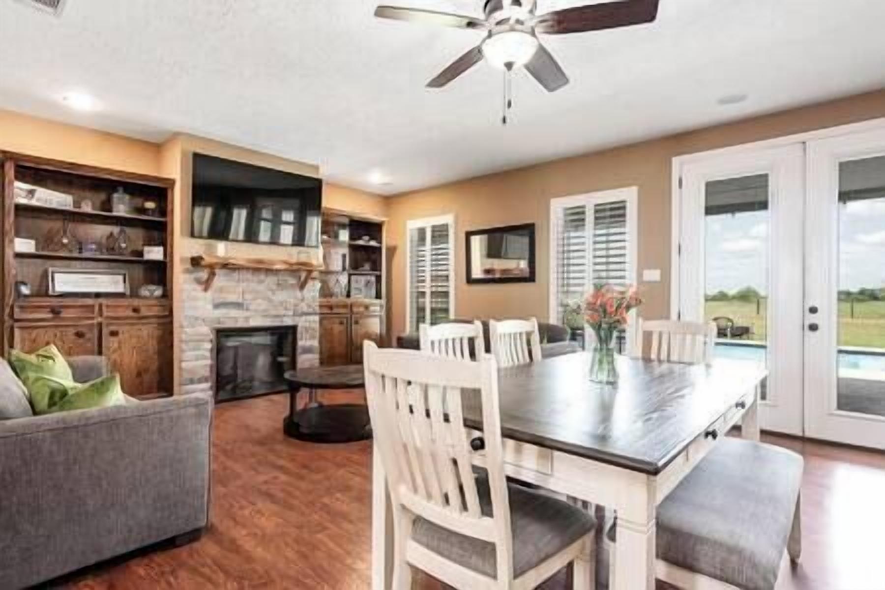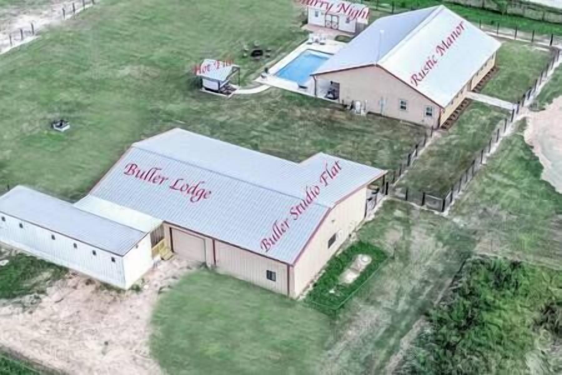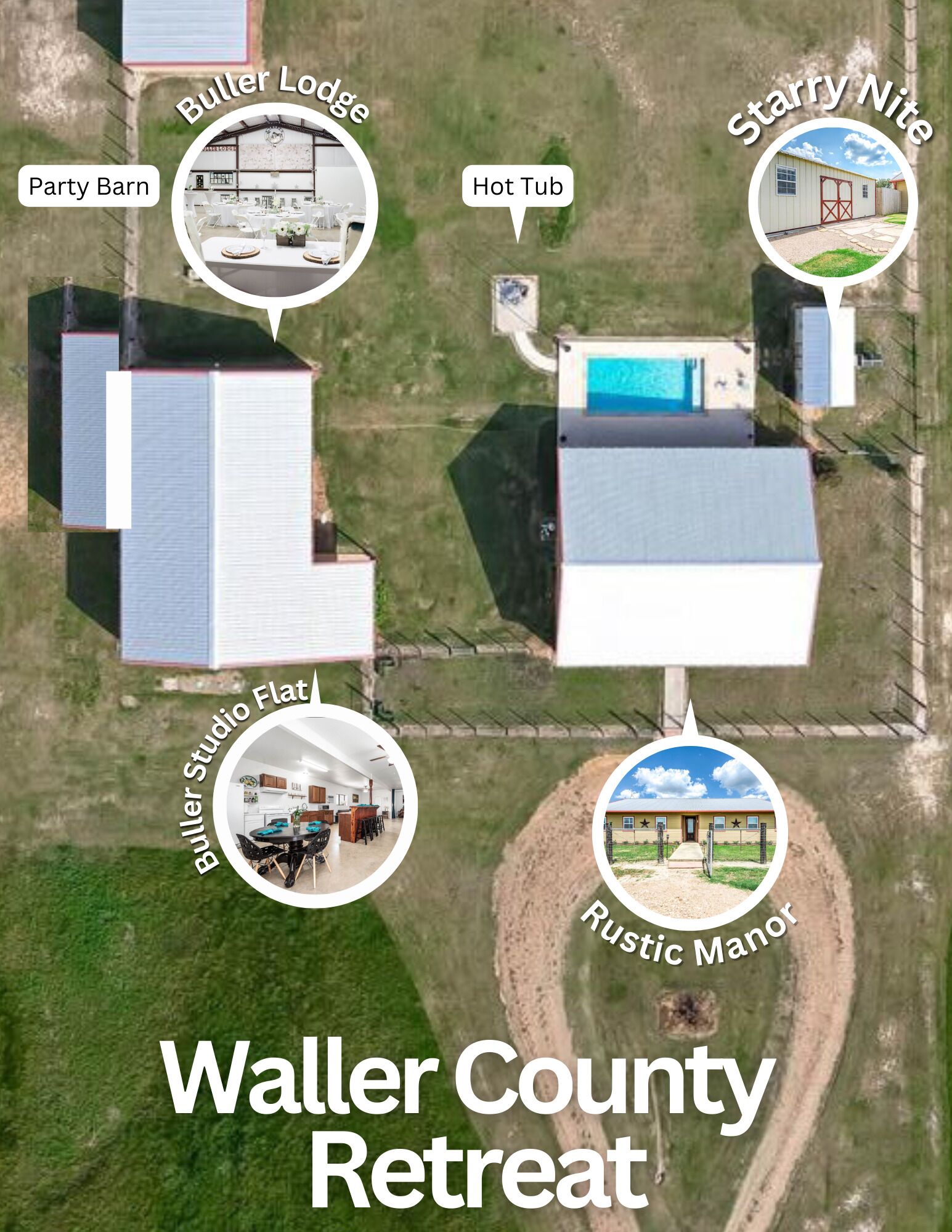 We Have Power & a Pool! Buller Studio Flat, Rustic Manor & Starry Nite Escape the hustle and bustle of the city to enjoy expansive countryside views, serene surroundings, country-life feel and the bright night-time sky. Whether you are looking for a weekend getaway with family and friends or planning that special event, come see why moments become memories at Waller County Retreat. Be inspired, have fun, and relax at Waller County Retreat.The property is a country getaway nestled on 22 acres, perfect for your private gathering or special event. Friend groups, families and corporate retreats will find our location to be the perfect set-up for all kinds of festivities and a relaxing sanctuary from everyday life. Buller Studio Flat, Rustic Manor & Starry Nite accommodates 23+ Guests and all three dwellings are single-story homes which allows every age group to enjoy the entire property with ease and comfort.The Rustic Manor (Main House): The main house has 4 bedrooms/3.5 baths and has one king bed, two queen beds and a bunk bed with two full size beds. The heart of the home features a ranch-style kitchen with an island and bar seating which opens into the living and dining areas giving a spacious and open feel. Entertain and socialize with ease throughout your stay in the versatile and comfortable space. Plantation shutters throughout allow in an abundance of natural light, complimented by double French doors leading to the outdoor pool area. The over-sized utility room with laundry, folding table, hanging rod, large basin sink, and ample custom cabinetry, provides our guests with convenient storage, helping larger groups with efficiency and organization during their stay. This bonus room also has a half bath and private door to the pool area, which enables pool users to keep water in its designated place and out of the main house.There's no doubt that Western films, with their tales of fearless cowboys, horseback riding and homes on the range, have romanticized the classically American way of life—and for good reason. When designing Rustic Manor, we drew inspiration from the work of local artisan Gray Moore, Houston Livestock Show & Rodeo’s photographer, and creator of some of the most iconic imagery ever captured. As the Creative and Special Projects Director with the Harris County Houston Sports Authority, Gray has been given the freedom and support to focus and explore new venues of creativity. Gray’s passion elevates ranch life to a whole new level while blending old-fashioned country with the idyllic, laid-back cosmopolitan charm infused with farming and rancher-style touches.The colossal primary bedroom is fitted with a large walk-in closet, king size bed, interior plantation shudders, 65” TV and an en-suite bathroom which is the ultimate his and hers set-up. Bathroom features include two separate sinks/vanities, shower/tub, a separate standing shower with his and her shower heads, a third rainfall shower head and a built-in sitting space where guests can relax after an active day.The oversized secondary bedroom or in-law suite offers a large walk-in closet, interior plantation shudders, 50” TV and en-suite bathroom.The third bedroom has a comfy queen size bed, plantation shudders and a large walk-in closet.The bunk bedroom has 2 full size beds, 50” TV, interior plantation shudders and a small kid-sized desk for drawing or coloring.The living room has two sleeper sofas (one full & one queen-size).Keep the party going inside and out with a Sonos streaming dual zoned music system that can be run from your phone or tablet. Speakers cover the living/dining areas inside and the covered deck, pool, and hot tub areas outside.Outdoors: Rustic Manor’s covered backyard patio is a focal point. While outside, the lounging area provides hours of enjoyment under the bright blue skies.The backyard comes fully equipped with a cool/spray deck that surrounds the tanning ledge pool, freestanding hot tub, a variety of sitting, lounge and dining furniture, stainless steel propane gas grill, string lighting that extends the length of the patio, marble makeready bar or grill side table and fire-pit which is a great gathering place for storytelling, s’mores, and stargazing while soaking in the breathtaking views of the sunrise and sunsets. This area also overlooks the back pasture and pond which is home to a herd of tenacious Longhorns. These Texas icons are visual art with their flashy multihued hides and impressive headgear.Starry Night (In-Law Suite): Just steps away from the pool connected by a flagstone pathway is Starry Night which is a rustic retreat that allows for additional housing and privacy between Guests. The freestanding dwelling is perfect for older kids, parents with a baby or family/friends who appreciate a separate space to retreat from the main house. Starry Nite has a full bathroom with tub/shower, 50” TV and sleeps 4, if utilizing the queen bed and a full-size sleeper sofa.Buller Studio Flat: Traditional western and native artwork provide a homespun vibe in the spacious guest quarters. The space has a full kitchen, island with bar seating, 2 couches that are sleeper sofas, 65” TV and a full bathroom with closet rack and a dresser for extra storage. 5 can sleep comfortably, if utilizing the queen bed, twin trundle, and twin-size sleeper sofa.Clients can also utilize the space as a large catering prep kitchen. The caterers/wait staff can prep in, serve from, and or store food, drinks, and party materials. Space can also serve as a VIP or Bride/Groom’s room. Additionally, Buller Studio Flat’s space is available to rent for smaller Events.Buller Lodge (Facility/Event Venue): Perfect backdrop for all types of events, large and small. The countryside hideaway has indoor and outdoor options. In this genuine rustic, all-American setting, your Guests will experience a modern take on Western style while enjoying the country charm and comforts of Waller County Retreat. Ame