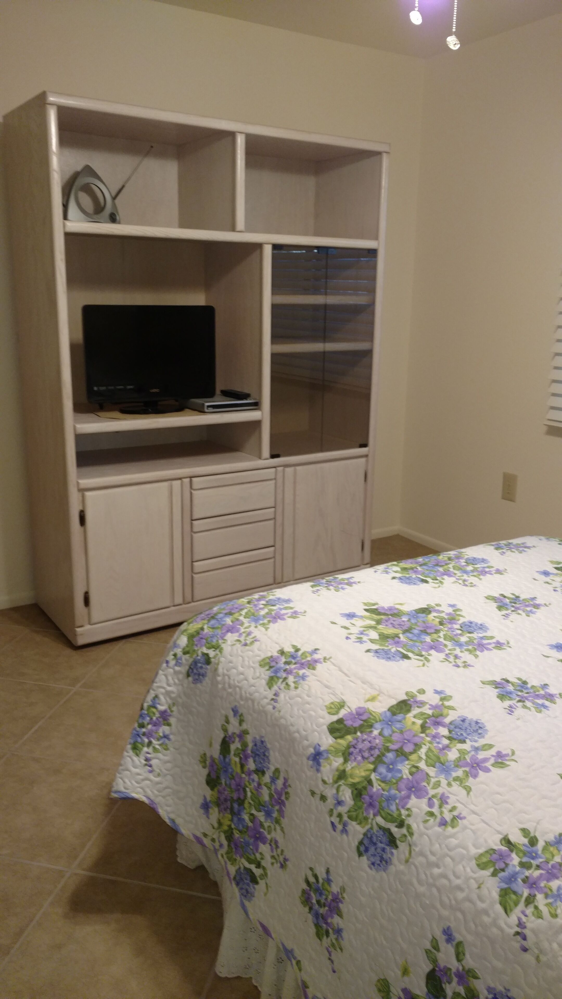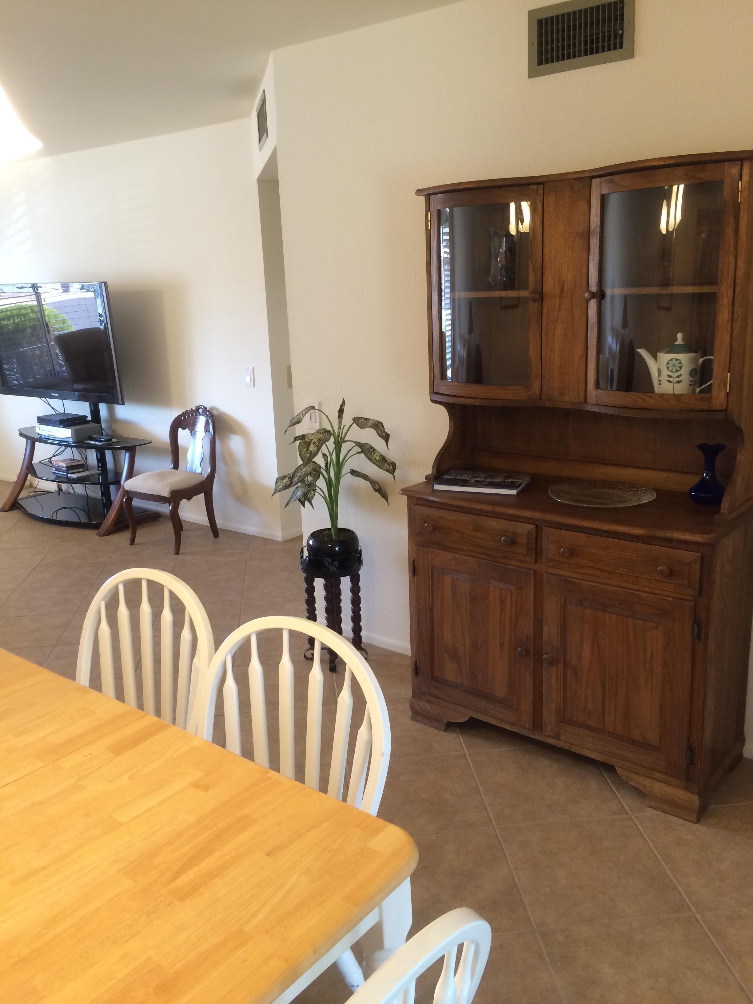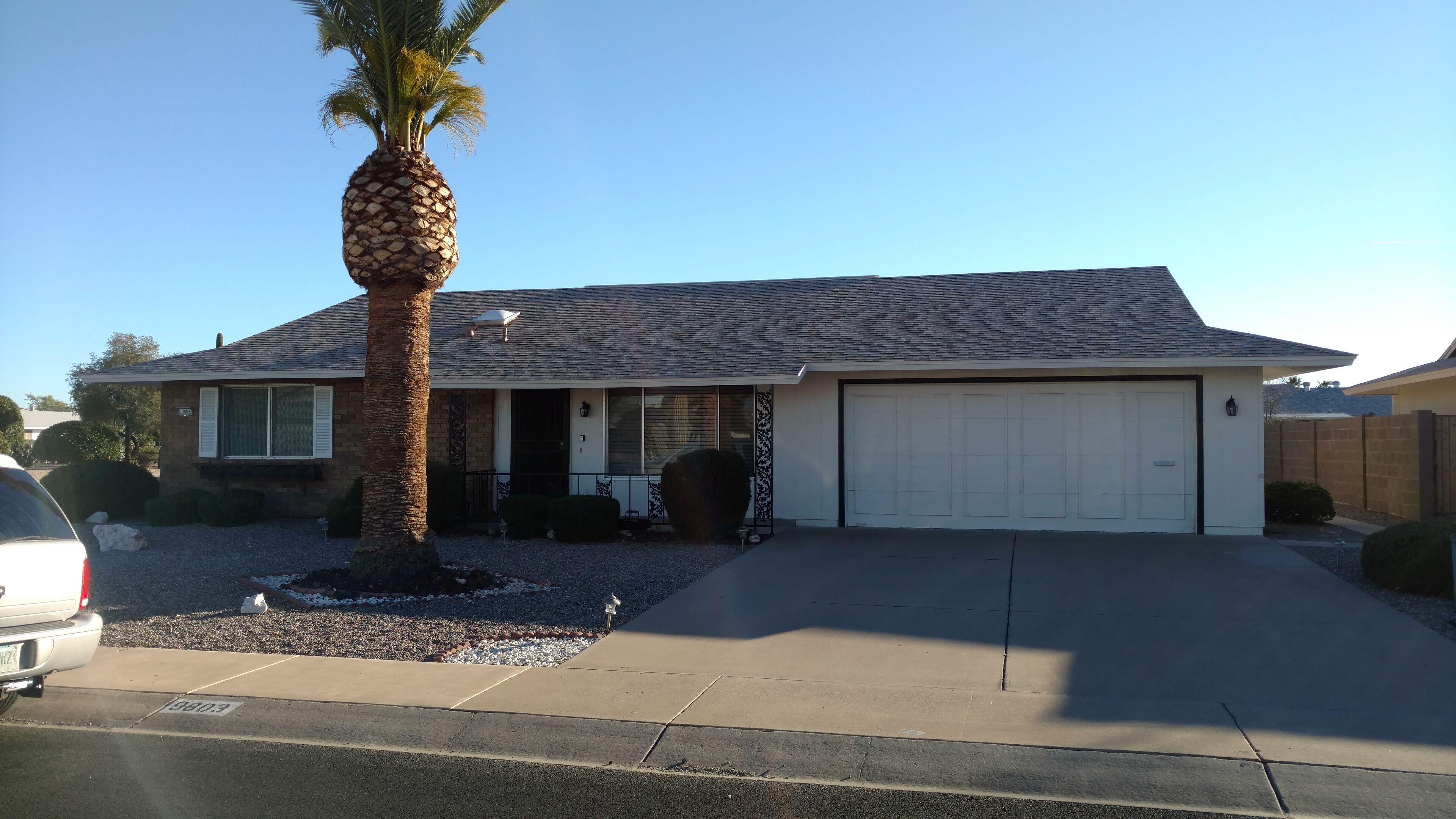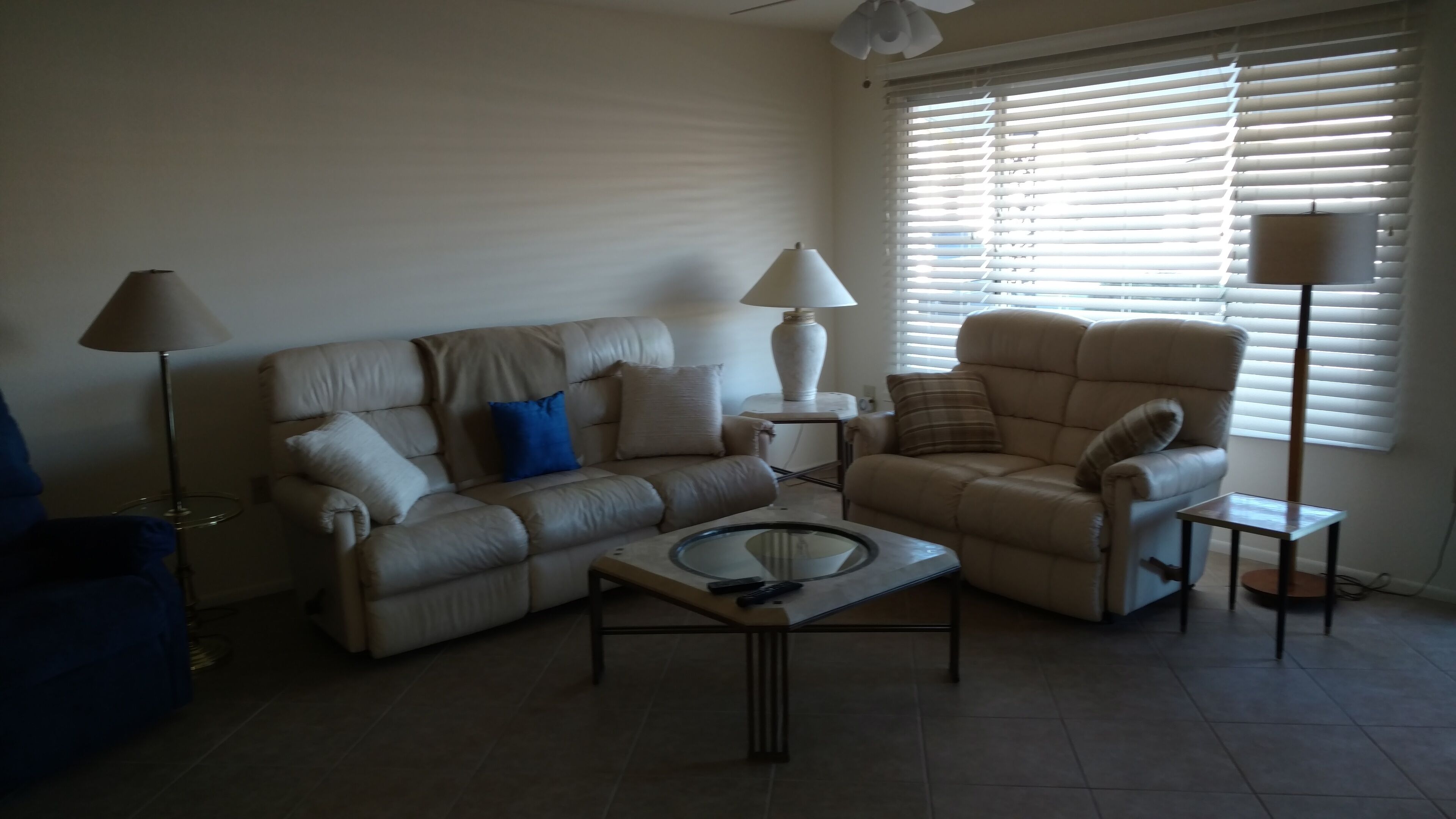 Nice quiet getaway home in Sun City! This fabulous 2 bedroom, 2 bathroom house with sun-room, 2 car garage, and spacious laundry room with washer/dryer and wash basin, with additional sleeping space, is available to you. The house has been updated with new flooring (tile), painted walls, ceilings, and doors, as well as new window blinds, and new ceiling fans. This house sits on an over-sized, quiet, corner lot and has a large covered patio with outdoor furniture and a propane BBQ grill. This house also comes fully furnished with a king size bed in the master and full size bed in the spacious guest room, and both rooms have walk-in closets. The kitchen is fully loaded with all your needs, including refrigerator, oven, microwave, blender, toaster, toaster oven, crock pot, coffee maker, and much much more. This home also has a two-car garage . The bar area has all your bar-ware needs(except the alcohol). This relaxing home is ready for you with central a/c and heating. Your stay includes flat-panel televisions, cable, high-speed internet, water, trash service, and electricity. A gas golf cart ready for the street, or course, is available for a nominal fee.