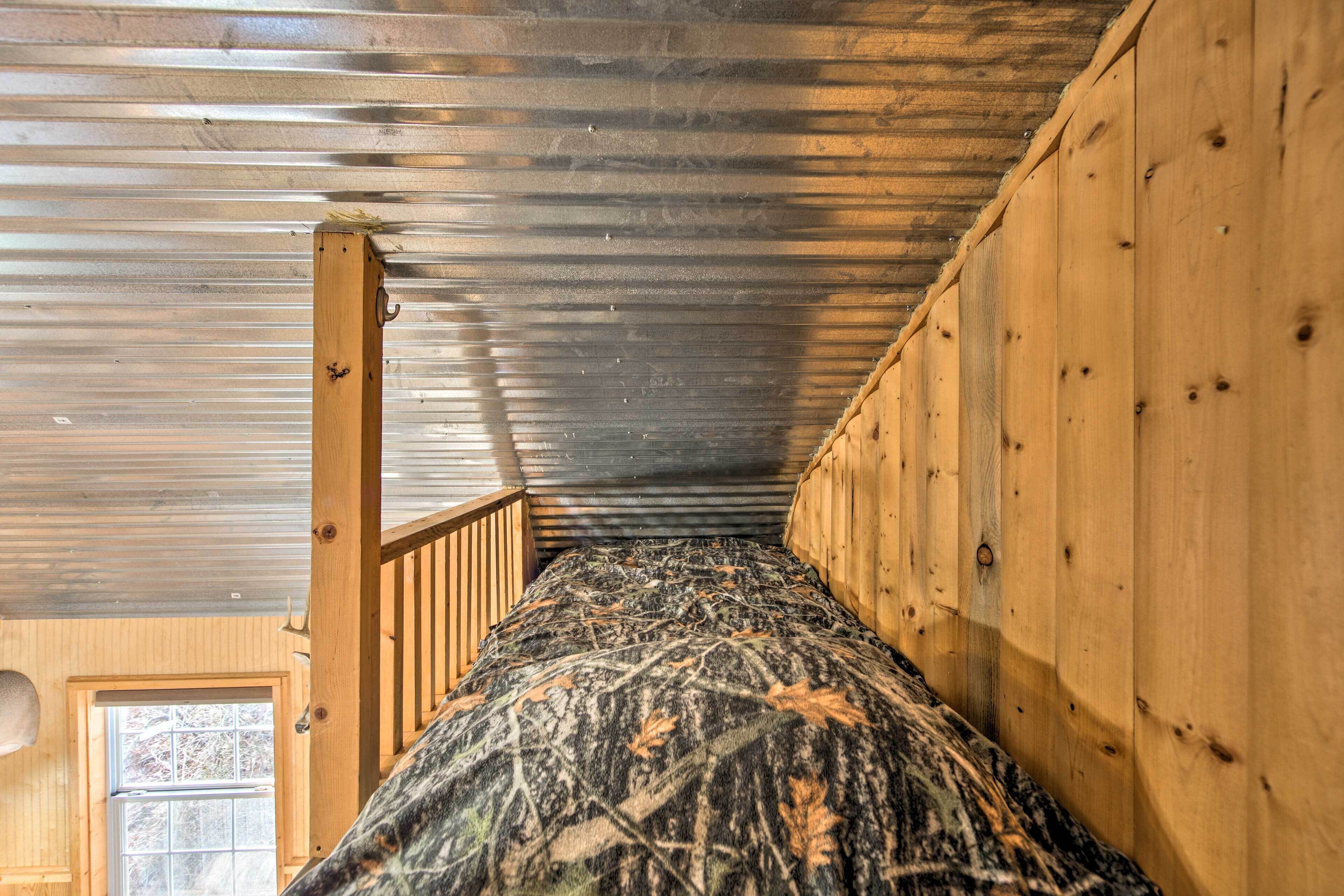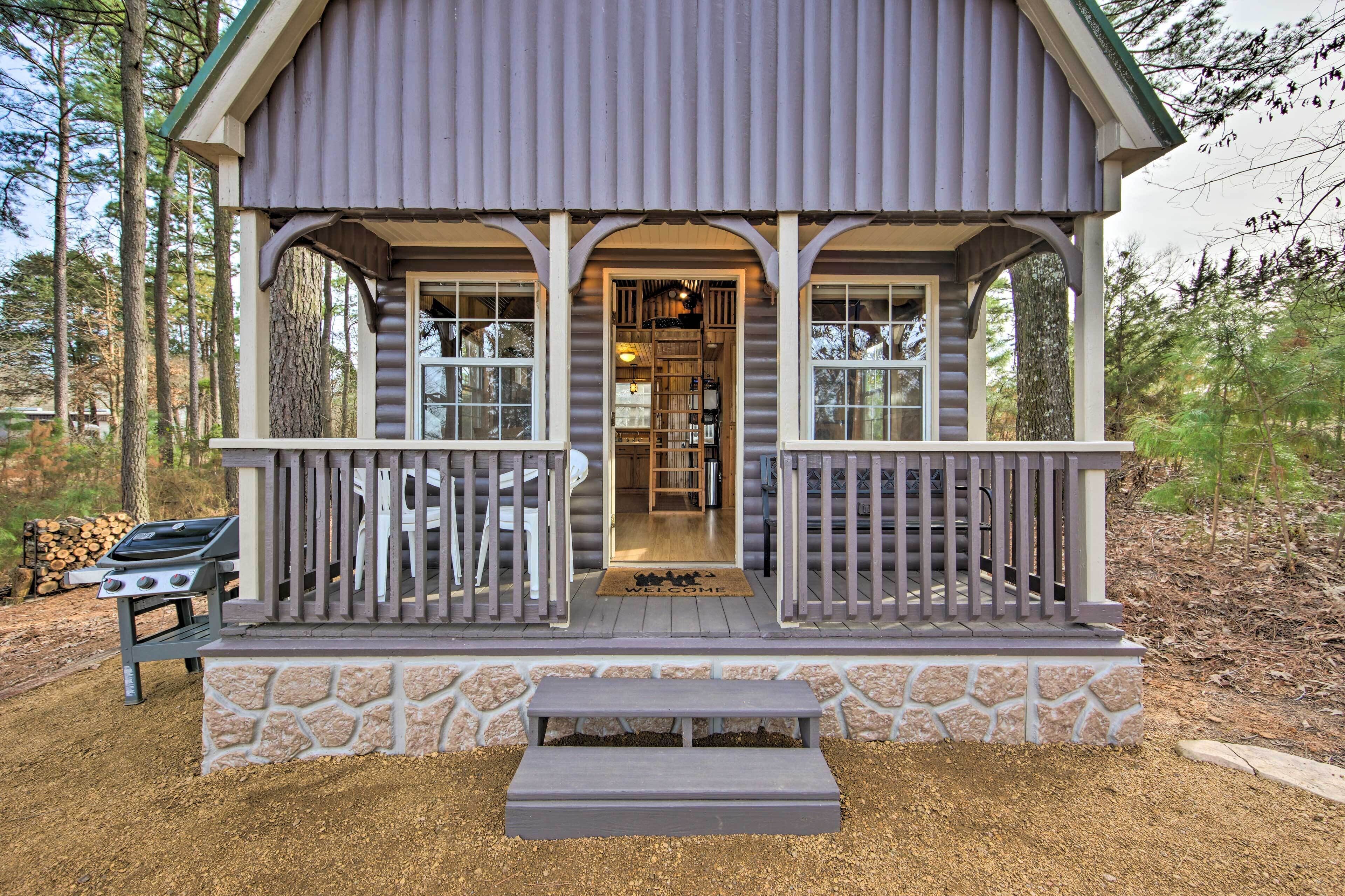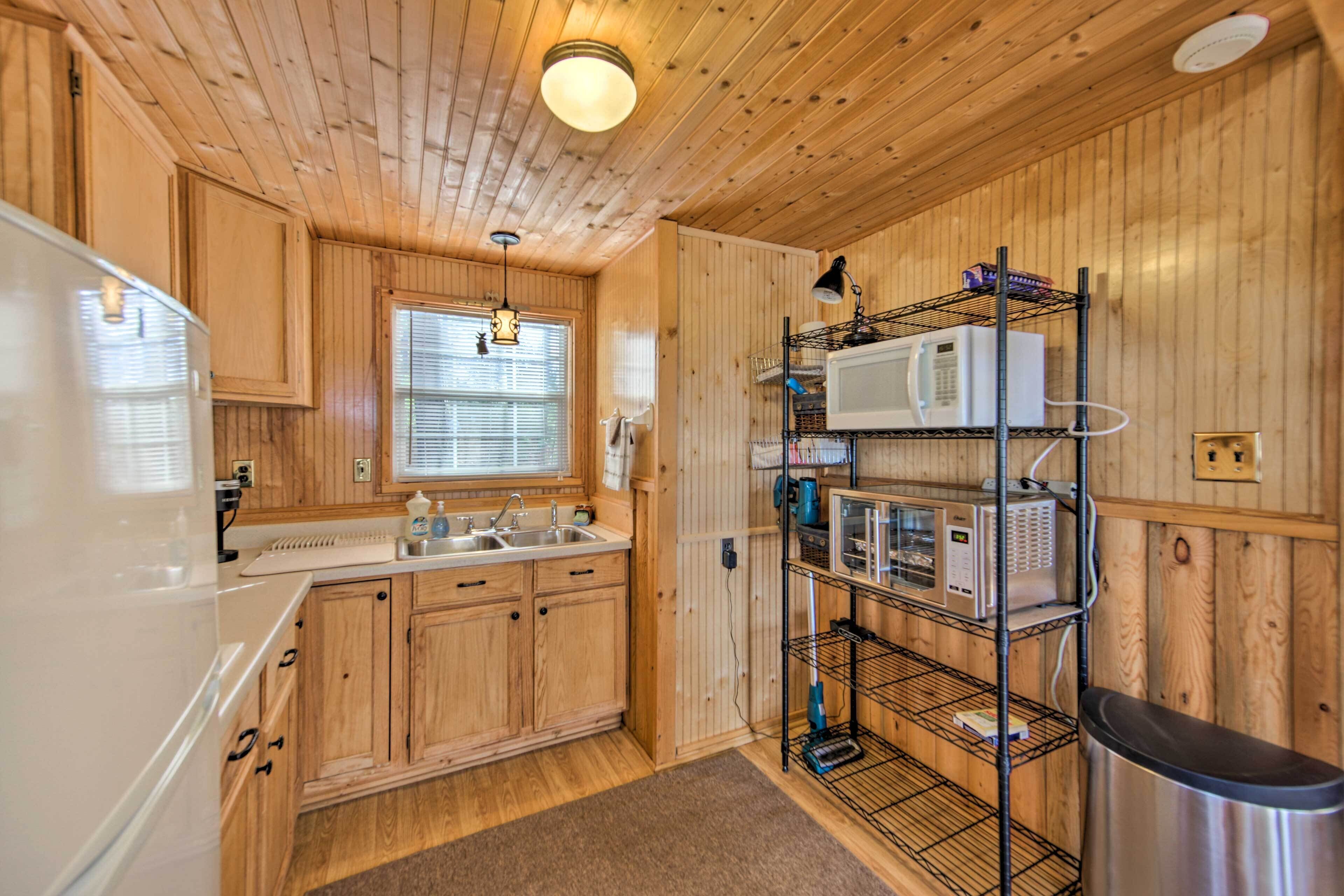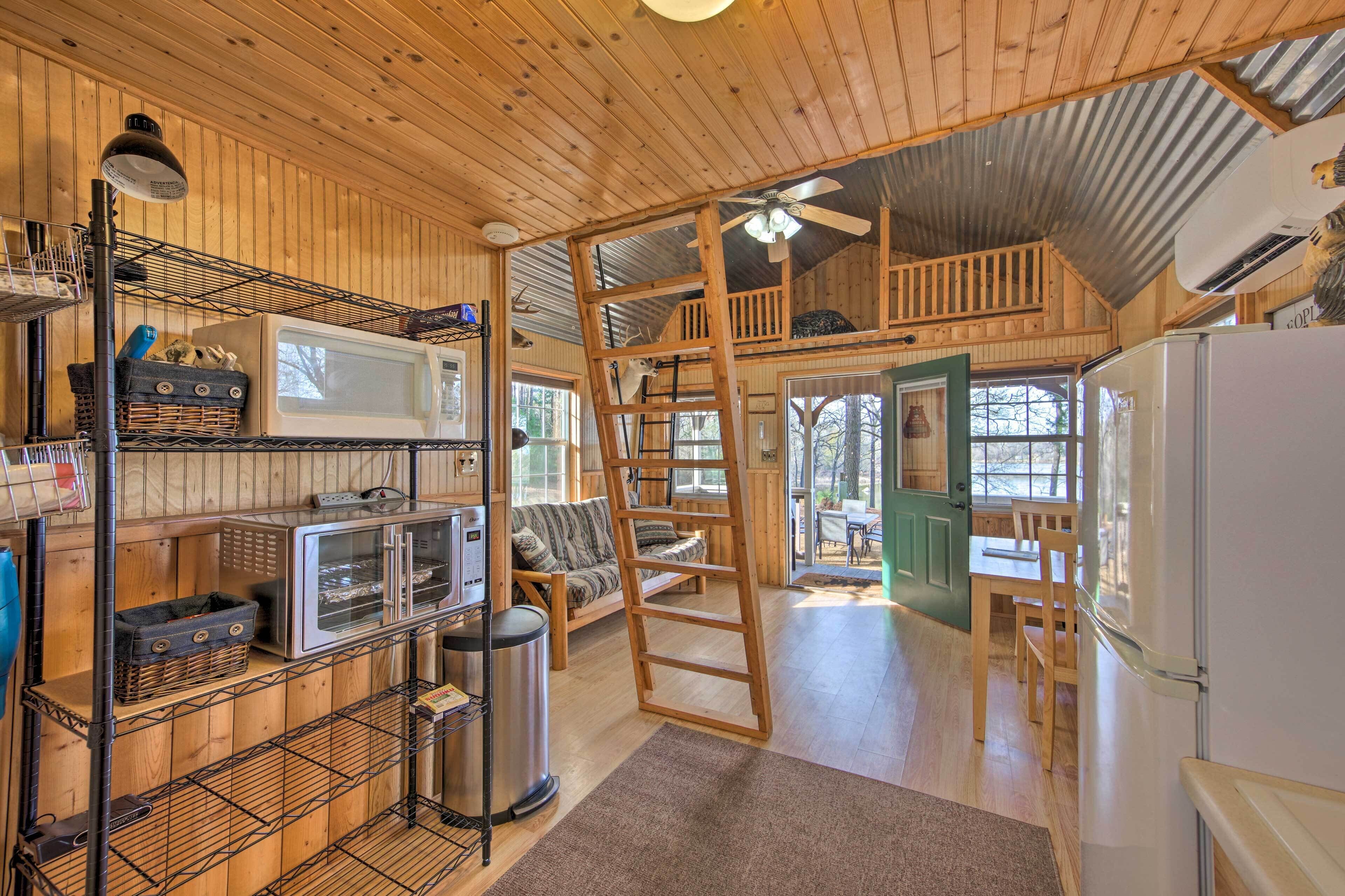 Lakefront Cabin w/ 2 Lofts, Boats on 4 Acres From hosting afternoon picnics to making memories on the water, this lakefront vacation rental has everything you need for a blissful stay! Situated on 4+ acres, this 1-bathroom studio comes complete with a wood-burning fire pit, a gas grill, and 2 additional sleeping lofts for extra space. Cruise around the lake in the provided kayaks, enjoy fishing of...