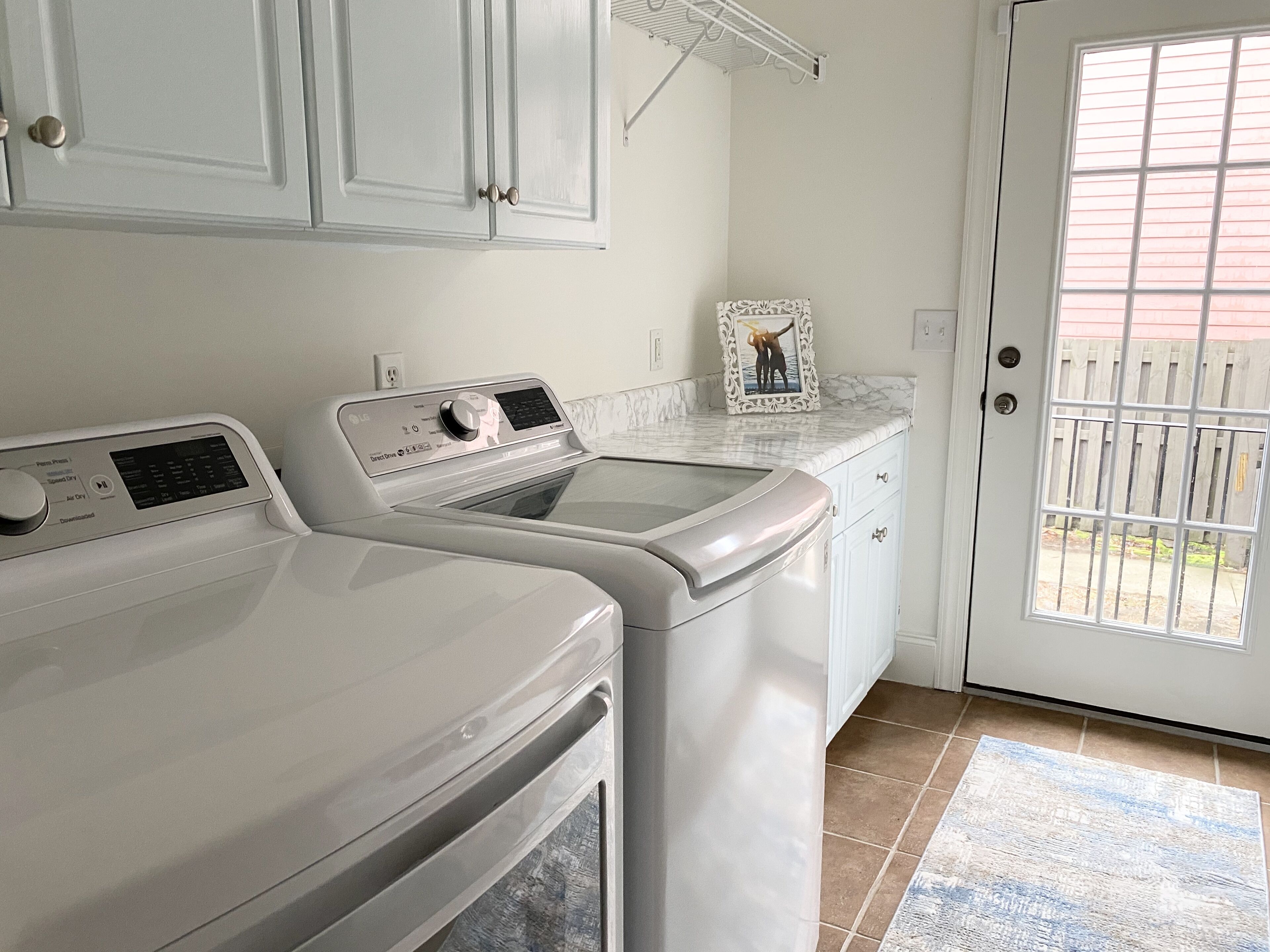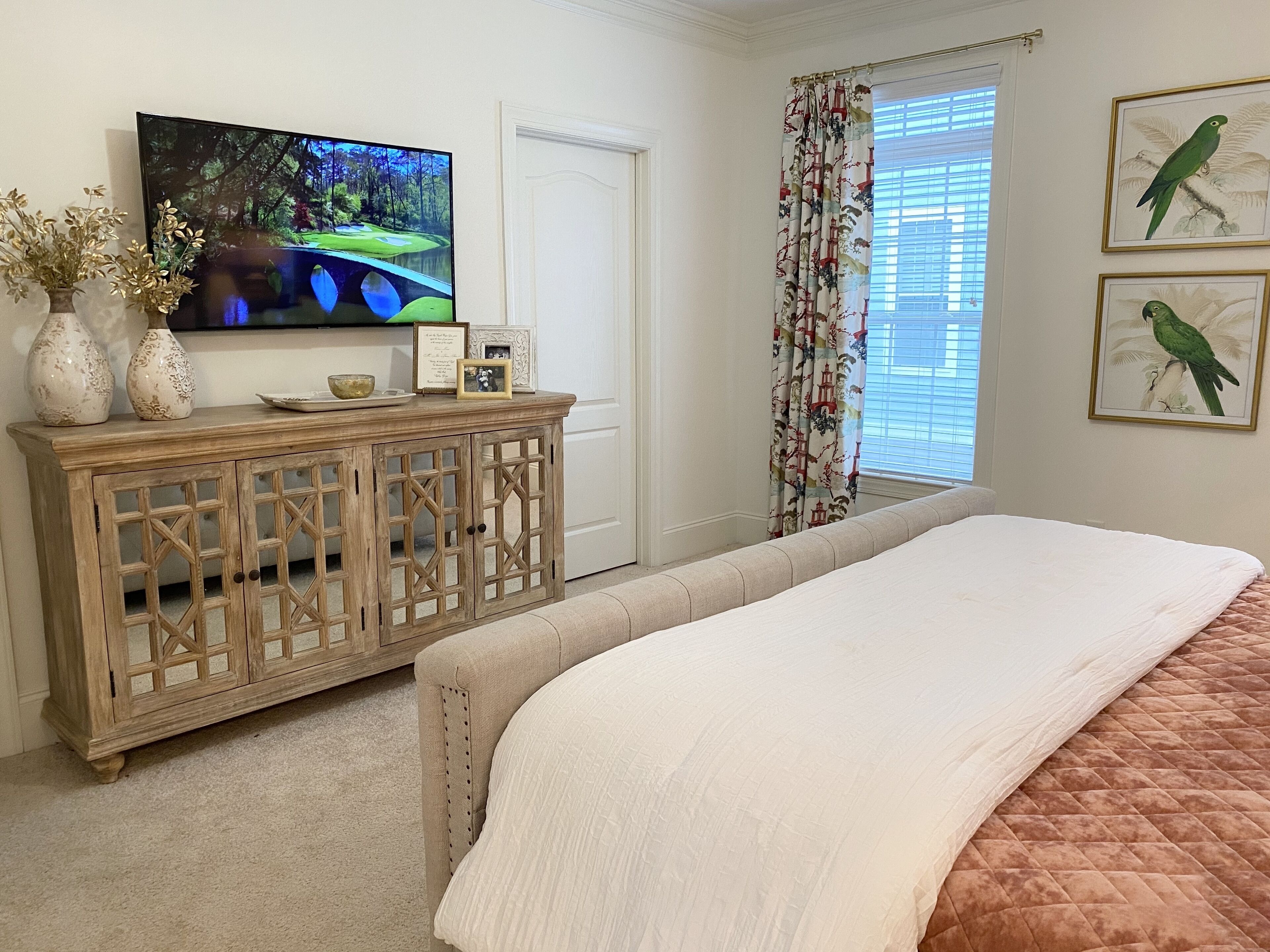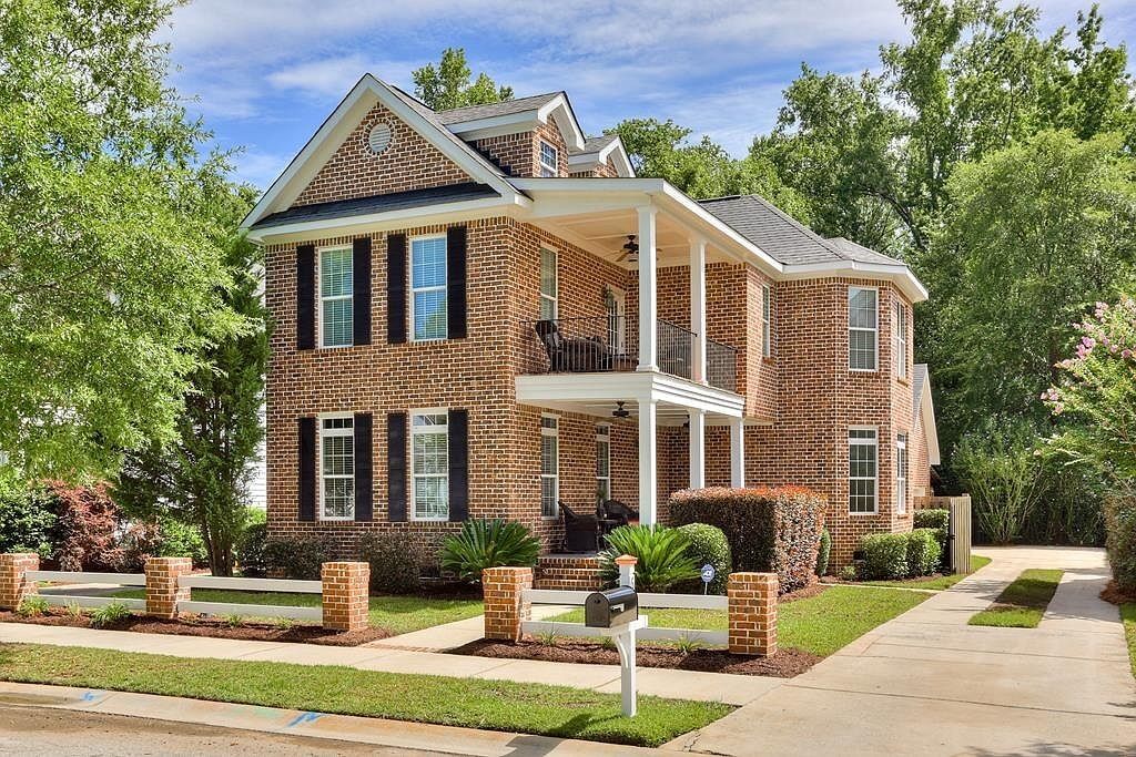 Masters & Women’s Amateur Rental Located in the popular Mitchell Park neighborhood of Riverwood Plantation! All brick, 2-story Charleston-style home with detached 2-car garage in rear and view of the 1 acre park across the street. MAIN LEVEL open floor plan boasts a beautiful living room with tons of natural light, spacious dining room, new hardwood floors throughout, and kitchen with NEW quartz countertops/tile backsplash/stainless steel appliances and peninsula island. Also on main level - Owner's suite with a king bed, updated bathroom, laundry room w/ pedestrian entrance, and 1/2 bath. UPPER LEVEL has 3 generously sized bedrooms and 2 bathrooms - one bedroom with queen bed and a private, attached bath. Second bedroom with Queen bed and a couch. Third bedroom has Queen bed and is next to upstairs patio. Full hall bathroom with a two-sink vanity included upstairs. Side porches located on main level and upper level overlook the park space. Covered patio in back with fully fenced, private yard. Walking distance to Women’s Amateur Tournament and 12.5 miles from Augusta National gates. Golf Cart included and can be ridden to Publix supermarket and local restaurants at neighborhood entrance.