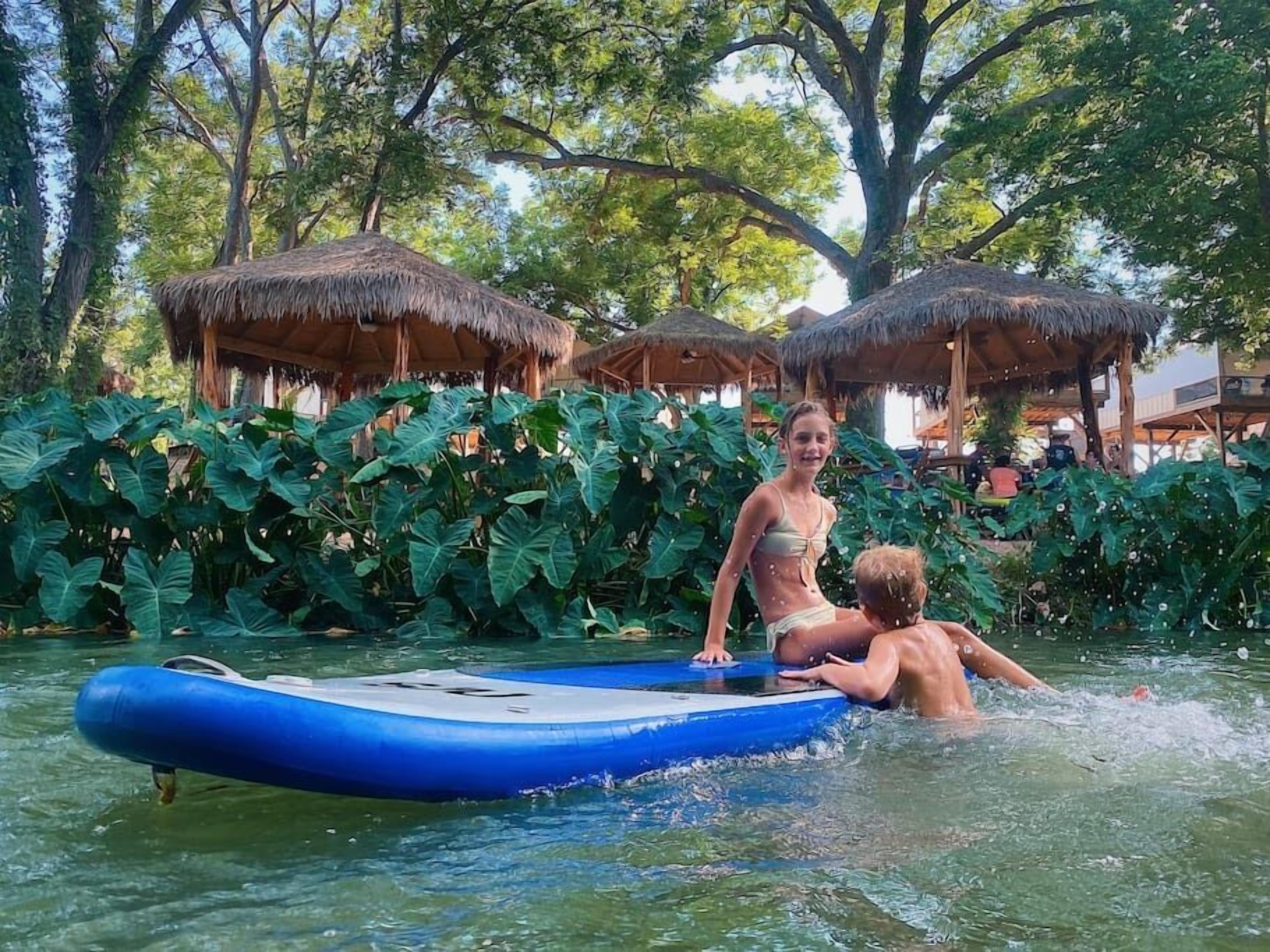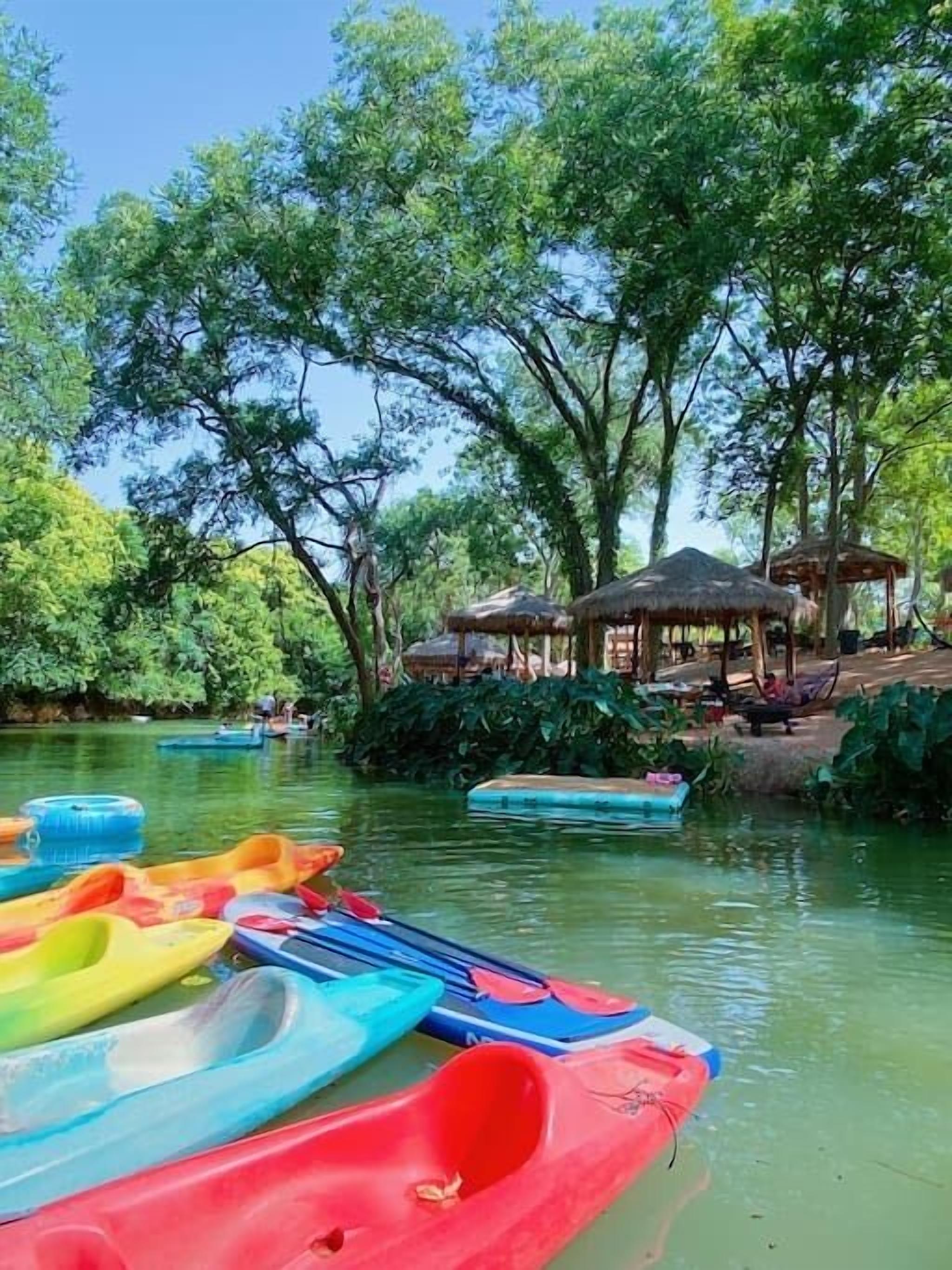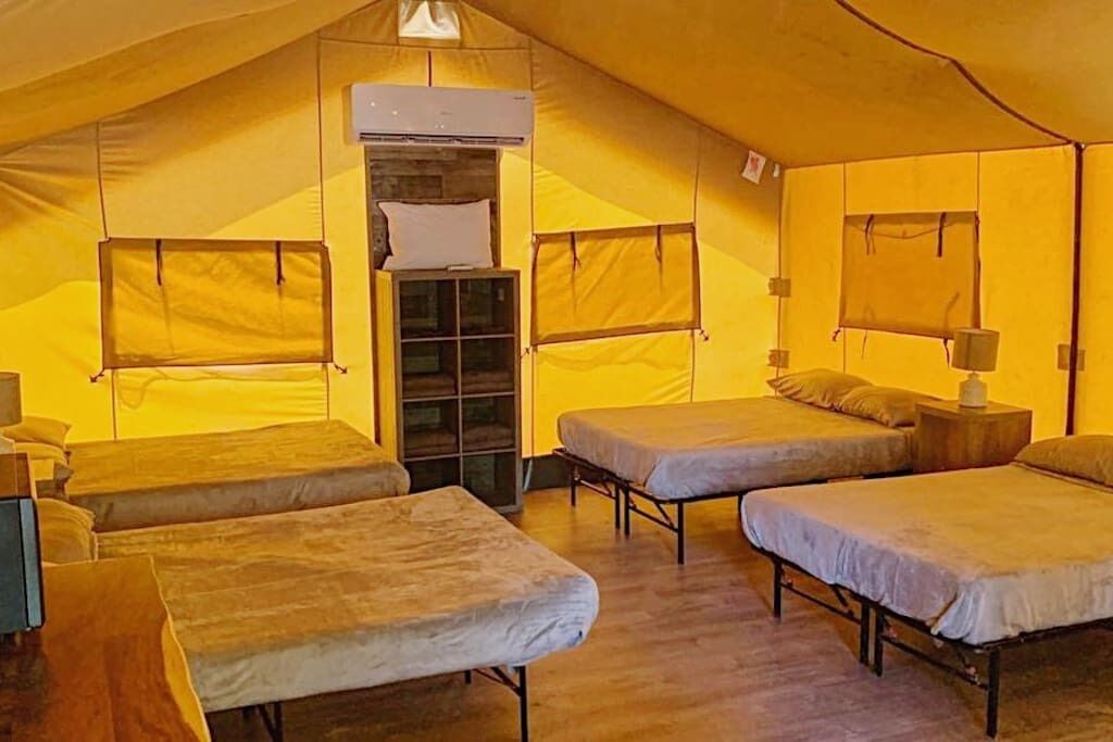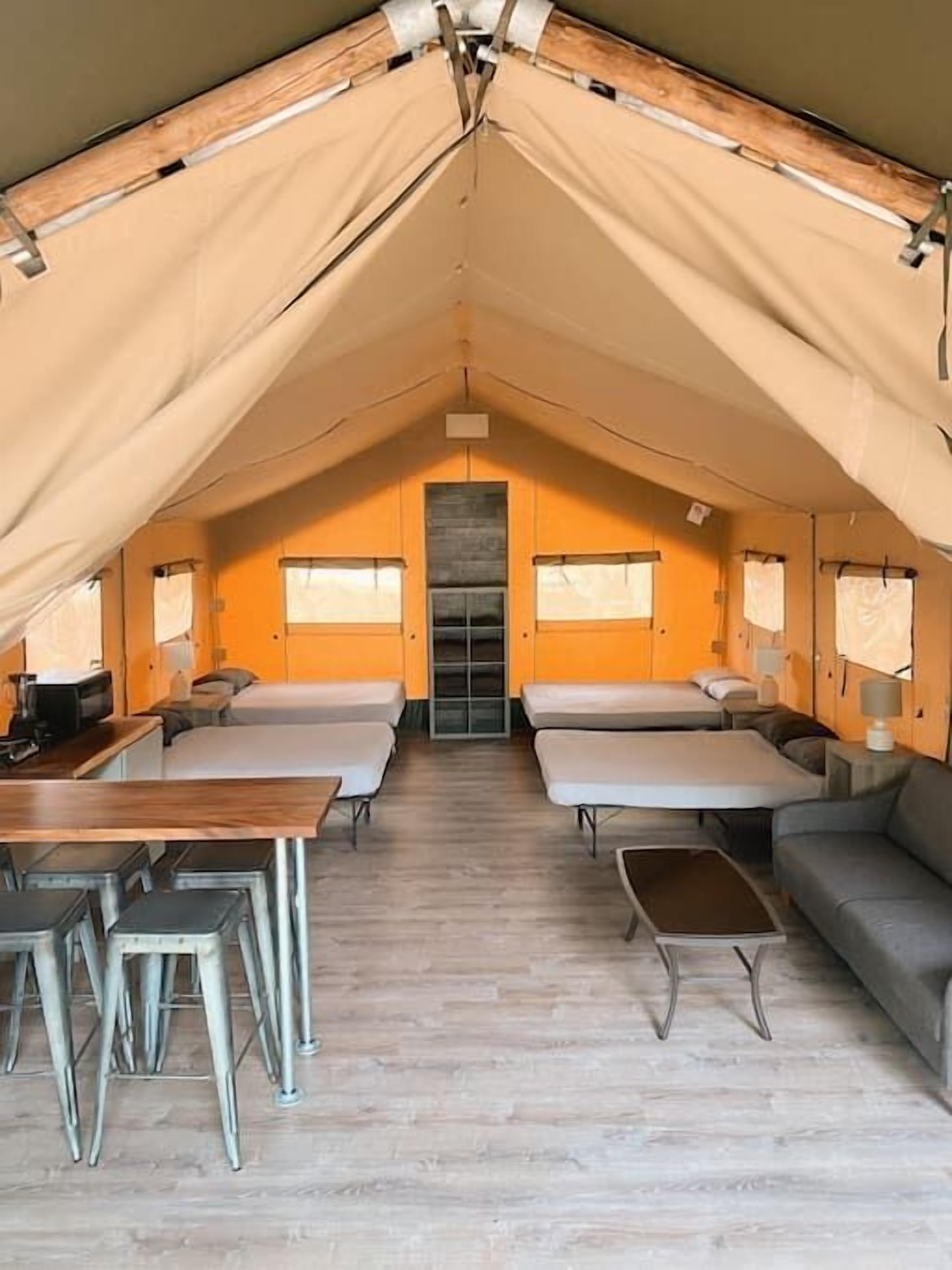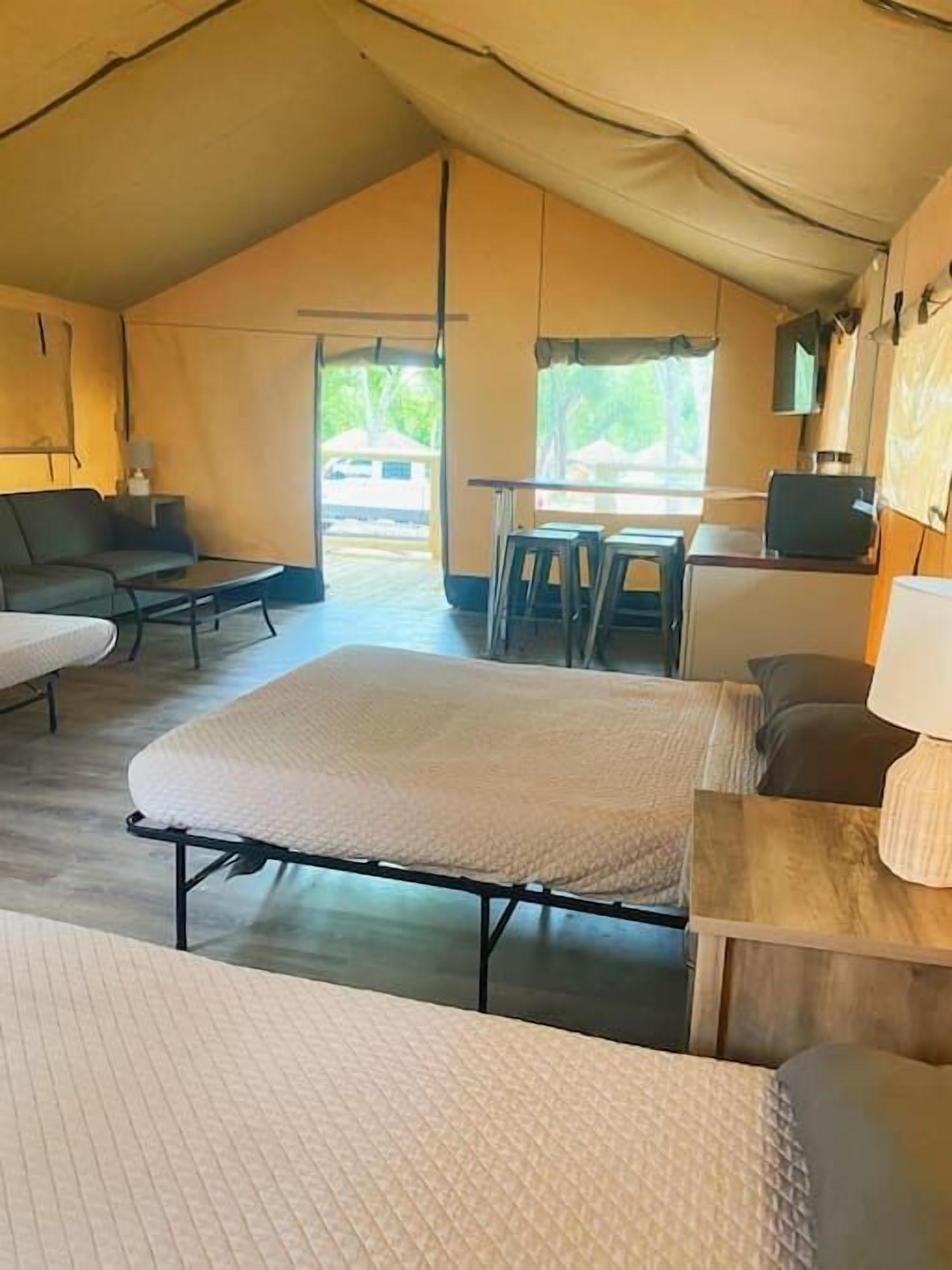 #17 Son's Rio Cibolo Safari Cabin With a Safari Tent Cabin rental, you & your guests will enjoy the beautiful scenery & peacefulness of Son’s Rio Cibolo which features 2 miles of the gorgeous Rio Cibolo Creek with its blue spring water, and tons of activities including kayaking, paddleboarding, fishing, swimming & more!! After a fun filled day, sit ‘round the campfire at night & gaze at the big, bright, Texas starry sky! We are surrounded by large ranches which makes for a great outdoor get away from it all experience! Our Safari Tents Cabins are fully furnished, air-conditioned/heated and have everything you need to stay comfortable including foam mattress beds, linens and towels, kitchenette, comfortable outdoor furniture, hammock, firepit, bbq pit & more! If you want to enjoy the great Texas outdoors without the setup and hassle of tent camping, while having all the creature comforts of home, our Safari Tents are for you! Safari Tent Cabins come with: 4 full sized beds with foam mattress and a futon couch. They also feature a kitchenette with mini fridge, coffee maker, hot plate with pots and pans and blender. We do not provide silverware and dinnerware, so be sure to bring these, though linens and towels are provided. For inside entertainment and relaxation, guests will find a smart TV, WiFi & DVD player. Outdoor amenities include: comfortable wicker seating, hammocks, fire-pits, BBQ pits, picnic table, outdoor lighting, water and electricity. The unique design of our Safari Tent Cabin allows you to open up the entire back wall to enjoy an indoor/outdoor living experience, perfect for eating, relaxing and reconnecting with your friends and family. There are 2 - 6-station bathroom trailers by our Safari Tent Cabins (12 lockable, private, full bathrooms in total with hot showers) for your use. We are lucky to have 2 miles of the spring-fed Rio Cibolo Creek for you to explore and enjoy! The Creek has never been known to go dry in this section and the water, being spring fed, it is nearly the same temperature year! The Creek varies in depth from 1 to 8 feet deep along our stretch, there are spots perfect for siting and cooling off or swimming. Guests also get free use of our multiple kayaks & paddle boards! The fishing is fantastic too with large catfish and bass! Families and friends spend countless hours here swimming, kayaking, relaxing, and having fun, in and along the banks of the Rio Cibolo Creek! Son’s Rio Cibolo has lots of amenities off the creek too to enjoy as well, including: 3 pools, 4 hot tubs, basketball court, volleyball court, horseshoe pits, game room with pool table, shuffleboard, foosball, ping pong table, air hockey, horseshoes and more! At night, each cabins has their own firepit so guests can hang out around the campfire under the stars, roasting marshmallows and having fun. There are also many picnic tables, BBQ pits, hammocks and comfy furniture located throughout the property to make your stay as enjoyable and relaxing as possible. We have live on-site staff to help with anything you may need during your stay. Located on 100 acre nature resort with 2 miles of creek frontage! Guests can park right next to their cabin. Everything is within walking distance but guest can opt to drive as well. While at Son's Rio Cibolo, guests get to enjoy a free creek-side cabana rental during their stay as well as free kayaking and paddle boarding!