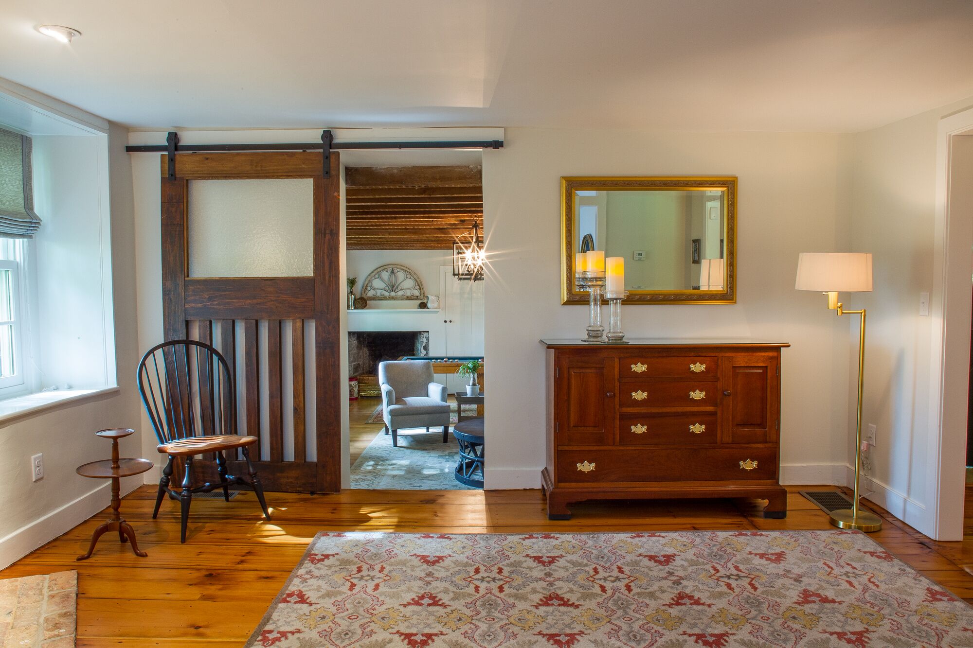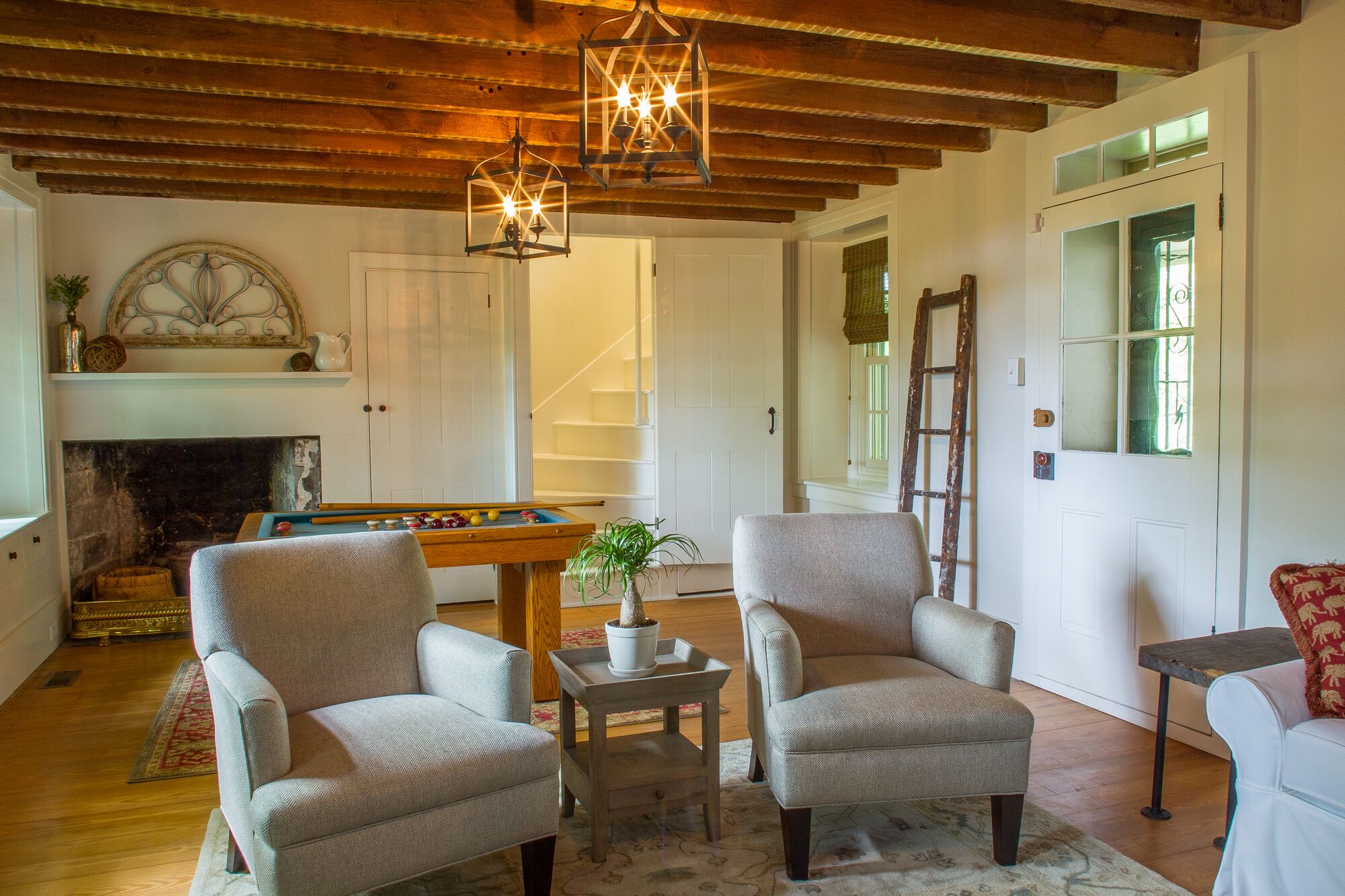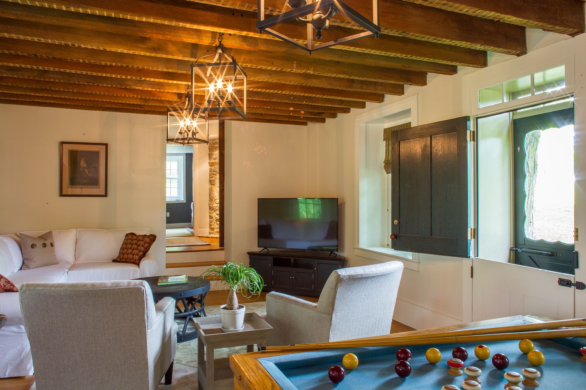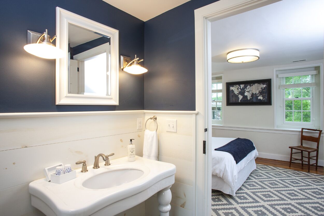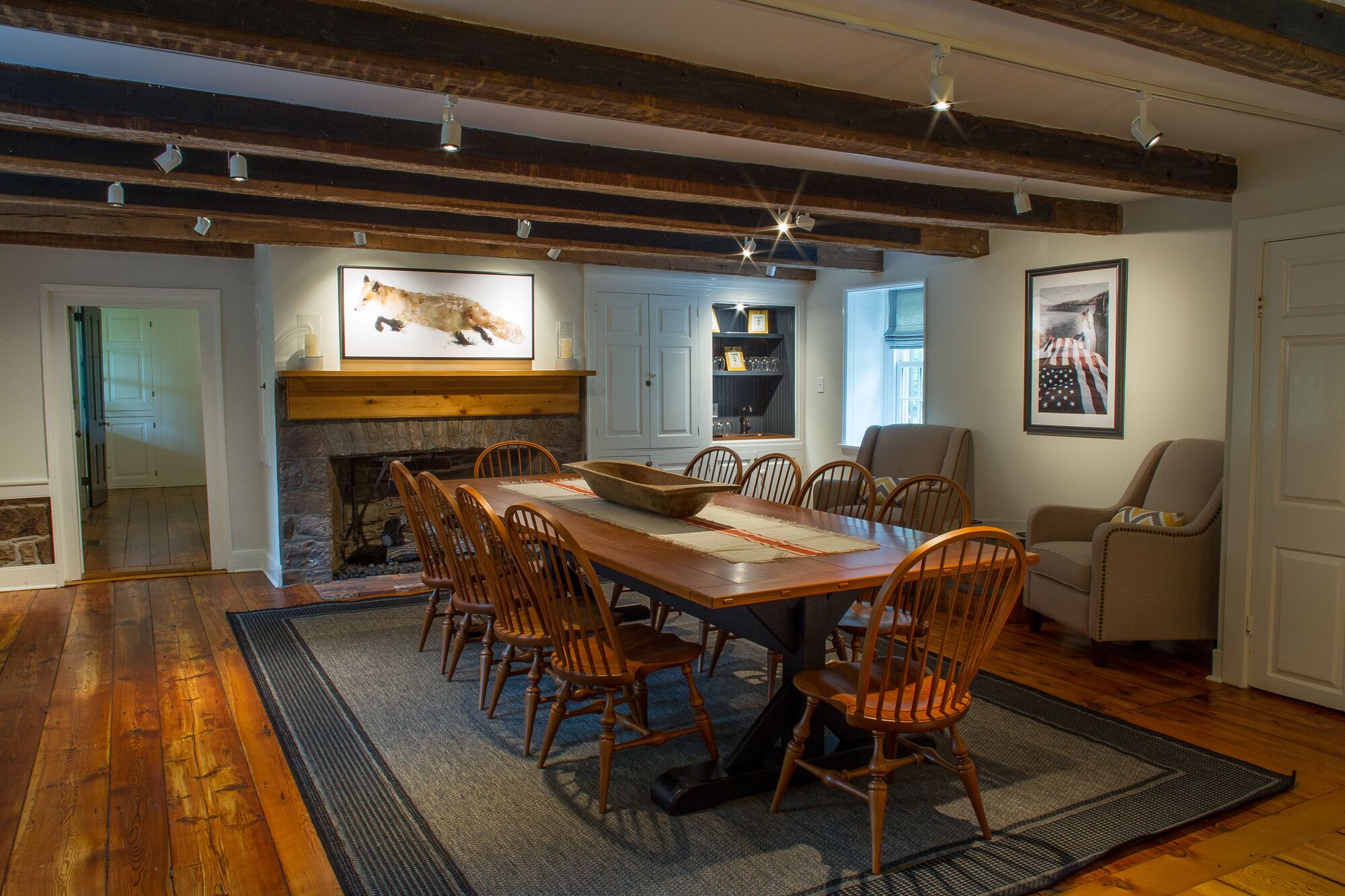 The Federal Twist House Completely restored, 19th century farmhouse situated on 77 acres of private, untouched land just minutes from the Delaware River tow path, shopping, dining, & nightlife. Enjoy the charm of an older home with the convenience of modern, luxurious amenities.This historic 5 bedroom house, built circa 1810, was completely renovated in early 2017, combining a contemporary design with the restored original detail & character of the home.Whether you’re looking for a relaxing retreat or a vacation full of outdoor activities, this home is perfect for families and large groups. Its close proximity to the Delaware River and New Hope, PA allows for bike rides along the canal, fishing & water sports, shopping, outdoor dining, and nightlife.•Enjoy a cocktail by the fire or on the outdoor patio overlooking the expansive lawn and pond•Outdoor grill•Gourmet kitchen with breakfast bar and direct access to the patio – 2nd stove/oven in laundry room•Fireside, custom dining room table fits 12 people •Wet bar•Large family/game room with 55” TV•Laundry room with washer & dryer•2 Primary bedrooms have en suite bathrooms & TV’s•Cozy up in the reading nook for a relaxing afternoon nap•Before booking the house, please be aware that all of the bedrooms and bathrooms, except for the half bath, are located on the second floor. This is an old house, so all 3 staircases are steeper than newer homes. Also, the doorways are not wheelchair accessible.