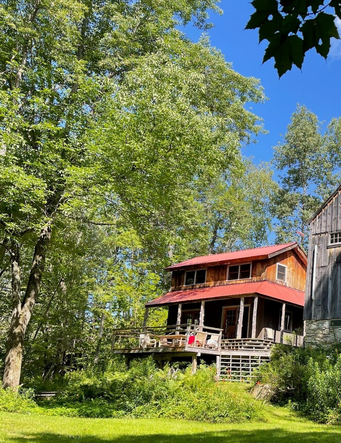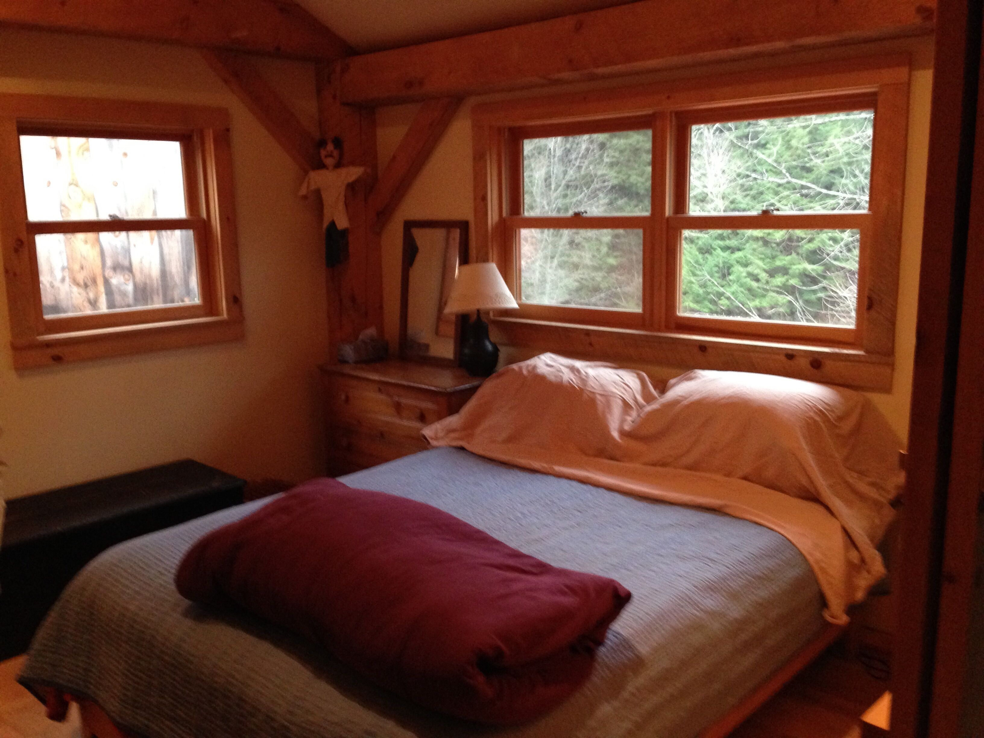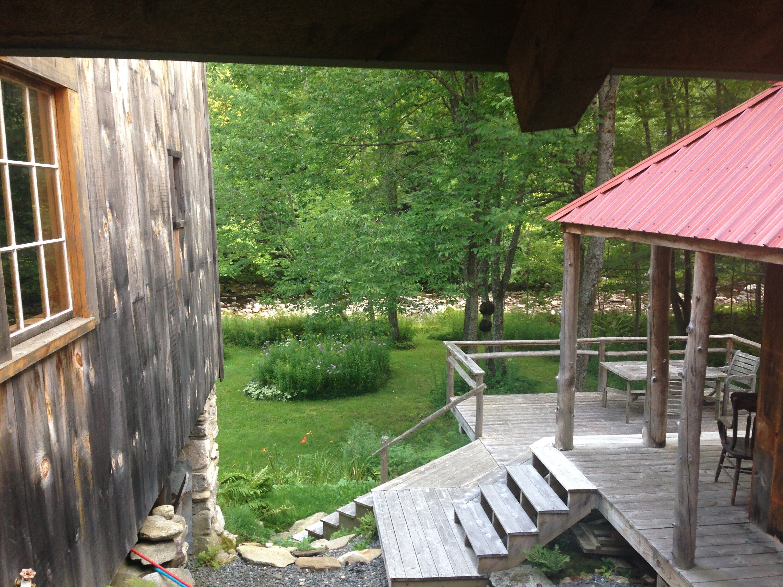 Cabin in Bondville on the Winhall River Our cabin was built about 8 years ago. With a large deck and covered porch, you'll have fantastic views of the Winhall River and stunning hillsides. Please note that the rental is only for the cabin with the red roof on the left-hand side of the first photo - the barn is not included. Just half a mile from the village center, you can bike, run, swim, or ski depending on the season. Two bedrooms upstairs separated by a divider, one full and one half bath. The kitchen is one level down at ground floor with a large gas stove including griddle burner. The living room couch converts to a double bed. There is another dining table in the living room. The full glass doors in the living room open to the porch and deck. You can eat outside on the large deck too. Steps from the deck lead right to the meadow and river. Just about a mile from the access road to Stratton Mountain.