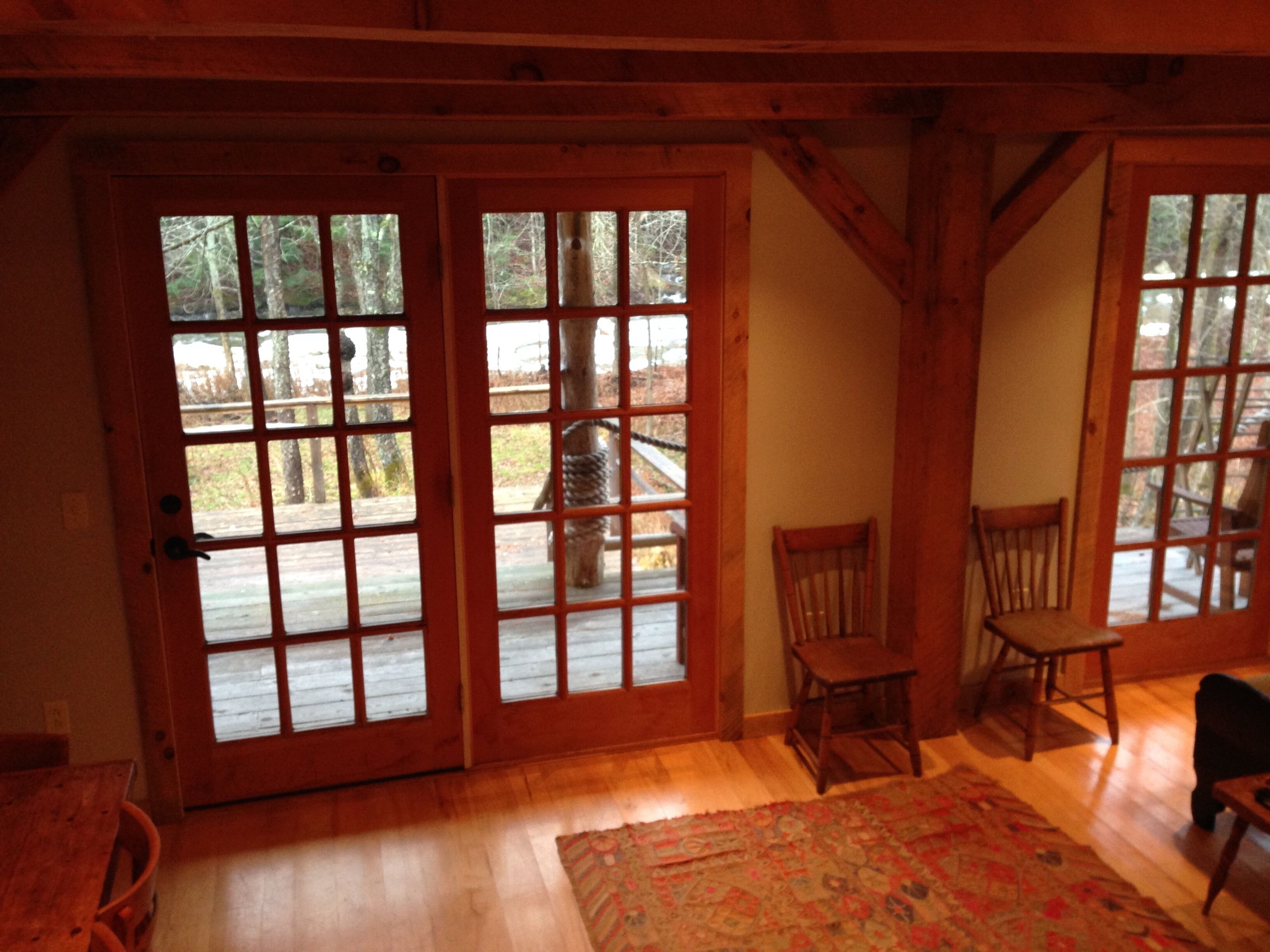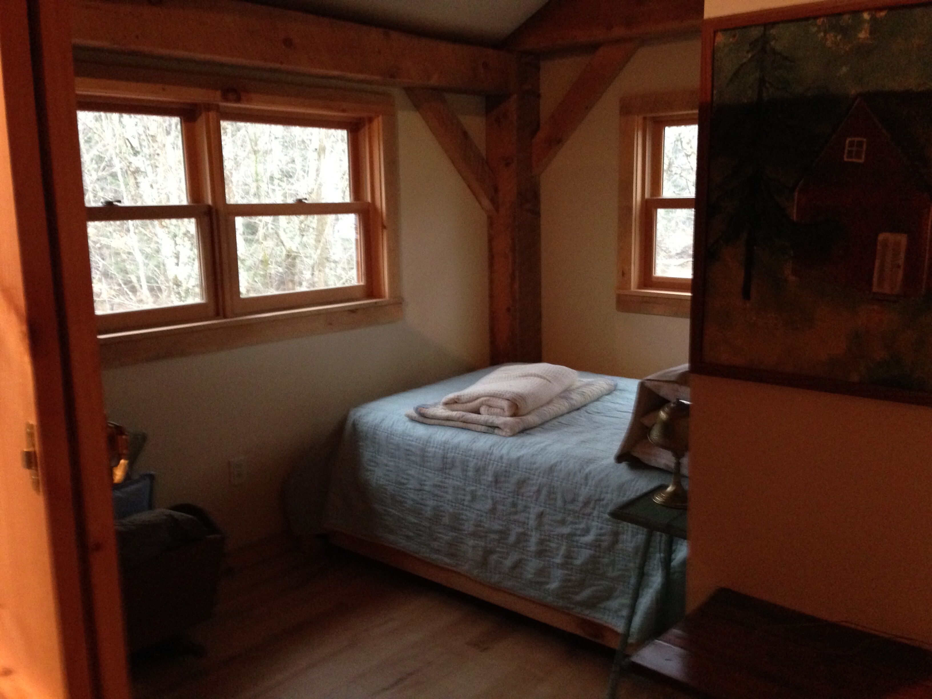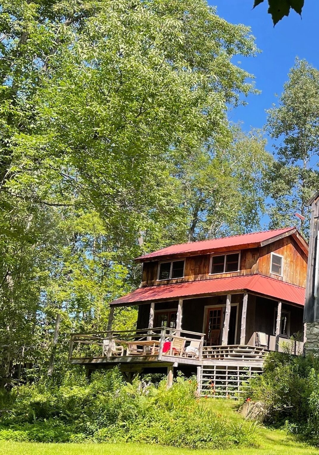 Cabin in Bondville on the Winhall River Our cabin was built about 8 years ago. With a large deck and covered porch, you'll have fantastic views of the Winhall River and stunning hillsides. Please note that the rental is only for the cabin with the red roof on the left-hand side of the first photo - the barn is not included. Just half a mile from the village center, you can bike, run, swim, or ski depending on the season. Two bedrooms upstairs separated by a divider, one full and one half bath. The kitchen is one level down at ground floor with a large gas stove including griddle burner. The living room couch converts to a double bed. There is another dining table in the living room. The full glass doors in the living room open to the porch and deck. You can eat outside on the large deck too. Steps from the deck lead right to the meadow and river. Just about a mile from the access road to Stratton Mountain.