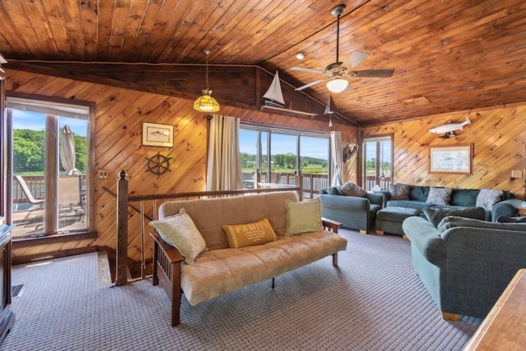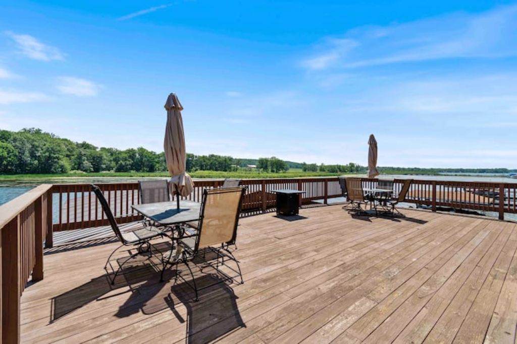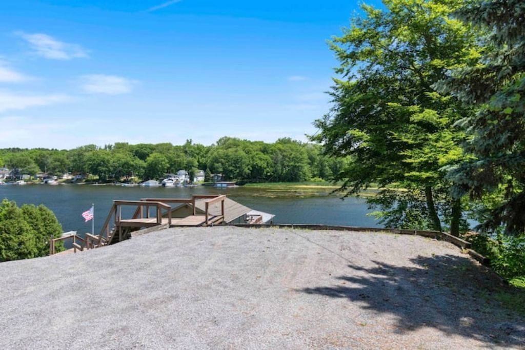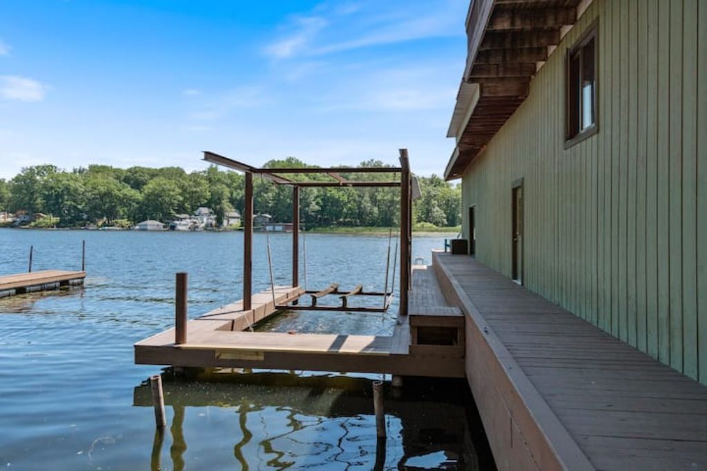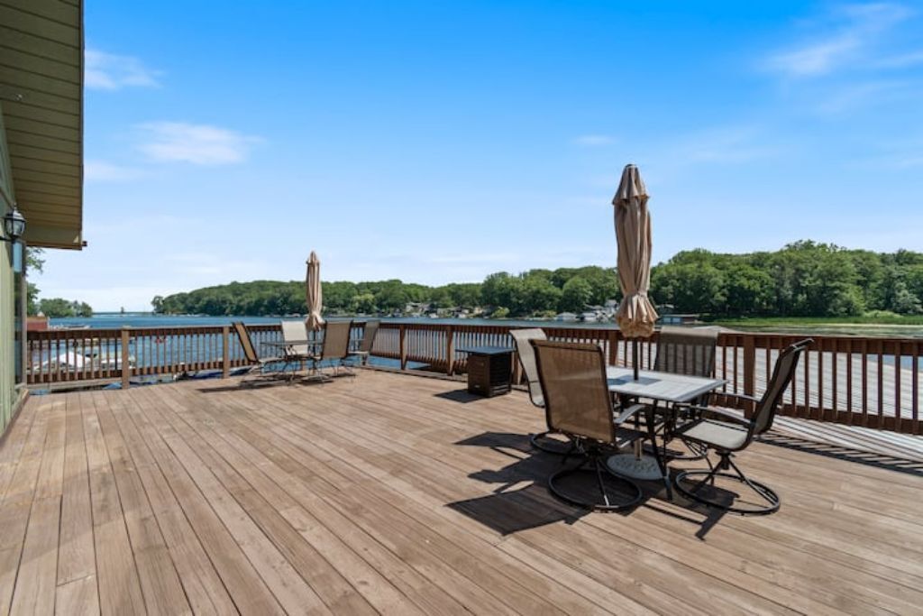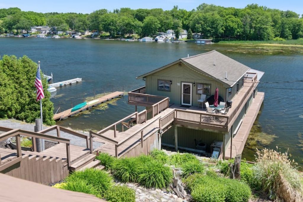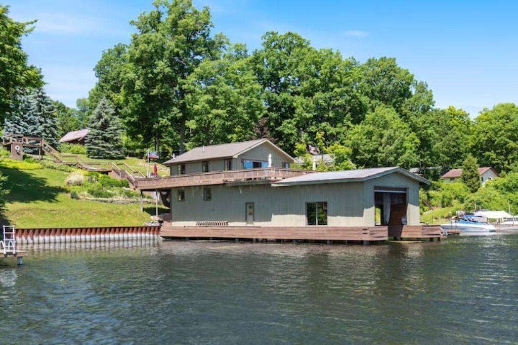Unique lake house built overwater on the Great Lakes, Sodus Bay Lake Ontario Your family’s Leroy Island getaway starts here. Bring your boat & enjoy your vacation at this unique house built right on the water, not the land. It's located on the only island of Sodus Bay that you can drive to. There’s a boathouse with 3 kayaks, 2 paddle boards a pedal boat & a tube to tow behind your boat. Catch fish right in the boathouse & on the docks. Swim on a private gravel beach. Wraparound decks with fantastic views. Dine alfresco using the 3 outdoor patio sets & gas grill or just use them for morning coffee & afternoon cocktails. Enjoy S’mores around the gas fire pit. Limited to 8 people with 3 bedrooms containing six beds, a futon and 2 air mattresses. Fully equipped kitchen. Indoor or outdoor dining. Gas fire pit on deck. Open Living room area. Water views from every room in the house. 4 smart TVs 55 inch in living room and a smaller one in each bedroom. Spectrum internet 300mps and cable. Walk around decks, Docks on both sides of the house and in the boathouse (docks and boathouse have no railings so non swimmers should wear life jackets and kids supervised). There are a lot of stairs. Plenty of parking at the top and room for your boat trailer across the street. Gates and baby gear are stored in closet. New custom shower in full bath as well as an outdoor shower in the covered boathouse. Outside boat lift can be used or just tie up along the docks. Easily enough space for 7 boats. Swim in the private gravel beach. This is the place for your outdoor vacation on the water.Tired of the kids inside? Outdoor adventure awaits. Water sports and world class fishing literally out the back door. Bring your boat or rent one nearby. Charter a fishing trip for salmon, brown trout or lake trout. Bird watchers will see eagles, osprey humming birds and just about every type of duck, geese, swans etc. Turtles nest on the property. I have seen mink, beavers, fox, and deer.There is a hose and a pressure washer in the boathouse, to help clean your boat after a day of fishing, as well as a fish cleaning table. Need more excitement? Del Lago casino is only a 1/2 hour away. The Sterling Renaissance Fair is a short drive. Wineries, brew pubs and fine dining just a short trip. There are no bars or restaurants on the island, however Skippers Landing and Pier 53 are less than a mile away. There are numerous restaurants along the water of Sodus Bay and in driving distance. Winter rentals will have to shovel their way in and out as there is no snow removal. There are shovels present on site, and the ice fishing is worth it. Guests can use the full property. Do not drive down the hill driveway. Park up top and walk down to avoid ending up in the lake or being towed back up the steep hill. You can easily fit 4 to 6 cars in the parking area at the top with additional parking in the gravel across the road. There are some life jackets, kids fishing gear and various floats available in the boathouse. Sea weed is common in the warmer weather. There are bubblers to push out the floating variety and a cutter and forks to scoop it located in the boathouse. Harvesters work the island weekly but it’s still there. There are beach towels available. I will be happy to answer any questions or concerns you may have before booking. The only thing you should need to bring is food, beverages, clothes, fishing gear and a boat. No boat? Numerous places are available to rent them.Bring your dog, but please clean up after them. Dogs love to swim and play at the beach, but must obey the leash laws. No wet dogs in the house. No dogs on the furniture. Smoking and vaping outside only away from the doors and open windows. No marijuana use allowed on the property, or illegal drug usage. The Town of Huron short term rental laws state that the property is limited to 8 overnight guests and 12 people maximum on the property at any given time. Quiet hours start at 10 pm, and day guests must leave. No Fireworks are allowed as well as no bonfires except in the provided propane fire place. There are no campers allowed on the property and no outdoor camping is allowed. Trash bins are provided and must be placed roadside on trash night and brought back after pickup. Absolutely no street parking and a strict 10 mph on Rose Ave. must be followed. Quiet hours start at 10pm. This is a residential neighborhood, and not the party scene of Greig St. in Sodus Point. Please be considerate of the neighbors. Please stay in the bounds of the property which is the floating dock to the north and the end of the retaining wall to the south. Violations will result in a fine from the Town and eviction with no refund. This is our vacation home which is partially rented out. Please treat it with respect. No rentals under 25. I am not including a cleaning fee, so please clean up after yourself. Ensure all dishes are done or at least run the dishwasher before checking out. Place a load of towels in the washer and strip all beds used, putting the sheets by the washer. Take all of your food with you, throw away what you don't want by putting it in the outdoor trash bins.HOUSE RULES• This is my family’s second home. We appreciate the opportunity to share it with you, and hope you enjoy your stay as much as we do. We ask that you treat the home and our neighbors with respect, and that you maintain the condition that you found it in. I understand that things break sometimes through no fault. Please notify me asap of any issues. • Do not flush anything down the toilets except for human waste and toilet paper. Absolutely no wipes, feminine hygiene products, condoms, paper towels etc. Absolutely no cooking grease in the drains as well. You will be billed for any damages caused, and it will be expensive. • We are limited to a total of 8 overnight guests on the short term rental permit, this includes children. Please do not exceed the limit as you will face fines and we may fac