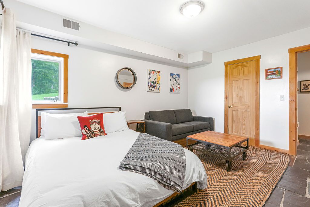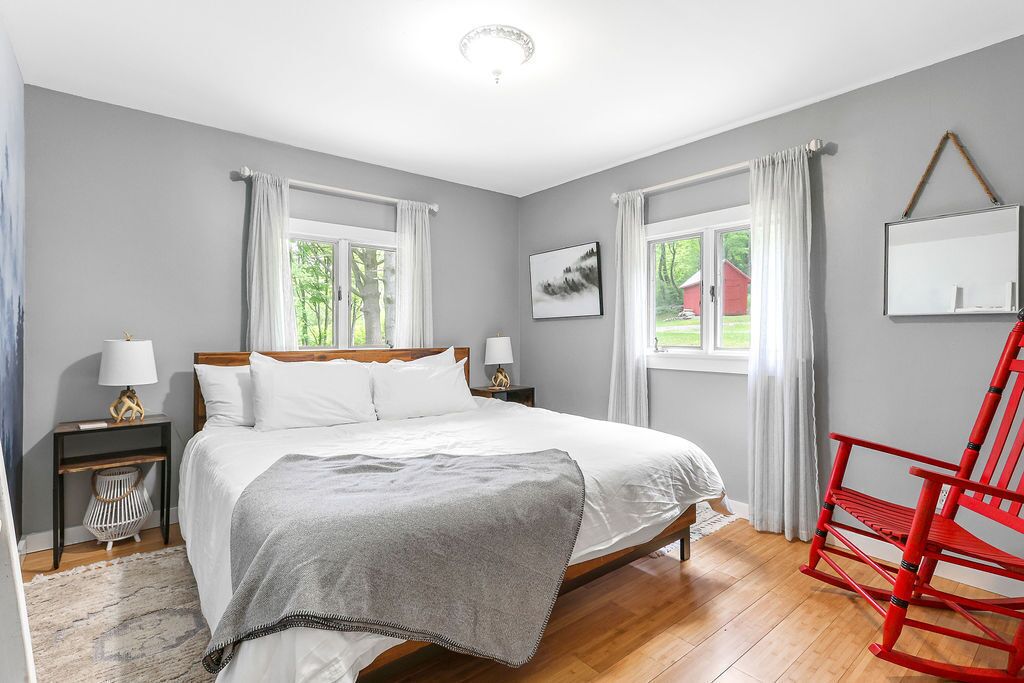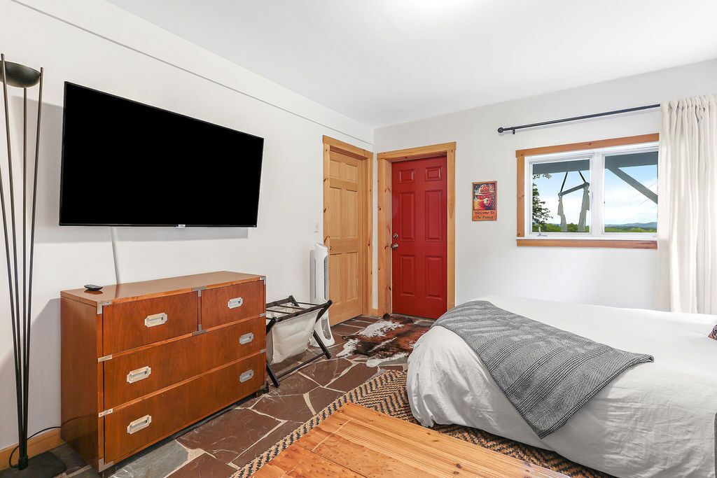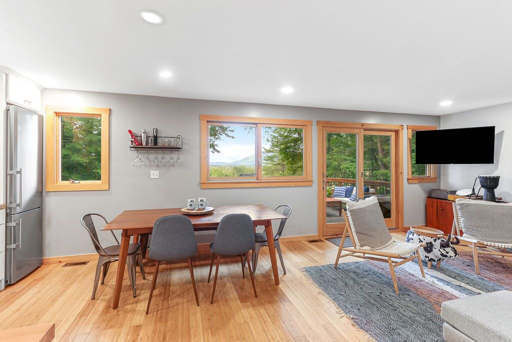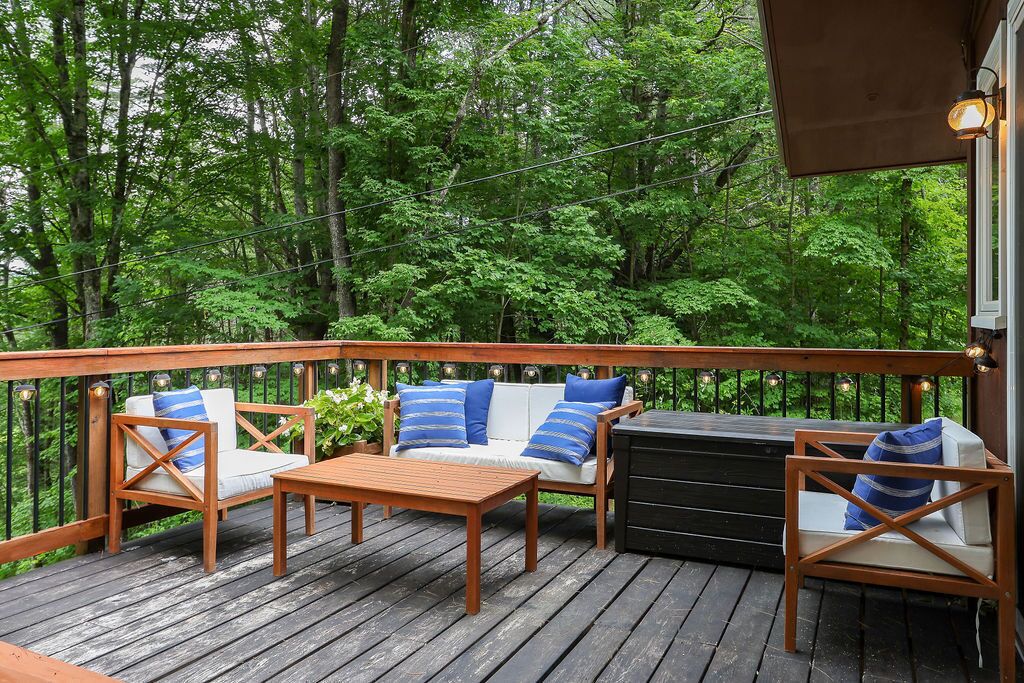 Newly Designed Chalet w/Views, Minutes to Stratton A perfect little getaway. This 3 bedroom, 2 bath chalet is less than 10 minutes from Stratton, and just a little further to Mount Snow, and Magic Mountain. Perfect for 2 families, or 7-8 people. Situated on 2.5 acres, this private setting with mountain views, has everything you need to feel at home. Multiple markets for food, beer, and wine less than a 5 minute drive as well as ski stores for suppliesThe spaceYour home away from home has everything you need to enjoy all that the Jamaica and Southern VT has to offer from relaxing to being active skiing, hiking, fishing, snowmobiling, ATVing, or checking out the local shops and restaurants.The kitchen has all new stainless steel refrigerator, electric stove, microwave, and Bosch dishwasher. The kitchen is open to the living room and dining area.Kitchen is stocked with all the cooking/serving necessities including: cookware, pots, pans, plates, cups, and silverware. Additionally has a crock pot, coffee maker, and lots of other items to make you life here as convenient as possible.The dining table seats a total of 6-8 guests comfortably.The living room has a large and comfortable couch that seats up to 4-5 people, two additional mid-century chairs, (the kitchen bench doubles as additional seating) and a 50 inch UHD smart TV with streaming capabilities and streaming live TV (roku) as well as apps. You are also welcome to login to your Netflix and other streaming devices through the smart tv apps.Hotel quality linens and towels, shampoo and conditioner, and body wash provided for guests.Outdoors: Sit (season permitting as furniture is stored during winter) on the huge deck looking at the mountains. Weber grill is for guest use all year round. The large private side yard has a fire pit and abuts woodlands.Bedroom 1: located on the main floor, has one king bed with closetBedroom 2: located on the lower floor, has one king bed, closet, and rocking chairBedroom 3: located on the lower floor, has one queen bed and one pull out sofa that converts to a full bed.Common area: located on the first floor, has an area for one floor blow up mattress that can be provided.All mattresses are memory foam.
