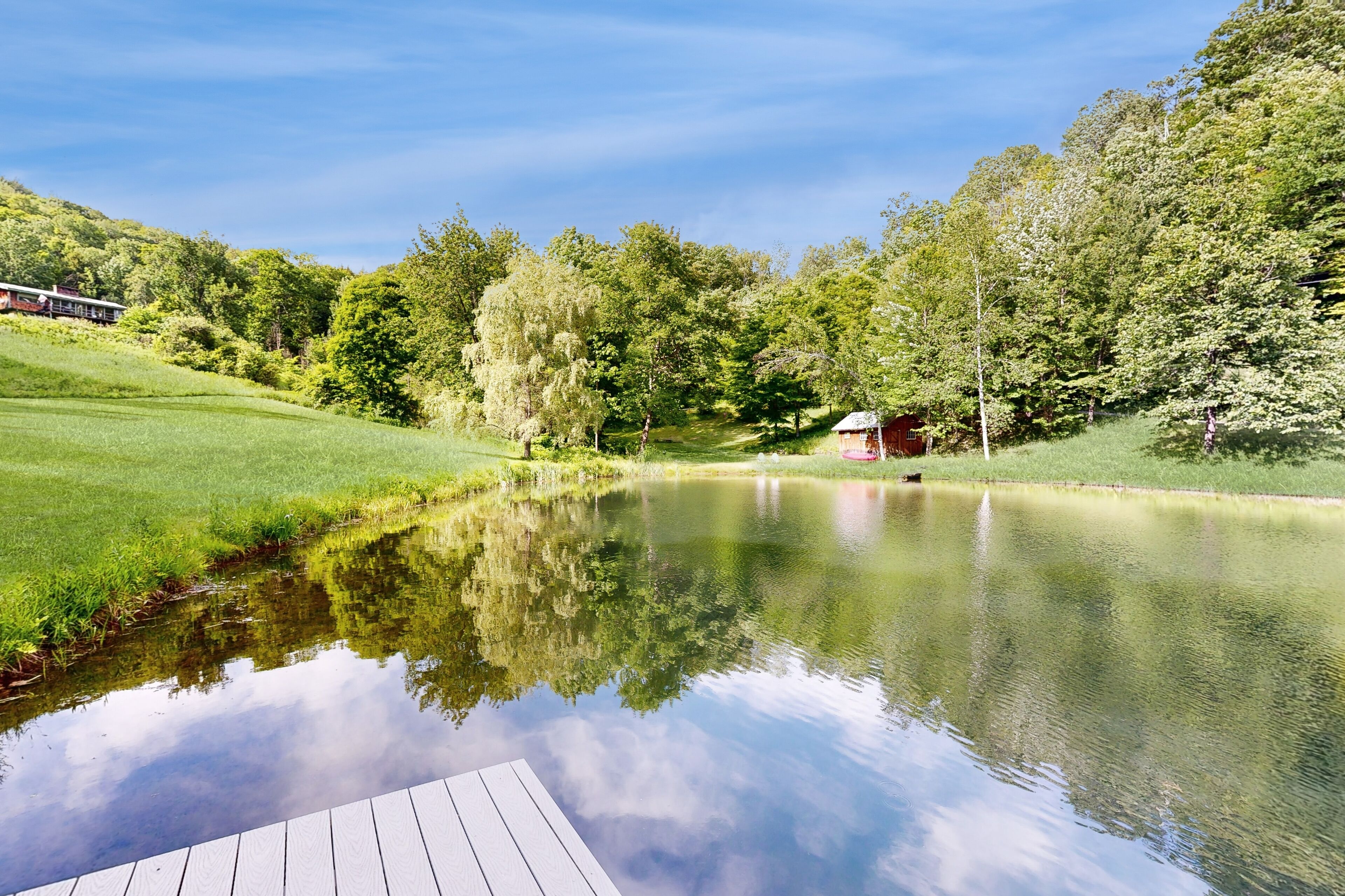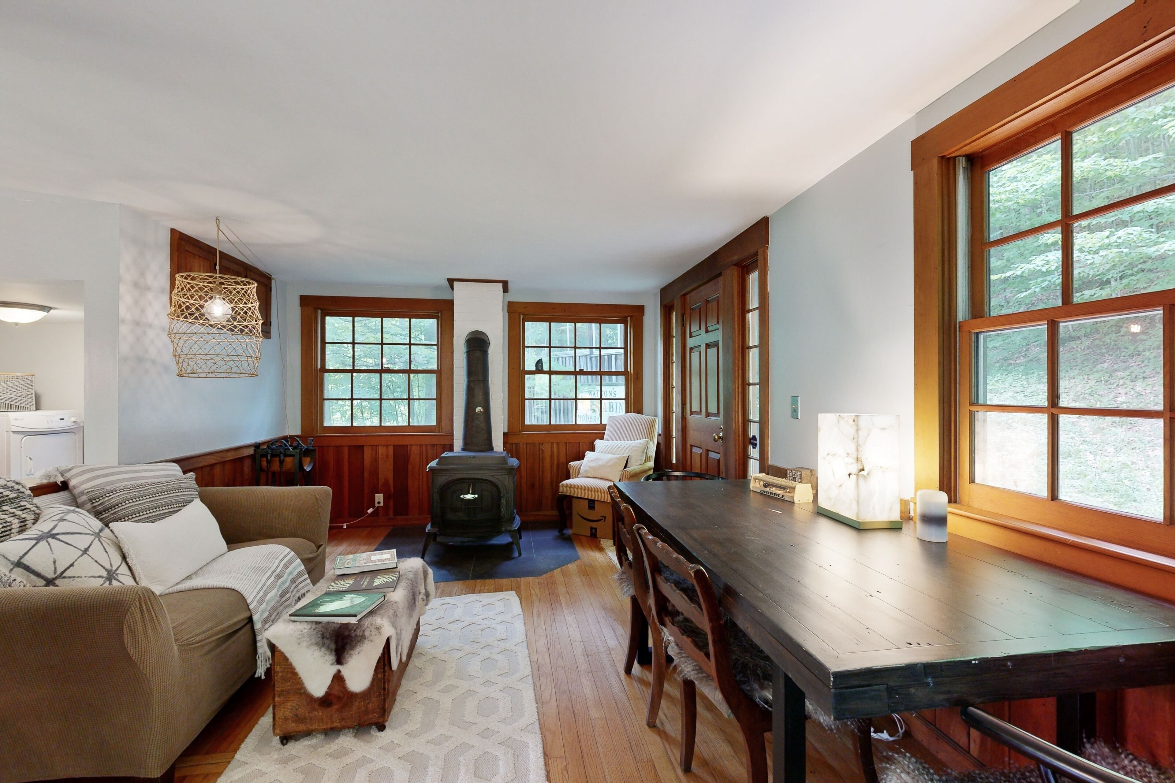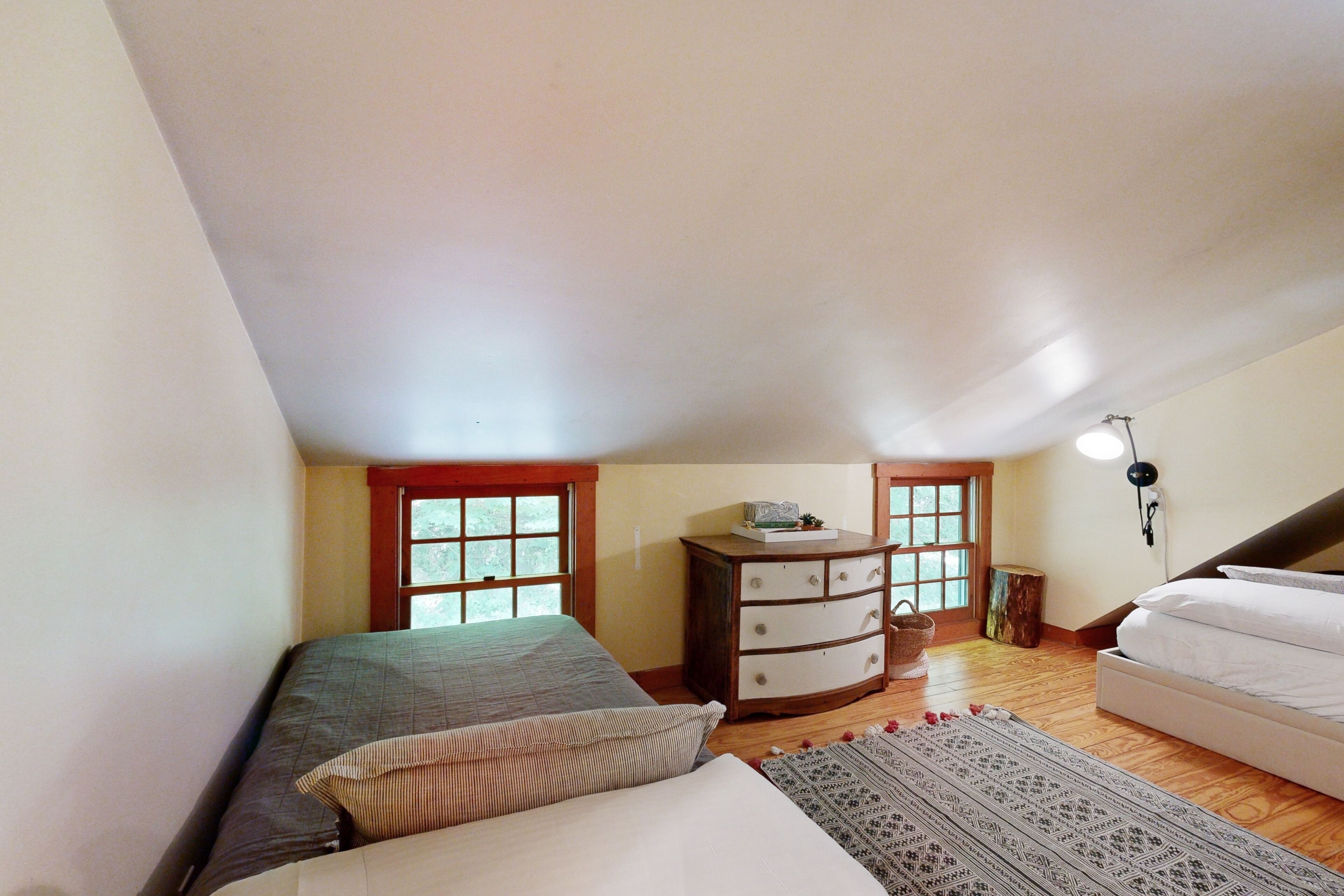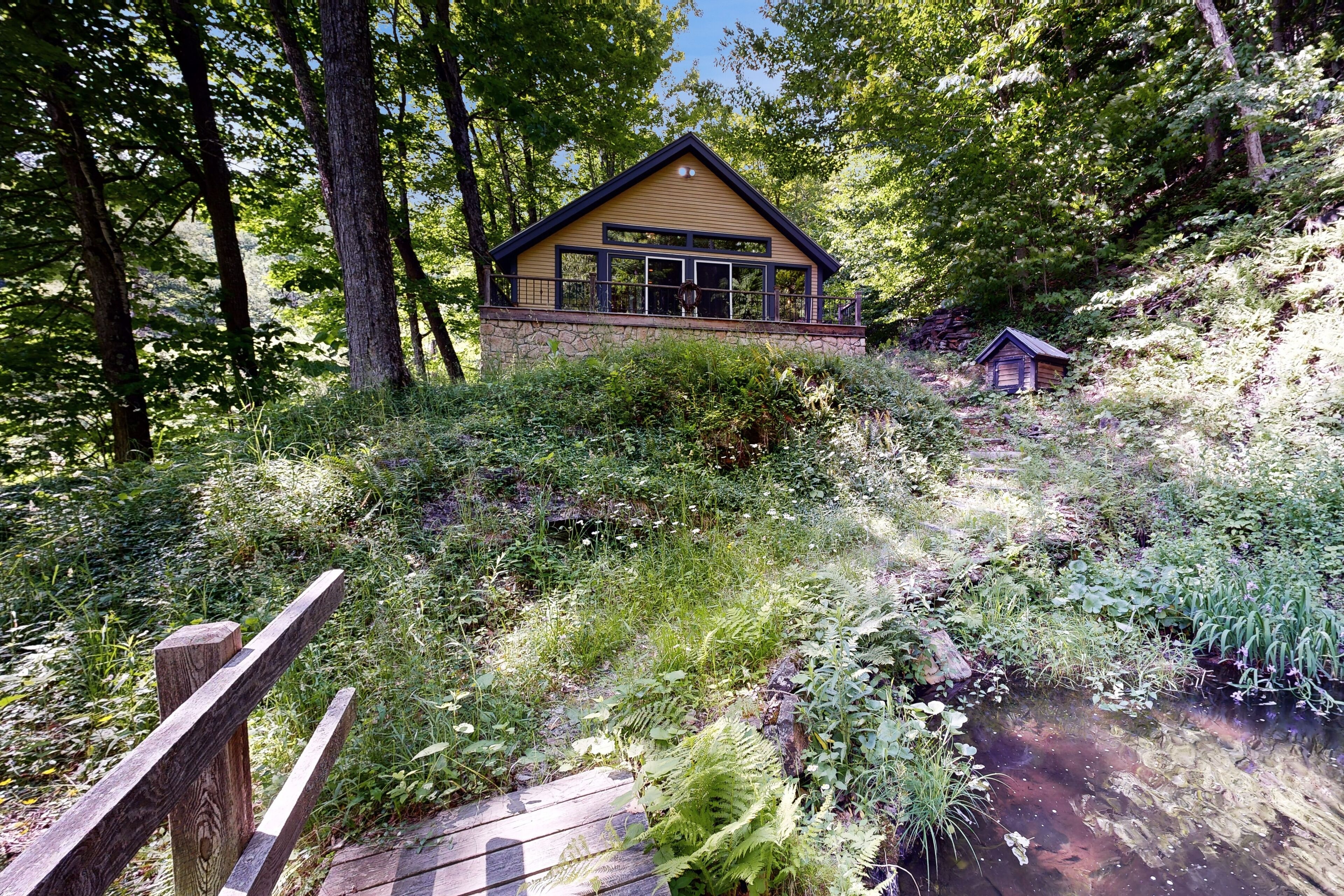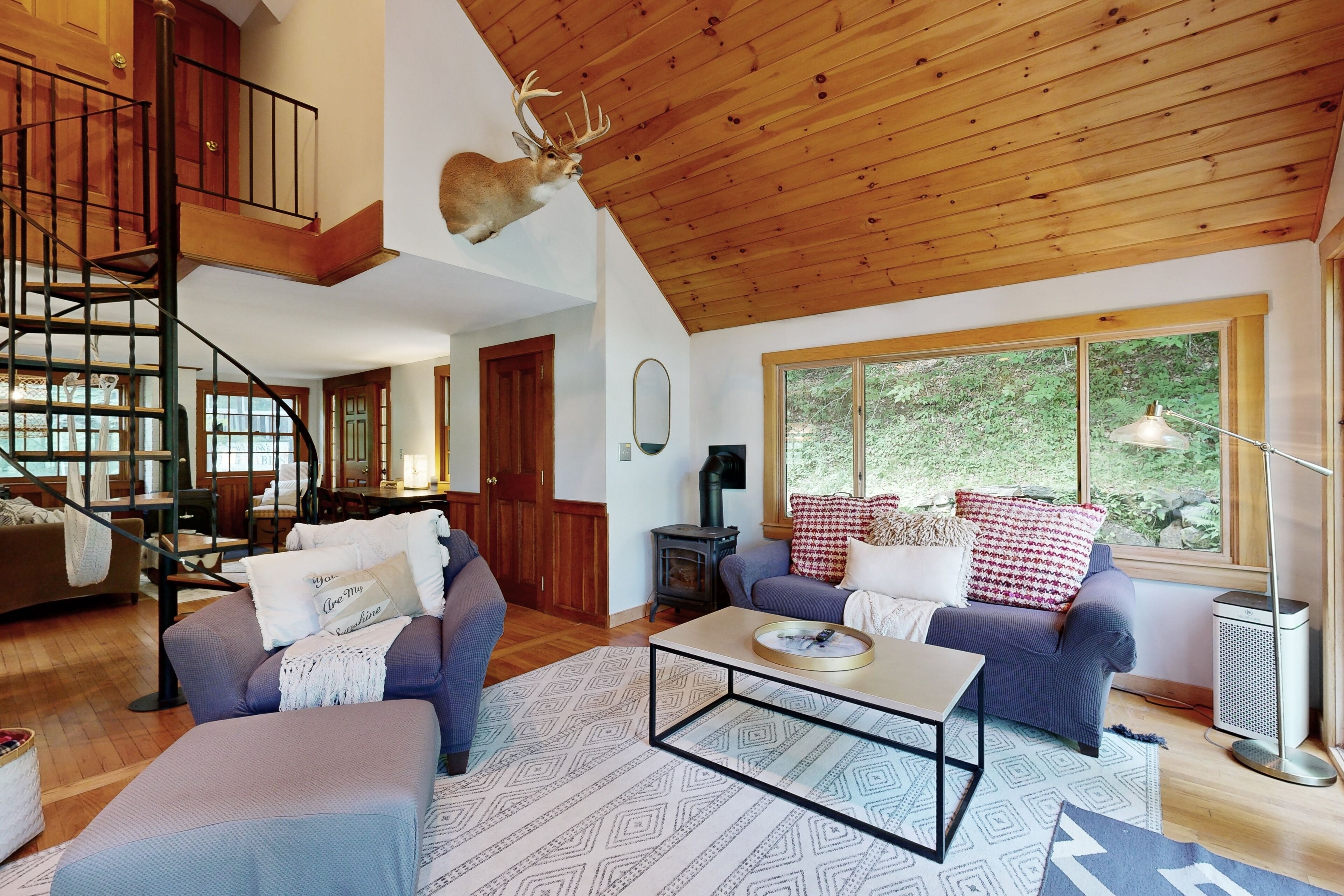 Charming waterfront 2BR house, private beach, waterfall, firepit, wifi, kayak Wild Blue YonderOur calendar is updated in real-time & our nightly rates are accurately displayed. Simply enter your desired dates and click 'Book Now!'Escape to this charming waterfront home nestled on 20 acres in Barnard, VT, offering a serene retreat with private sandy beach access, a cozy fire pit, and a lush lawn for relaxation. The wood-burning stove and gas fireplace provide a warm ambiance, perfect for unwinding after a day of outdoor adventures. This beautiful property boasts a range of amenities, including WiFi, a fully equipped kitchen with modern appliances, and access to 2 kayaks and 1 canoe at the home's nearby Sugar Shack on the pond's edge. Enjoy the stunning mountain views from the balcony or explore the surrounding area with activities like cross-country skiing and snowboarding just a stone's throw away. In the summer, the cabin stays naturally cool under a canopy of trees, creating a tranquil oasis for guests to enjoy. The nearby Lime Pond feeds a picturesque waterfall on the property that changes with the seasons, adding to the charm of this idyllic location. Whether you're seeking a peaceful retreat or an adventure-filled getaway, this home offers the perfect setting for a memorable vacation in Vermont. With its proximity to horseback riding, Nordic skiing, fishing, kayaking, and more, this property is ideal for outdoor enthusiasts looking to immerse themselves in nature. Explore the quaint village of Barnard or take a short drive to enjoy local restaurants, cinemas, and museums. Whether you're seeking relaxation or outdoor excitement, this waterfront home provides the perfect base for your Vermont escape. Book your stay today and experience the beauty of Barnard firsthand!Things to KnowCheck-in time: 4:00 p.m.Check-out time: 10:00 a.m.All guests shall abide by Vacasa’s good neighbor policy and shall not engage in illegal activity. Quiet hours are from 10:00 p.m. to 8:00 a.m.No smoking is permitted anywhere on the premises.Parking notes: There is free parking available for 3 vehicles.Due to local laws or HOA requirements, guests must be at least 21 years of age to book. Guests under 21 must be accompanied by a parent or legal guardian for the duration of the reservation.