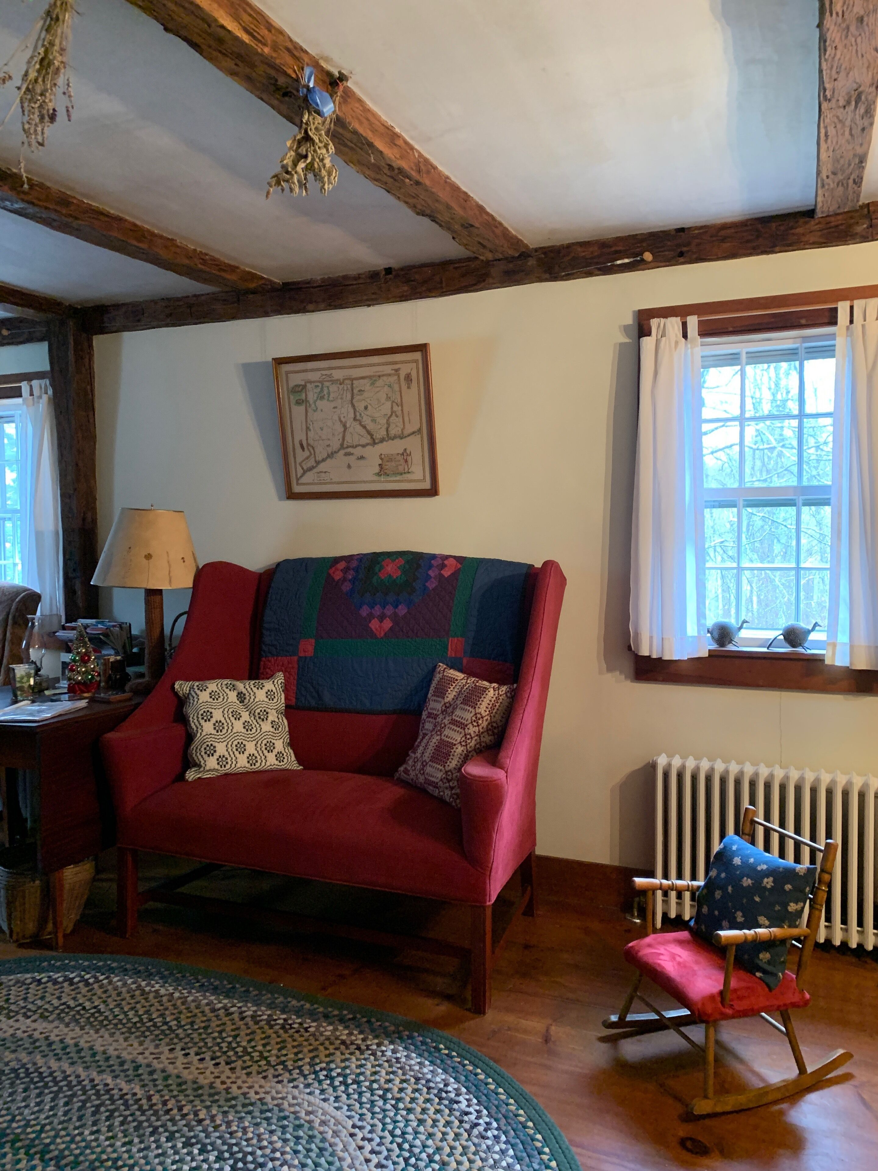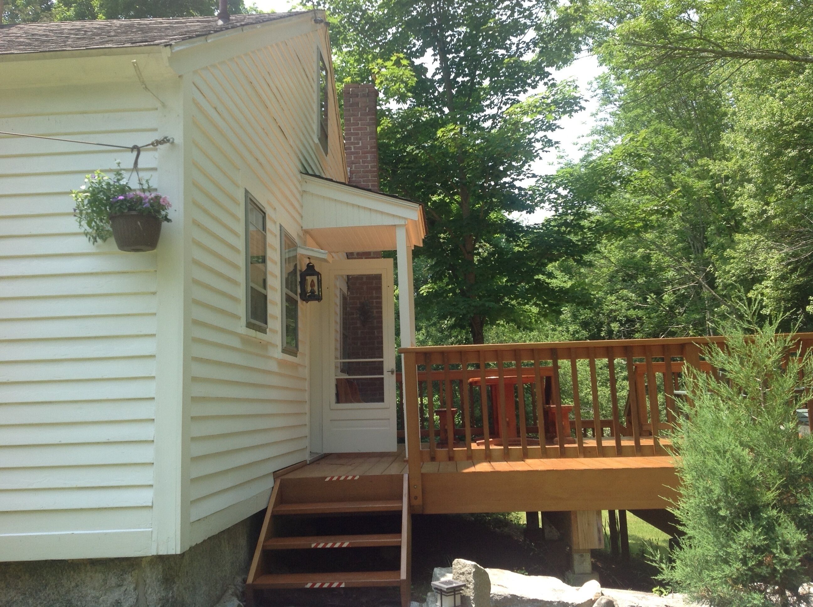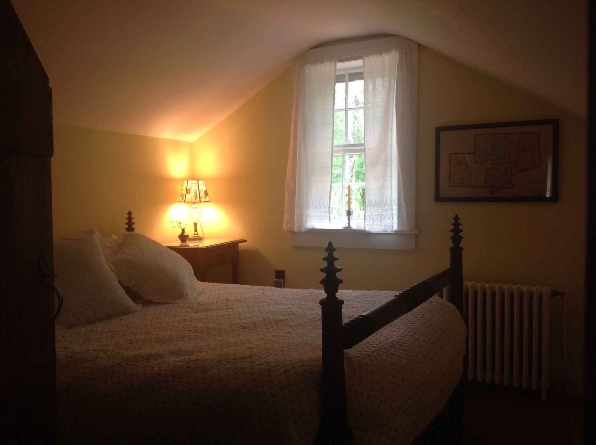 Little House in the Big Woods- Tennis Court Imagine staying in a house in Colonial Williamsburg, or OldSturbridge Village. The Little House at Jericho is an early American historic farmhouse located on the Abington side of Pomfret, Connecticut, in a secluded storybook location on 145 acres of preserved land adjacent to the Airline Trail, the Wolf Den State Forest, Mashomoquet State Park and the New England Forestry Foundation's Chase Kimball Memorial Forest. This nature preserve is suitable for bird-watching from the deck over-looking the pond or at the Audubon Society's Grasslands preserved sanctuary nearby, for long walks on the private trails in the woods (with direct access to the Airline Trail), cross-country skiing, tennis on the court, fishing in either or both of two ponds, or just for a place to get away from it all in a private nature sanctuary. Use of the tennis court is allowed, but hunting is strictly prohibited, as is use of any off-road vehicles. It is ideal for an artist or writer’s retreat. The Little House is a unique historic property that has been lovingly preserved by eight generations of the same family who have lived at Jericho since 1814. It is the birthplace of the famous industrialist and philanthropist, Augustus Sabin Chase, of Waterbury Connecticut fame (see Waterbury Hall of Fame, where he, his son, and one of his granddaughters are honored). This antique house has one slightly larger downstairs and two small upstairs bedrooms, a spacious living/dining room with a huge granite fireplace, and can sleep up to four people comfortably. Furnished with period country antiques, guests feel transported into the 18th century, until they slide back a door to find a modern kitchen with a view over an orchard and pond from a large deck, and an updated bathroom. It is not suitable for the disabled or for extremely large people, because it is a pre-1800 house with small period furnishings and is not wheelchair-accessible. The house is hypo-allergenic, and bedsheets are 100% cotton, laundered at high temperatures and ironed. Therefore, no pets or smoking are permitted. Jericho is situated close to Pomfret and Rectory Schools, Woodstock Academy and half an hour from Marianapolis Prep School, as well as close to the numerous scenic drives, destination restaurants, antique stores and boutiques in Windham County. This historic little house is nestled in the forest, at the end of a long straight dirt town road , far from the stress of daily life, but only a short drive from Old Sturbridge Village and Mystic Seaport. It is close to the Connecticut Audubon Center’s Grasslands Sanctuary, Goodwin Conservation Center in Hampton and several state parks and forests ideal for hiking. It is also less than an hour's drive from Hartford, Providence and Worcester and only a 20 minute drive from the University of Connecticut at Storrs. Boston is 90 miles Northeast and New York City 150 miles Southwest.Keywords: cottage, little house, tennis court, hiking, historic farmhouse, antique house, tennis, fishing, pond, secluded getaway, artist or writer’s sanctuary, birthplace, quaint, peaceful, nature sanctuary, UCONN, Pomfret, Rectory School, Airline Trail
