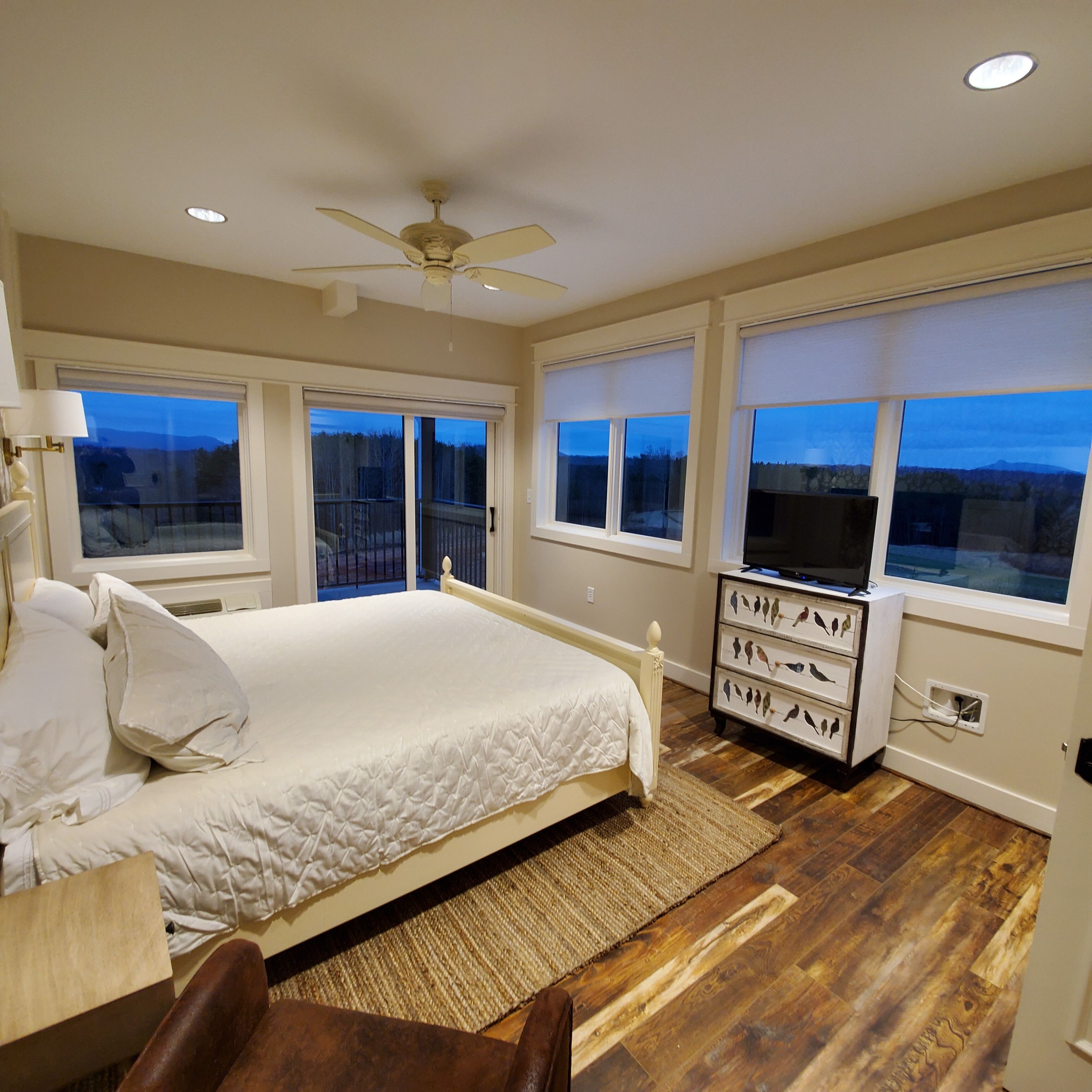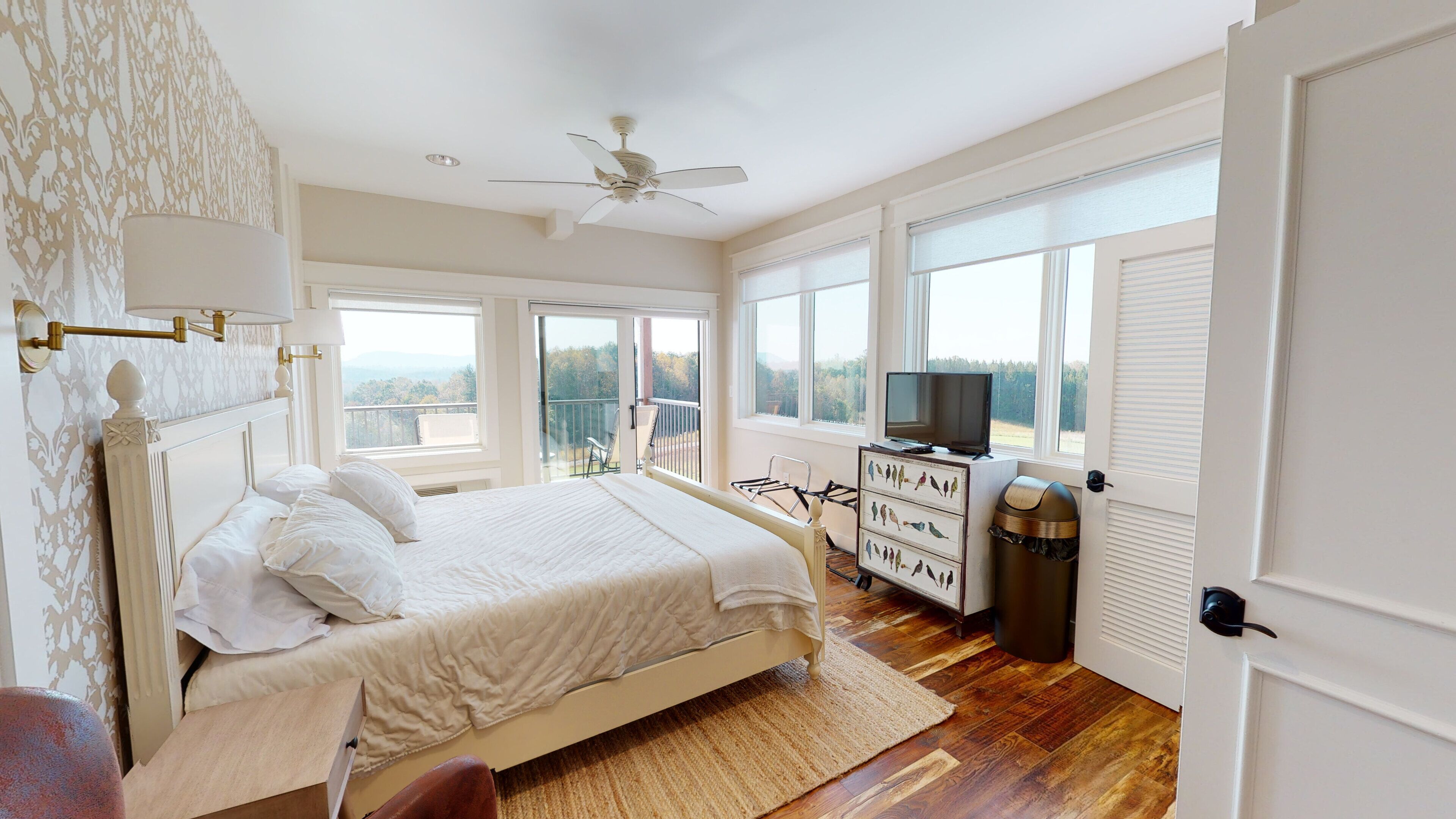 Bedroom 9 - The Big Creek Lodge Bedroom 9 is a deluxe room in the The Big Creek Lodge on the 350 acre resort property of Luna's Trail Farm and Event Center. Guests will enjoy beautiful views of Hanging Rock and Pilot Mountain from their private balcony. This deluxe room includes a claw foot tub and a walk in shower. It is our smallest room, but it easily has the best view, with Pilot Mountain v...