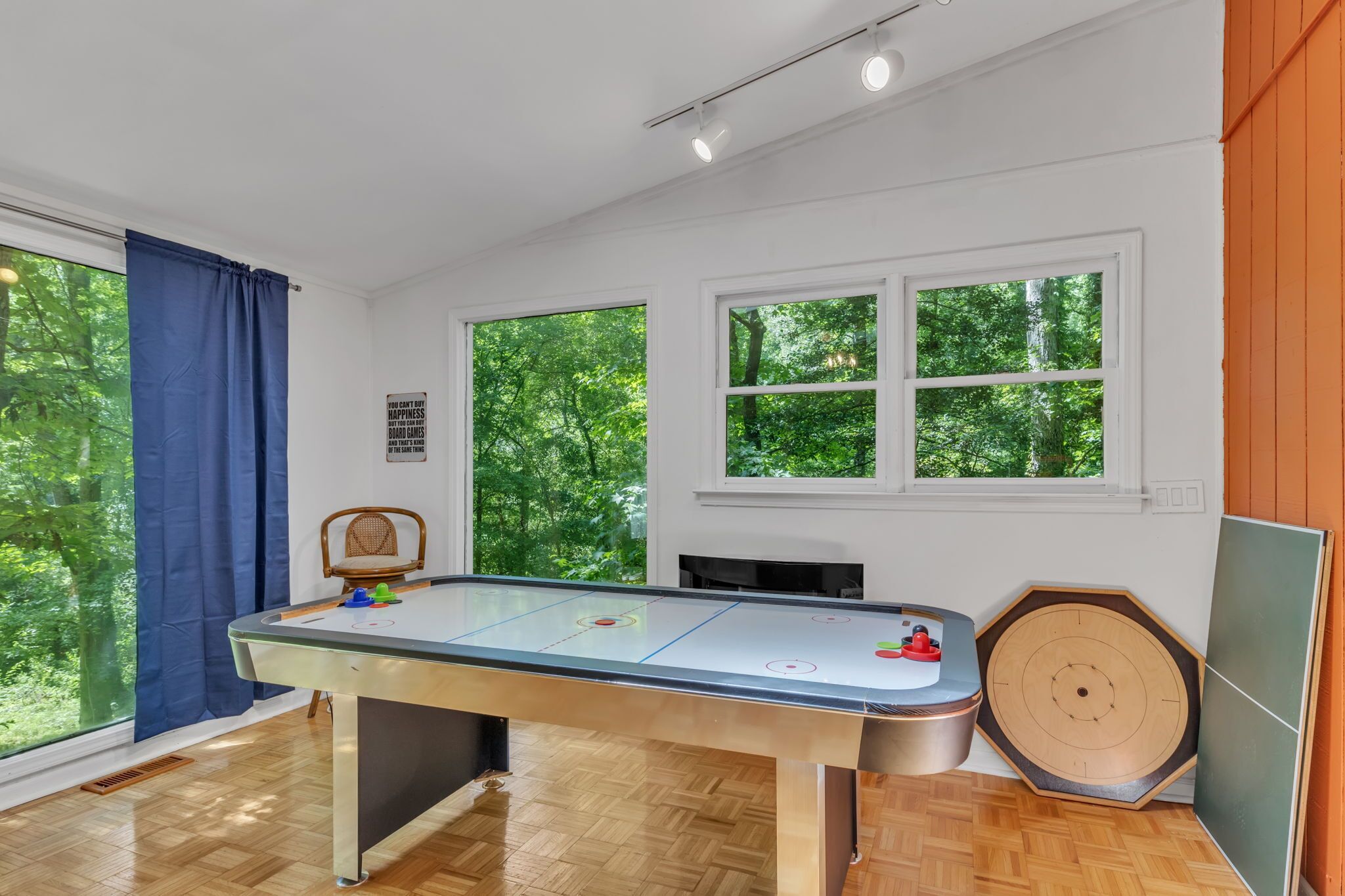 Vintage 4BR Retreat with Game Room & Fire Pit Welcome to our charming retro home in Greenville! This quirky getaway offers a unique blend of vintage vibes and modern comforts. Nestled in the serene woods, this abode boasts 4 cozy bedrooms and a game room that will transport you back to the age of arcades. Embrace the nostalgia as you challenge your friends to classic video games or enjoy board games by the fireplace. With its whimsical decor, this gem is the perfect retreat for those seeking a truly memorable and offbeat experience.Welcome to our delightful and quirky retro retreat in Greenville! Located just 15 minutes from Downtown Greenville, this home offers the perfect balance of tranquility and convenience. Explore the vibrant city, visit local shops, and indulge in the area's amenities, all while having a peaceful retreat to return to. This spacious retreat offers a comfortable and inviting atmosphere for your stay. With 4 bedrooms, there's plenty of space for everyone. The master bedroom features a luxurious king bed, while the second bedroom offers a cozy queen bed. The third bedroom is perfect for the kids with 2 twin beds, and the fourth bedroom boasts 2 full beds for additional guests. Three of the bedrooms also have smart TVs with Roku, allowing you to stream your favorite shows and movies during your downtime.The 2 bathrooms are well-appointed and stocked with fresh towels and toiletries for your convenience. In the living room, you'll find a cozy fireplace and television, perfect for snuggling up on chilly evenings. The highlight of this home is the game room, a retro arcade with a wide selection of family games. Enjoy hours of fun with classic arcade machines and relive the nostalgia of your favorite childhood games. Large windows in the game room offer stunning views of the surrounding wooded oasis, creating a serene and picturesque setting.Outside, you'll find a fire pit where you can gather around with loved ones, roasting marshmallows and sharing stories under the starry sky. A barbecue grill is also available for those who enjoy outdoor cooking. Take advantage of the two spacious porches with comfortable seating and outdoor eating area, perfect for al fresco dining or simply relaxing and enjoying the peaceful surroundings.The fully equipped kitchen provides everything you need for cooking and baking. Whip up delicious meals and savor them together in the dining area or on the outdoor patio.Our pet-friendly home includes a fenced in yard for the safety of your 4-legged friends. Pets are welcome with a one time pet fee.There is a ring camera at the front door.Book your stay at our charming home and create lasting memories in Greenville's wooded paradise.