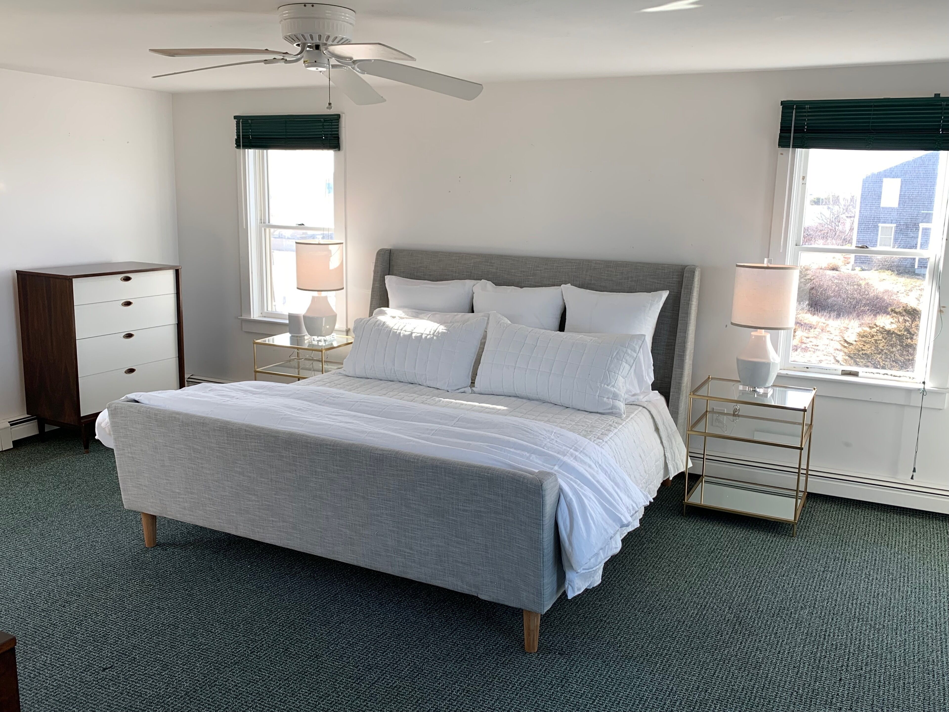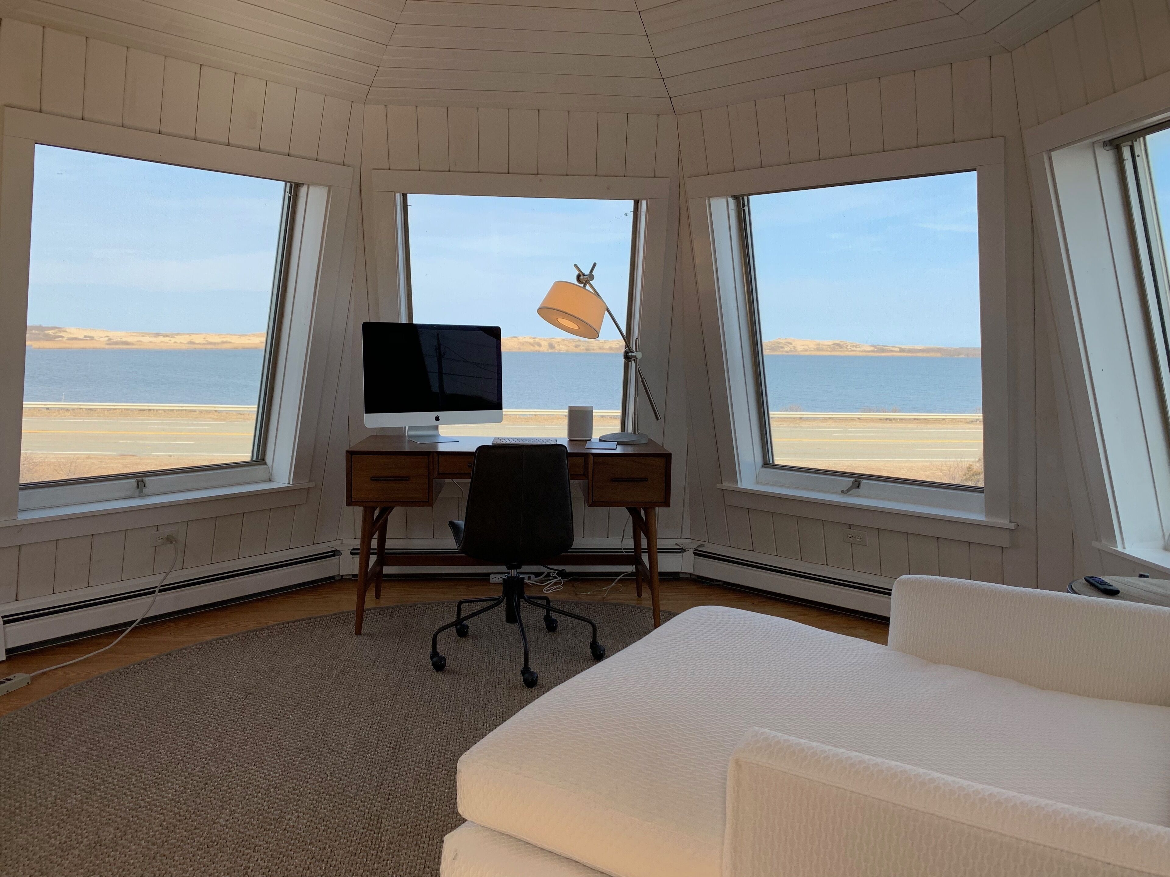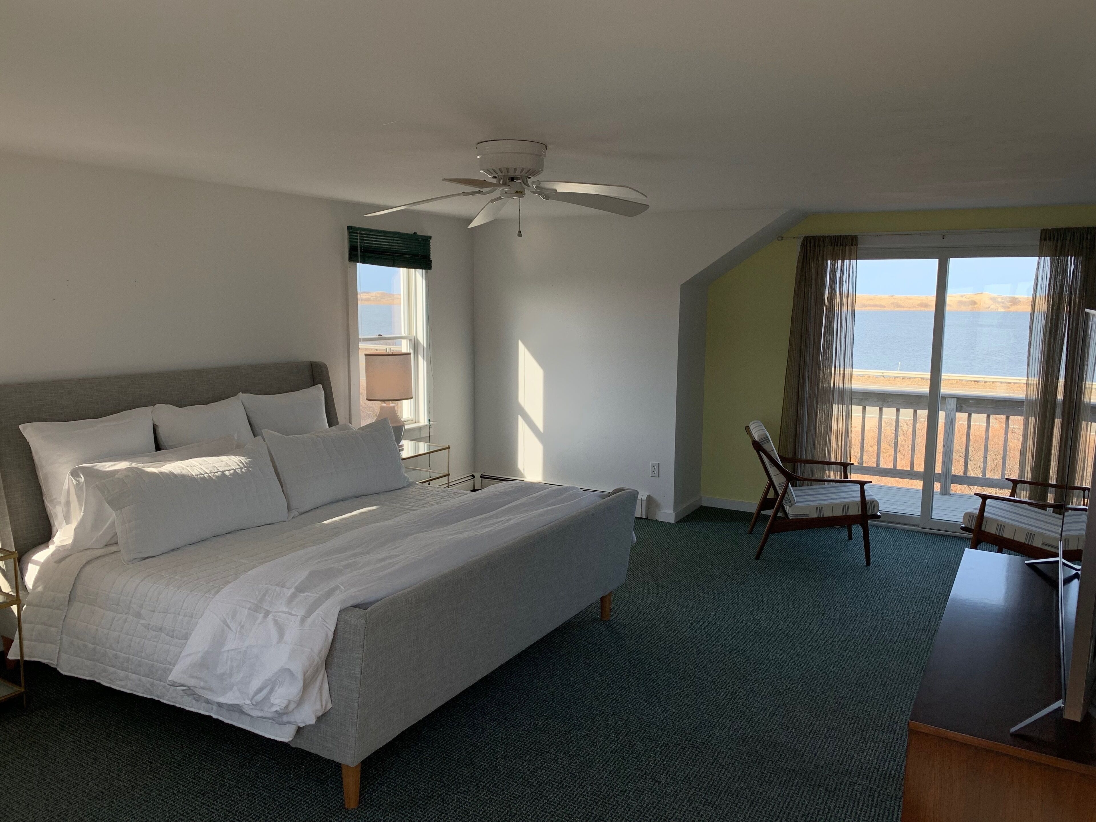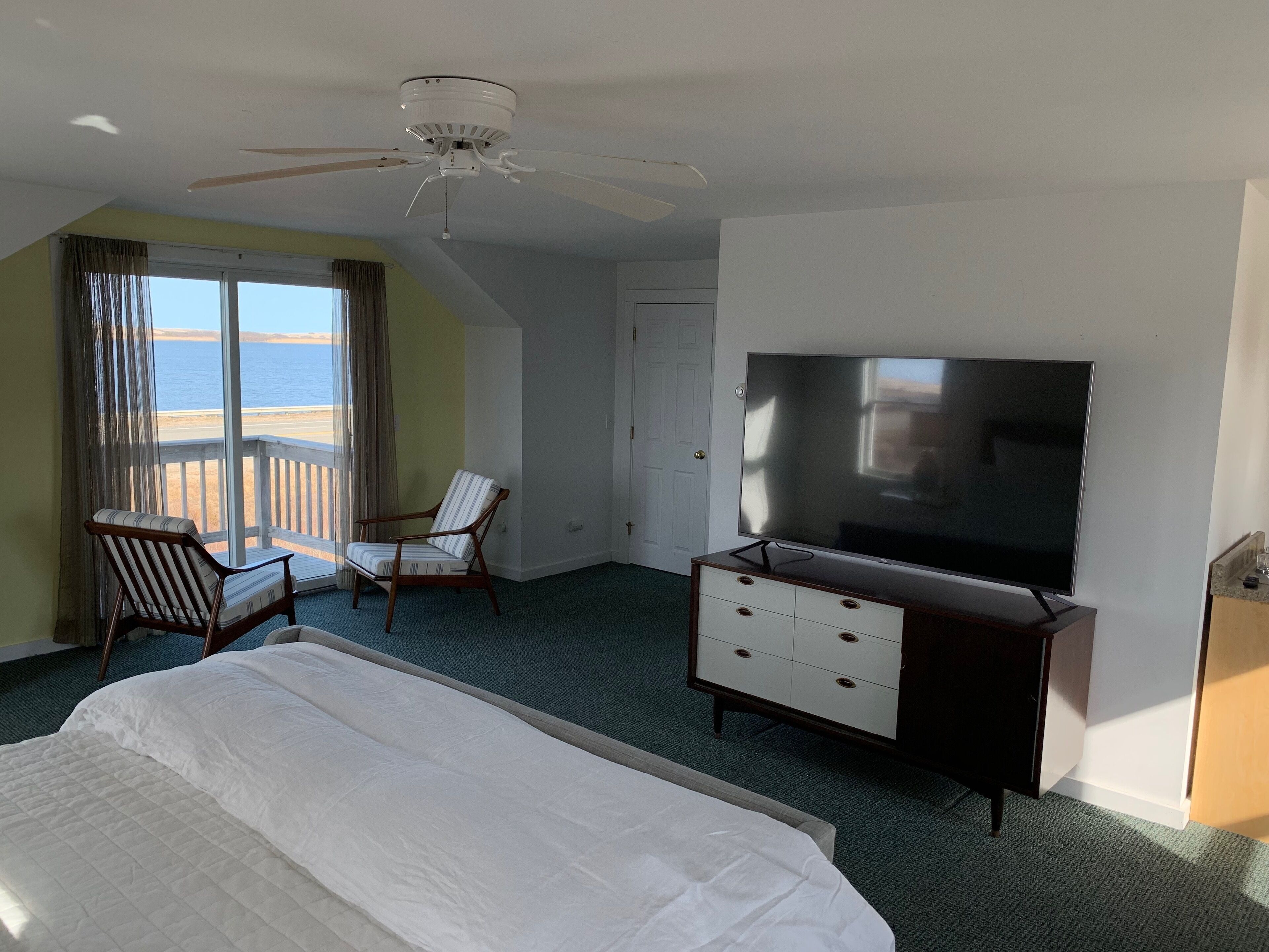 Beach Point at its Best! Welcome to Camellia Cottage, the perfect blend of inviting spaces, drenching sunshine and rejuvinating sea breezes.Just steps from Cape Cod Bay (deeded access) and minutes from Truro’s world-class ocean beaches, Camellia Cottage offers panoramic water views, light-filled rooms, resort furnishings and convenient access to Provincetown via shuttle bus. Throw the windows open to enjoy the breeze, or stay cool and dry with whole house air conditioning - the choice is yours!The living room is furnished with two oversized chairs and a sleeper sofa (queen memory foam mattress) upholstered in durable Sunbrella fabric. A 65" 4K HDTV over the fireplace makes this room the perfect spot for movie night after a long, sun-soaked day at the beach.The dining room features a large bespoke wood table (built by Harp Design Company of HGTV's "Fixer Upper") surrounded by 8 bistro chairs, where you can enjoy majestic water and dune views while having meals, playing board games, sipping coffee or just telling stories. The sunporch offers another great gathering spot for conversation, cocktails or an afternoon nap.Upstairs is a loft for reading, catching up on some work, or enjoying some screen time away from the rest of the house. It is furnished with a mid-century modern desk and chair, iMac computer, 55" 4K HDTV, chair-and-a-half lounger and bean bags for the kids. The panoramic views of East Harbor from this room are breathtaking!The fully stocked gourmet kitchen (all new stainless steel appliances) offers a central location from which you can cook your favorite family meals, or just serve takeout. The kitchen counter has two barstools which are great for grabbing breakfast or a snack, or just chatting with the cook.The first bedroom features a queen size Casper mattress, Belgian linens (quilt, duvet and pillows) and a quiet reading spot. This room is served by a full bathroom (shower only) just down the hallway.The second bedroom features a king size Casper mattress, Belgian linens and en suite bathroom (shower only). The bedroom has great light and is big enough to set up a Pack 'n Play or bassinet if needed.The master suite above the garage is a lovely private retreat. It also features a king Casper mattress and Belgian linens, as well as restored mid-century modern furniture including a pair of chairs for relaxing while enjoying the views of East Harbor. If rain chases you off the beach you can binge watch Netflix on a 65" 4K HGTV from an upholstered sleigh bed. There is also ample room for a young family to set up a bassinet or Pack 'n Play. The full bathroom (tub/shower combo) is also en suite. (This room also has a kitchenette but we do not currently use it and intend to remove it in the near future.)While the purpose of Camellia Cottage is to get away, whole-house ultra-fast gigabit internet allows you to stay connected. In addition, Sonos whole-house audio will play your favorite vacation music in every room.