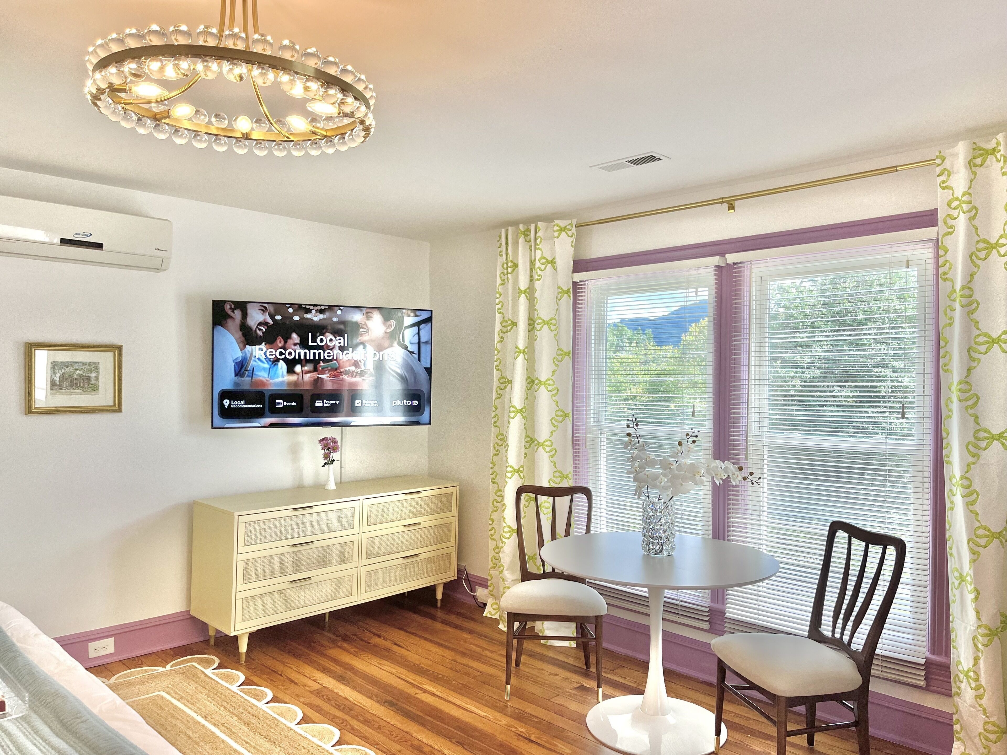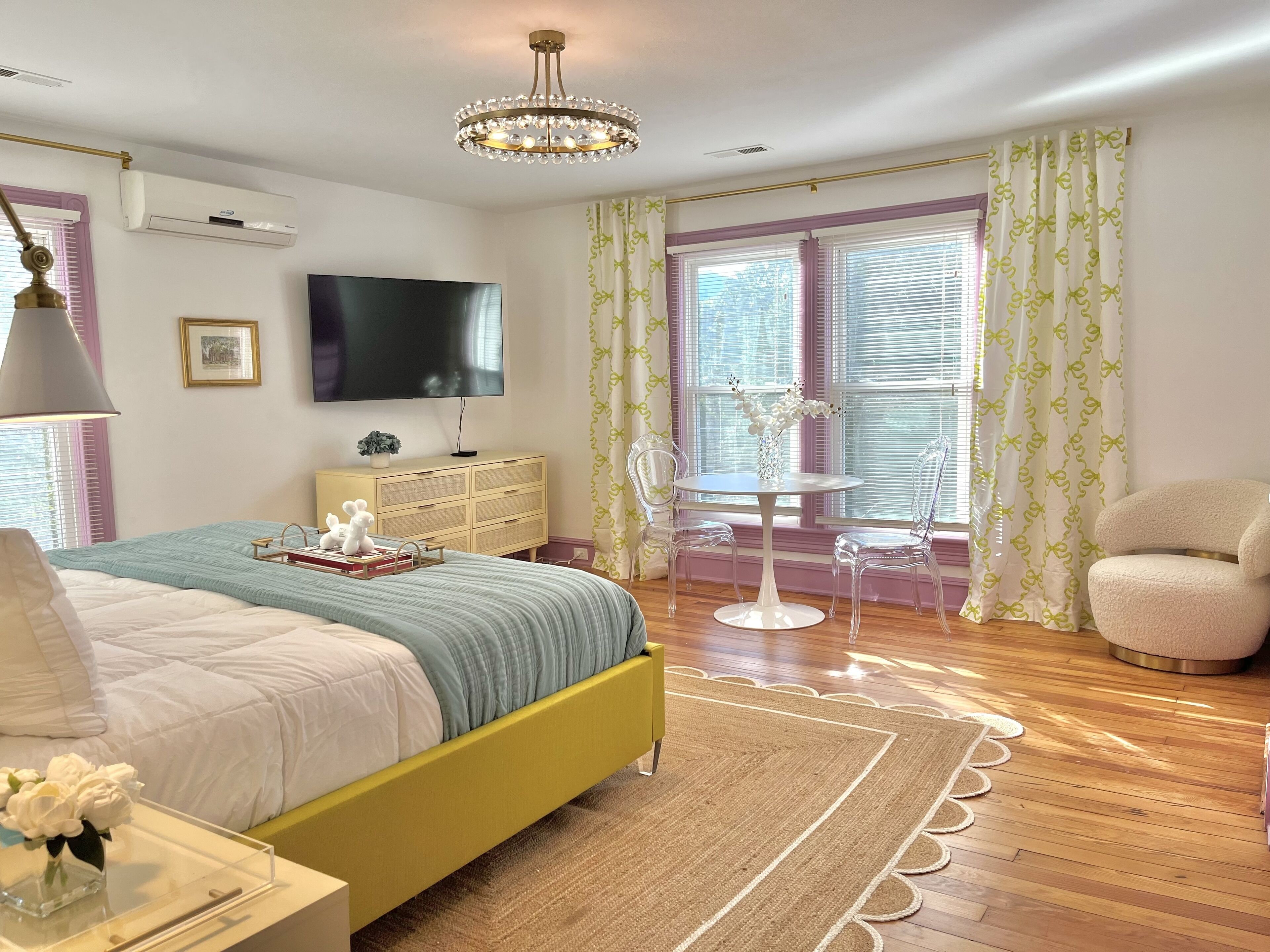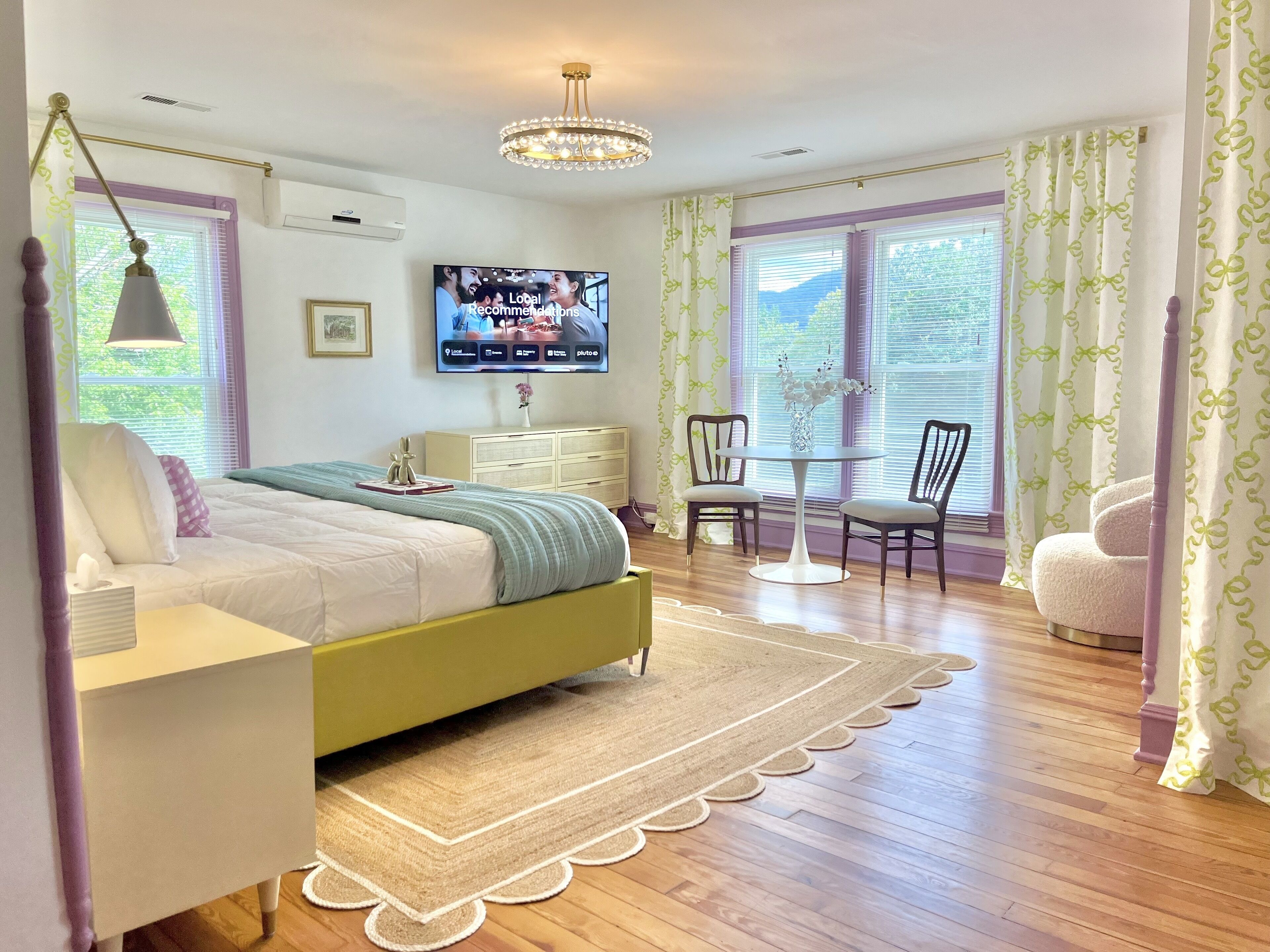 Welcome to the newly appointed Everett Estate: Where Modern Luxury Meets Historic Charm Welcome to the newly appointed Everett Estate: Where Modern Luxury Meets Historic Charm. Boasting picturesque mountain views, this 6,700 square ft home underwent a year-long renovation to modernize & revitalize both the home & the expansive grounds. With 10 all-suite rooms and 1 top-floor studio apartment, this boutique inn was expertly designed to host up to 30 overnight guests and weddings and events of up to 125 guests. Interior Design: Becky Seager | WKNDR Design of CharlottesvilleYou may see our personable and helpful staff throughout the common areas of the home during standard business hours of your stay to help keep it well maintained. There is a separate office on the interior of the home that remains locked when our staff is not onsite. There is another office area in a separate building that will sometimes be used by our crew, too. Located conveniently along Nelson 151 in Nelson County Virginia and the Blue Ridge Mountains! Nelson 151 is the travel destination for Virginia wine, craft beer, hard cider and outdoor recreation lovers. Route 151 is a designated Virginia scenic byway on the sunrise side of the Blue Ridge that connects the Nelson 151 member businesses.Six wineries (Afton Mountain Vineyards, Cardinal Point Vineyard and Winery, Flying Fox Vineyard and Winery, Hill Top Berry Farm & Winery, Valley Road Vineyards and Veritas Vineyard), three breweries (Blue Mountain Brewery, Devils Backbone Brewing Company and Three Notch'd), and two cideries (Blue Toad Hard Cider and Bold Rock Hard Cider) decided to form a group to more efficiently market and leverage their unique “micro” appellation. Nelson 151 was created.The Nelson 151 members recognize and celebrate the benefits of their proximity to one another in the pastoral Rockfish Valley. With orchards and farms, unique shopping, bed and breakfasts, local restaurants, community theater, hiking, biking, skiing, golf, fresh air and unforgettable views: Nelson 151 is the perfect choice for a day trip or weekend excursion.All self check-in- guests will be provided with a unique code that opens the front door and the door to their suite.Uniquely designed guest rooms, modern amenities, and thoughtful touches await you at Everett Estate. This restored Inn delivers a boutique experience filled with plenty of dazzling details and alluring views and amenities to ensure an unforgettable stay. Enjoy pure relaxation as you take in the sweeping views of the Blue Ridge Mountains. Sip your morning coffee from one of our numerous intimate hideaways. Indulge in a cozy cocktail while you converse with friends by the fire pits. The Layout:First FloorParlor- Moody living area with purple walls and conversational seating. This room has a full bath with a stand-up shower available for all guests to use. There is also a separate ADA-compliant half bath located inside of the parlor.Dining Room- Four separate 4-seat dining tables are great for card games, cocktails or meals. Original 110" high functional wood pocket doors separate the dining area from another living space, featuring 2 champagne velvet sofas, an additional 4-seat dining table for games or eating, and another half bath. Suite 7: - The second largest room- Access to a semi-private covered porch that is shared by guest rooms 8 and 9- King Bed- 55" Smart TV- Marble bath with extra large glass-enclosed shower with double shower heads- Keurig with coffee and tea fixings- Table and 2 chairs for WFHThis is a second-floor suite so stairs are required to access.Please Note: In an effort to create a peaceful and relaxing environment for all of our guests, we welcome well-behaved children ages 12 years and above to join their parent or guardian in our suites. Children of all ages are welcome to stay when you rent the entire Estate. We apologize for any inconvenience. Due to the nature of the property, guests are not allowed to bring their pets to stay.The property holds a rich history that traces back to its original owner, Dr. Charles Everett. This esteemed physician had the honor of serving as the personal physician for not just one, but three American Presidents: Jefferson, Madison, and Monroe. However, it was his close friendship with Thomas Jefferson that truly shaped the legacy of the estate. Together, they would venture from their separate residences in Charlottesville, Monticello, and the Belmont Tract to this very location, formerly known as Upland Manor. It was here that they would find solace in the serene surroundings and revel in the bountiful opportunities for hunting and fishing. We gladly paid homage to the esteemed Dr. Everett by bestowing his prestigious name upon the estate that now stands as a testament to his incredible legacy.While the property has changed hands multiple times throughout its history, its most recent iteration was as a thriving Bed and Breakfast called The Mark Addy Inn. Renowned for its exceptional accommodations and on-site restaurant, The Mark Addy Inn fostered a sense of community in Nelson County for countless years. However, under new ownership, the inn embarked upon a meticulous and respectful restoration process, both inside and out, culminating in an opulent boutique experience for by-the-night travelers and the ability to rent the whole estate for weddings and events. The rejuvenated design not only pays respect to a bygone era, but also reflects modern sensibilities by showcasing an array of vibrant and unique guest rooms, elegant common areas, and a complete revitalization of the surrounding grounds. These elements are masterfully intertwined through an enchanting color scheme and recurring patterns, ultimately creating an ambiance that captivates guests and transports them to an enchanting era of the past, with a contemporary twist. Discover the blend of modern hospitality and historic charm at Everett Estate—we can't wait to welcome you!