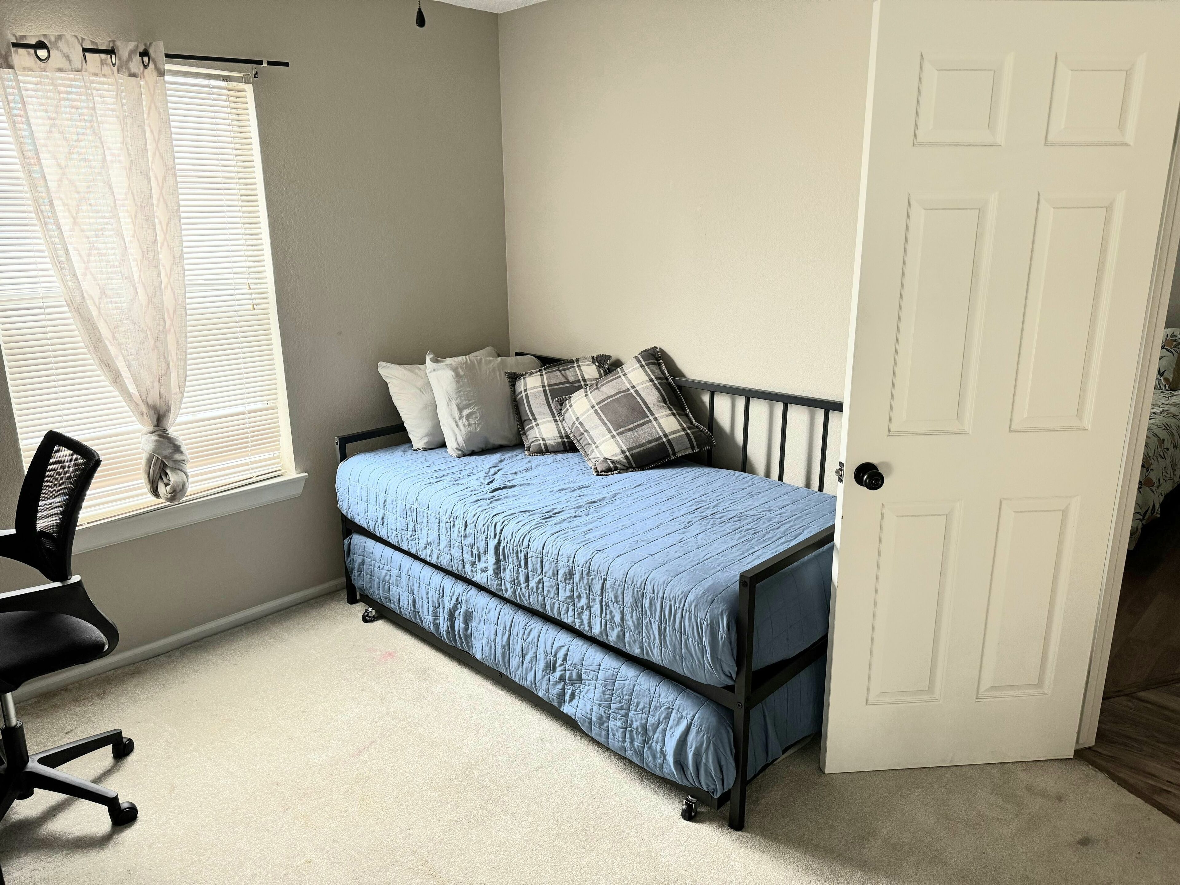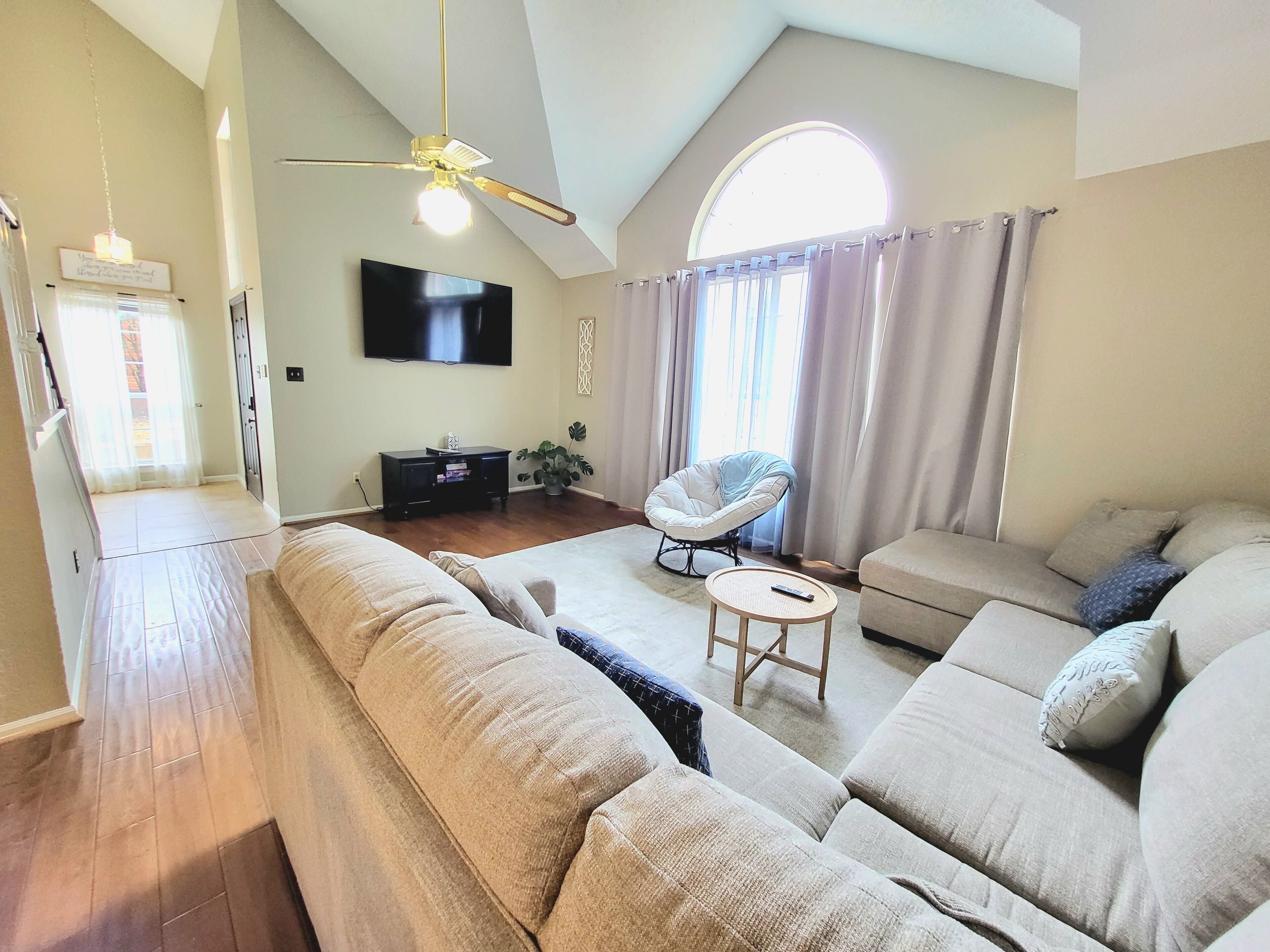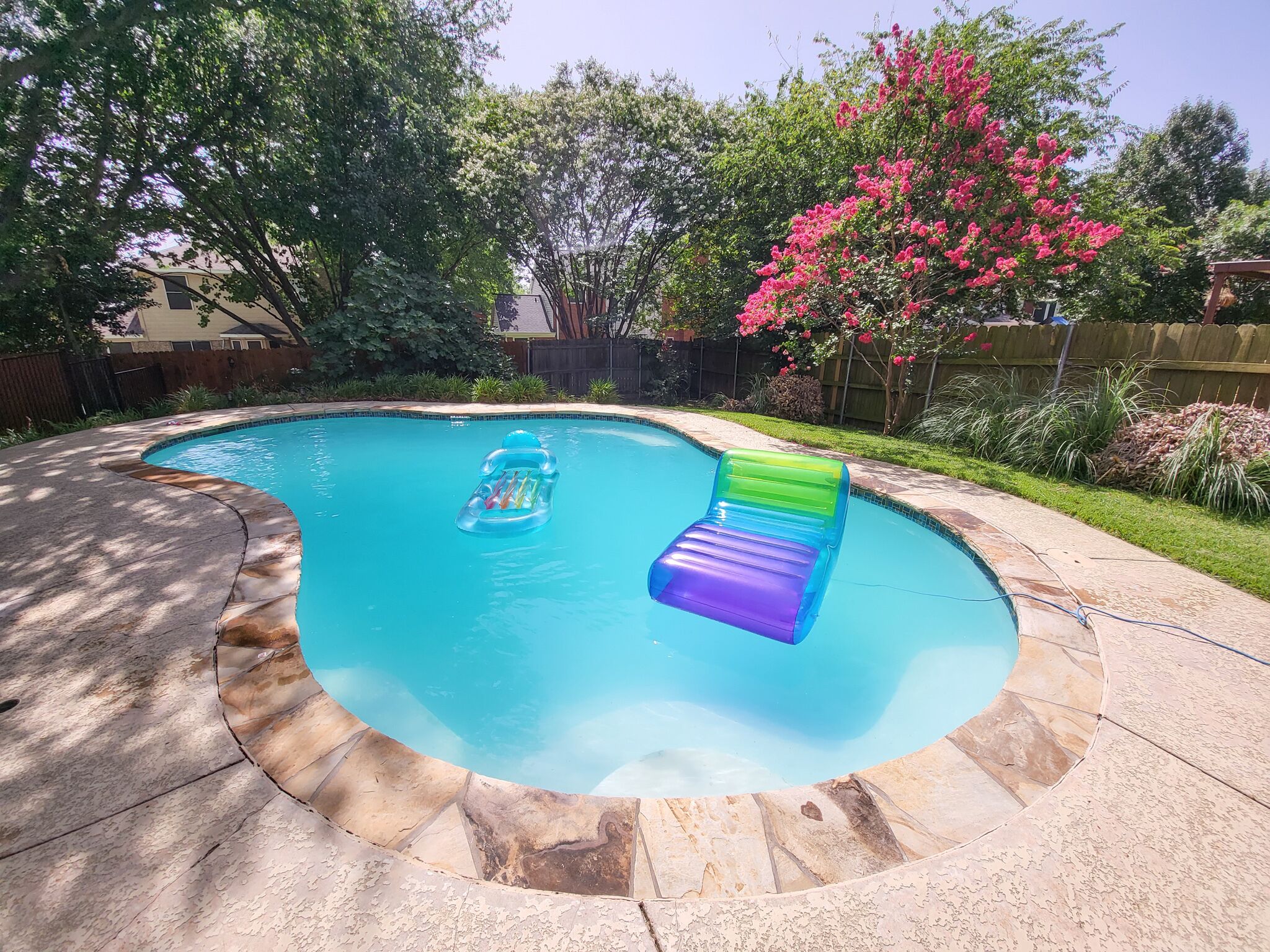 Charming family home with king bed - private pool - fast wifi - ARCADE Relax with the whole family at this peaceful property just outside Dallas/Ft Worth. This delightful home sleeps up to 8 and boasts comfy living spaces, a spacious kitchen, and a backyard pool. Mansfield offers the best of both worlds in being close to the big city, minutes from stores and dining, and yet maintaining a small town feel with friendly neighbors and easy to navigate streets. 35 minutes to DFW airport, 25 minutes to Six Flags, 40 minutes to downtown Dallas, 20 minutes to Midlothian and Waxahatchie.The spaceThe POOL! The pool is a salt water system and is surrounded by a security fence with a self locking gate. It is deepest in the middle at just under 6 ft. The pool is NOT HEATED and gets uncomfortably cold in the winter months. We do not recommend swimming if the temperature is below 70 degrees outside. PLEASE NOTE that there is a security camera by the back door that covers part of the patio and pool area. This is for liability reasons and checking up on our maintenance crews.The two player arcade has a huge assortment of games for you to enjoy.The livingroom was designed with comfort in mind with a cozy sectional and a large smart TV with Netflix provided. The diningroom has seating for 8. The kitchen is stocked with all the basic amenities and there is bar seating at the island. Off the kitchen is a nice sitting area with a wood burning fireplace and couch. Also on the main floor is a small laundry room and a half bath.All the bedrooms are on the second floor, as well as an office and the main bathroom. The primary bedroom has a king bed and a large onsuite bathroom with a large tub as well as a shower. The two secondary bedrooms have queen beds. The office has a desk and a day bed with a trundle. The office is open to the livingroom below.Other things to noteWe have a pool service and a mowing service that access the yard once a week.