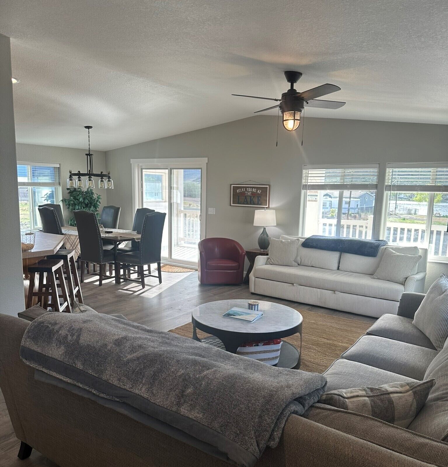 Beautiful Blue Lake Retreat Home with Private Dock Access Beautifully remodeled home sleeps 6 adults plus 4 children with many amenities for a comfortable stay. Inside, enjoy amenities including high-speed internet, a fully stocked kitchen with new appliances, smart TV, games for the family, washer and dryer, complimentary coffee and other goods. Comfortable beds and rooms, with all linens, extra blankets, and towels provided. The primary bedroom features a king bed and an adjoining bathroom with shower. The second bedroom features a bunk bed with two full-sized beds. There is also a bonus room with a full-sized futon, and a pull-out queen bed in the living room. The main bathroom has a shower and bathtub. Outdoor amenities include a covered deck off of the home overlooking Blue Lake, hot tub, fire pit, a shared private dock, and water access for your convenience. We recommend no more than 6 adults, plus children for a total of 10 guests to ensure a comfortable stay, however additional guests may be added to your reservation for an extra nightly fee. We also offer RV parking and power hook-up for an additional cost, please inquire upon booking. Additional amenities such as paddle boards or bicycles may be available upon request, please inquire at booking.