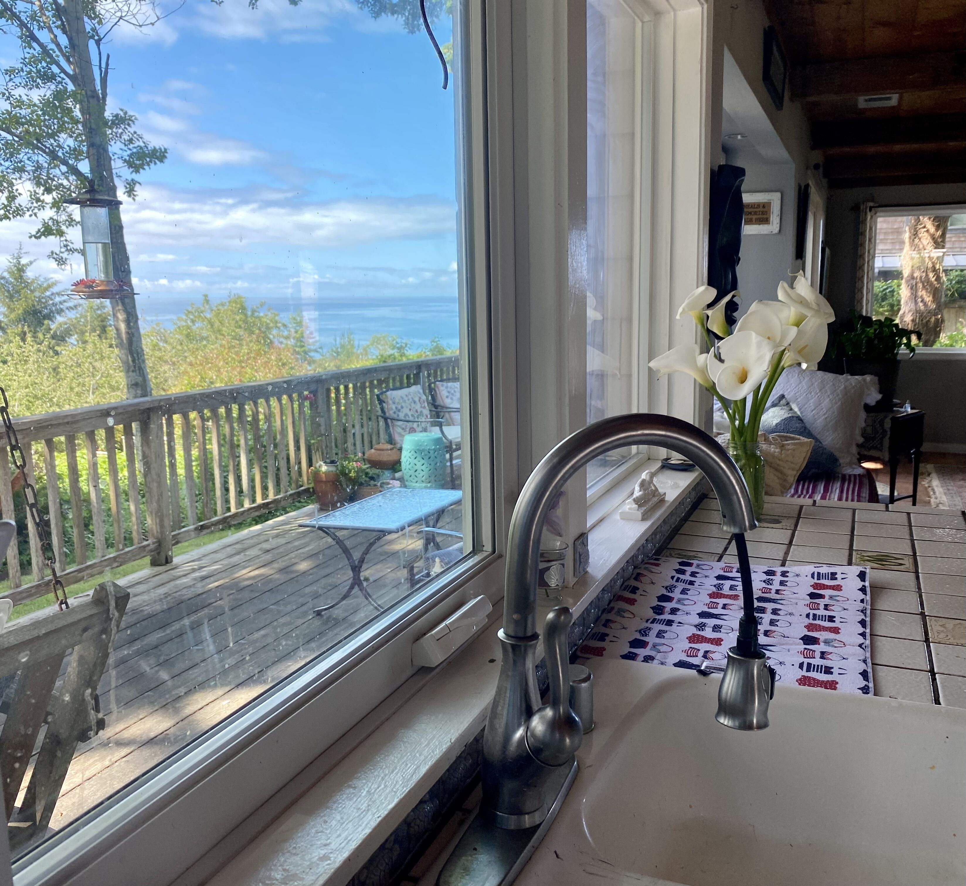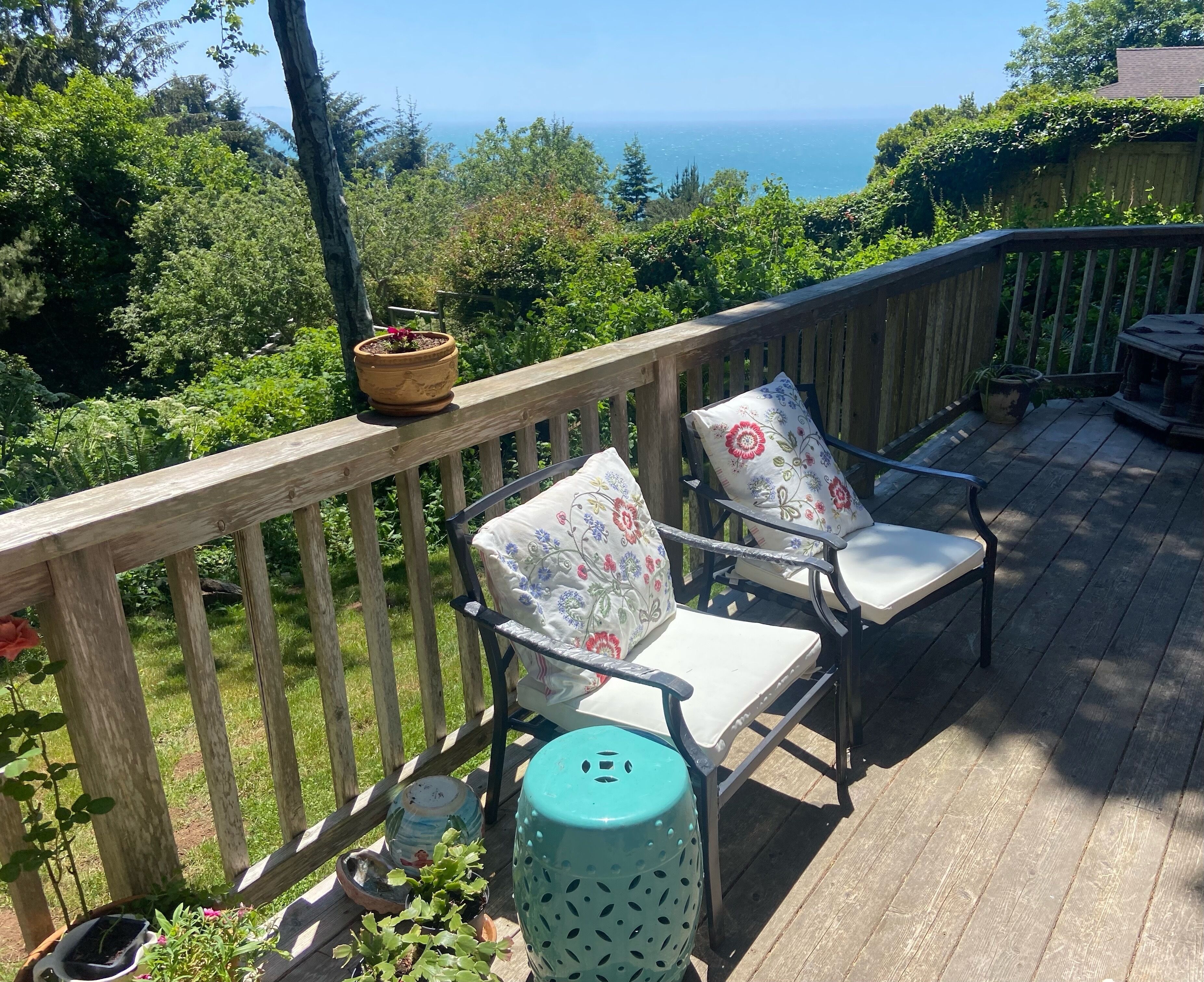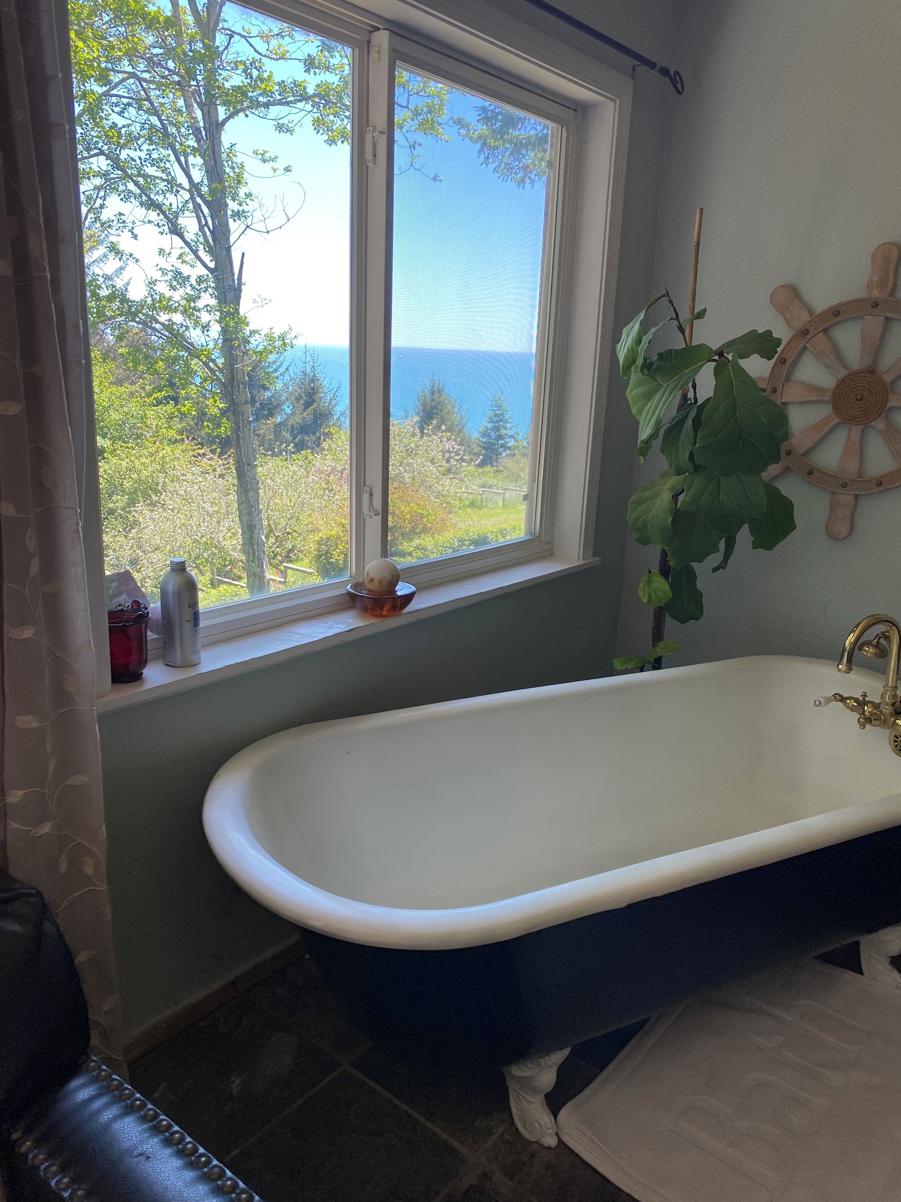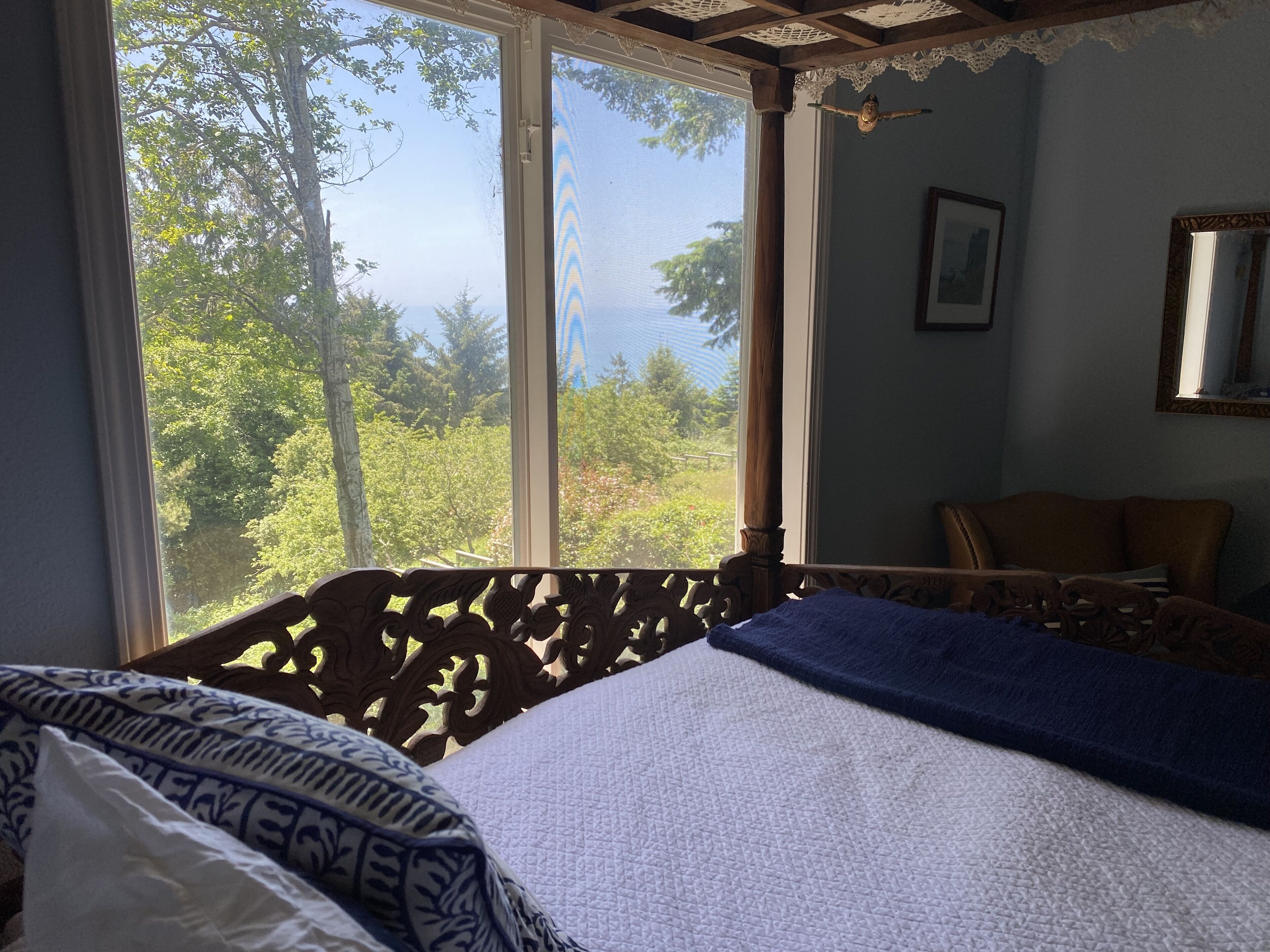 Ocean View Beach House- lush acre with gardens and a trail to beach! This property is end of the road and has privacy with beautiful ocean views! Ocean views from the three upstairs bedrooms as well. Outside is a ping pong table, barbeque, large deck, hot tub, outdoor shower and a lush, always changing garden which make it a perfect retreat for people to gather and also have private space. The master bedroom features a king size bed, en-suite bath, juliette balcony, walk-in closet, and a claw foot tub. The hand carved Javanese bed in the second bedroom is a magical experience with ocean views from both windows. The third bedroom has two new, comfortable full size beds and plenty of space to unpack for your stay. This humble, eclectic home has a well appointed kitchen, and sits minutes from the beach via car or private trail.