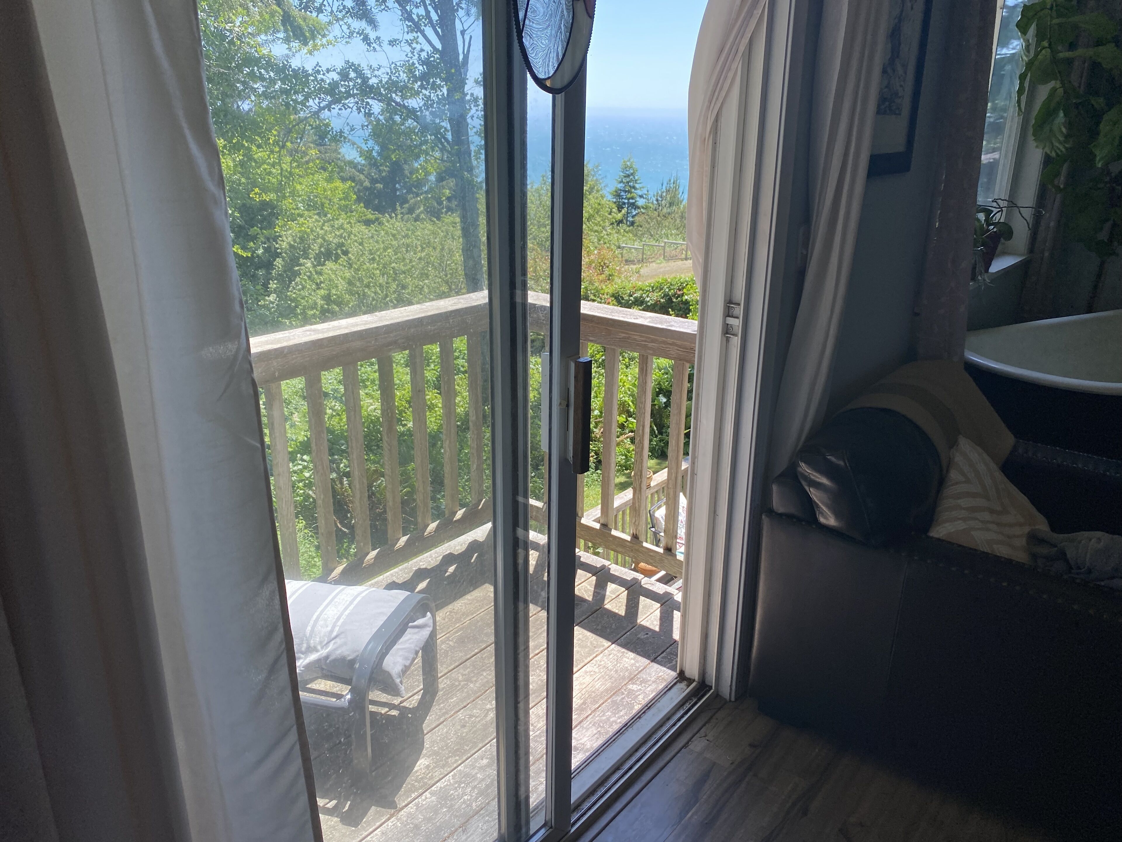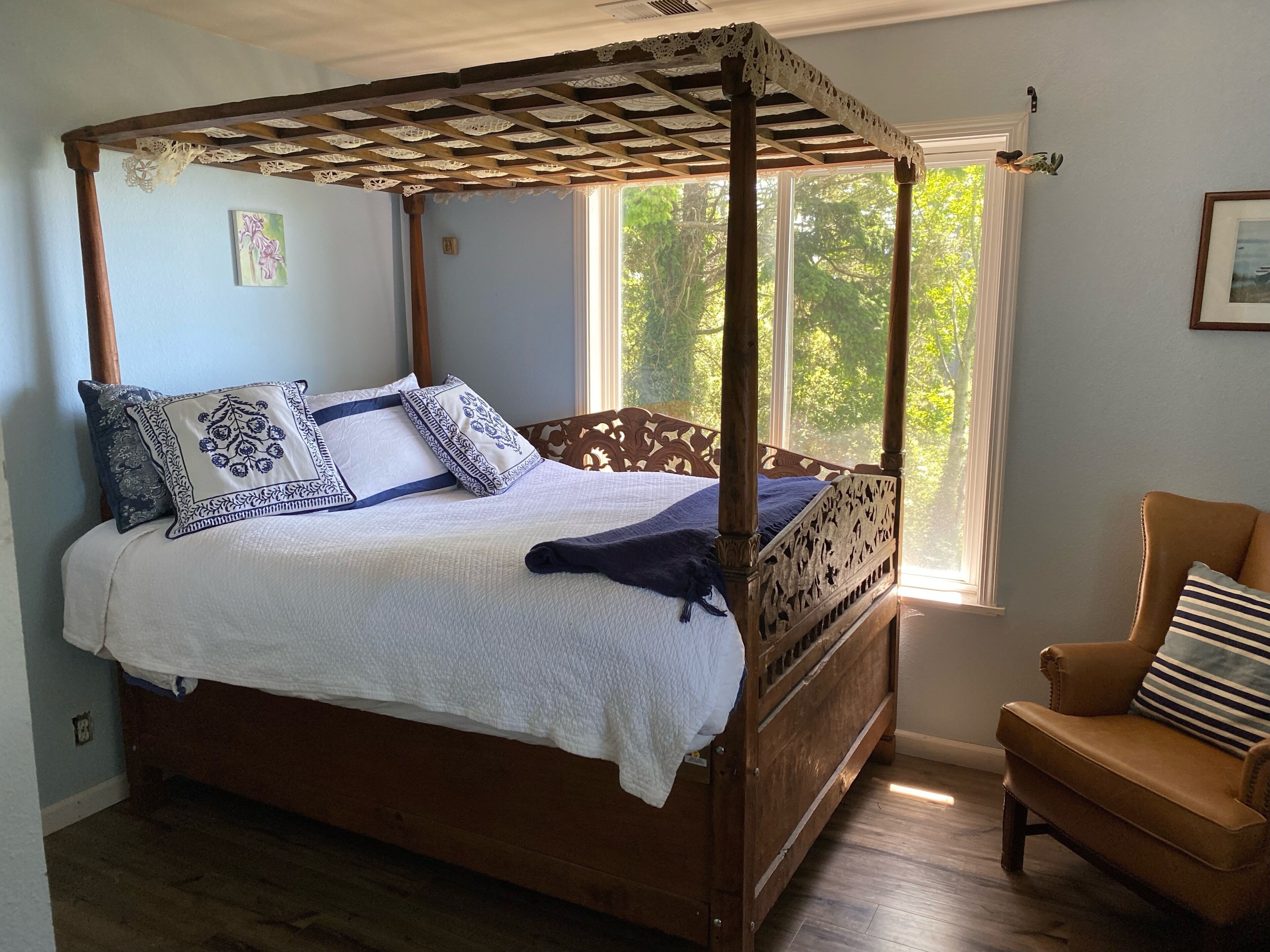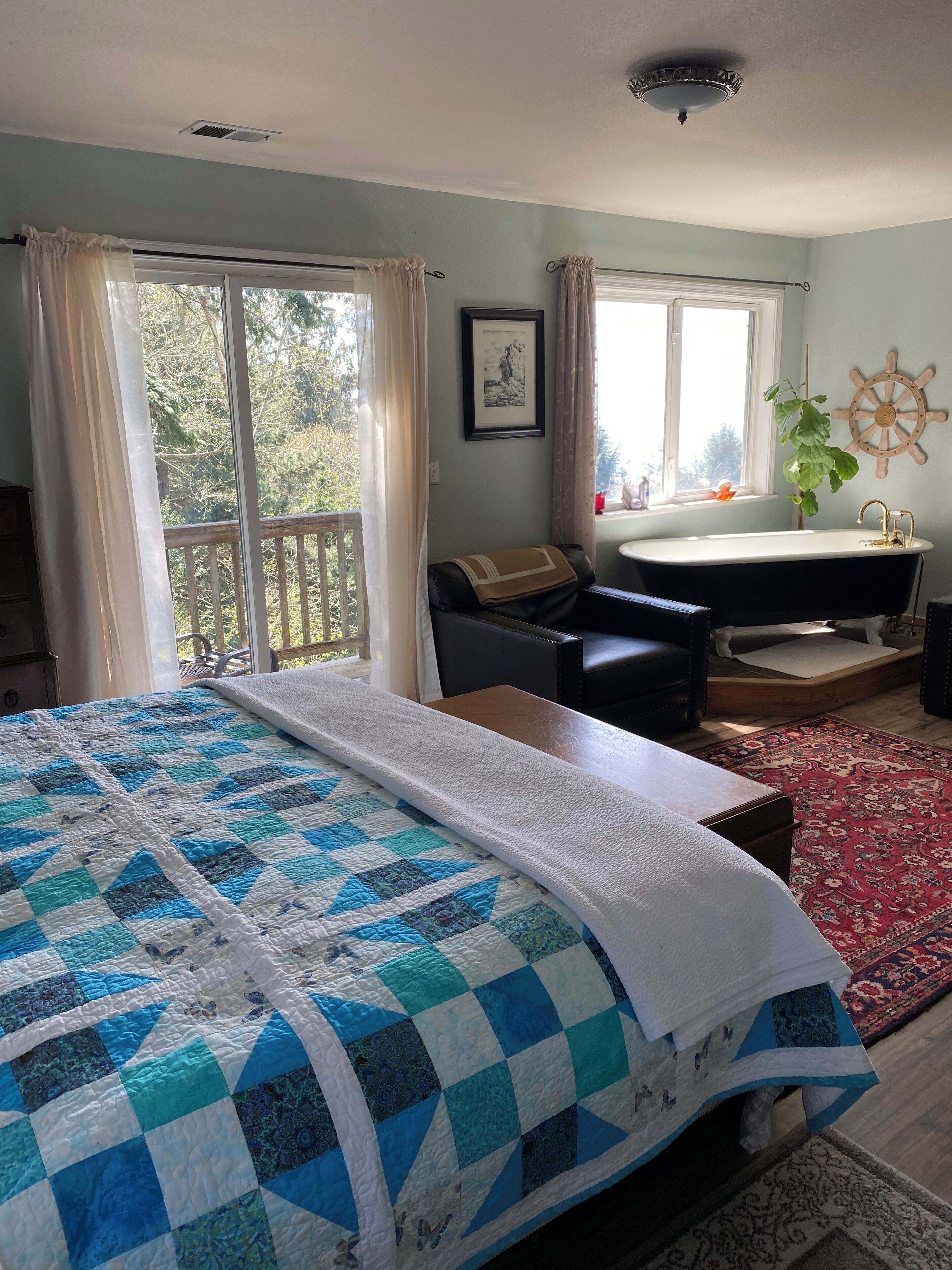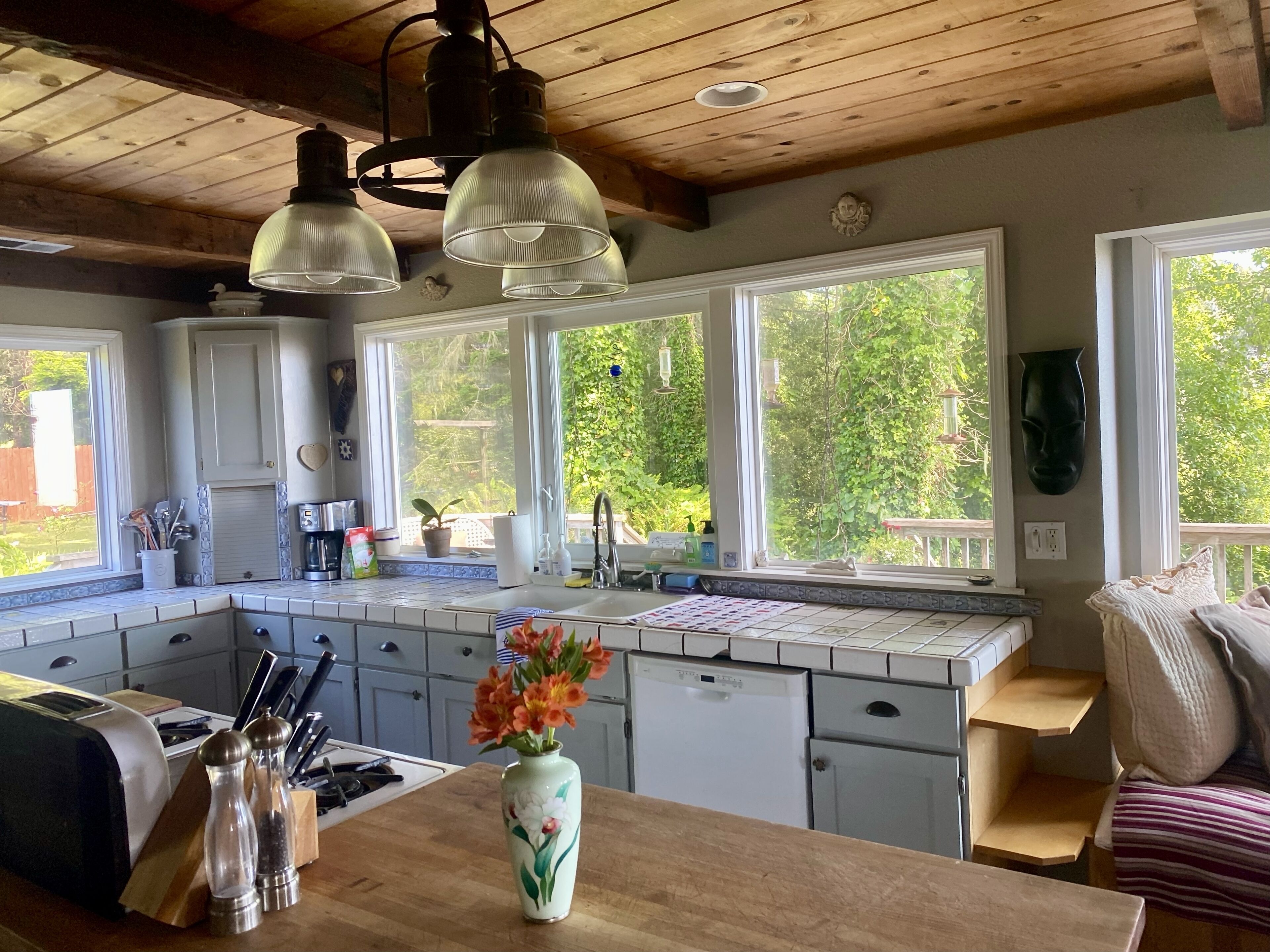 Ocean View Beach House- lush acre with gardens and a trail to beach! This property is end of the road and has privacy with beautiful ocean views! Ocean views from the three upstairs bedrooms as well. Outside is a ping pong table, barbeque, large deck, hot tub, outdoor shower and a lush, always changing garden which make it a perfect retreat for people to gather and also have private space. The master bedroom features a king size bed, en-suite bath, juliette balcony, walk-in closet, and a claw foot tub. The hand carved Javanese bed in the second bedroom is a magical experience with ocean views from both windows. The third bedroom has two new, comfortable full size beds and plenty of space to unpack for your stay. This humble, eclectic home has a well appointed kitchen, and sits minutes from the beach via car or private trail.
