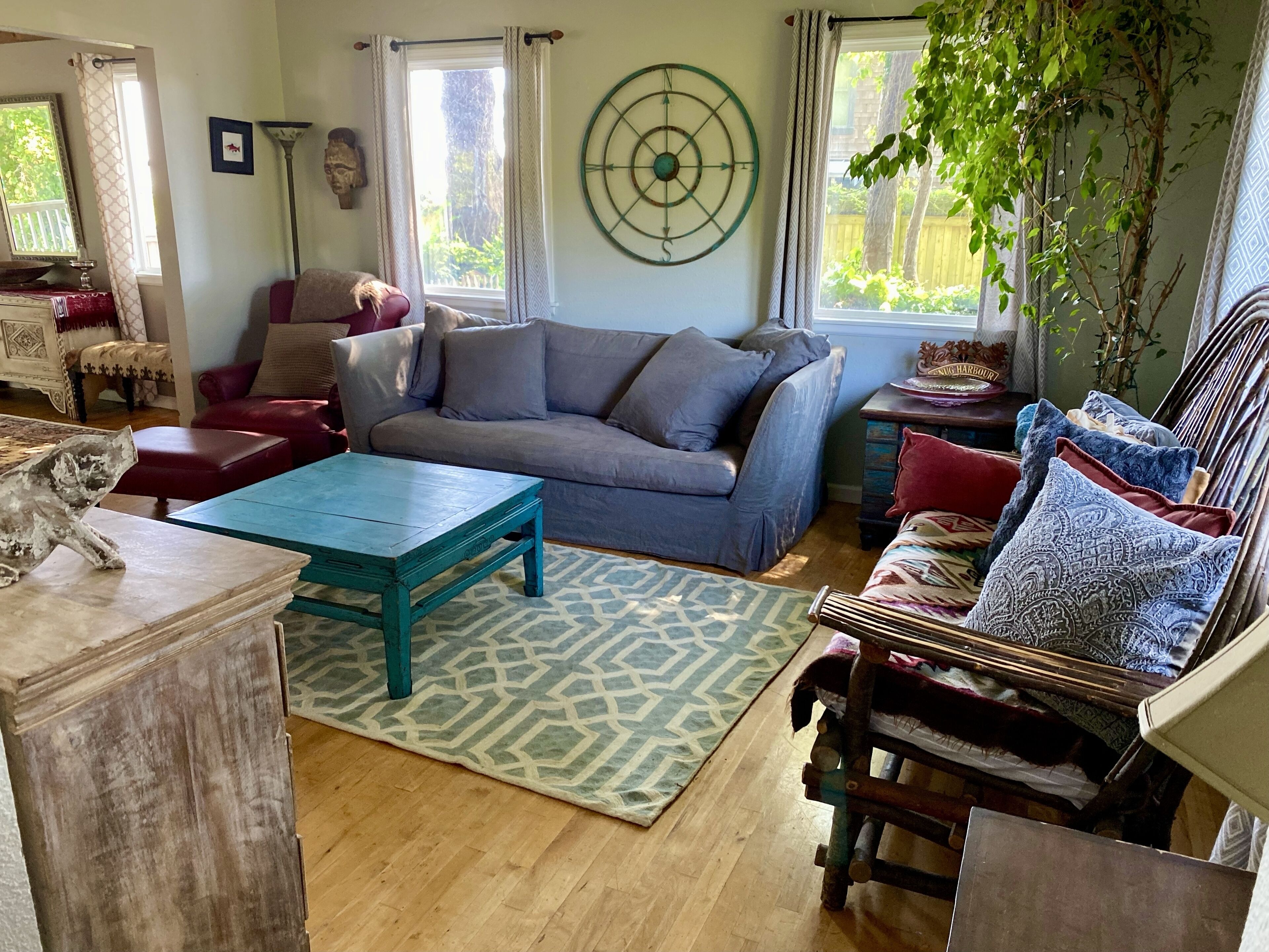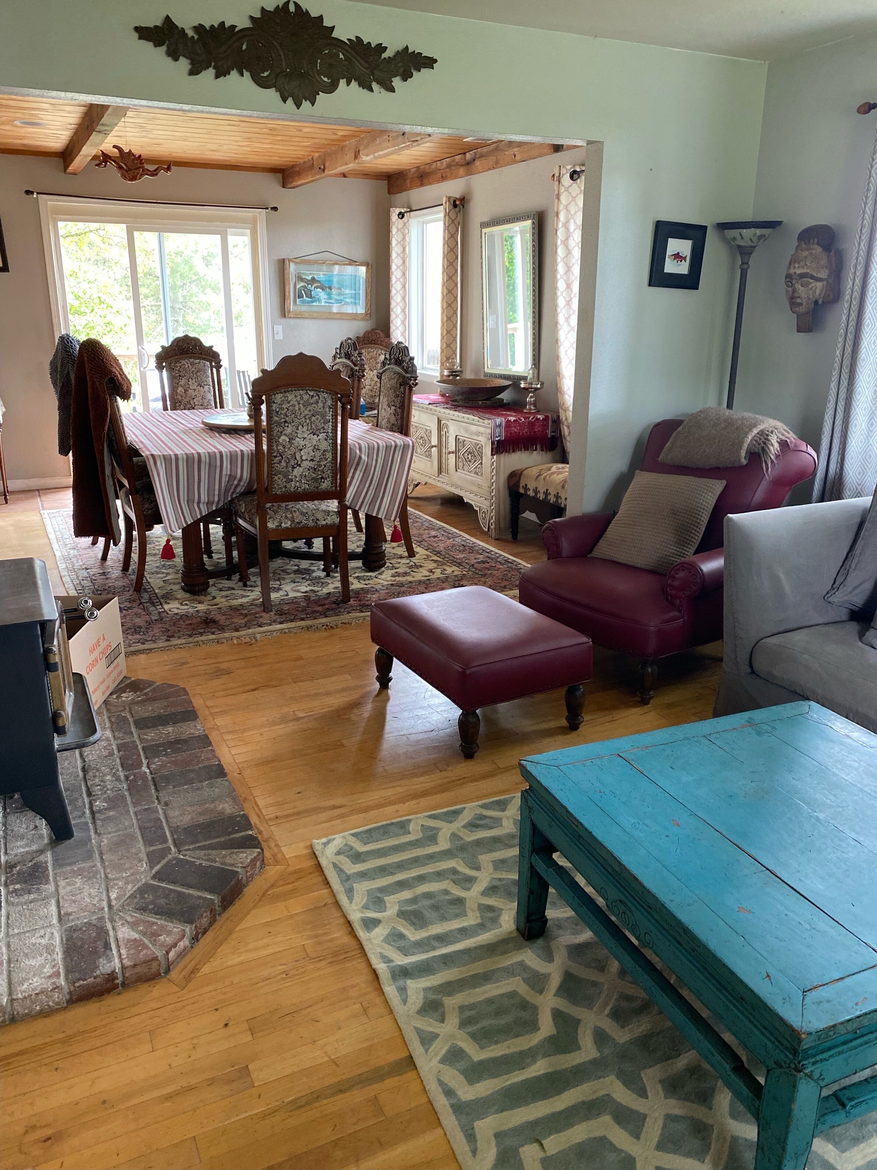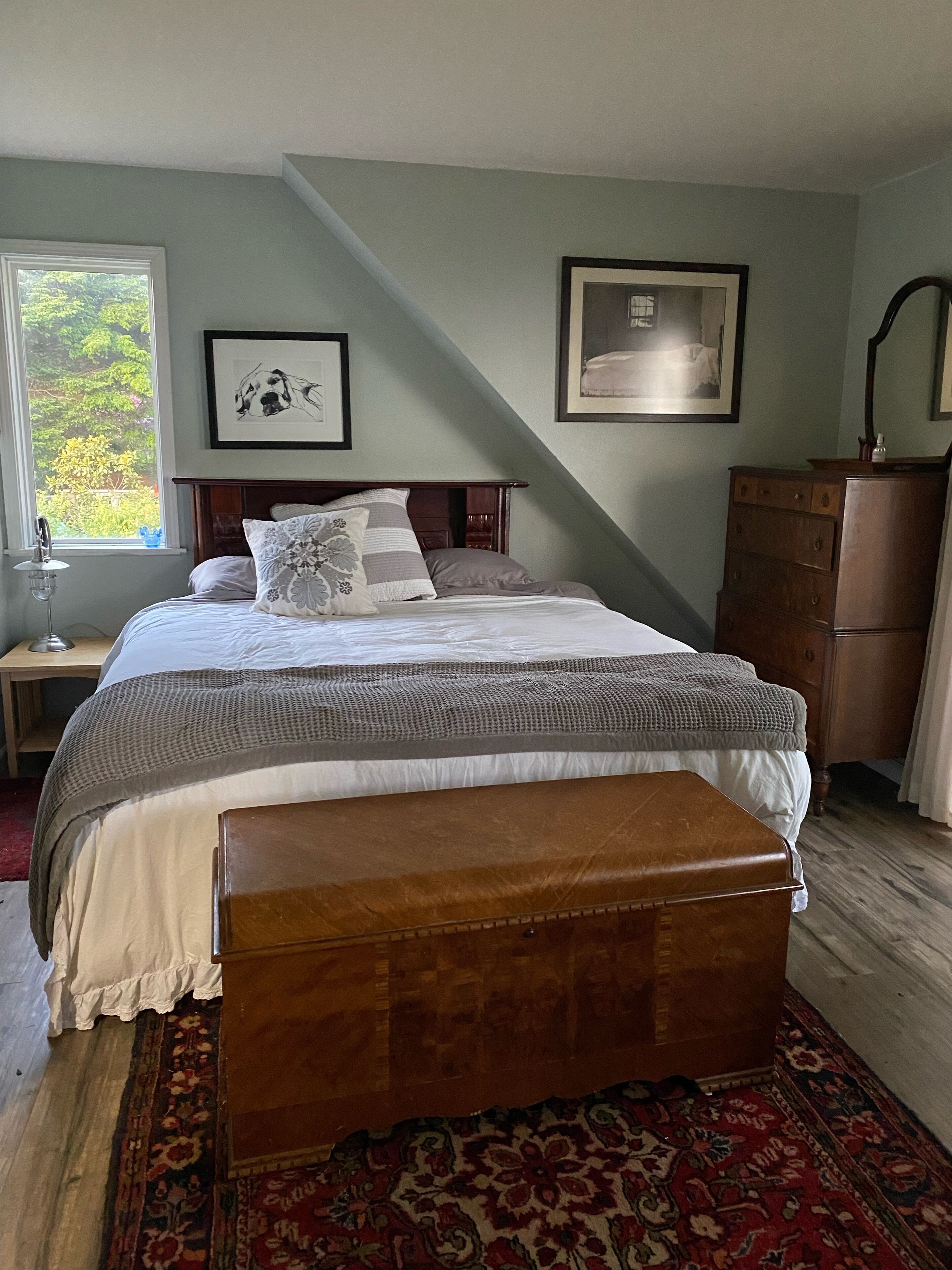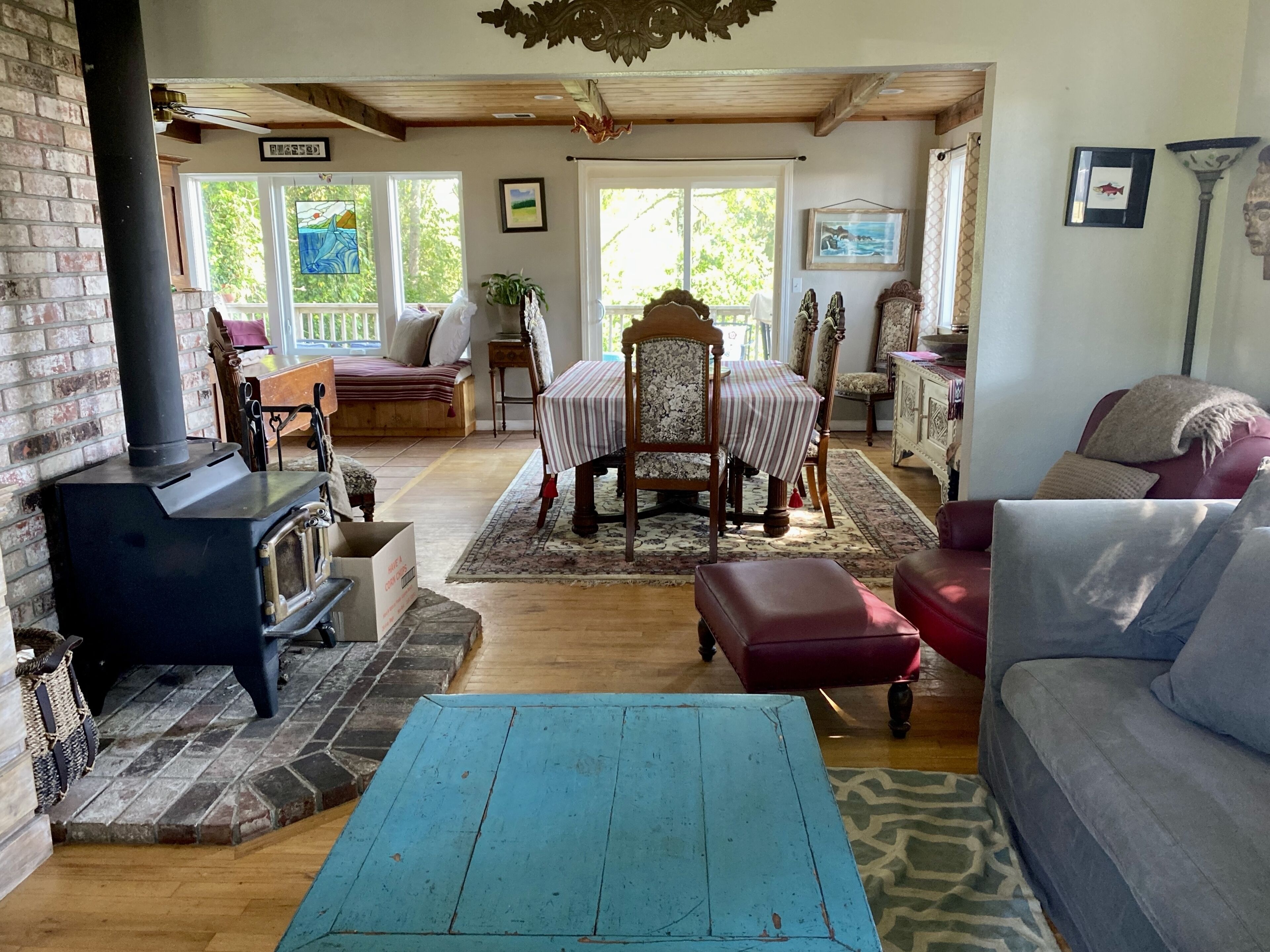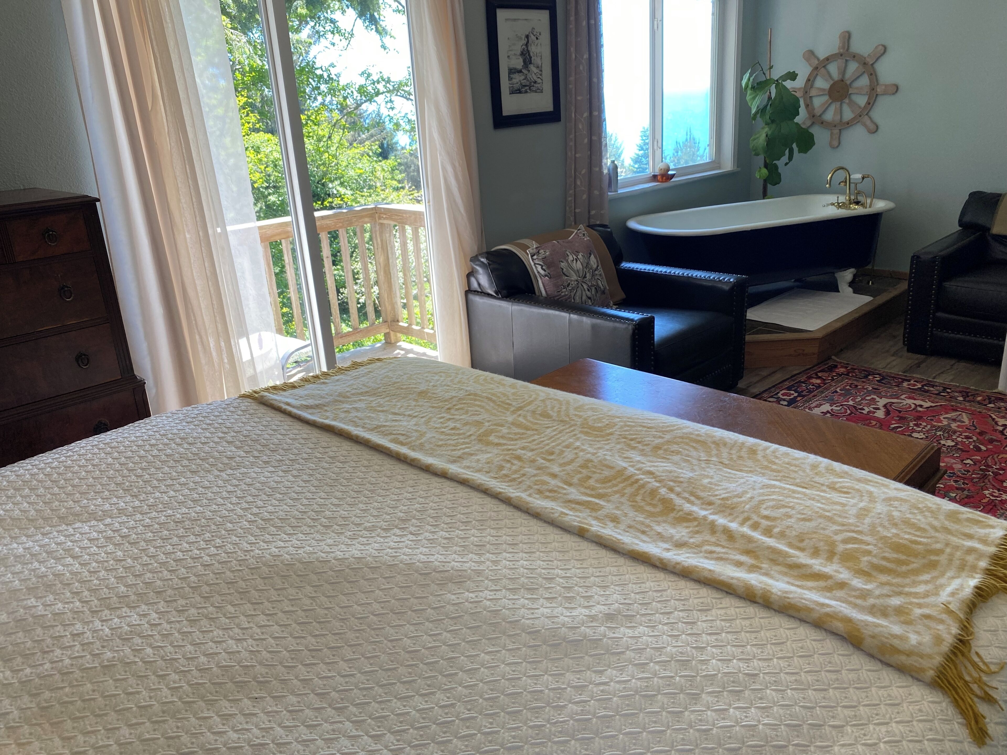 Ocean View Beach House- lush acre with gardens and a trail to beach! This property is end of the road and has privacy with beautiful ocean views! Ocean views from the three upstairs bedrooms as well. Outside is a ping pong table, barbeque, large deck, hot tub, outdoor shower and a lush, always changing garden which make it a perfect retreat for people to gather and also have private space. The master bedroom features a king size bed, en-suite bath, juliette balcony, walk-in closet, and a claw foot tub. The hand carved Javanese bed in the second bedroom is a magical experience with ocean views from both windows. The third bedroom has two new, comfortable full size beds and plenty of space to unpack for your stay. This humble, eclectic home has a well appointed kitchen, and sits minutes from the beach via car or private trail.
