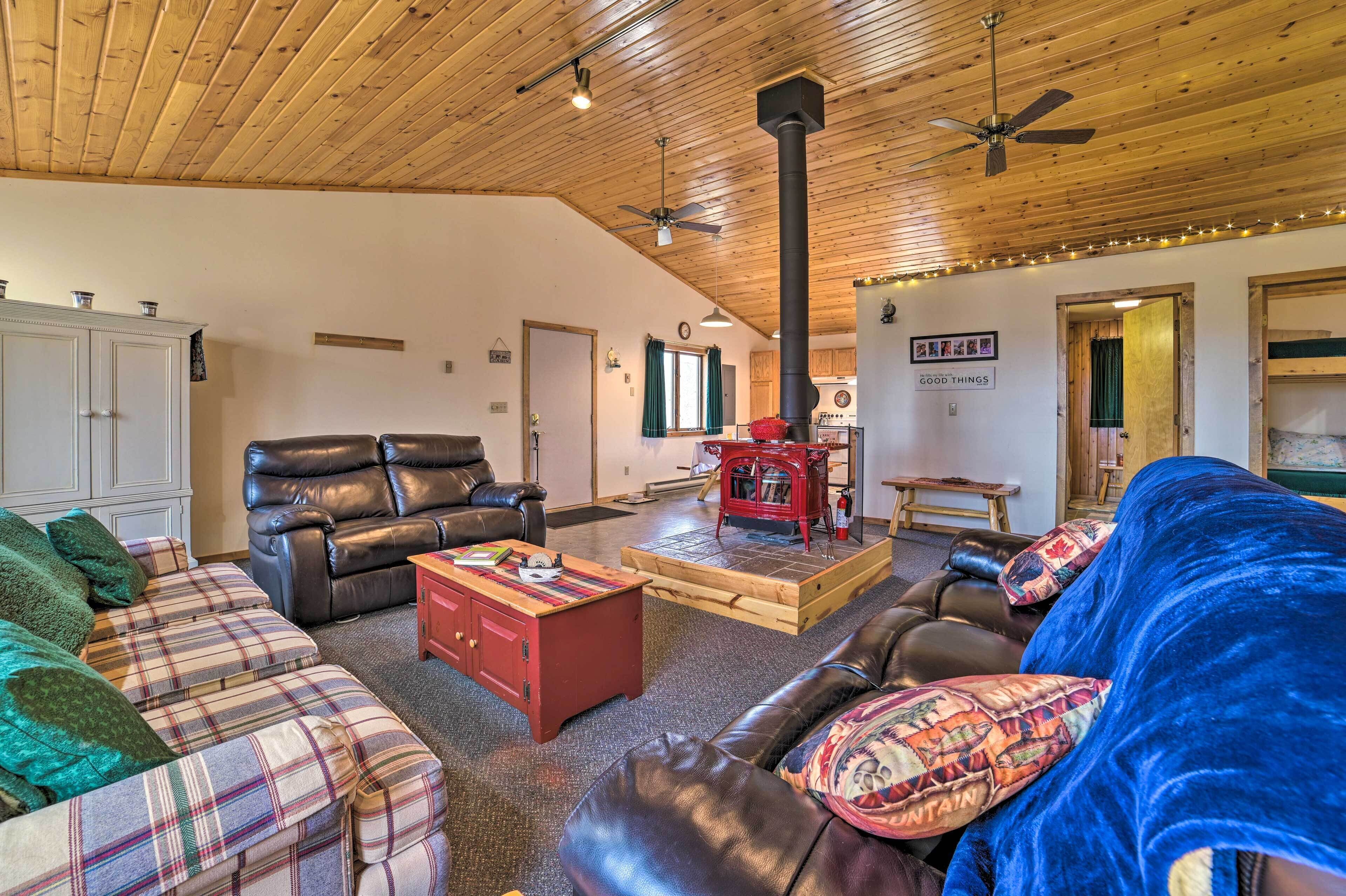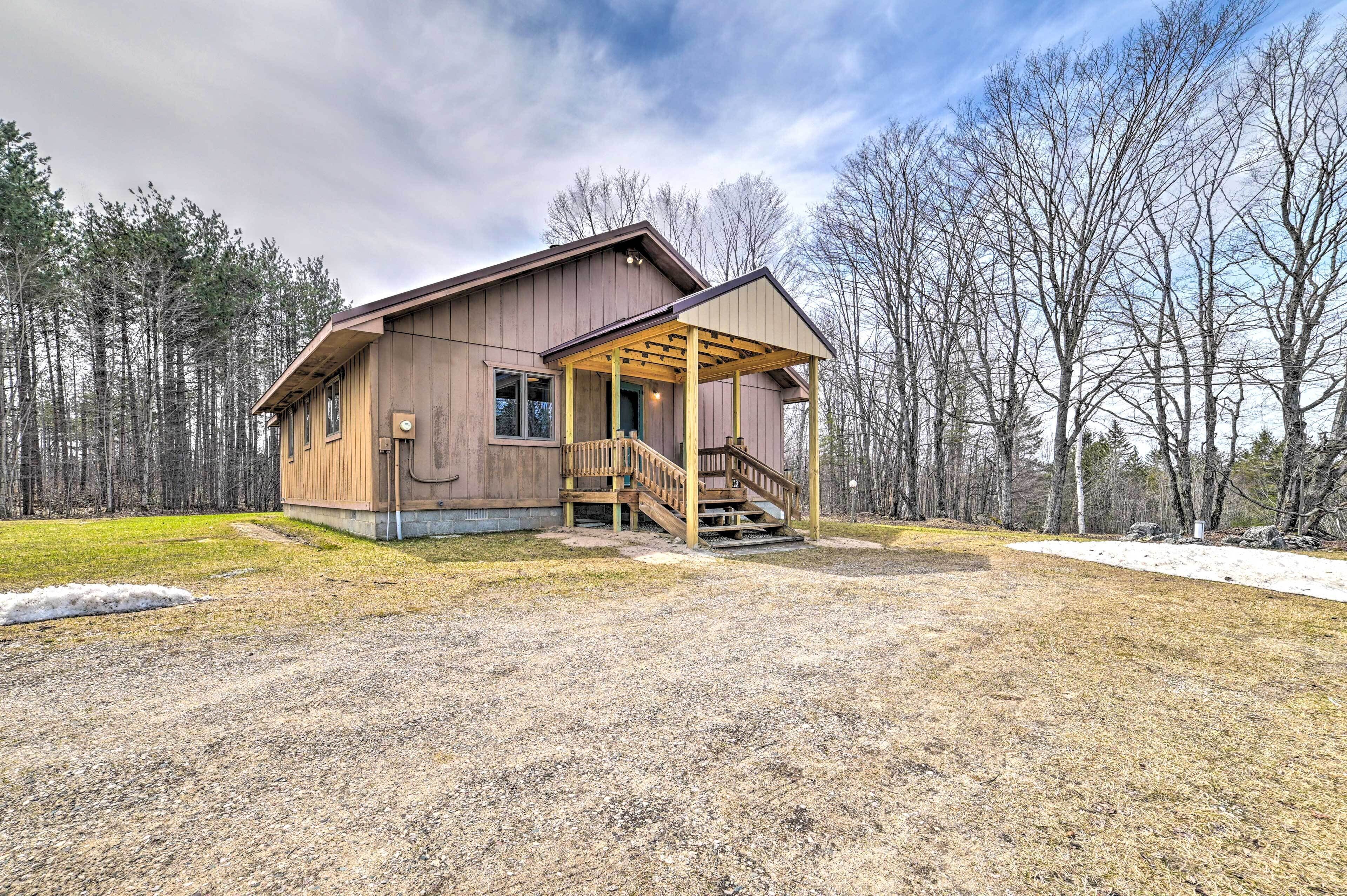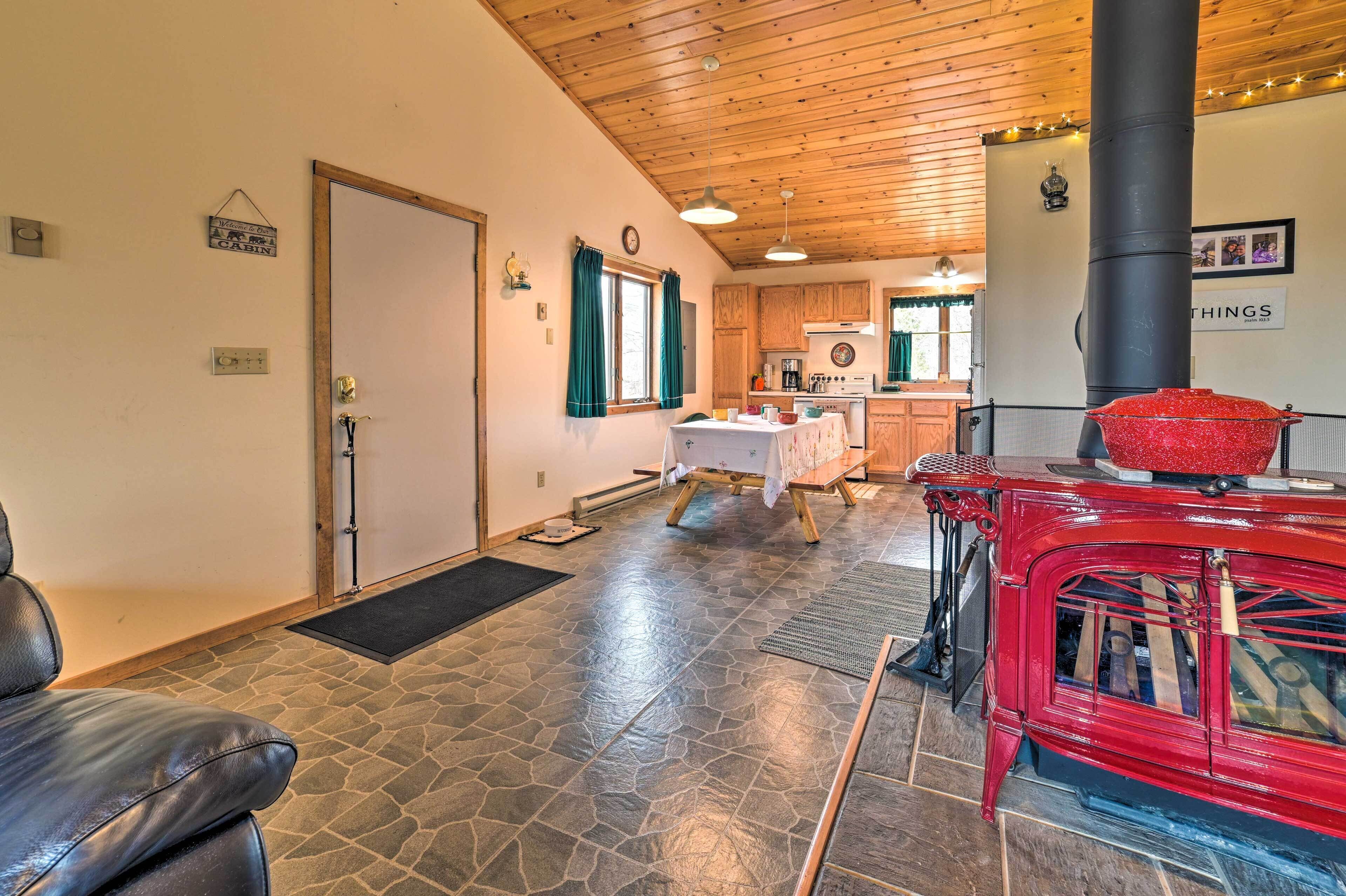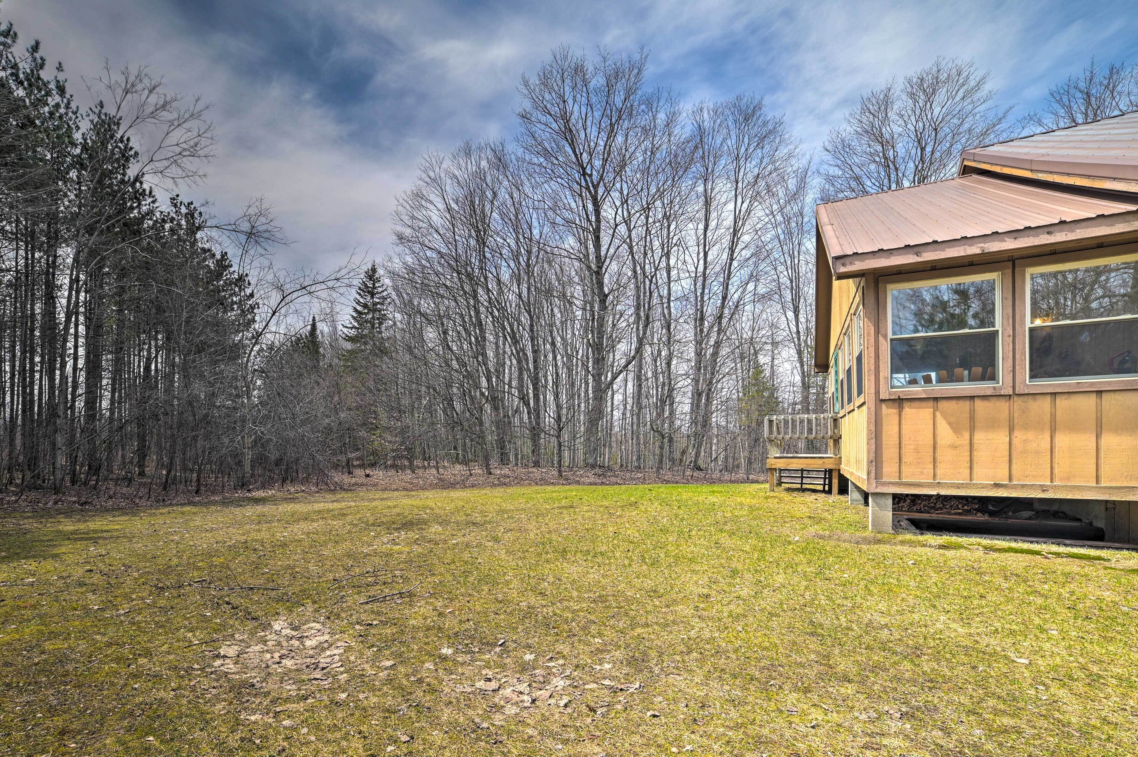 Cabin on 10 Acres Surrounded by National Forest! Enjoy a stay at this secluded Moran vacation rental located on 10 beautifully wooded acres! Open year-round, this 2-bed, 1-bath Trout Lake retreat features a beautiful great room with a cast iron stove, full kitchen, and large screened porch. This woodsy cabin is nestled between State and National forests, great fishing spots, and snowmobile trails...