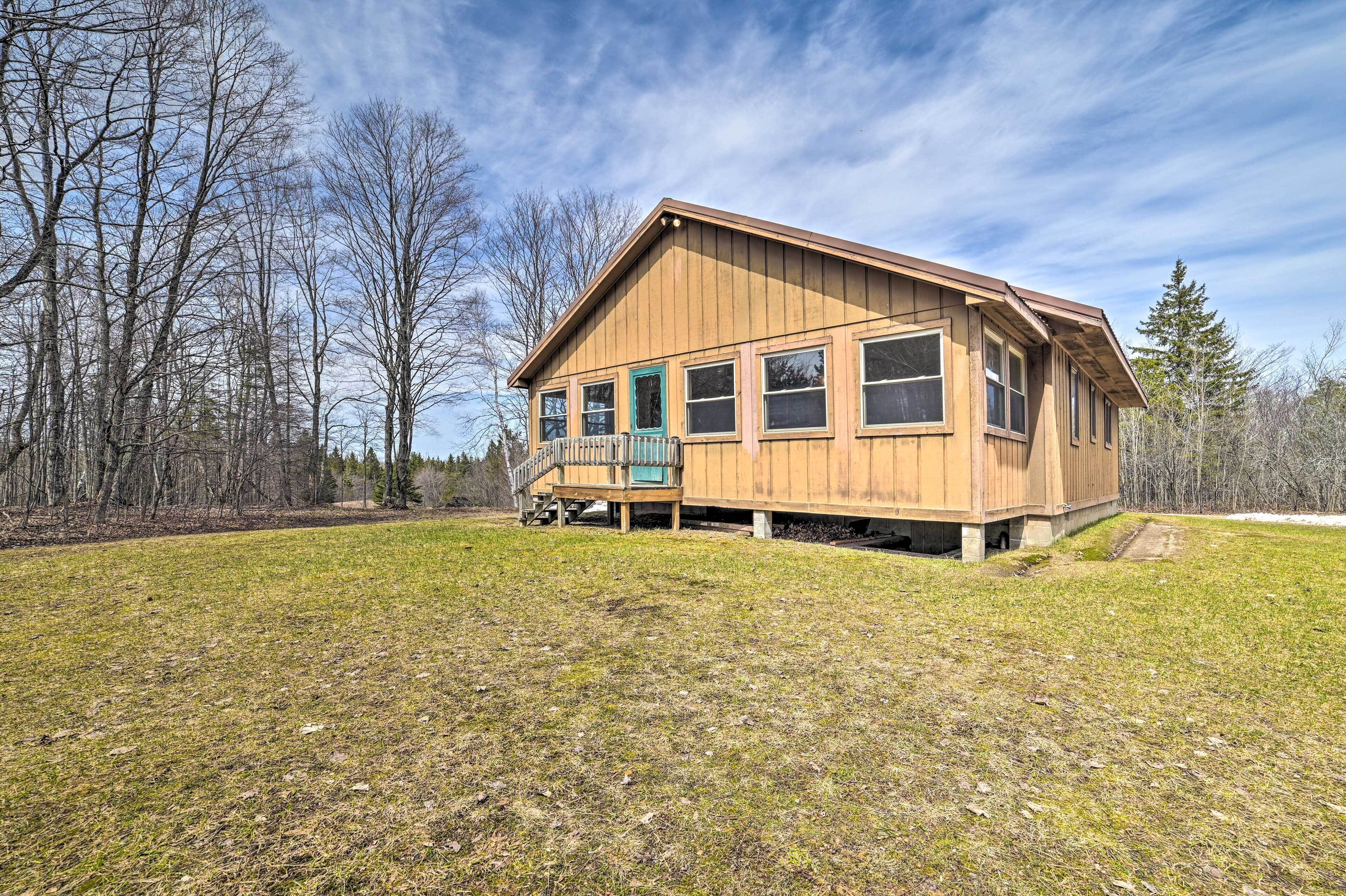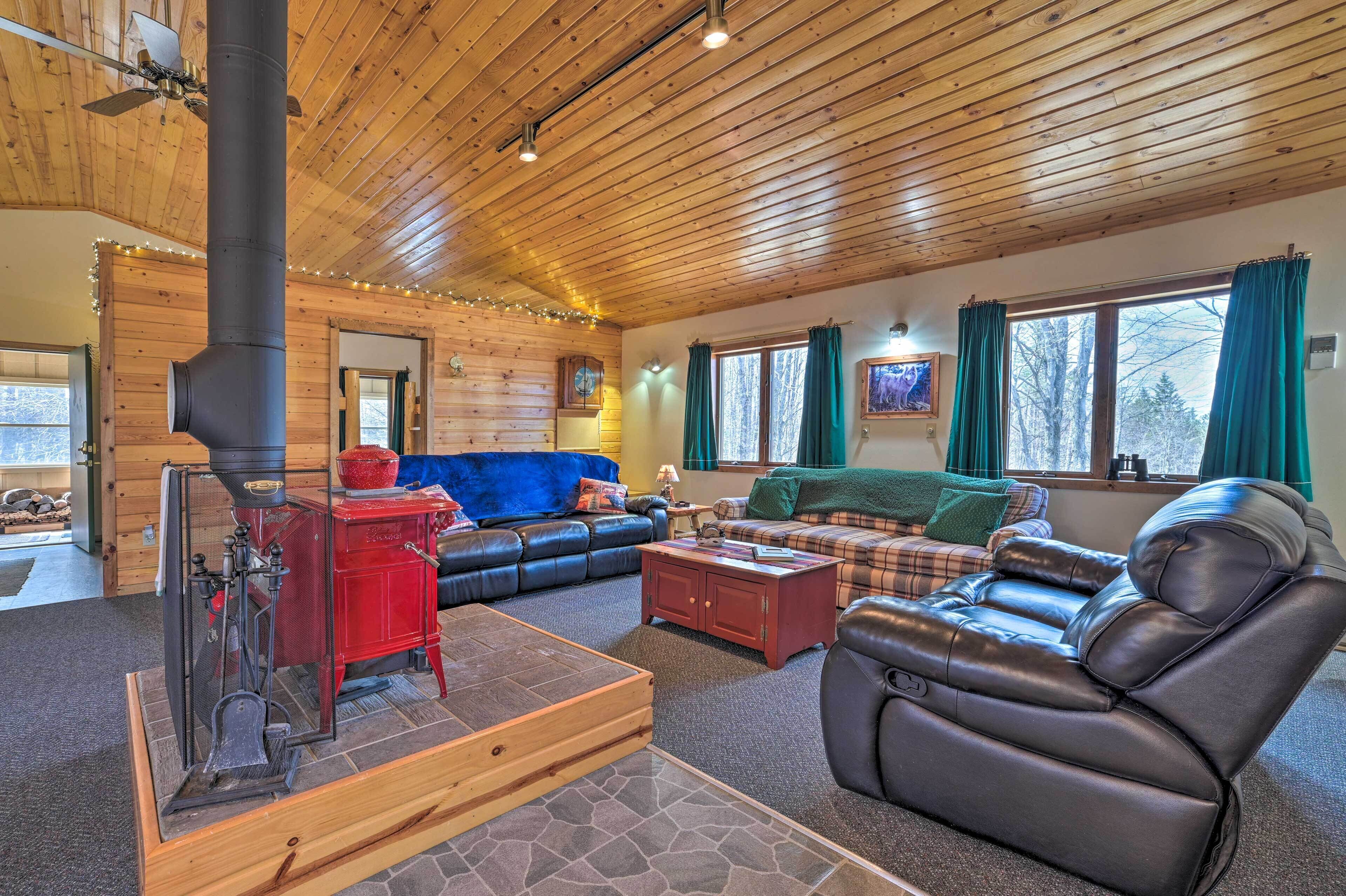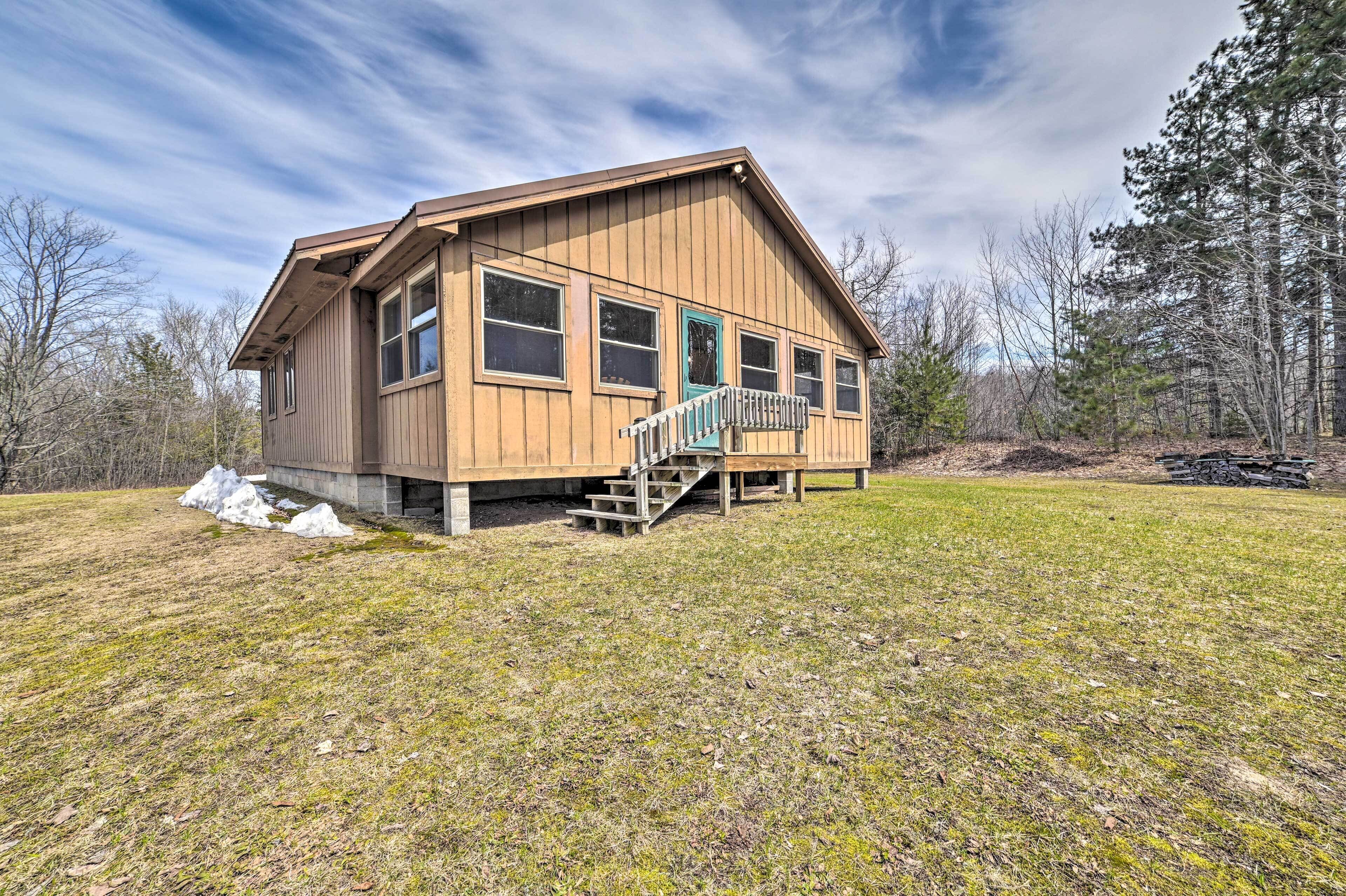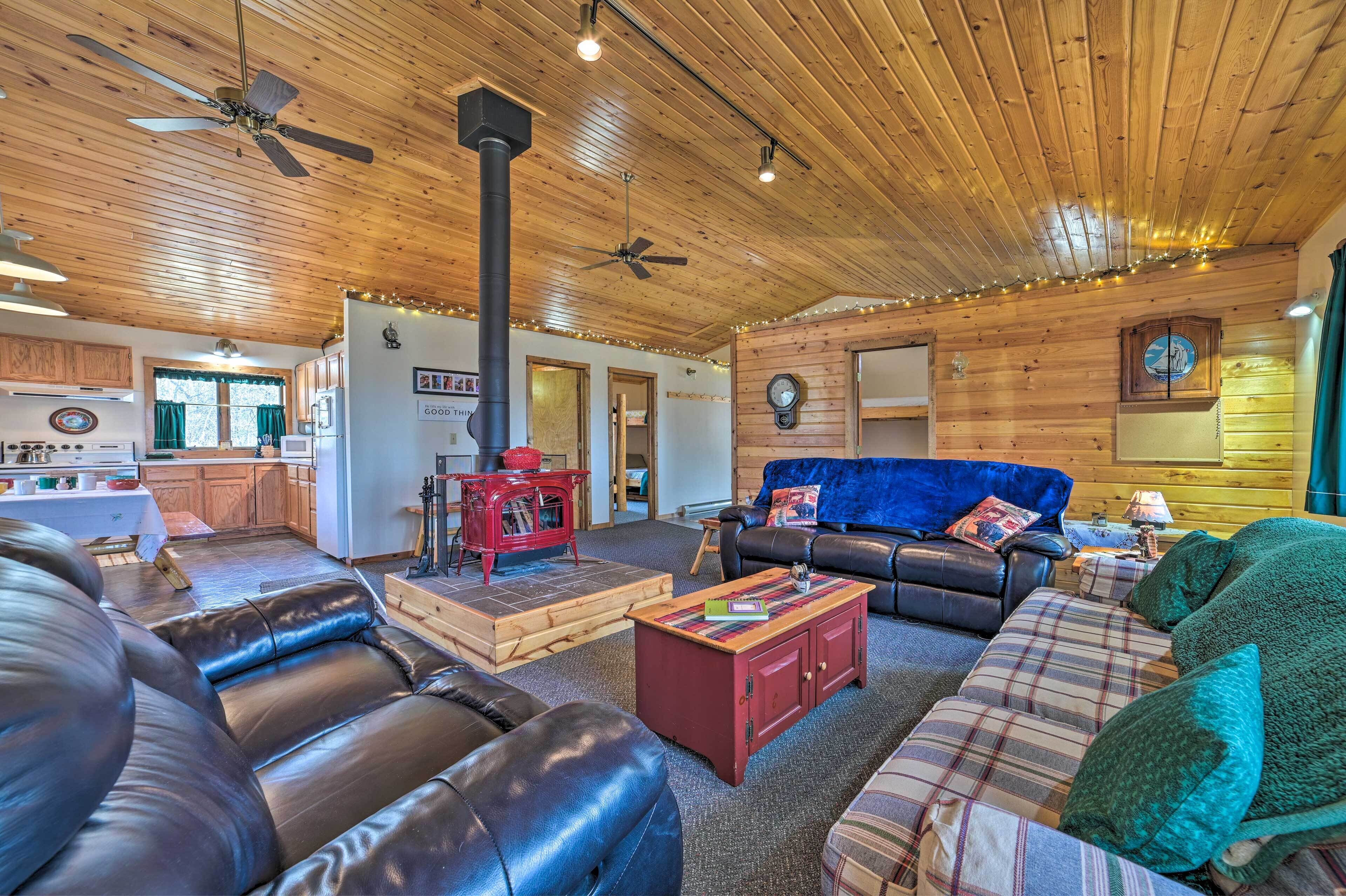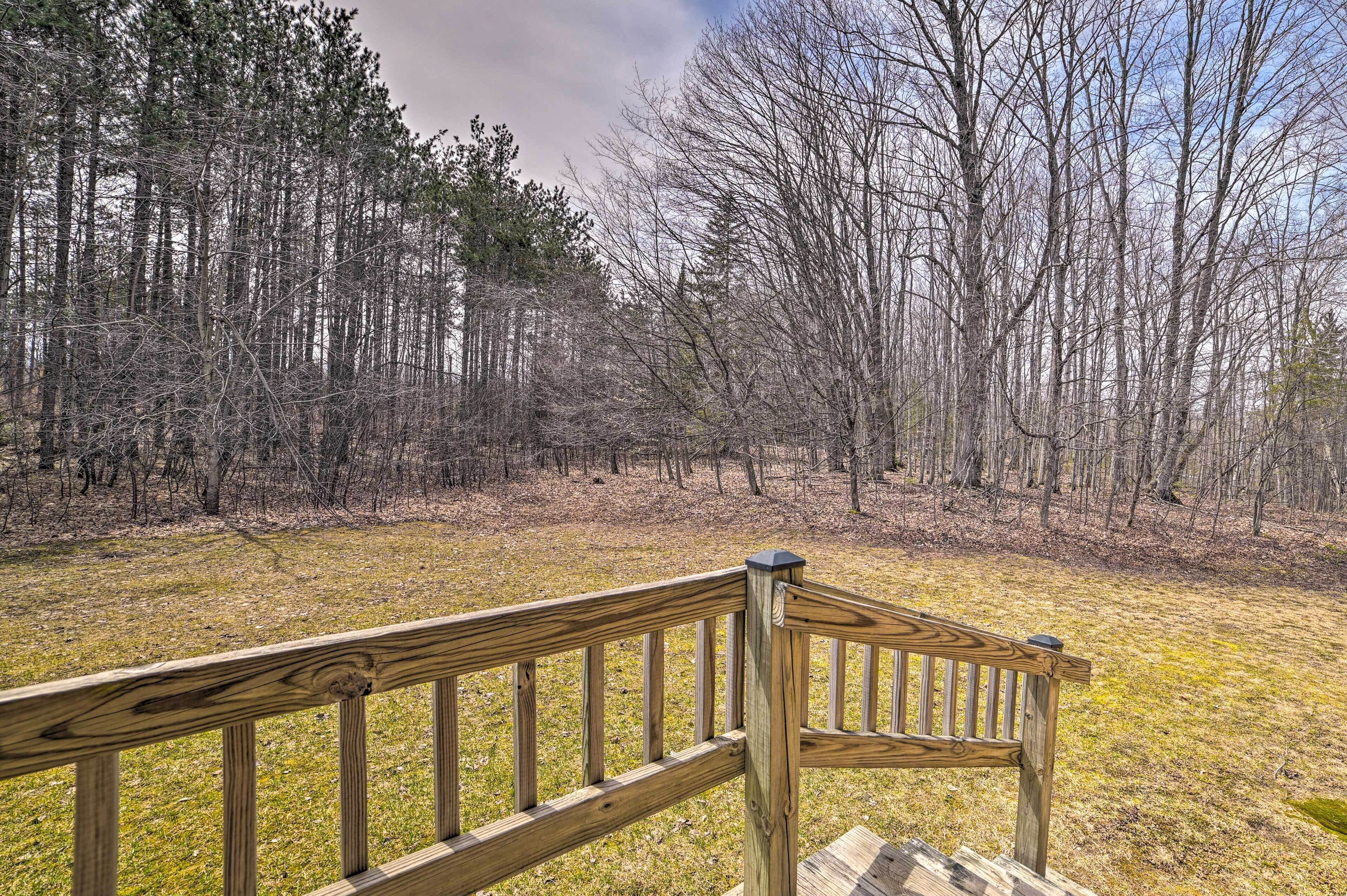 Cabin on 10 Acres Surrounded by National Forest! Enjoy a stay at this secluded Moran vacation rental located on 10 beautifully wooded acres! Open year-round, this 2-bed, 1-bath Trout Lake retreat features a beautiful great room with a cast iron stove, full kitchen, and large screened porch. This woodsy cabin is nestled between State and National forests, great fishing spots, and snowmobile trails...