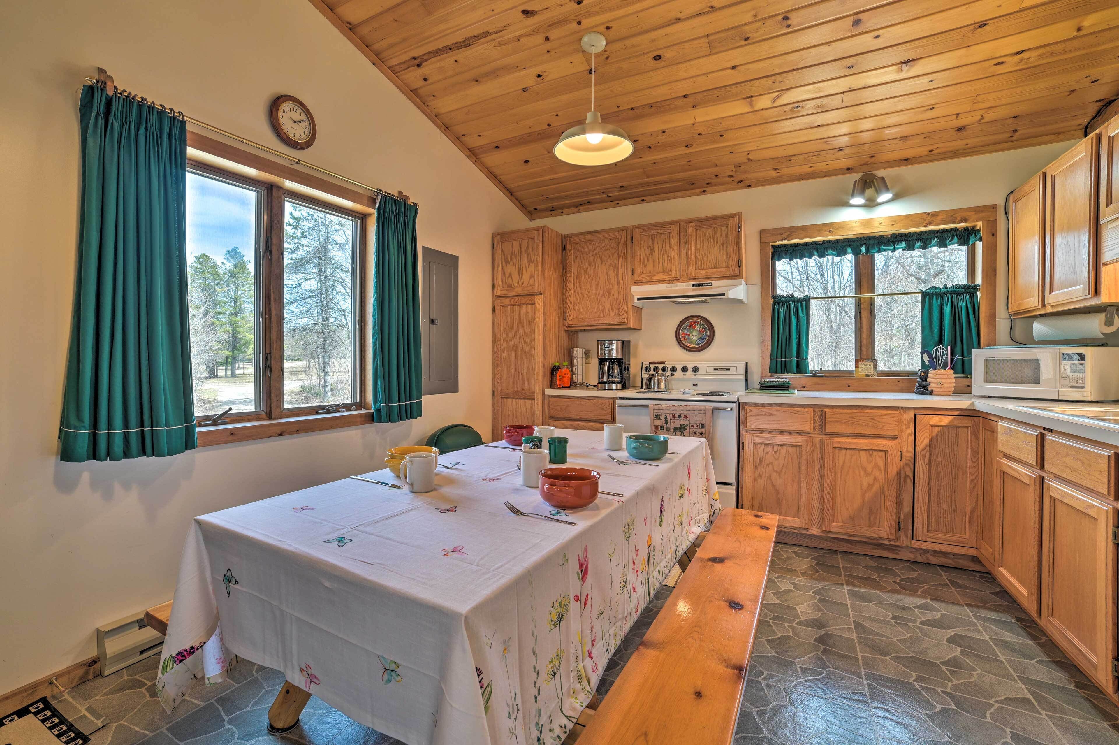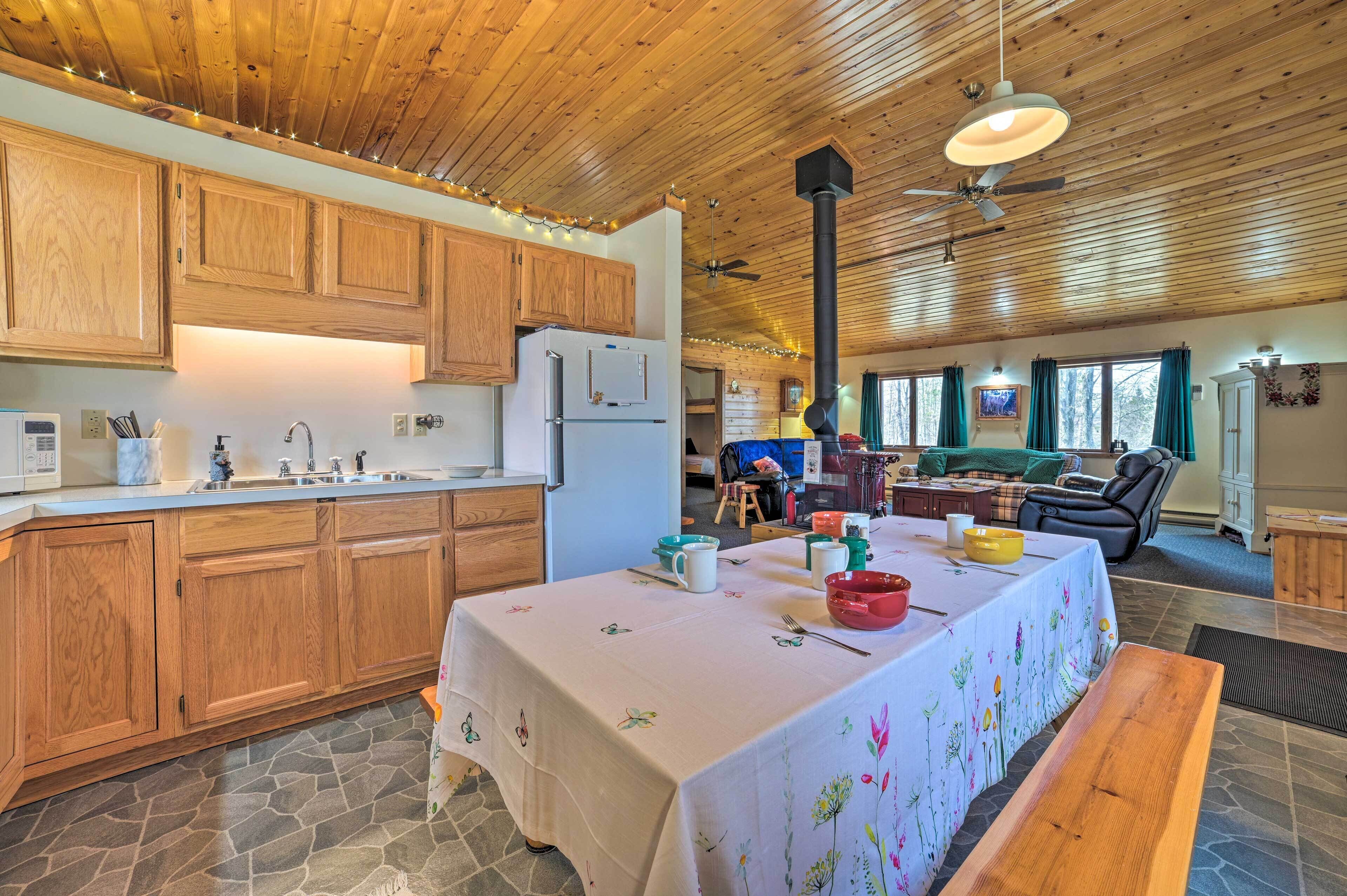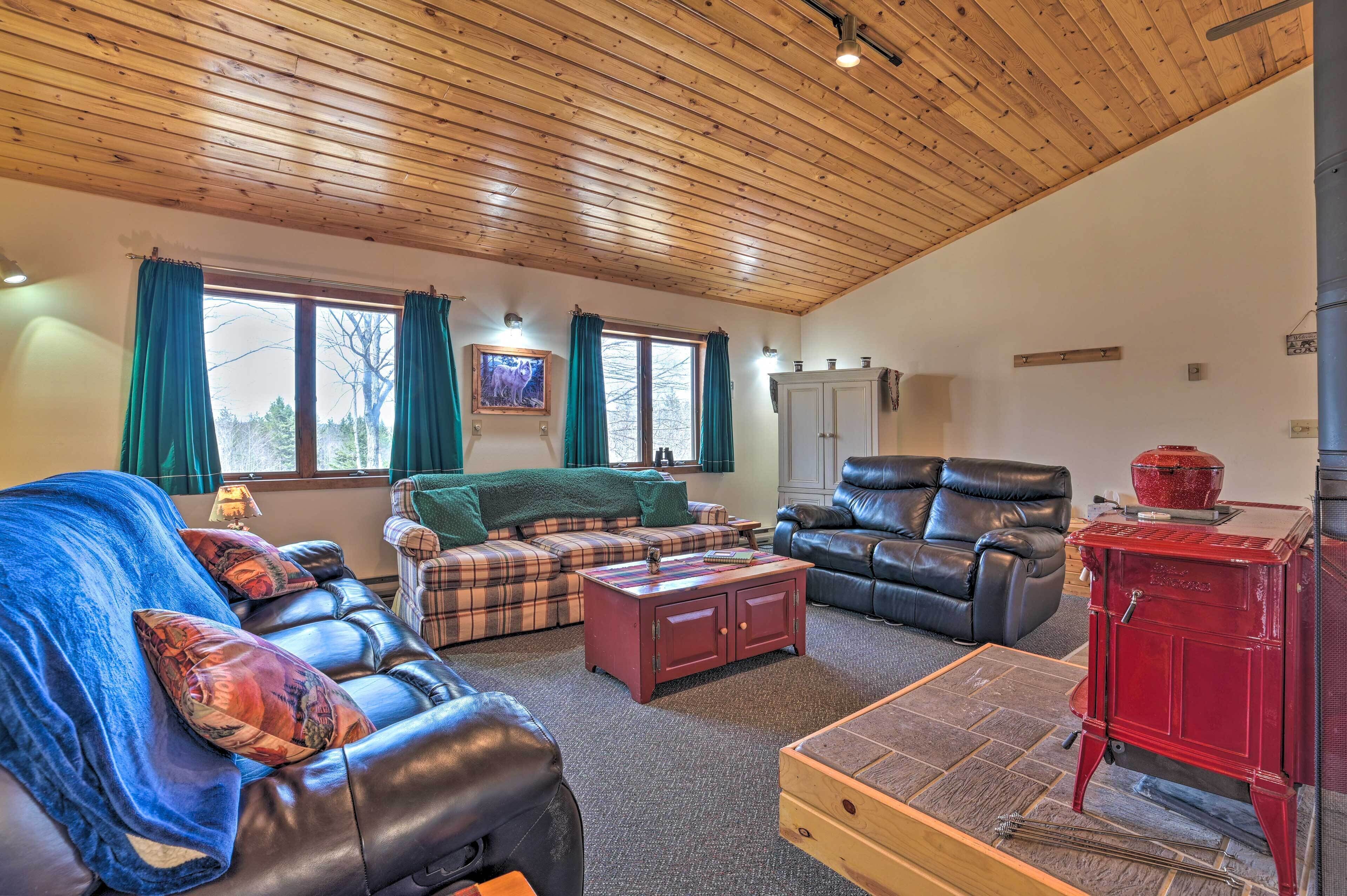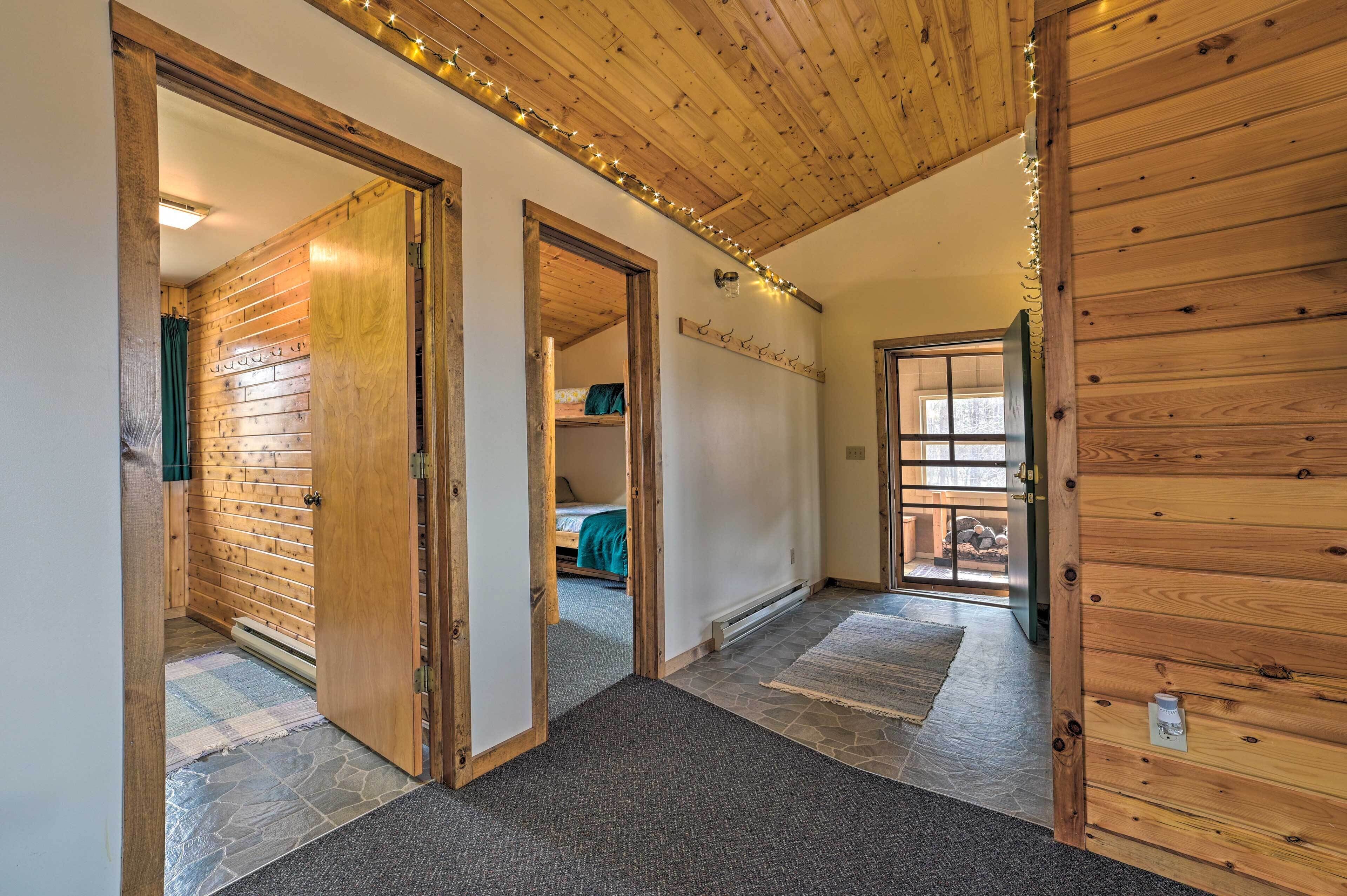 Cabin on 10 Acres Surrounded by National Forest! Enjoy a stay at this secluded Moran vacation rental located on 10 beautifully wooded acres! Open year-round, this 2-bed, 1-bath Trout Lake retreat features a beautiful great room with a cast iron stove, full kitchen, and large screened porch. This woodsy cabin is nestled between State and National forests, great fishing spots, and snowmobile trails...