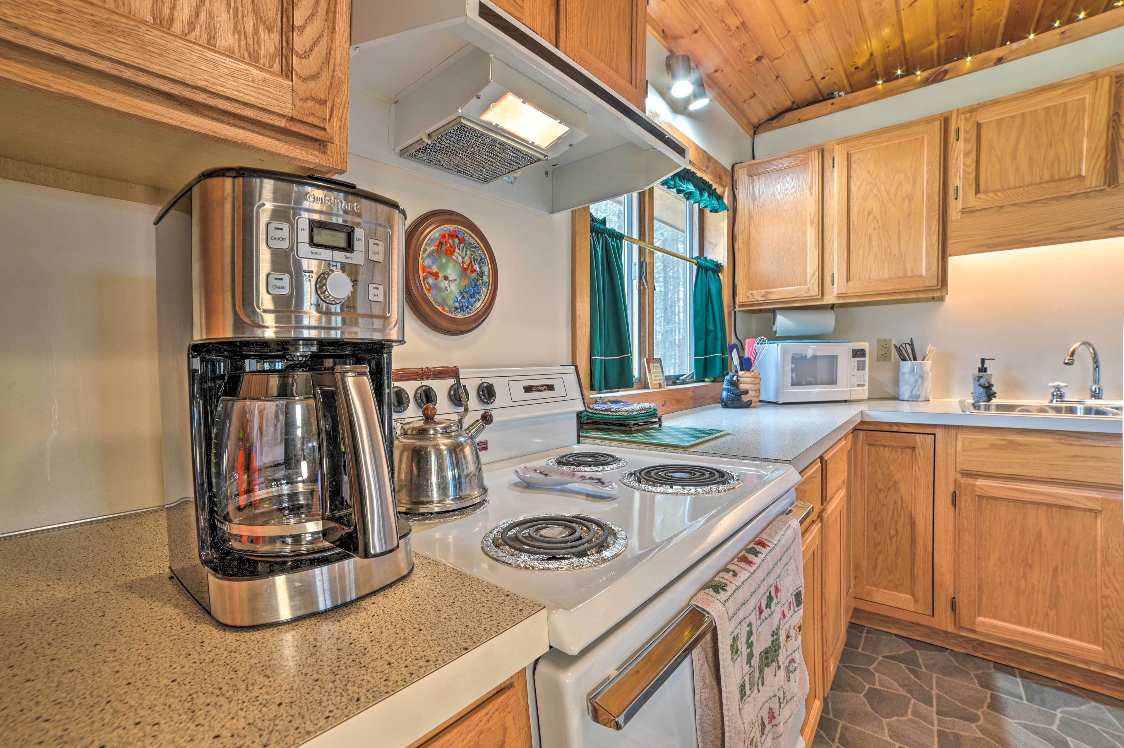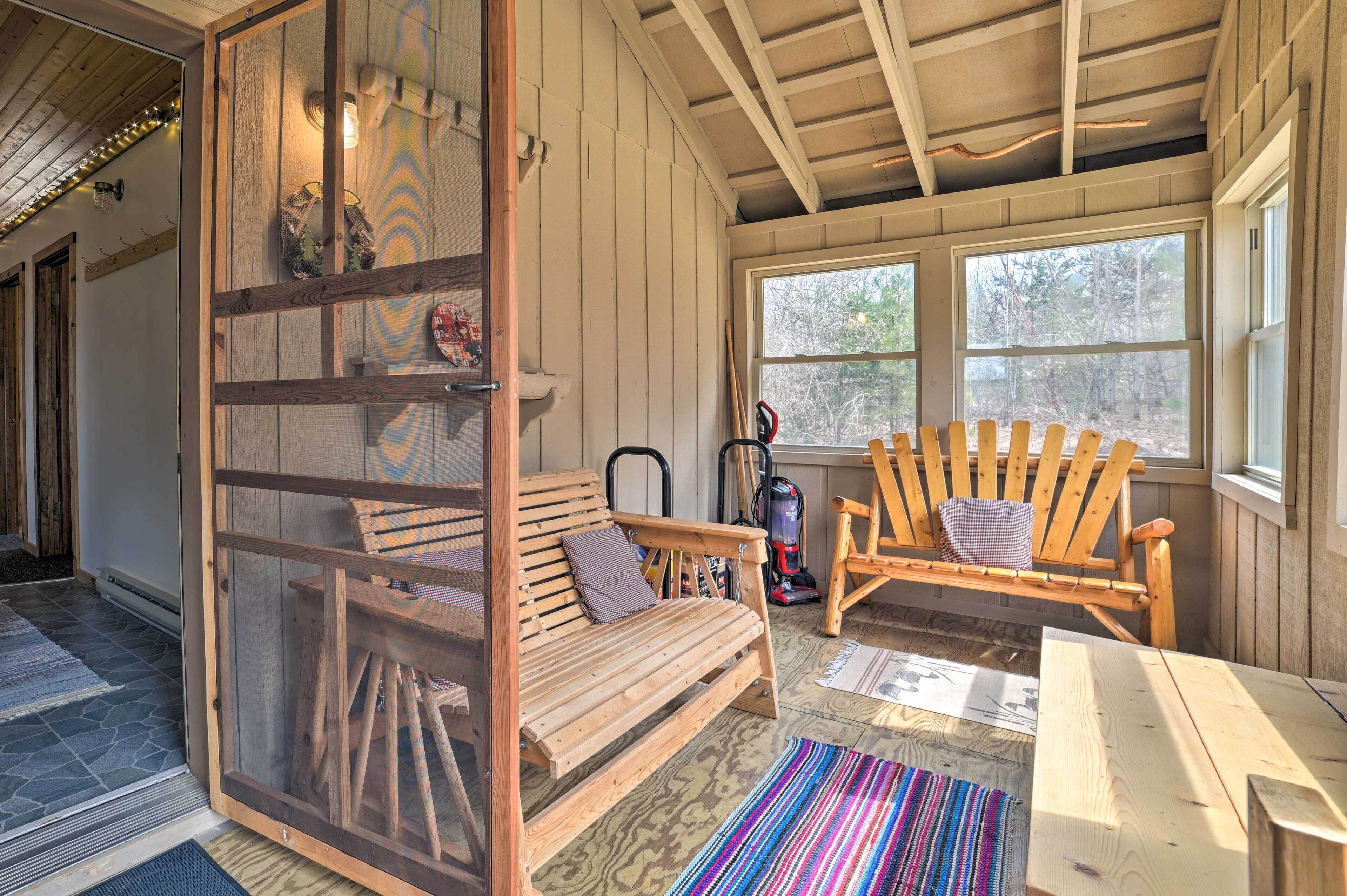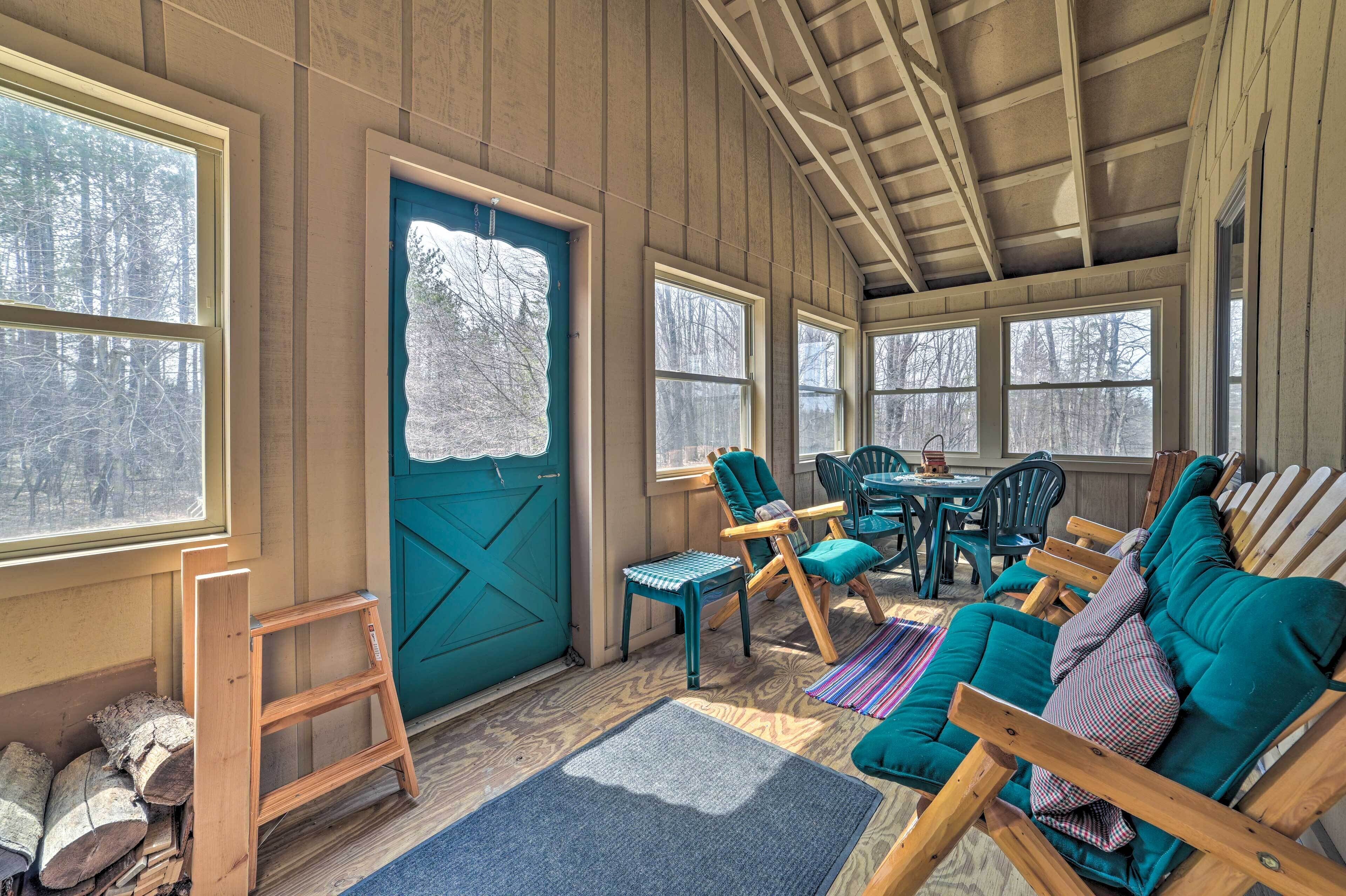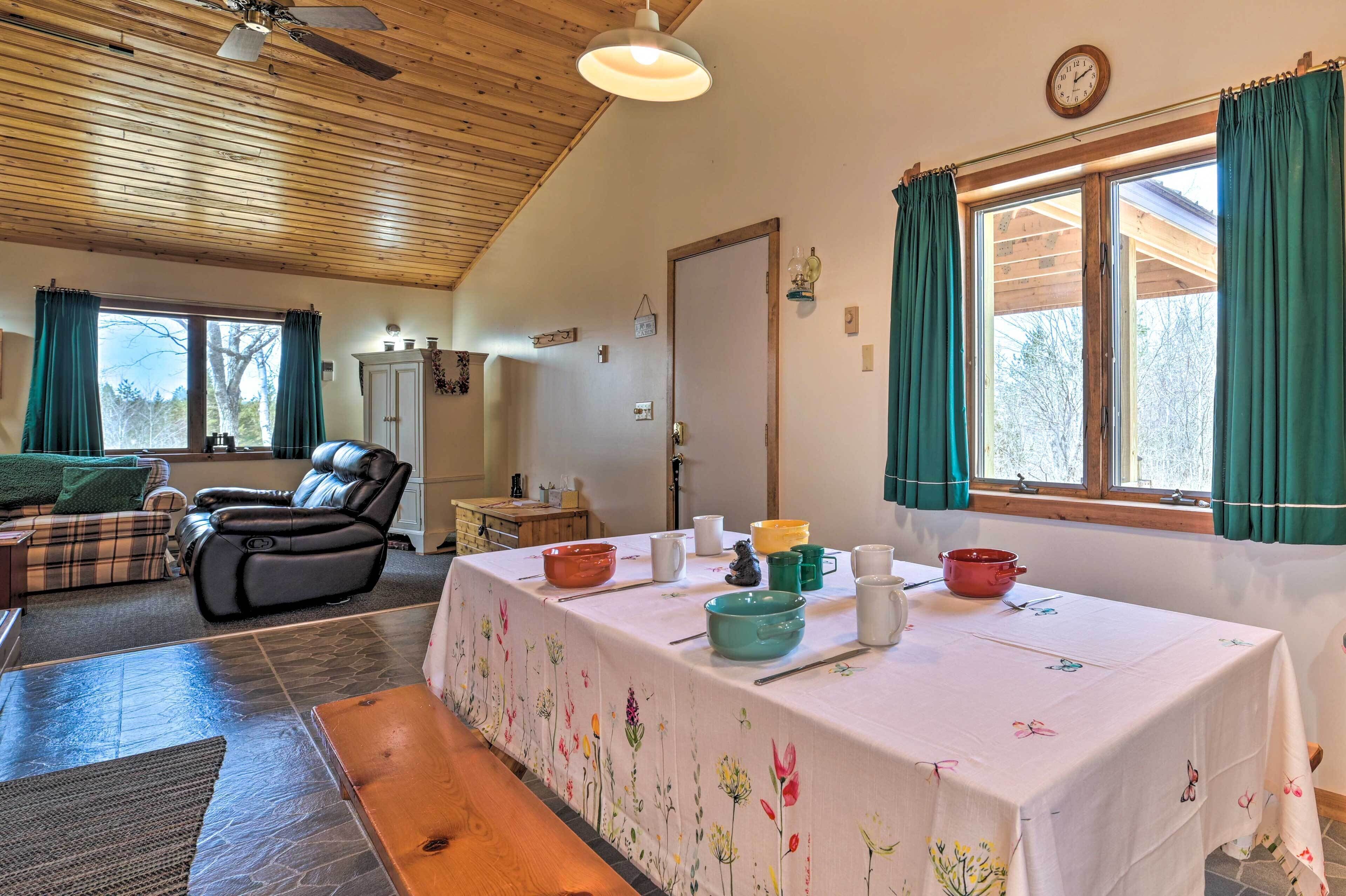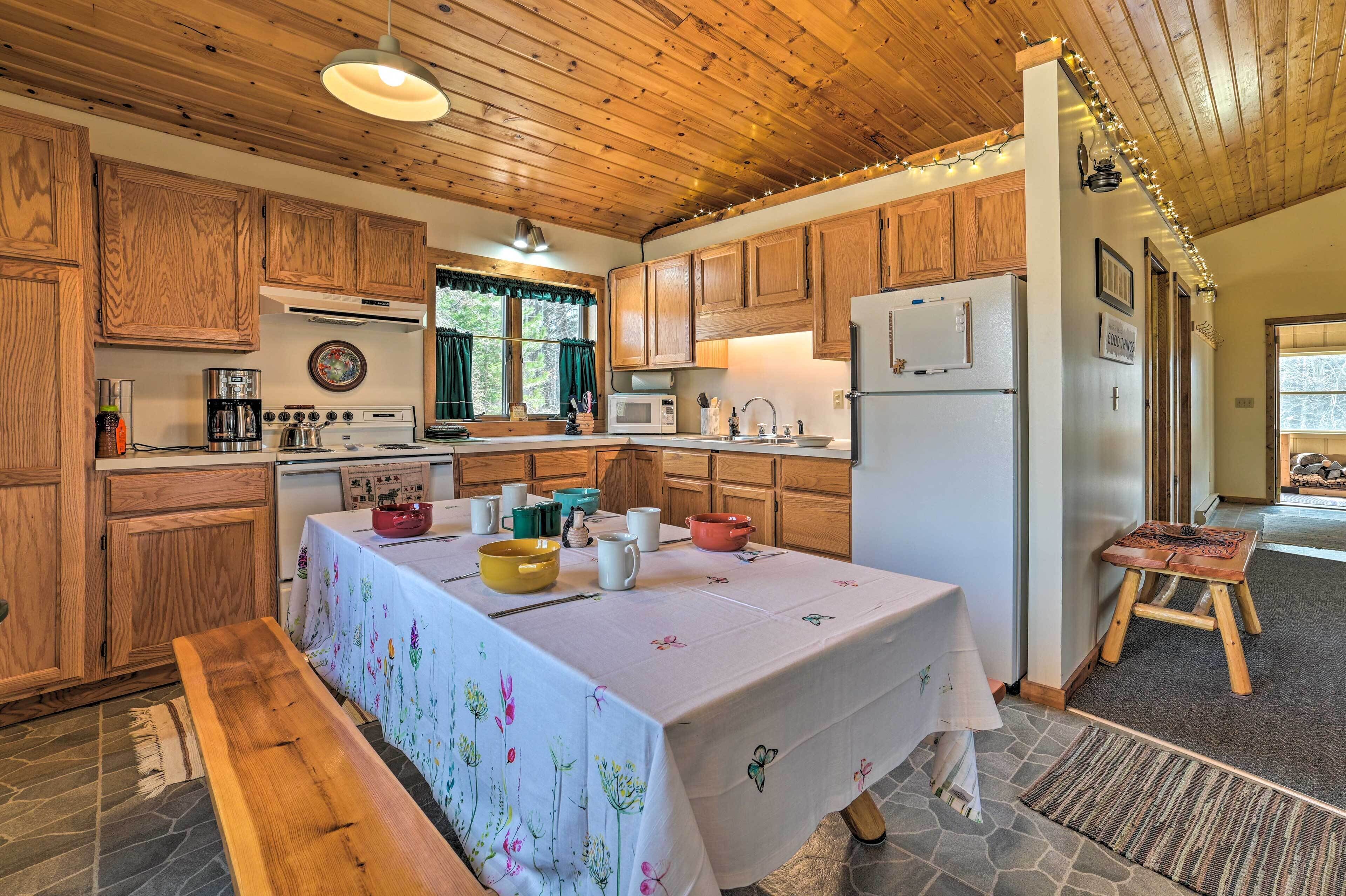 Cabin on 10 Acres Surrounded by National Forest! Enjoy a stay at this secluded Moran vacation rental located on 10 beautifully wooded acres! Open year-round, this 2-bed, 1-bath Trout Lake retreat features a beautiful great room with a cast iron stove, full kitchen, and large screened porch. This woodsy cabin is nestled between State and National forests, great fishing spots, and snowmobile trails...