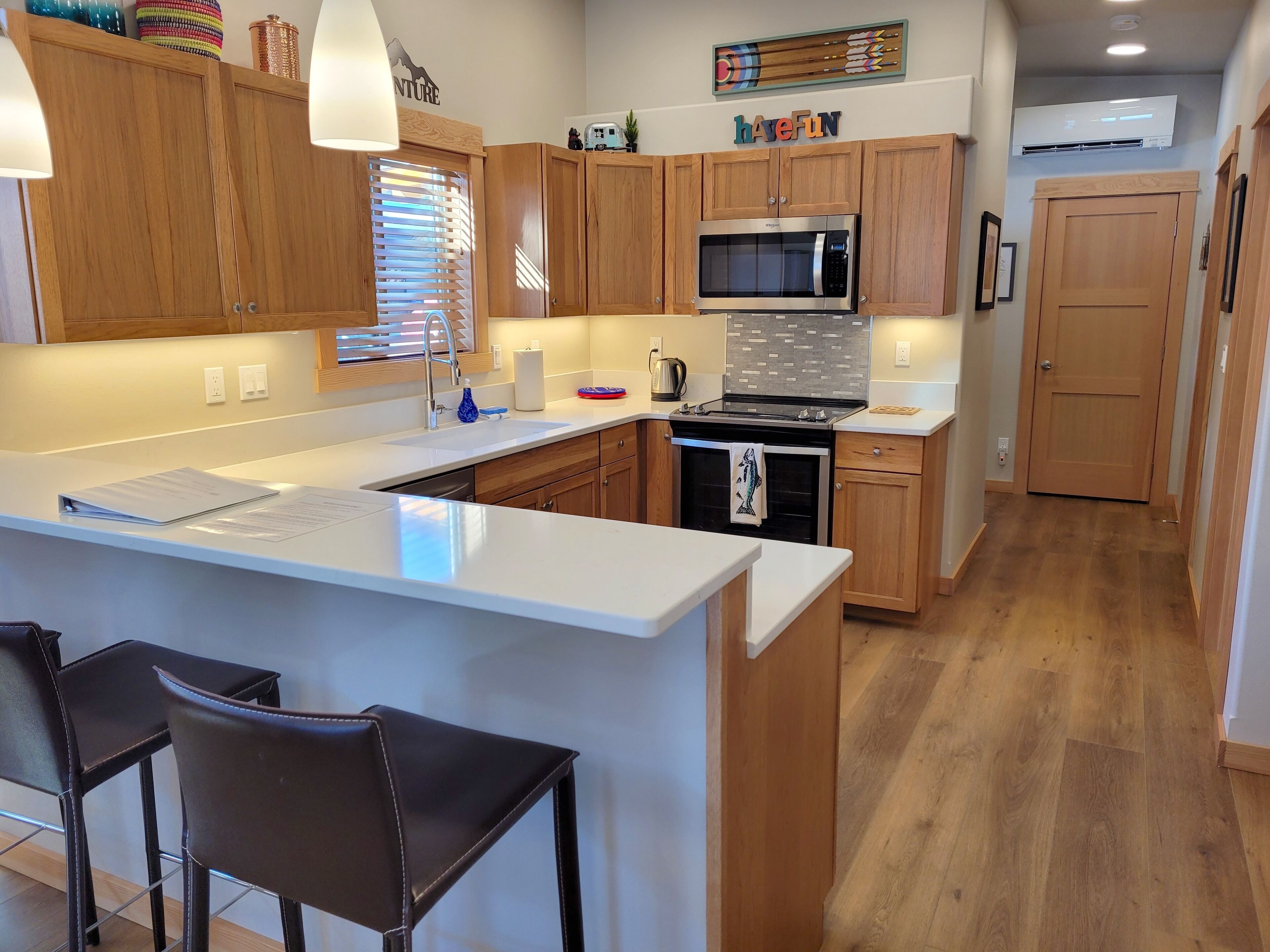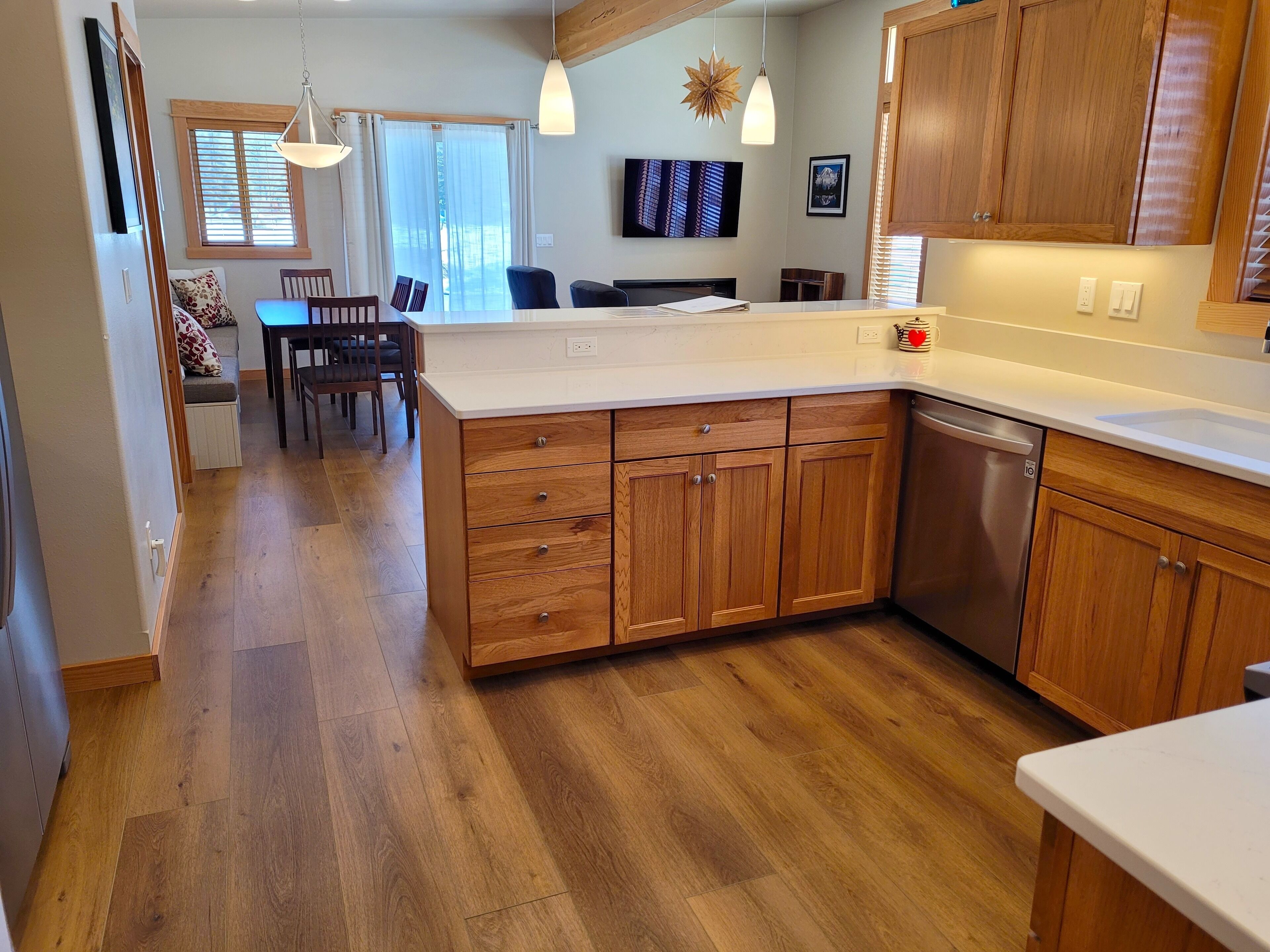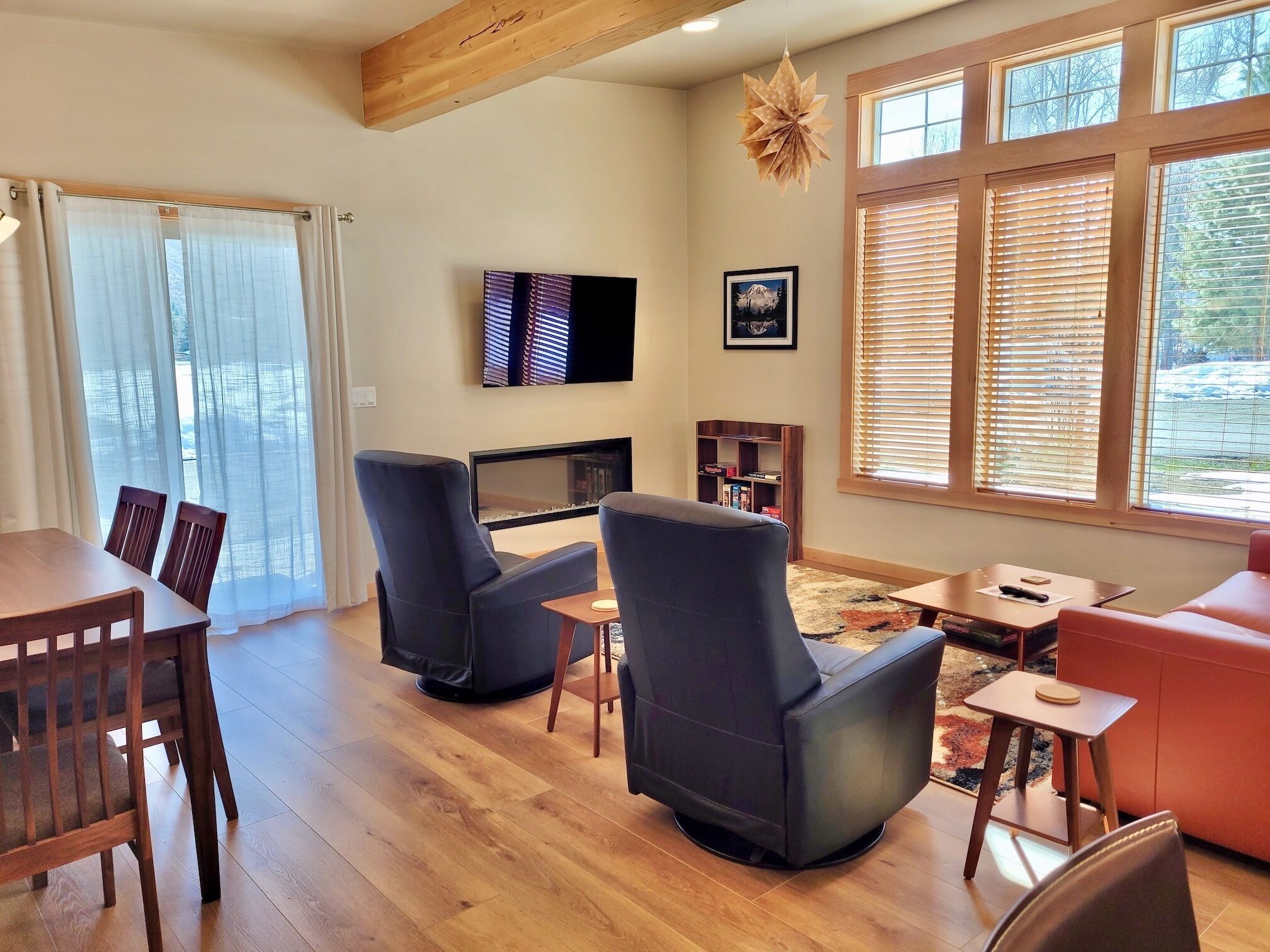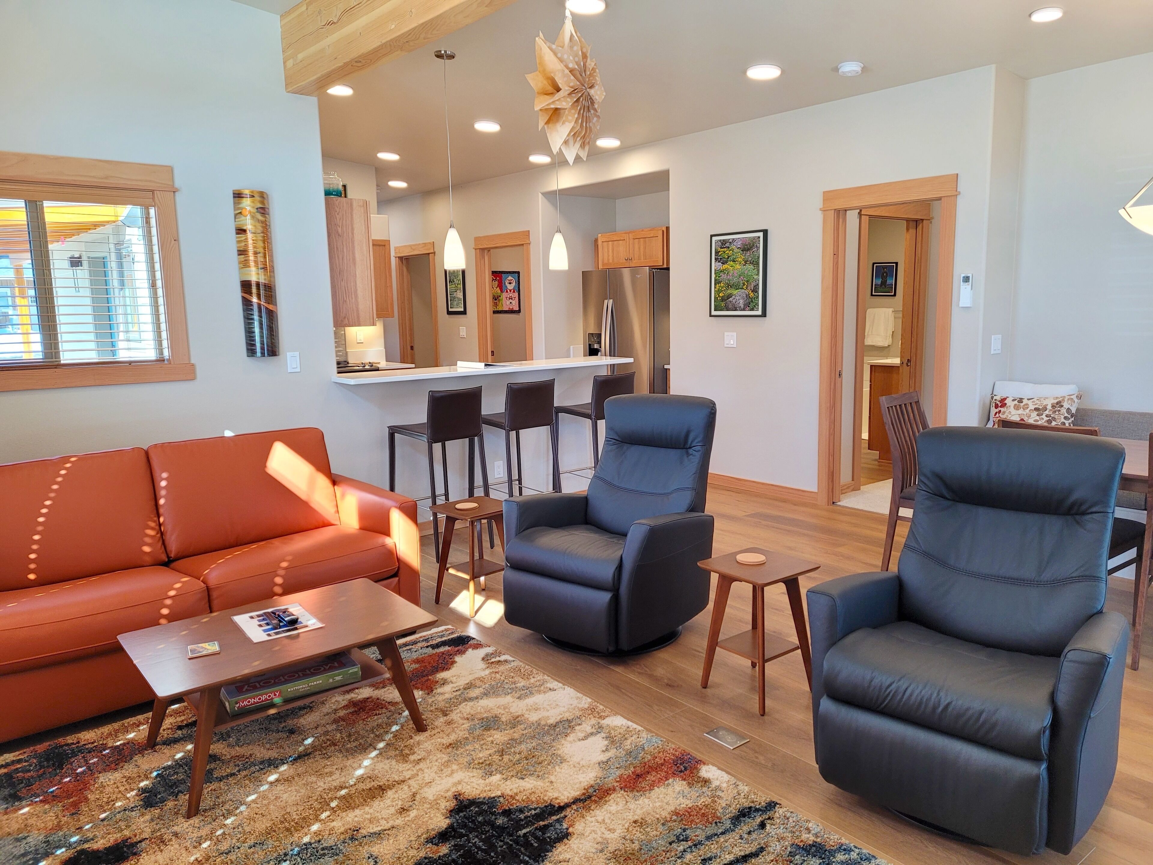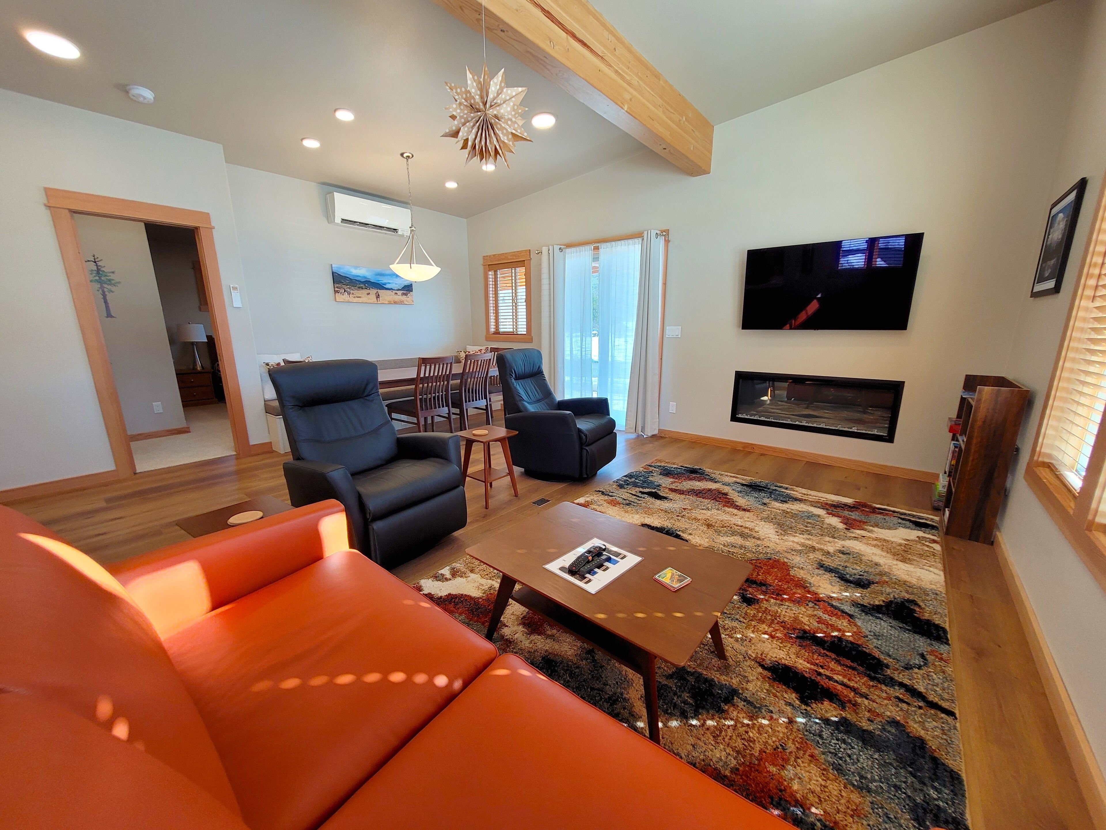 Right next to Ski trail! Adventure Lodge-Walk to Downtown Winthrop&Ice Rink! Adventure Lodge(a legal, licensed nightly rental with a current Okanogan County health permit as required by law) is a bright new home in a peaceful cul-de-sac right on the Winthrop trail, with amazing mountain views. Ski, bike or walk on the trail from your front door. Walk to the Barnyard Theater and enjoy a first run movie and a glass of wine or beverage. A short walk to the Winthrop Ice Rink. An easy 15 minute walk to downtown Winthrop shops and restaurants, and 5 minute walk to the grocery store and dining options makes this a prime location for your getaway!About this rental: -House 1100 sq ft. -2 bedrooms, sleeps 6 (queen sofa bed). -2 bathrooms. -Covered patio. -Carport for one car, uncovered parking for second car.The Space: There is a full kitchen with all new refrigerator/freezer, stove, microwave, dishwasher, toaster, blender, coffee maker, cookie sheets, electric mixer, electric hot water kettle, pots and pans, plates, bowls, utensils, etc . New flat screen TV's in living room and master bedroom with internet TV. SimpliFire electric fireplace in the living room provides ambience and heat. Air conditioned. Large covered patio with gas BBQ and seating for enjoying the views.Bedroom #1 has a Queen bed. Bedroom #2 has a Queen bed. Living room has a Double Sofa Bed. Master Bathroom has a toilet, sink, walk-in shower, and a soaking tub to soothe your body after a day of hiking, skiing or floating the river. Powder room has a toilet and sink. Utility room has a shower stall and a sink. Parking for 2 cars, one in carport and one uncovered. Electric car charging available to renters.Electric car charging is available to renters. The renter will need to bring their own charger and plug into one of the rental outlets in the carport.(NEMA 14-50 outlet with 240v , 40 amp)This outlet provides high-power service. There are two outlet types in the carport.EXTREMELY IMPORTANT YEAR ROUND TRAVEL INFORMATION--READ BEFORE BOOKING A RESERVATION:1)It is the responsibility of the guest to have travel plans in place to travel either over the North Cascades via Highway 20 OR to travel over Steven's Pass through Leavenworth OR to travel I-90 over Snoqualmie to Blewett Pass through Wenatchee and then up the Columbia river to the Methow Valley. If one route is closed, it is the YOUR responsibility to make alternate plans for travel. NO REFUNDS will be given at any time of the year simply because an alternate route must be taken and add additional travel time. Highway 20 is closed in the winter and mountain passes can be closed anytime of the year because of wildfires, rockslides or other occurrences. Directions over all the routes will be sent to. you 3 days before your arrival. Make sure to check pass reports(and they can change while you are en route) and print out the directions before you leave. 2)Trail Access/Closure Information: If you are coming to hike, bike, or ski on a trail or system of trails which happen to be closed before or during your stay, NO REFUNDS WILL BE GIVEN because of this. Trail closures can occur anytime because of fire, rockslides, mud flows...and we have no control over this. There are many hiking, biking trails of various kinds in the Methow Valley. If access to the North Cascades is closed via Hwy 20 because of any reason, NO REFUNDS WILL BE GIVEN because of this. There beautiful hikes in and around our valley that we would be happy to recommend.INTERNET POLICY. PLEASE NOTE: **We strive to provide the best internet service we can get here in the very rural Methow Valley. Internet speeds vary throughout the valley and outages or tech issues can occur that we have no control over, and for these reasons NO REFUNDS are given if the internet is problematic. Should you have an issue with internet service, please send us a message through VRBO describing the problem. We will then contact you to troubleshoot. If the issue is not resolved, we will then contact the internet provider, and/or homeowner. Public internet is available at the Winthrop library with enhanced internet speed (parking lot or inside the library). Alternatively, for a fee you can go to the Dropzone in downtown Winthrop. Thank you for your understanding!IMPORTANT WINTER INFORMATION: **If you travel to the Methow during the winter months it is important to be prepared for winter driving (keep chains, shovel, etc. in the car). The weather can be extreme with large snowfalls, unexpected technical issues, frozen pipes, impassable roads/driveways). There are a limited number of plow companies and Methow Reservations nor the owners of the house control the plow company schedule.