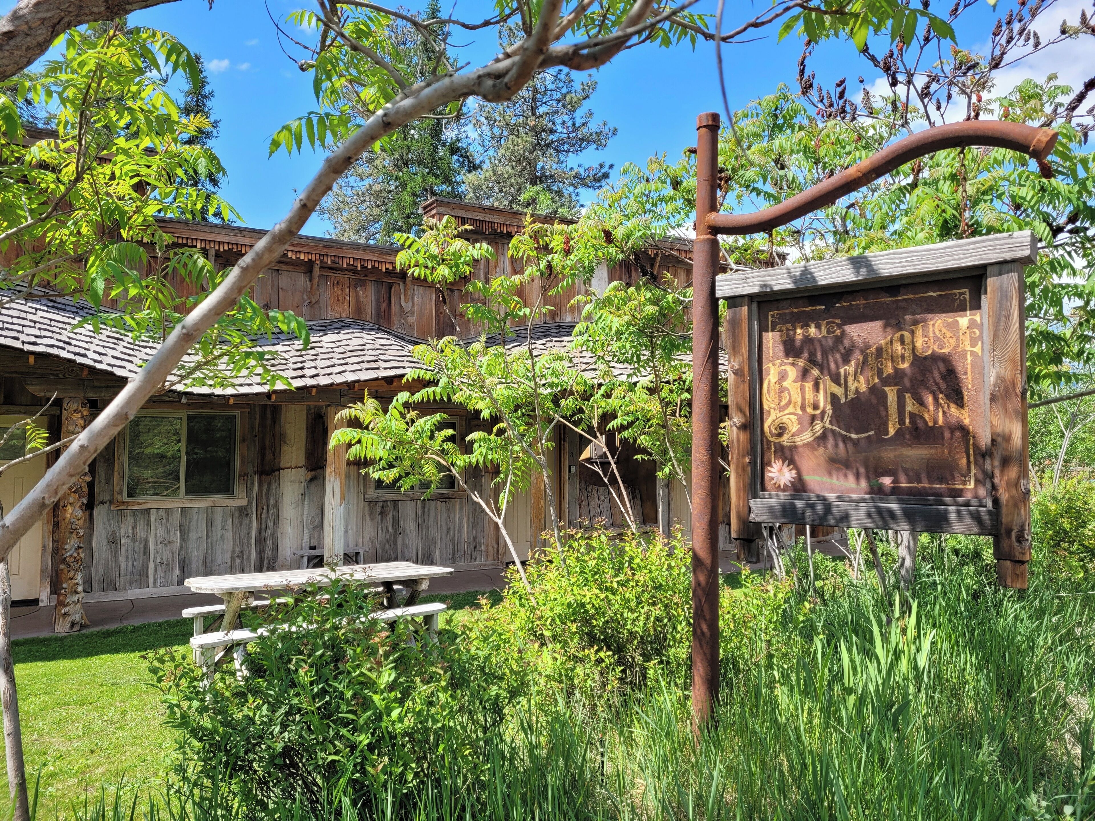 Bunkhouse Inn Rm 1-Dog Friendly, Walk to Downtown Winthrop The bunk house inn is a whimsical motel in Winthrop. Everything is handmade-the bed frames, benches, the stucco walls and showers, concrete counter tops, and apple-wood handles. Room 1 is ADA compliant, and it is also pet friendly. This is a smaller room compared to the others. Queen bed, microwave, mini-fridge, coffee maker, T.V(local rec...