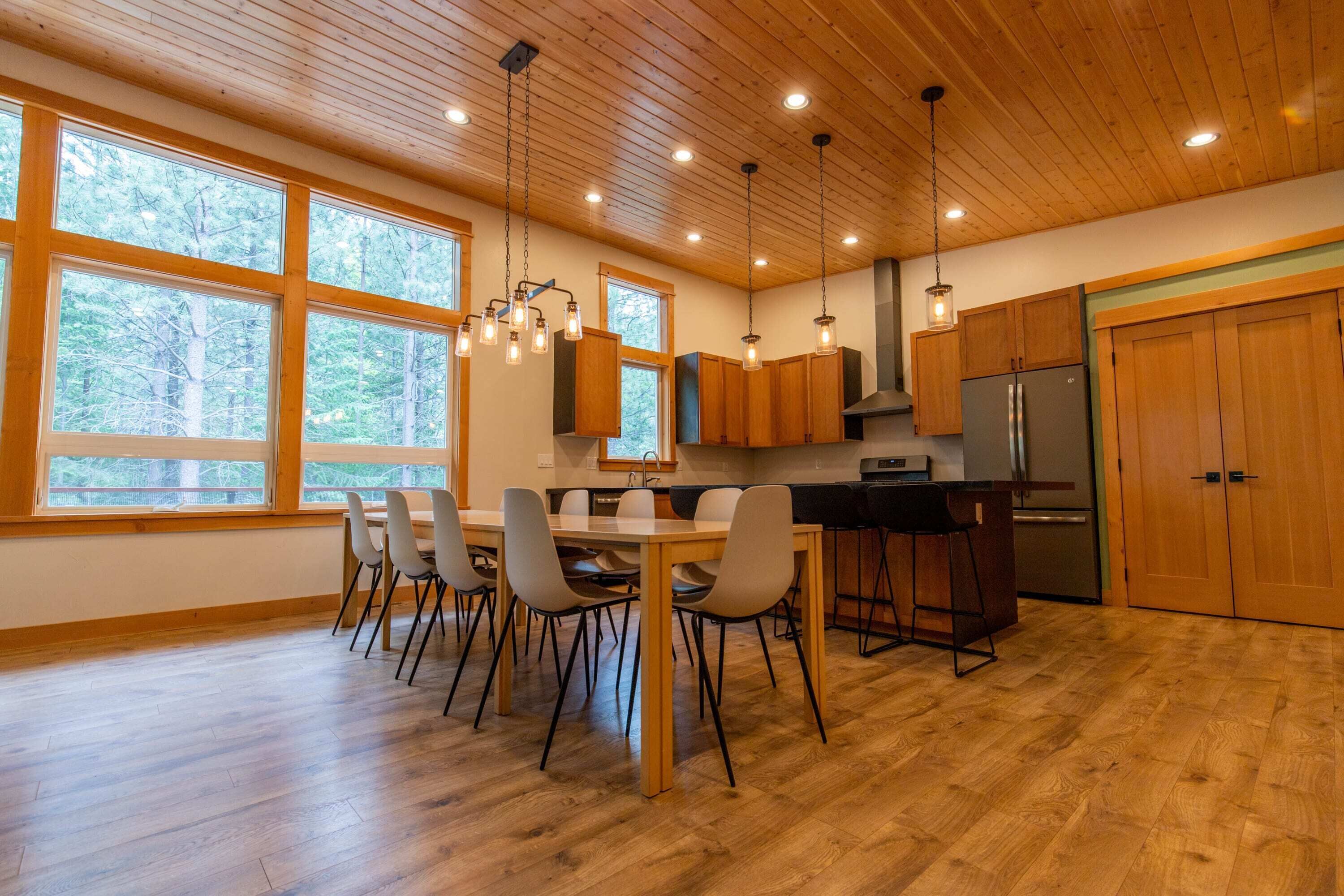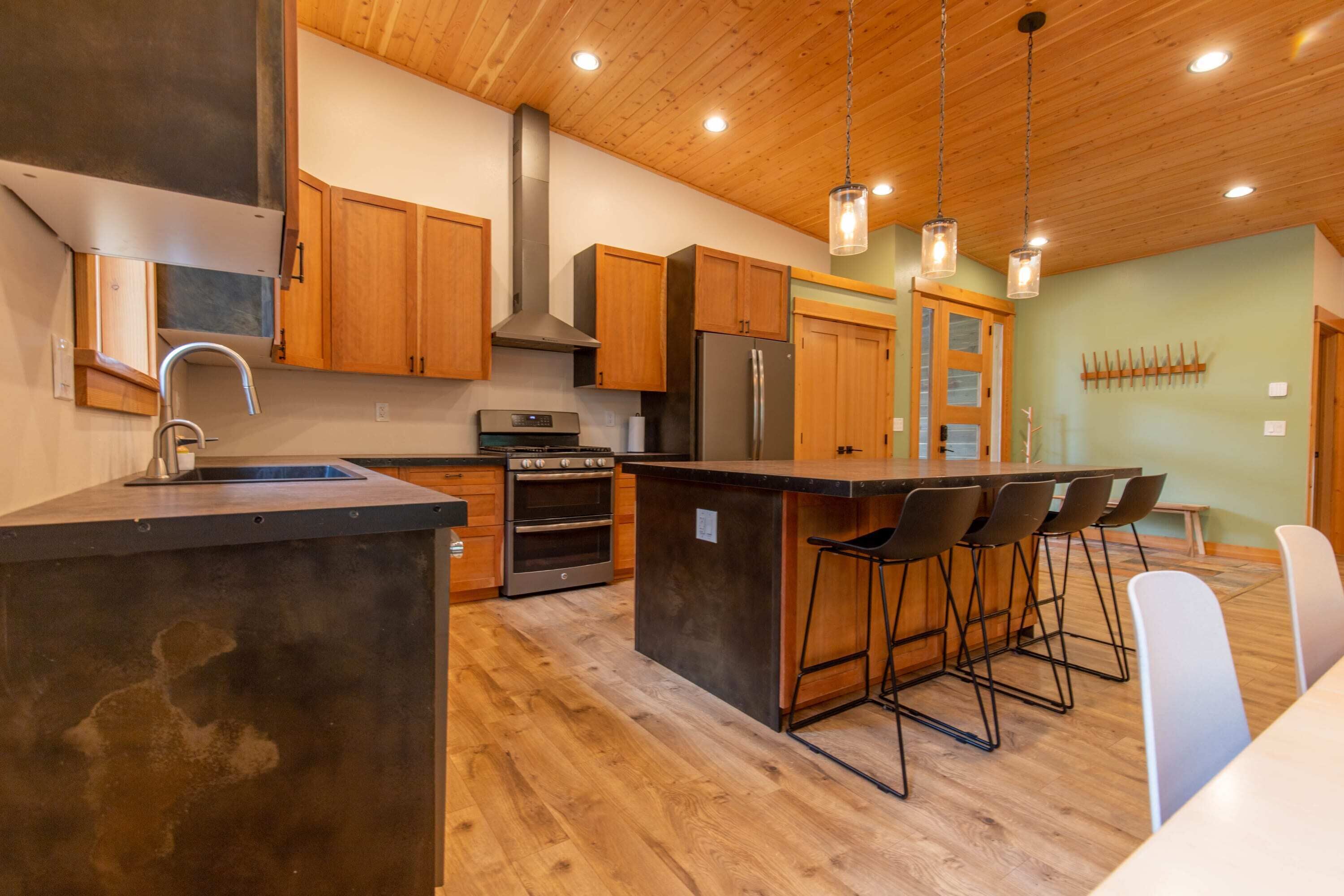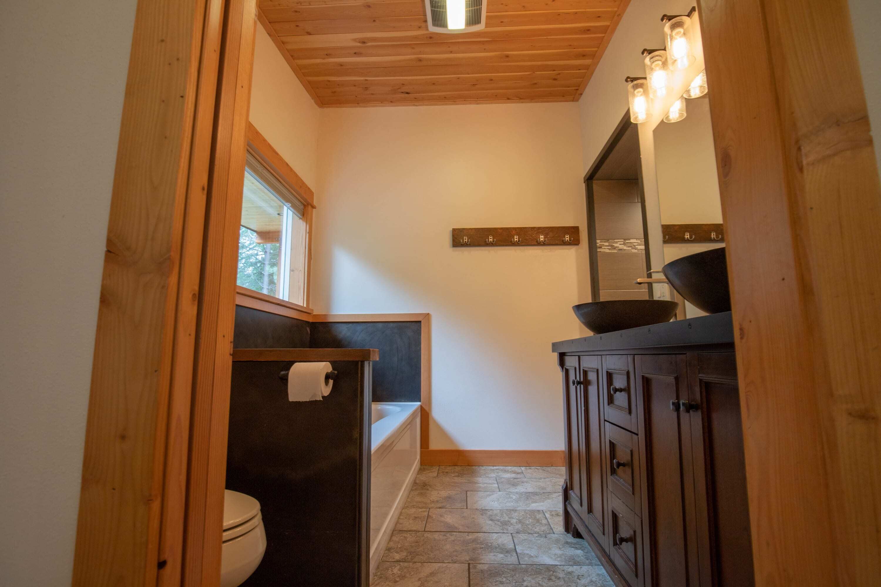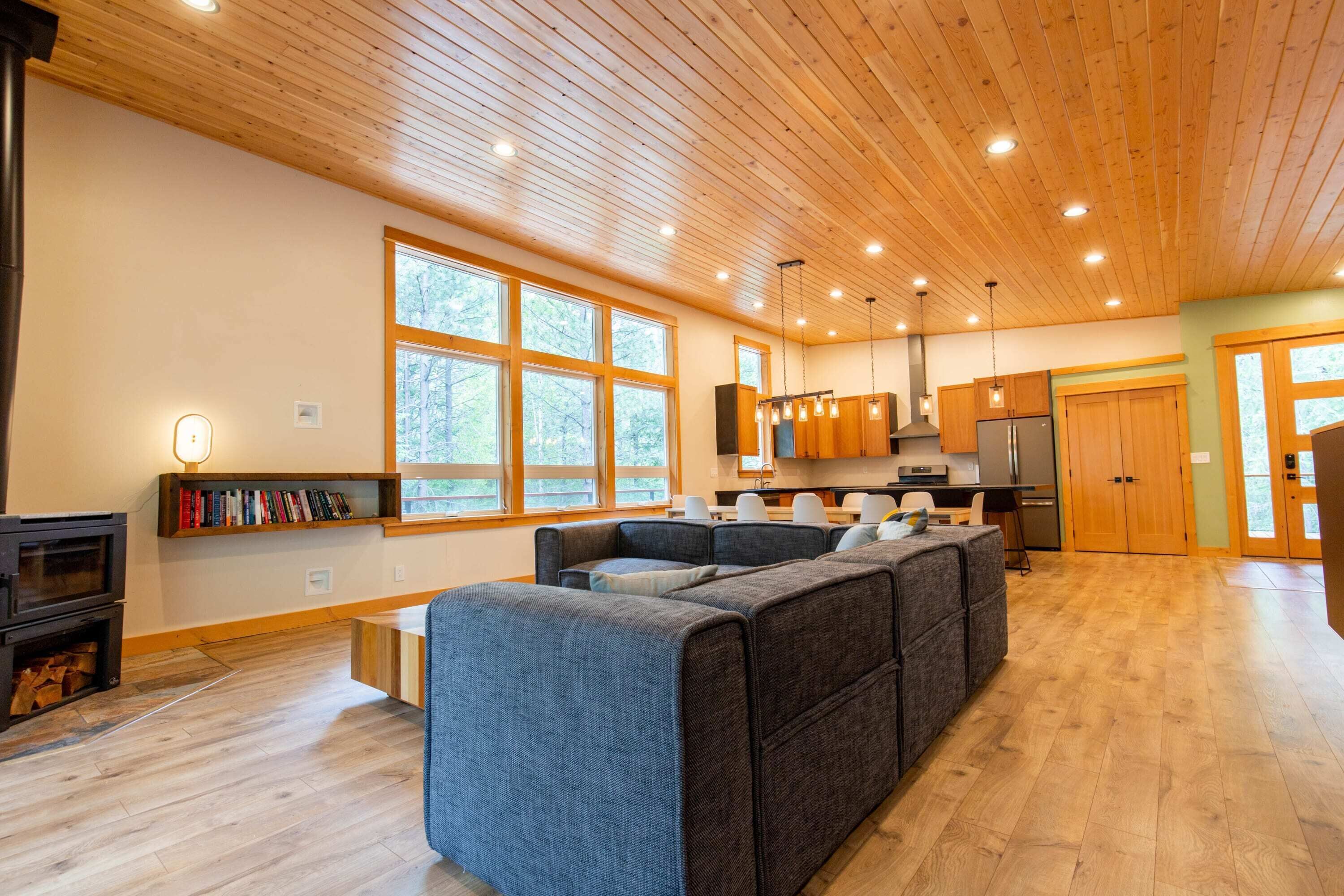 Treehouse - modern cabin near Mazama Summary:The Mazama Treehouse is a modern home located within walking distance to the Methow Valley Community Trail. The acres of natural common area lead you to the community river access. Enjoy the convenient location as a launching point for your hiking, biking and skiing adventures and return to your spacious home nestled within towering Douglas fir and Ponderosa pine.The Space:The Treehouse comfortably sleeps eight guests, however there is room for up to ten. The layout and amenities make it a wonderful retreat for families! The master bedroom/bath are located on the 2nd floor, as is the bunkroom, which has two twin bunk beds. There is an additional bedroom, with queen bed, located on the ground floor. The spacious upstairs living area includes a well-stocked kitchen and living space. The additional flex space on the ground floor features a pullout couch and desk. The house is equipped with Starlink, providing high-speed broadband internet access. There is a whole house water filtration system, including UV filtration and softener, ensuring the purest drinking water.Please note:* There is no television at the house* Pets visitors are unfortunately not allowed, however the owners do have a dog that joins them on their stays. If you are highly allergic to pet hair please do not book this cabin.Other Things to Note:EXTRA GUESTS AND MAXIMUM OCCUPANCYEIGHT guests are included in the nightly rental rate, additional guests are charged at $20 per person per night. Maximum occupancy is 10.PRICINGPlease note that the nightly rental rate varies with seasons and weekdays, please enter your proposed dates for an accurate quote (some listings may show an 'average price per night' when in fact this is our minimum rate, we are working to rectify this). Weekly discount of 5% and monthly discount of 15% is automatically applied and calculated in any quotes for this duration.The Inn Pool - guests of our cabin may use The Inn at Mazama outdoor pool (open from Memorial Day to Labor Day) and tennis/pickleball court located at 15 Country Road in Mazama. The cost to use the pool is $10/guest/day and you should check in at the front desk before heading to the pool. The Inn also has a co-working space and private offices available to rent by the day in case you need space to work during your stay.