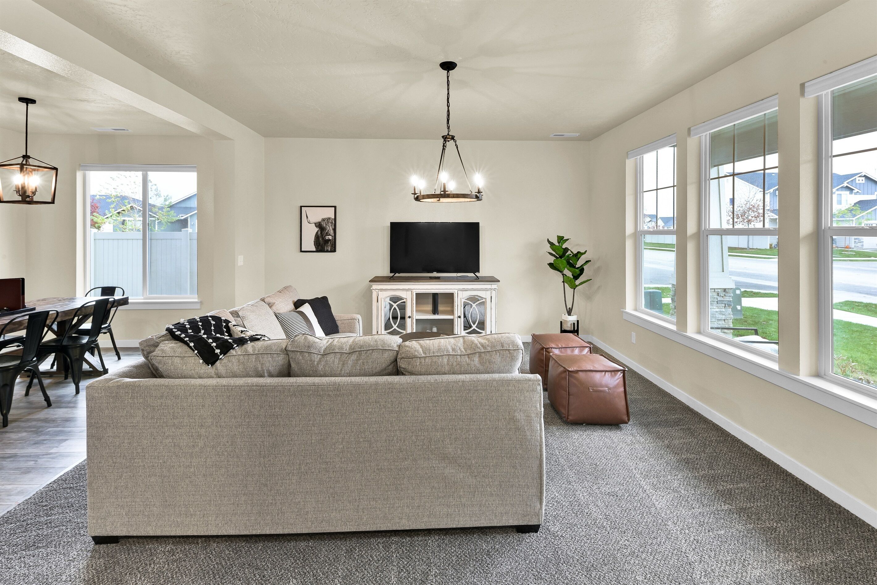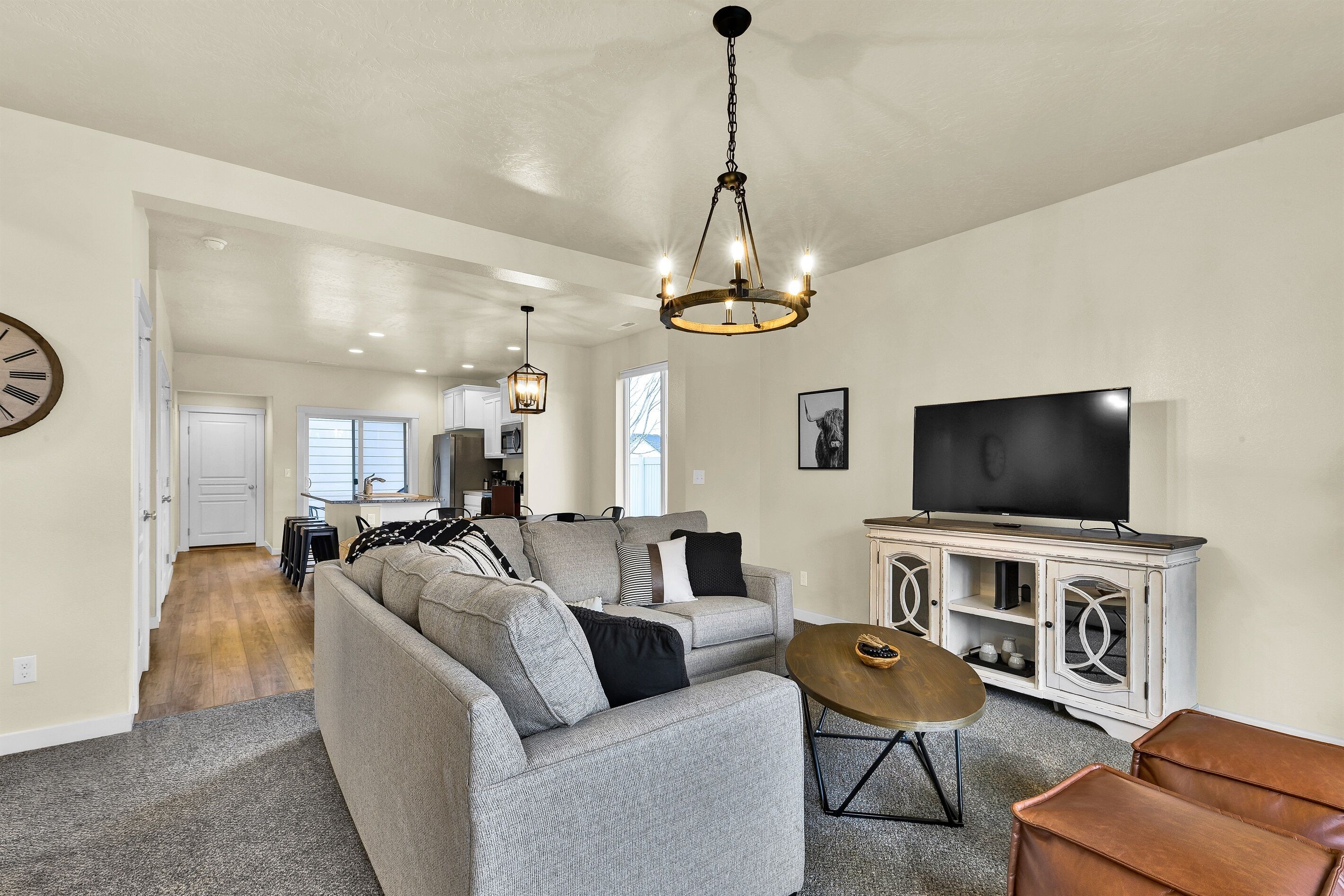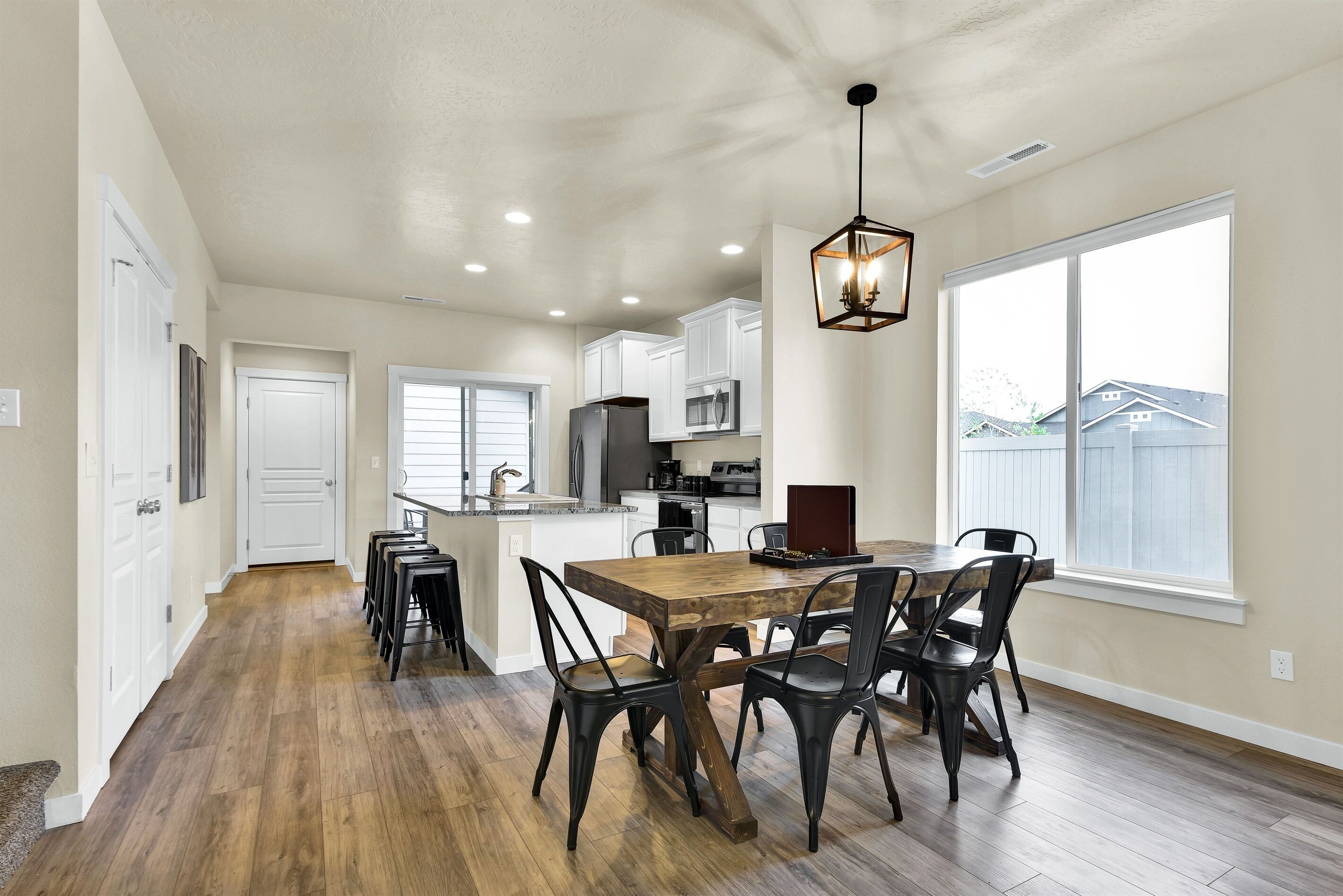 Highland Haven w/ seasonal community pool! • 1700 sq ft Single Family Home• Sleeps 8• Pet Friendly• Community Park and Seasonal Pool• Propane Firepit• Yard Games• In House Washer and Dryer• Fully stocked Kitchen• Professionally Cleaned and Sanitized• Self Check-inHighland Haven is the ultimate modern farmhouse lovingly named after the cute Highland cow art featured in the cozy living room. Just off the main living are is an office nook perfect for remote work and school, or a fun coloring space for kids. The neighborhood has a community park and pool (open seasonally typically Memorial Day to Labor Day, weather dependent) perfect for cooling off in the summer, but as the weather cools down warm up on the patio with the propane firepit while you play some yard games - Jumbo Jenga or Cornhole with our custom Idaho boards! This 3 bedroom, 2.5 bathroom home sleeps 8 making it perfect for families or groups of friends. Just down the street from the neighborhood entrance is the expansive Settler's park featuring baseball fields, horseshoe and pickle ball courts, a large playground with swings and splash pad, and a seasonal disc golf course ( typically open November-February). A few miles away is Meridian's outdoor mall, The Village, or Roaring Springs Water Park and Wahooz Family Fun Zone. If you want to branch out of Meridian enjoy quick freeway access for exploring more of what the Treasure Valley has to offer! Please Note: Guests are expected to read and be willing to honor House Rules. No gatherings/parties allowed, only booked guests can be there at any time (unless discussed/approved and any additional fees paid in advance). Additional security deposit may be required depending on pets and/or length of stay. Booking implies agreement to pay any fees/deposits and honor House Rules. Unsigned rental agreement means no entry. Pets must be discussed/approved and paid in advance. This is a pet friendly home up to 2 pets. To maintain the condition of the home the pet fee will be $60 for 1 pet and $120 for 2 pets. Failure to disclose a pet at this property before check-in could result in a $500 fine, immediate eviction with no refund and additional expenses may be charged. Top bunk weight limit is 200lbs.