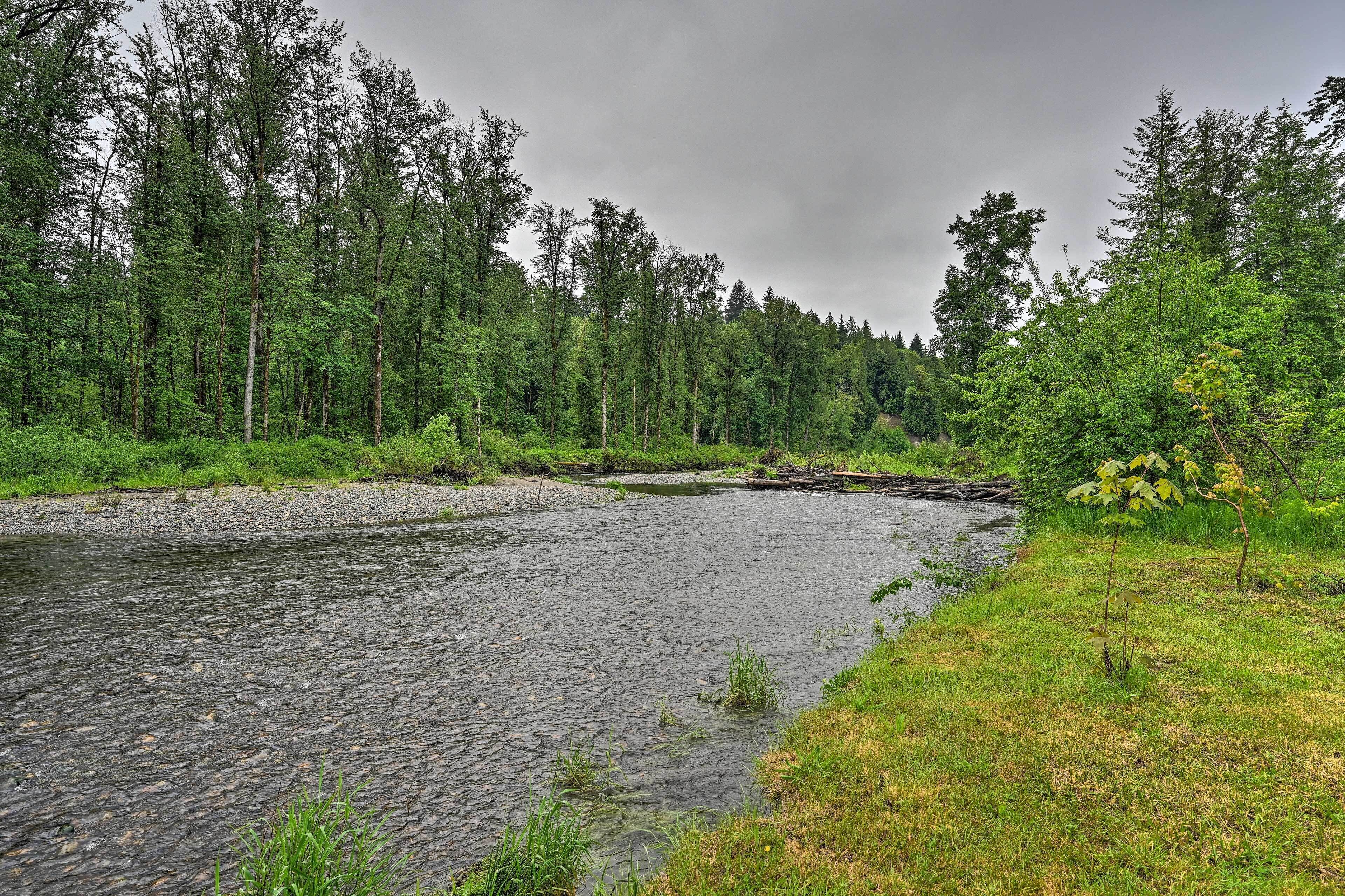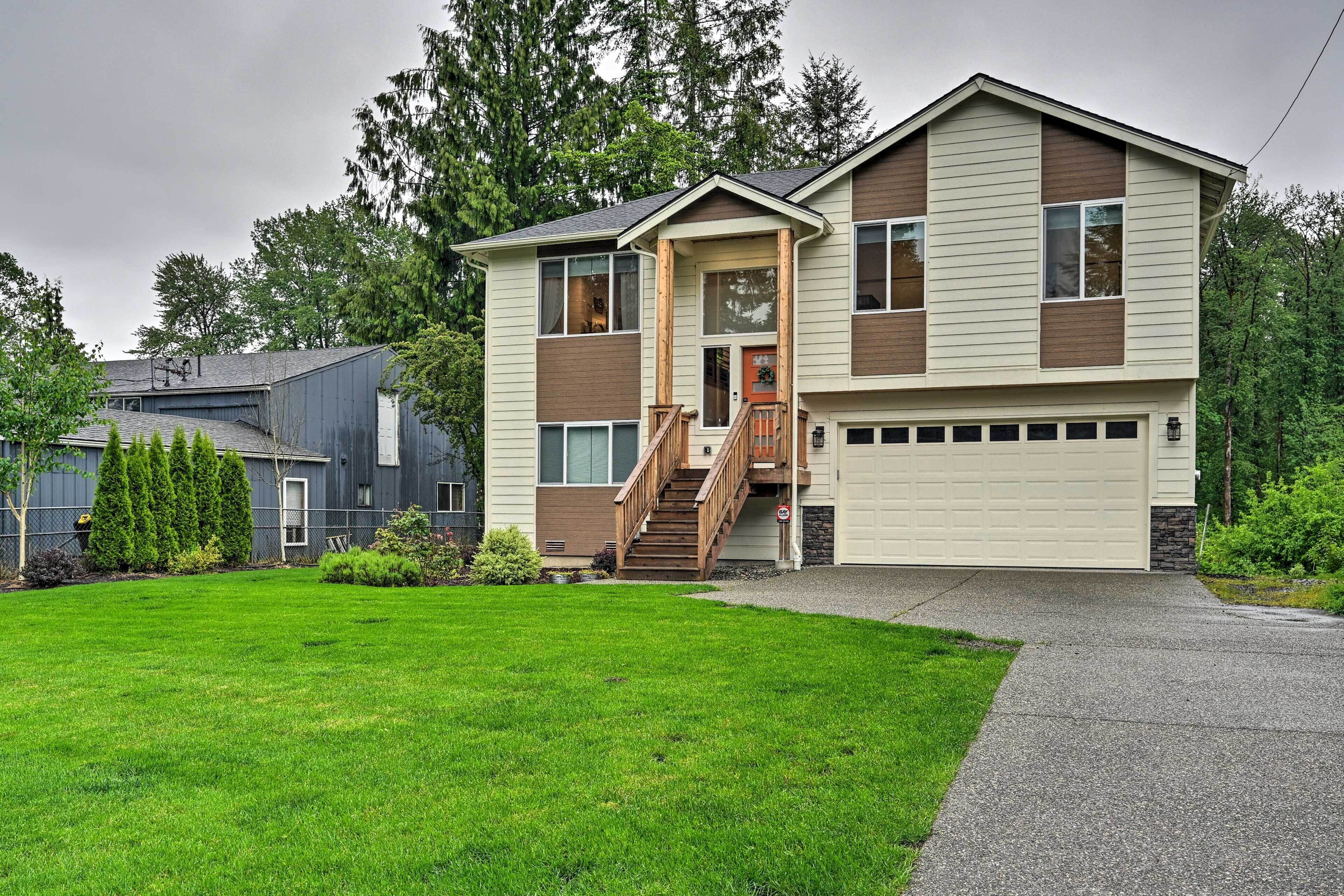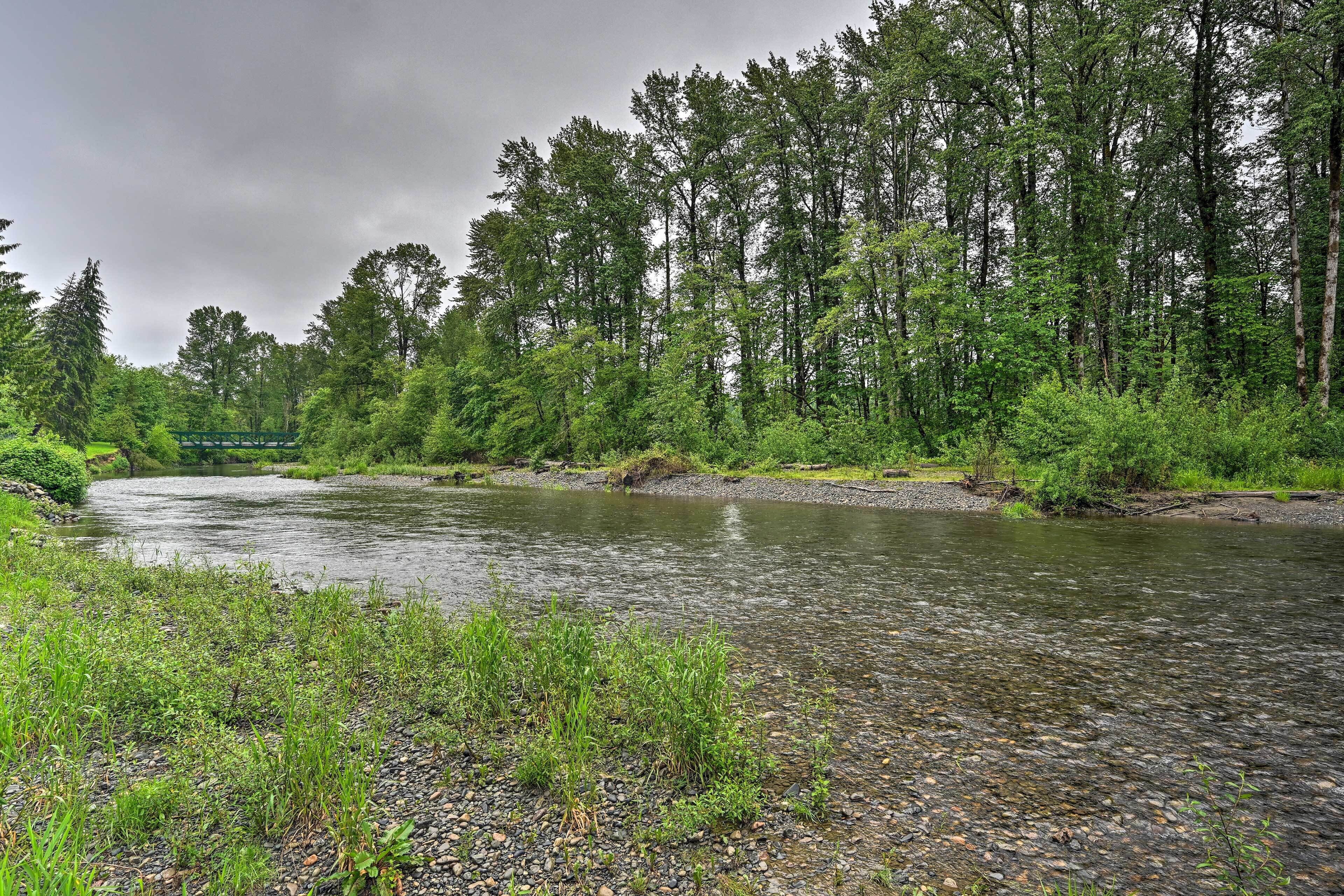 Lake Stevens Getaway: 2 Decks w/ River Views Between the Cascade Mountains and the Pilchuck River, this charming vacation rental home has picturesque views all around. Take in the sights on either of the furnished patios with a glass of wine or dinner cooked in the well-equipped kitchen. Bring the beach chairs and towels to Lake Stevens, just 4 miles away. After you’ve admired the natural views, d...