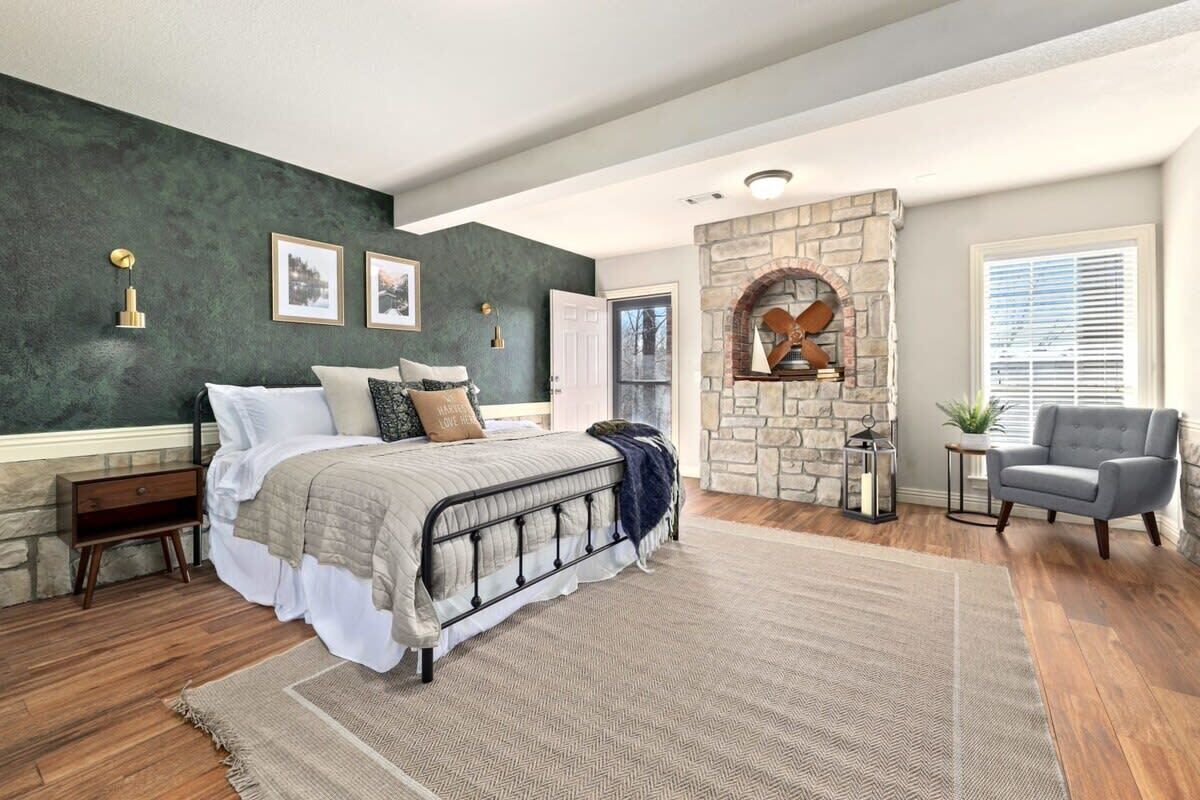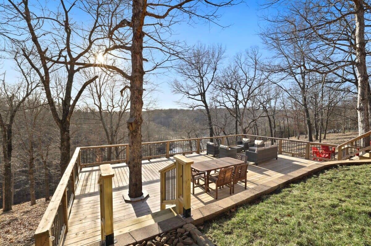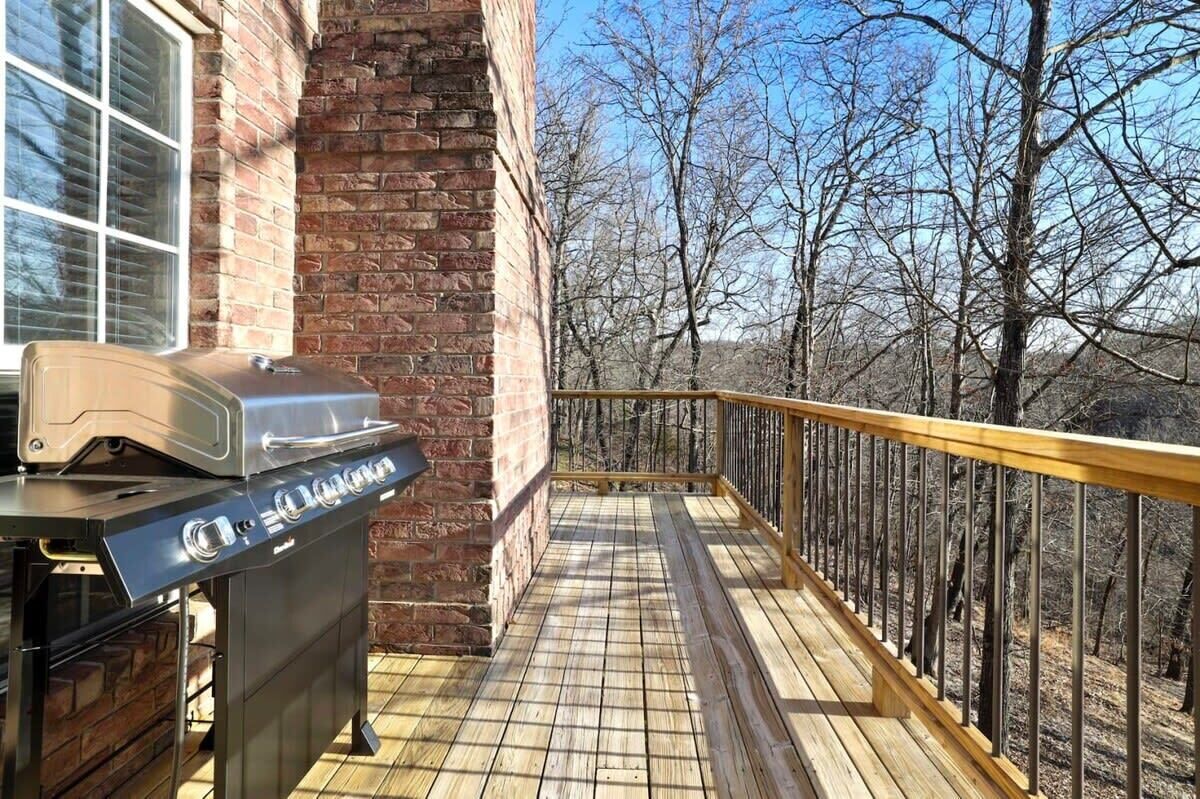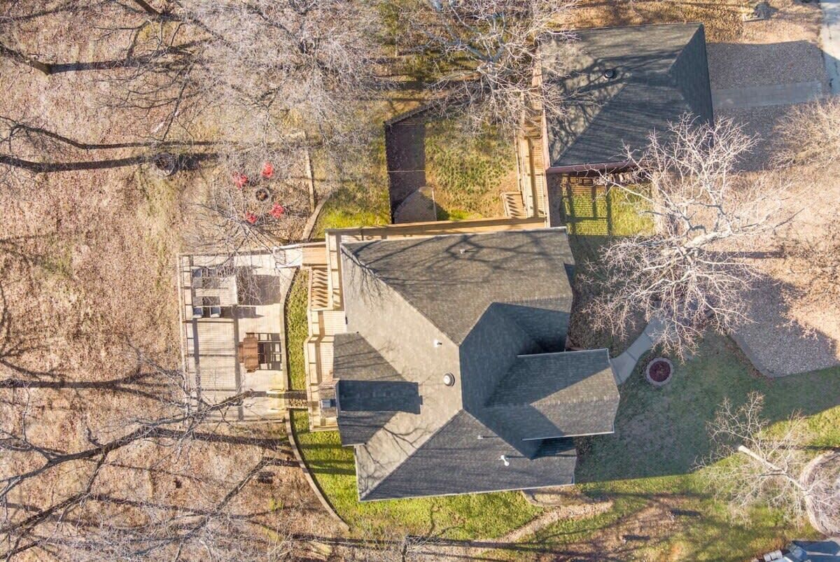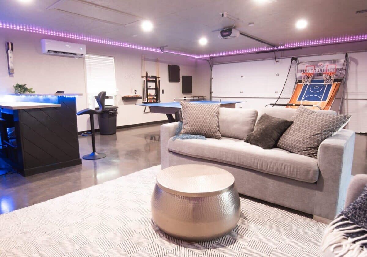Blue Haven-Epic game room-Lake Views Summary:Round up your friends and family and escape to Blue Haven! Our 4-bedroom, 3.5-bath lake house sleeps 12 guests. Immerse yourself in entertainment with a game room that mirrors the ambiance of a night on the town; complete with 2 TV screens, a bar, basketball arcade game, ping pong, darts, baggo, and a pool table. Outside, enjoy lake views from the spacious deck or kick back by the fire pit! When it is time to hit the water, Hickory Creek Marina is just 3 miles away.The Space:Highlights:★ Epic climate controlled game room in the garage complete with 2 TVs, a bar, basketball arcade game, ping pong. pool, darts, and colorful LED lighting!★ HUGE outdoor deck with grill, seating, dinning table and fire pit!★ 3.4 miles from Hickory Creek Marina. ★ Lake look out point- follow the path from the back yard. ★ Sleeps 12! 2 King bedroom suites, Queen Bedroom, Bunk bedroom for 3, & pull out couches in the garage for 3. ★ Board games and playing cards provided in the living room. ★ Fully stocked kitchen with the essentials you'll need to whip up your favorite meals!★ Kid-friendly - Children's dinnerware available.★ Dog-Friendy with a small fee.Welcome to Blue Haven! When you walk in you will be greeted by our living room with tall ceilings and large windows to take in the scenery. This space is the perfect place to gather and enjoy the large smart tv, plush couches, fire place, bar cart, and various games. Head into the kitchen to find our dinning table for 6 and fully stocked kitchen. In the detached garage, is where you will find our game room! This room beats a night out on the town by having your own personal bar, 2 large smart Tvs, basketball arcade game, baggo, darts, ping pong, pool table, and a crazy amount of neon lighting. This is the place memories are made! When it is time to turn in for the night choose from one of our 5 bedrooms;1. The King Suite on the main floor has a smart tv, desk space, access to the back patio, and an attached full bathroom.2. The second king suite is downstairs and has a smart tv, access to the back patio, and an attached full bathroom. 3. The third bedroom has a queen sized bed, smart tv, desk space, and an attached full bathroom.4. The fourth bedroom has a bunk bed with 3 twin mattresses. 2 on top, and 1 on bottom. 5. The detached garage has a queen pull out couch and a twin pull out couch to sleep 3 more guests. Outside, step onto our double- deck back patio complete with a gas grill, lounge seating, dinning table, and fire pit with 4 Adirondack chairs. This is the perfect setting for enjoying conversation with friends, taking in wildlife views, or enjoying a meal al fresco! Follow the path down to the water from the backyard! Depending on water levels it may be high enough to hop in. Please note there is no dock access.Guest Access:------Water levels are subject to change at any time due to environmental factors outside of the host’s control which may impact the accessibility and appearance of the lake. Cancelations due to water levels will not be honored outside of the cancelation policy. Guests are solely responsible for preparing for their stays accordingly by checking water levels ahead of their stays.----- PLEASE NOTE: The dock in the backyard is not for guest use, it is owned by a neighbor.Guest Access and Amenities:Guests will have access to the entire pictured house, all appliances, any kitchen supplies, and all amenities. We provide amenities in the bathrooms, kitchen, and laundry room with enough to get you started on your trip. We do not provide excess for more than a couple of days' worth, and guests are responsible for purchasing these items for personal use if they run out during their stay. Exterior cameras may be at the property for security purposes.The Neighborhood:Our cozy lakeside home is located off of a beautiful, windy drive through a quiet neighborhood in Lowell, Arkansas! Enjoy lake views from the house or head to Hickory Creek Marina to get in. Drive just 10 minutes to town, 20 minutes to Springdale's Downtown, or 23 minutes to Rogers Downtown.Getting Around:Our house is located just 10 minutes from the main roads in Lowell. The house can park about 4-5 cars.Other Things to Note:★ Washer and Dryer for guest use. ★ Dog-Friendy with a small fee.House Rules Strictly Enforced:Parties or guest’s actions that result in disturbances, property damage, extensive extra cleaning, or smoking indoors will incur a fine of $1,000.This property only allows dogs, with a maximum of 3, and requires a fee of $40 per dog to be paid prior to your stay. Dogs discovered at the property without prior notice or cats discovered at the property will incur a fine of $400.Unauthorized checkout delays will incur a fine of $100 per hour.