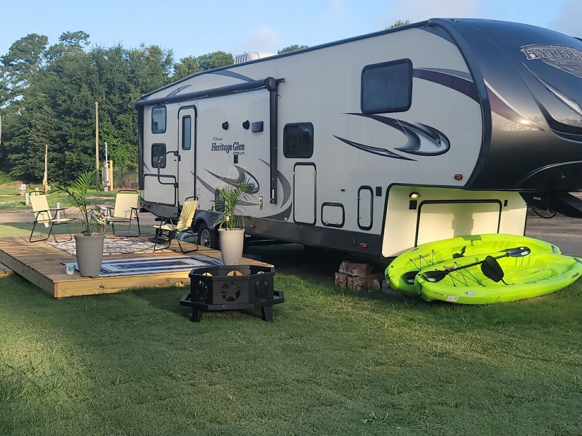 Campers Paradise 2017 Heritage Glenn sleeps 6. Queen bed, Bunk Beds, couch sofa. 2 tvs and outdoor radio and kitchen. Enjoy all the amenities of the lake, sandy beach, 3 restaurants, free boat slip with rental. Other amenities include kayak rentals. Please inform host when booking this property if you would like to rent any of the amenities.