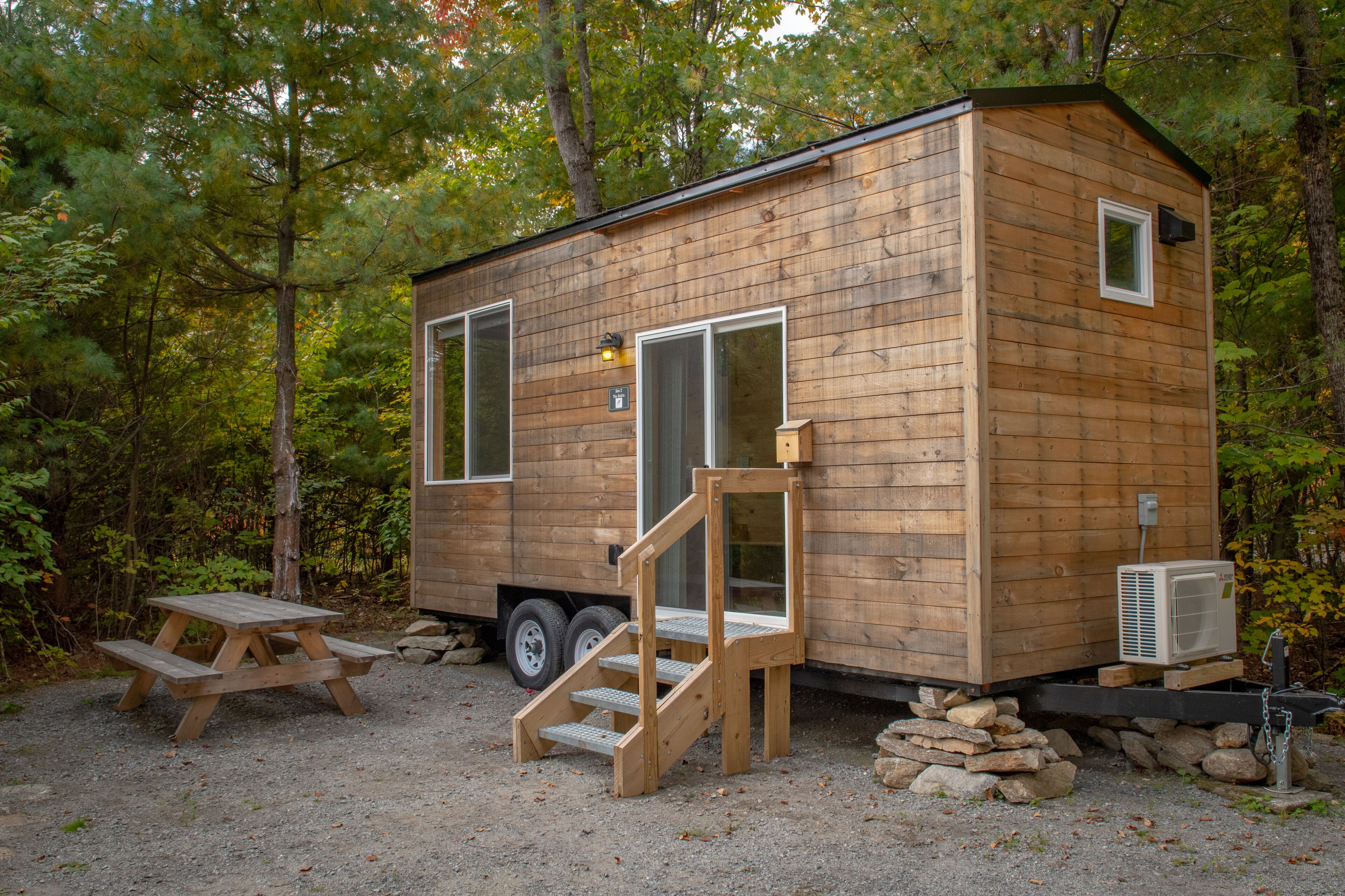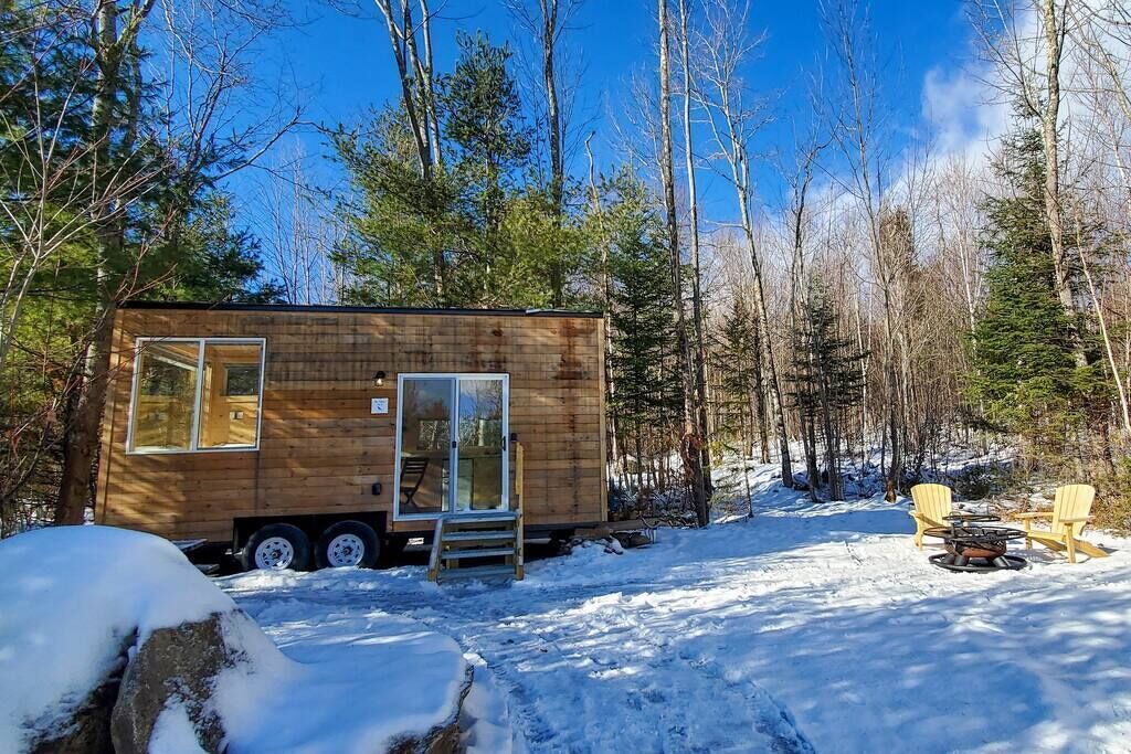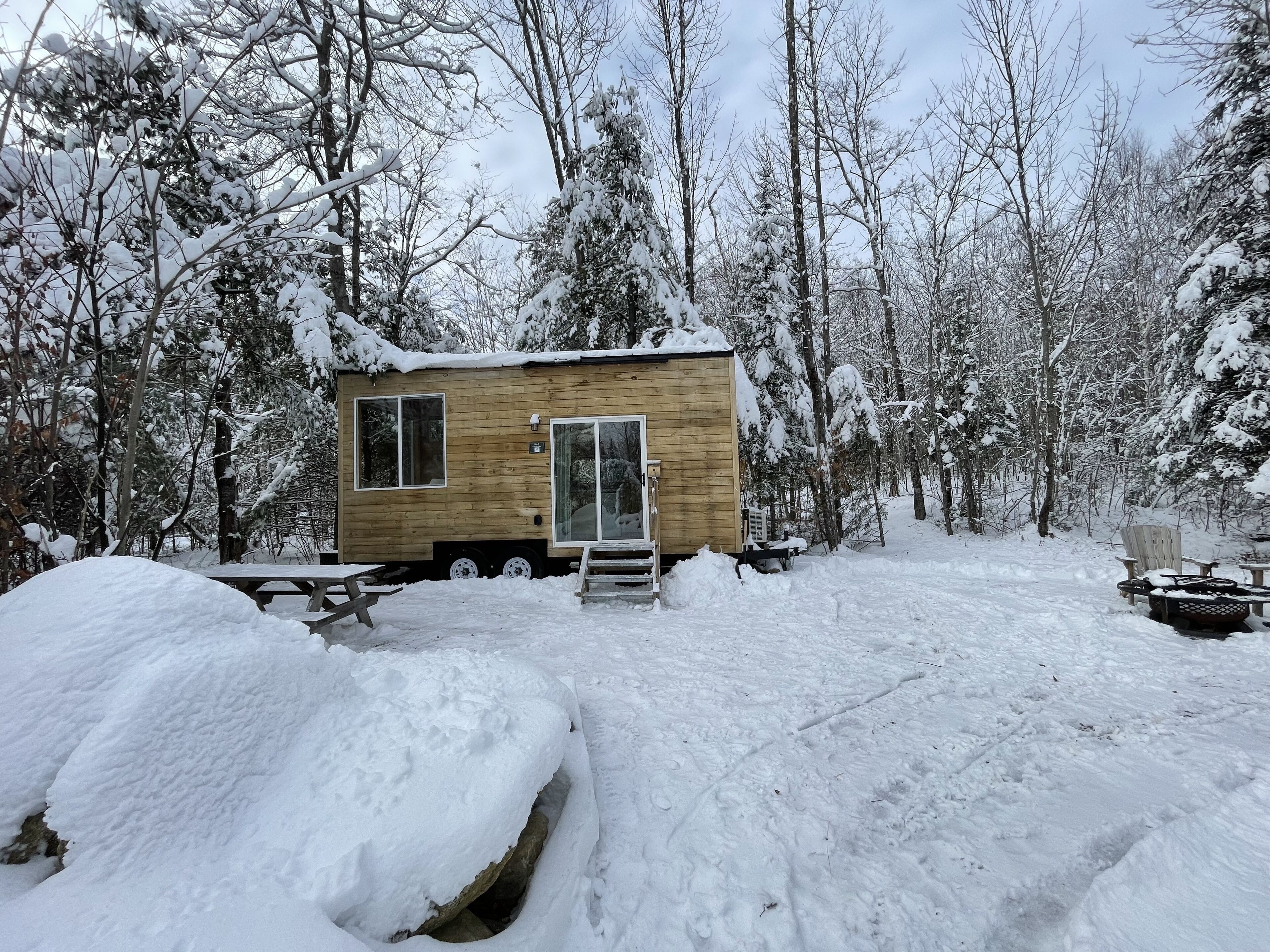 Trailside Stays - Tiny House in the Woods-Escape to Nature. Robin This charming and elegant little cabin will transport you into nature. The feeling of camping outdoors with indoor amenities. Part of the campground, Trailside Stays that is conveniently located alongside the cross country ski and mountain bike trails at Green Woodlands. This tiny house features 1 high quality queen-size bed, linens, kitchenette, large picture windows, bathroom with shower, heating, A/C, outdoor seating, grill top fire pit and high speed fiber internet. This space is ideal for avid campers or novice nature enthusiasts alike! In our newly built, beautiful tiny cabins you can experience the woodlands of New Hampshire with ease. Tucked away in small picturesque town, you will feel like you found a hidden treasure. Any time of year is the perfect time to stay! Our cabins have heating and air conditioning. Also, the bathroom has a stand-up shower with hot water. The queen-size bed will be made for you with quality linens, a comforter with duvet, 4 pillows and a throw blanket.Inside the cabin you can cook on the 2-burner stove top and keep your items in the small fridge. Or you can cook outside! Using the fire-pit grill top you can cook anything you would on a regular grill. Or just enjoy a campfire and some stargazing. We provide everything you need to get the fire going, each cabin has an outside bin filled with firewood bundles, Firestarter logs, lighters, and outdoor cooking utensils. Each cabin has a well-stocked kitchenette that includes: a pot, pan, water kettle, cooking utensils, eating utensils, cups, plates, bowls, wine glasses, scissors, can opener, cutting board. We also conveniently have salt, pepper, olive oil, pour-over coffee, creamer, and sugar provided. There will also be dish and hand soap, paper towels, toilet paper and trash bags. The campsite is located in a very wooded, rural area. However, it is easily accessible from North Dorchester road (which is a dirt road). We are located approximately 20 miles from routes 93 and 89. There is little to no cell phone service in the area.No pets allowed.Full refund for cancellations up to 5 days prior to arrival.