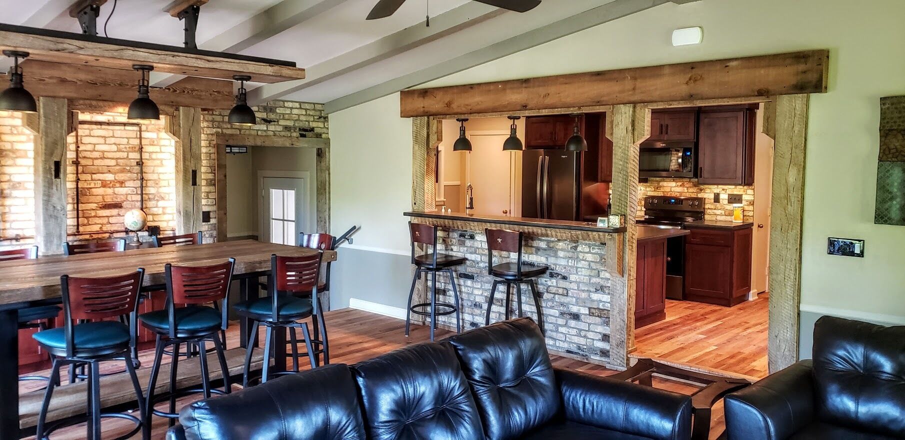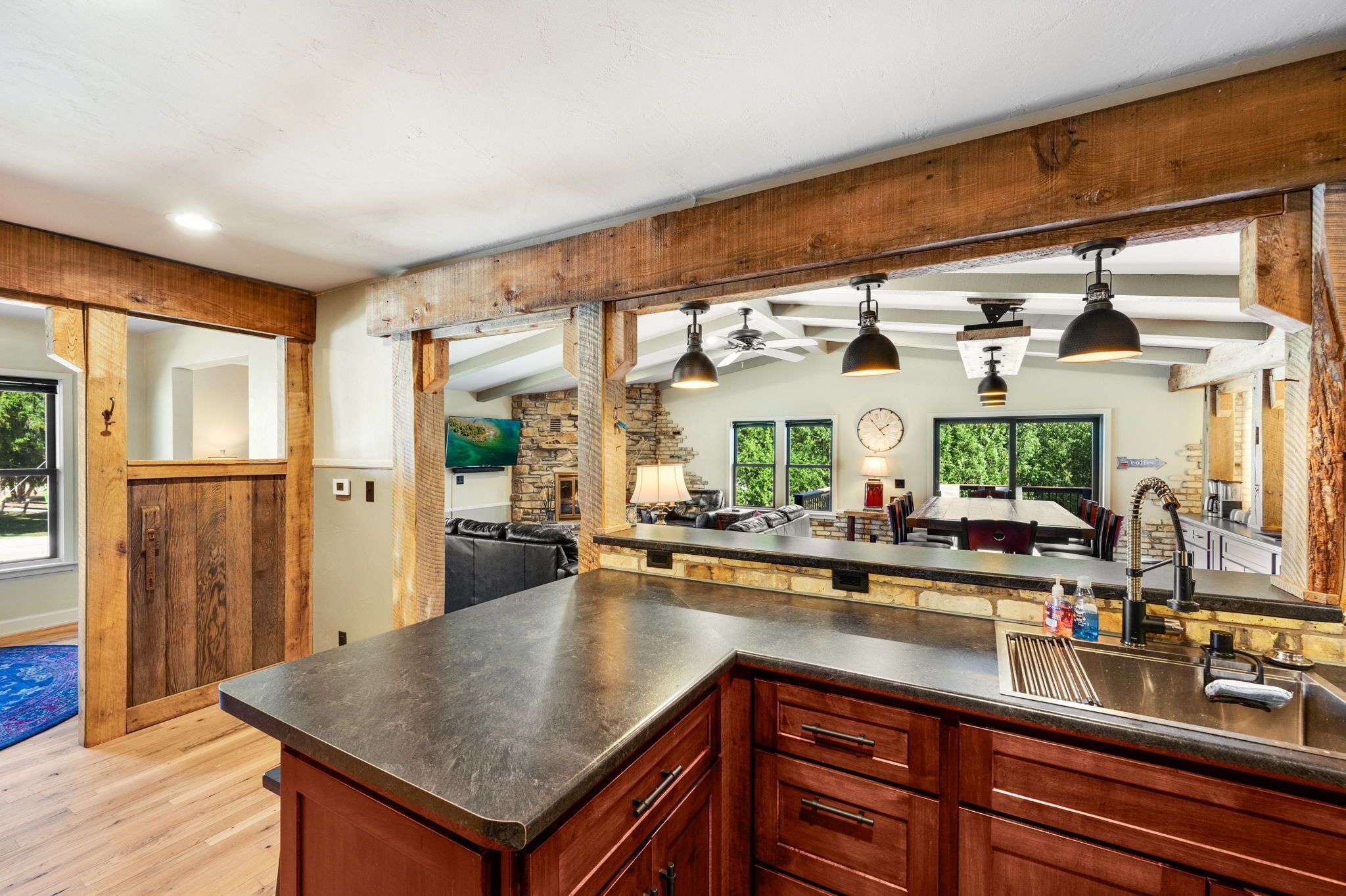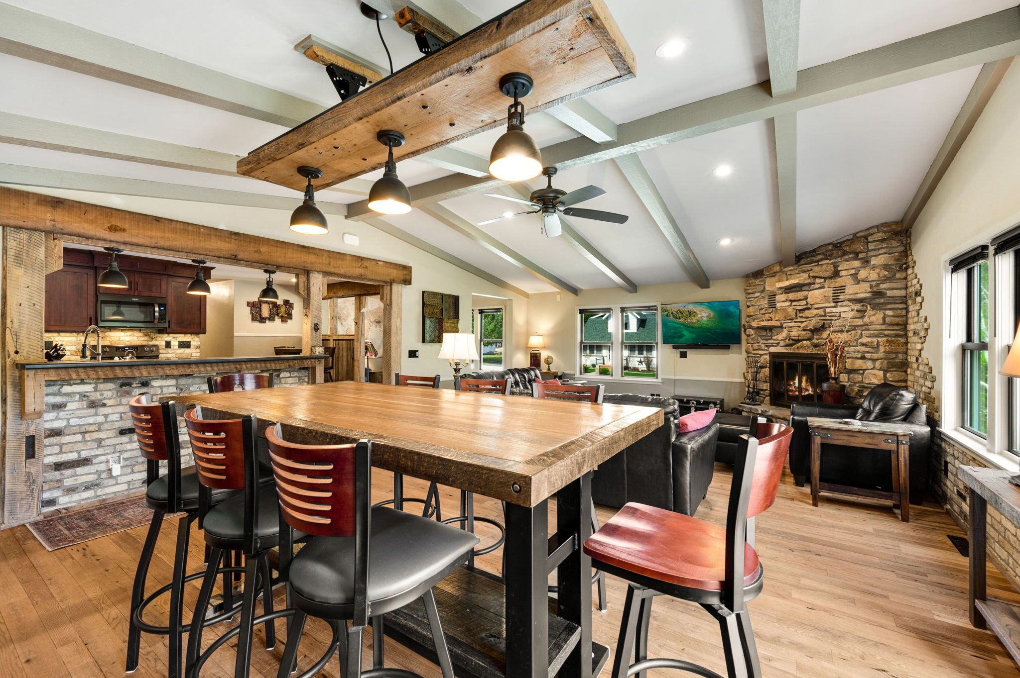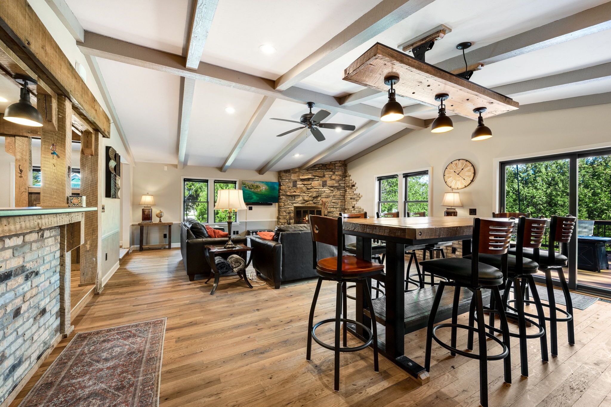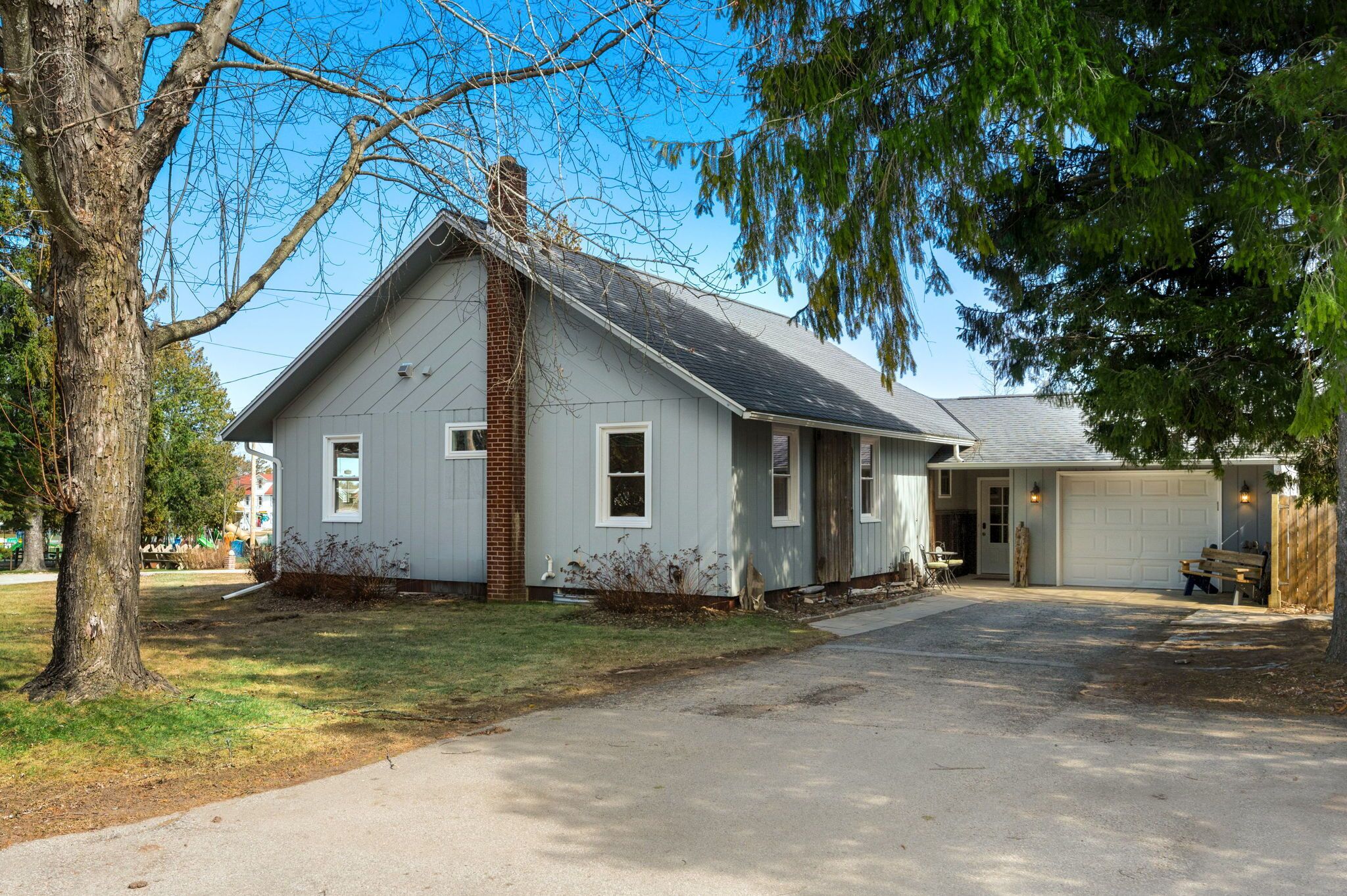 Perfect for families!!, Baileys Harbor 3 Bedroom House! Sleeps 6 plus 2 under 12 Kendall ParkA comfortable 3-bedroom, 2-bath home on the quiet side of Door County. Located in downtown Bailey's Harbor and one block in from the main street. This house is within walking distance to the Marina, The Ridges Environmental Center, Door County Brewery, Harbor Fish Market & Grille, Chives Restaurant, Bailey's 57, Anclam Beach, shops, and all that Bailey's has to offer. Yet the home offers privacy in a quiet, safe neighborhood. Located across from Kendall Park which is fun for the kids and convenient for the Sunday Farmers Market.The house was built in 1950 as a 3-bedroom, 1-bath home. In 1973 it received a major remodel which included a great room with a stone fireplace, and a master bedroom with a bath. Except for a few makeovers here and there, it remained that way for 46 years.It recently underwent a significant transformation. The house has been renovated using repurposed materials from industrial buildings and barns from around Wisconsin as well as Amish-made cabinets and furniture.The family room and the kitchen is generally one large area which is perfect for families. It has a stone, floor-to-ceiling fireplace surrounded by a comfortable seating area. There is a huge bar height table in front of a backlit timber and cream city brick wall with a coffee bar and sink. Patio doors lead to a private, spacious deck with ample seating and a gas fire table and grill. The kitchen overlooking the family room is set up with everything you need to enjoy family meals at home if you choose. On the other side of the house, down the hall, is where you will find the three bedrooms. The master bedroom has a queen bed and a full bath with a walk-in shower and walk-in closet. The remaining 2 bedrooms each have a queen bed and a twin-XL bed along with a closet. Both bedrooms share the main bath at the end of the hall. It is a full bath with a shower over the tub. Additionally, the master bedroom walk in closet has been converted into a laundry area with washer and dryer for guests to use.Bailey's Harbor is the perfect location in Door County! This house is the perfect location in Bailey's Harbor! Enjoy your stay!