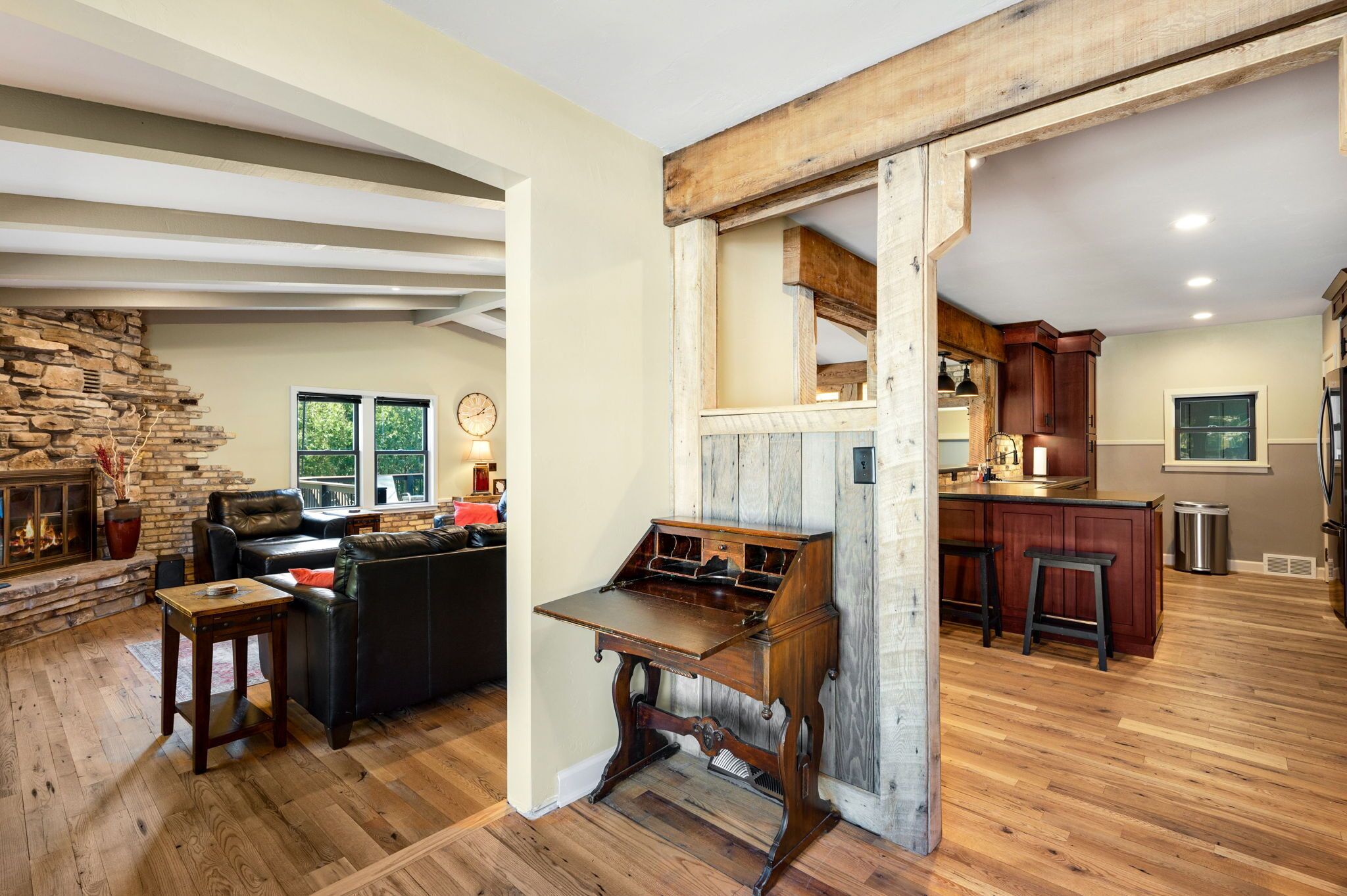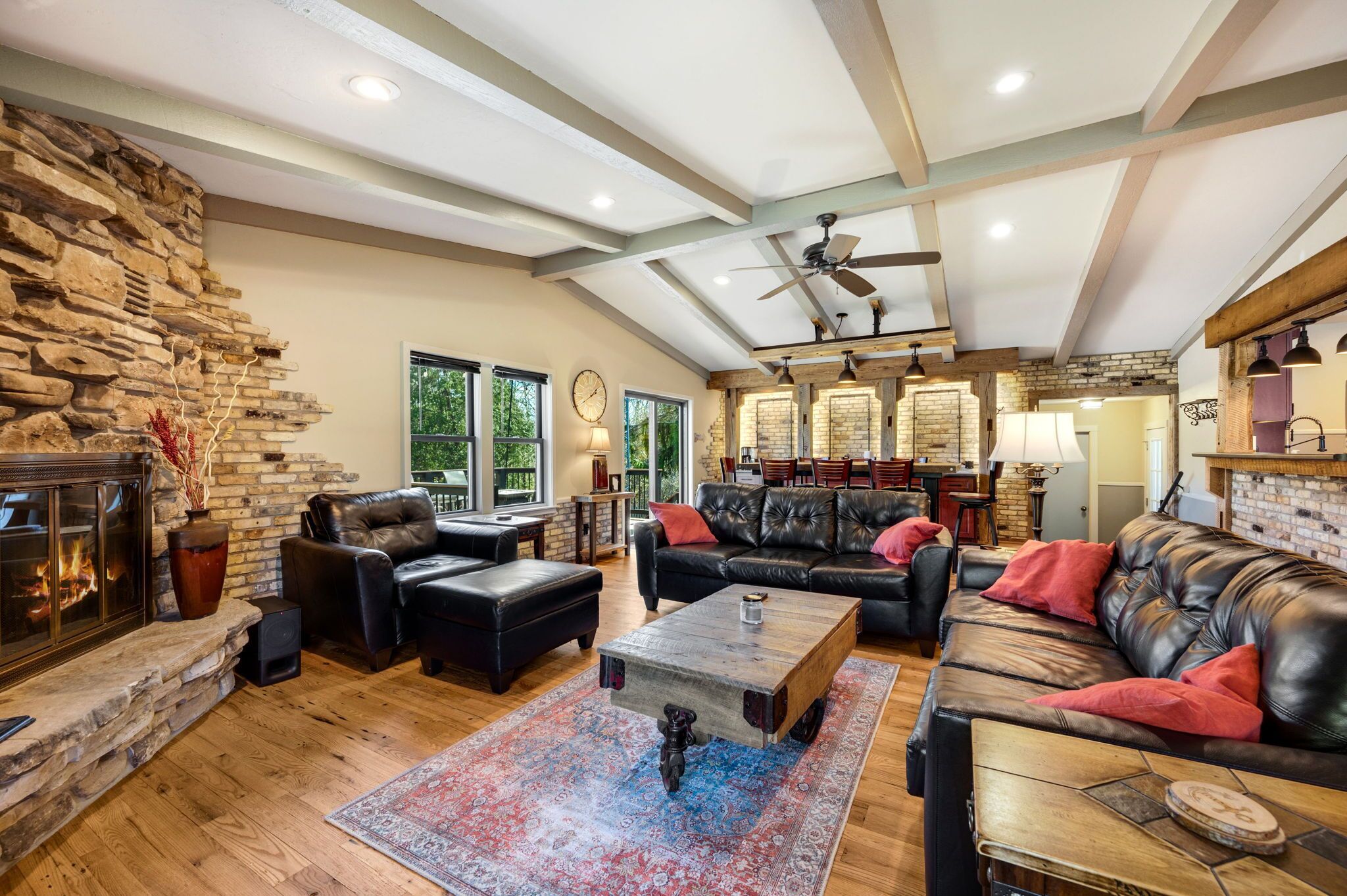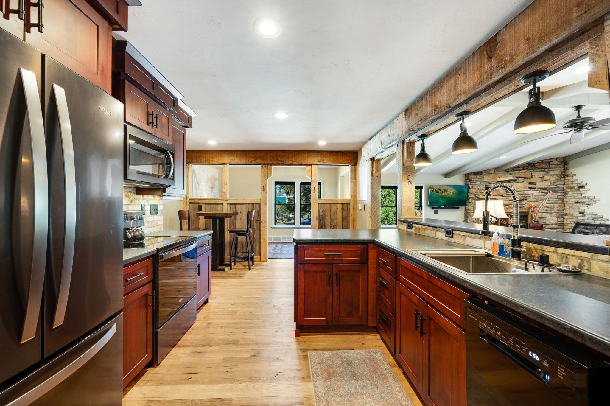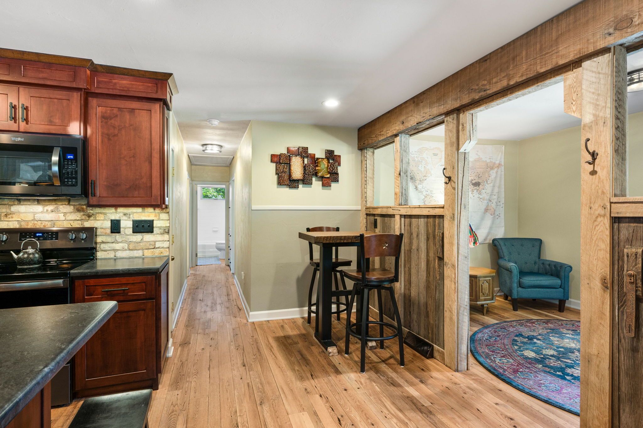 Perfect for families!!, Baileys Harbor 3 Bedroom House! Sleeps 6 plus 2 under 12 Kendall ParkA comfortable 3-bedroom, 2-bath home on the quiet side of Door County. Located in downtown Bailey's Harbor and one block in from the main street. This house is within walking distance to the Marina, The Ridges Environmental Center, Door County Brewery, Harbor Fish Market & Grille, Chives Restaurant, Bailey's 57, Anclam Beach, shops, and all that Bailey's has to offer. Yet the home offers privacy in a quiet, safe neighborhood. Located across from Kendall Park which is fun for the kids and convenient for the Sunday Farmers Market.The house was built in 1950 as a 3-bedroom, 1-bath home. In 1973 it received a major remodel which included a great room with a stone fireplace, and a master bedroom with a bath. Except for a few makeovers here and there, it remained that way for 46 years.It recently underwent a significant transformation. The house has been renovated using repurposed materials from industrial buildings and barns from around Wisconsin as well as Amish-made cabinets and furniture.The family room and the kitchen is generally one large area which is perfect for families. It has a stone, floor-to-ceiling fireplace surrounded by a comfortable seating area. There is a huge bar height table in front of a backlit timber and cream city brick wall with a coffee bar and sink. Patio doors lead to a private, spacious deck with ample seating and a gas fire table and grill. The kitchen overlooking the family room is set up with everything you need to enjoy family meals at home if you choose. On the other side of the house, down the hall, is where you will find the three bedrooms. The master bedroom has a queen bed and a full bath with a walk-in shower and walk-in closet. The remaining 2 bedrooms each have a queen bed and a twin-XL bed along with a closet. Both bedrooms share the main bath at the end of the hall. It is a full bath with a shower over the tub. Additionally, the master bedroom walk in closet has been converted into a laundry area with washer and dryer for guests to use.Bailey's Harbor is the perfect location in Door County! This house is the perfect location in Bailey's Harbor! Enjoy your stay!