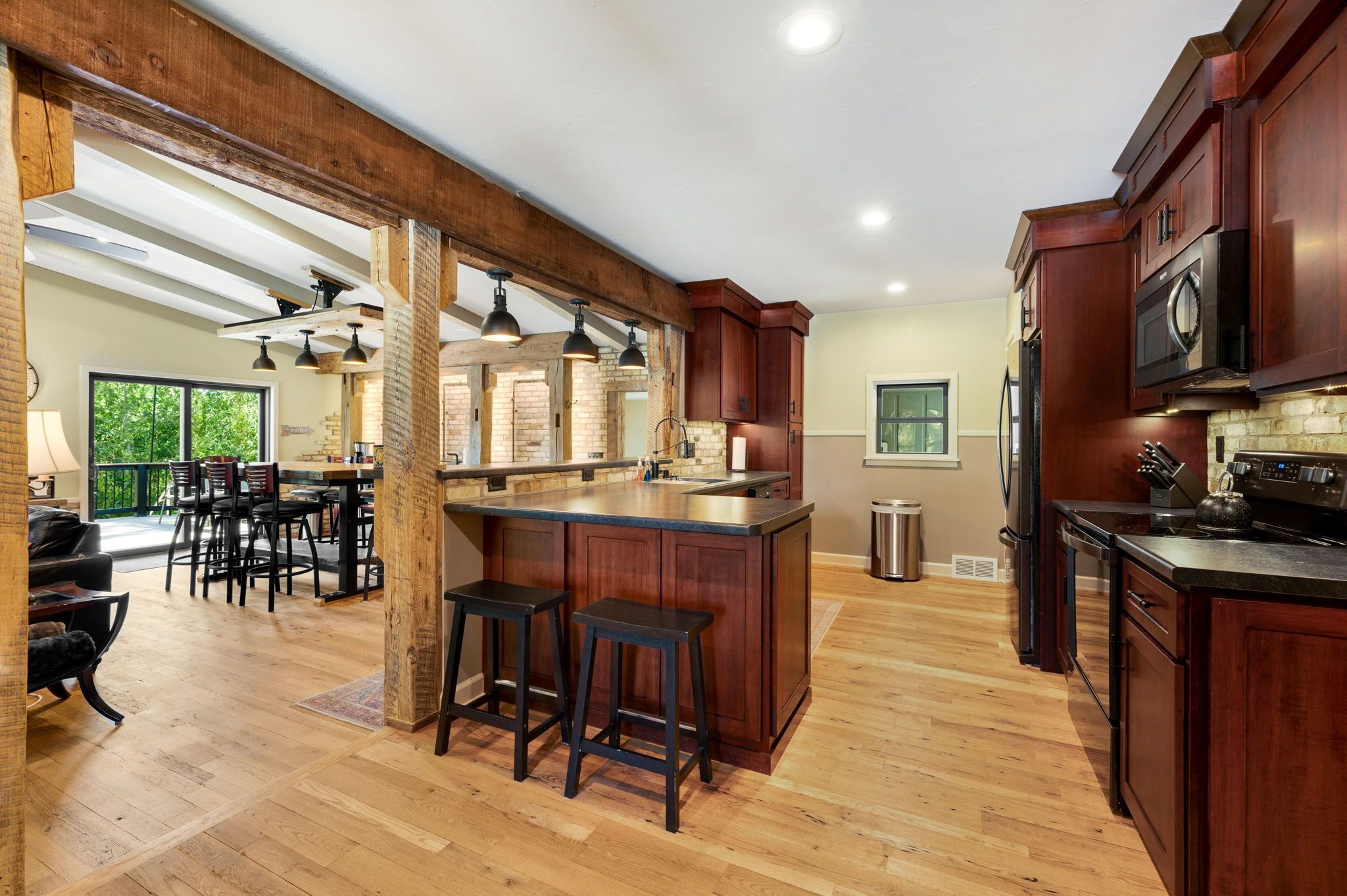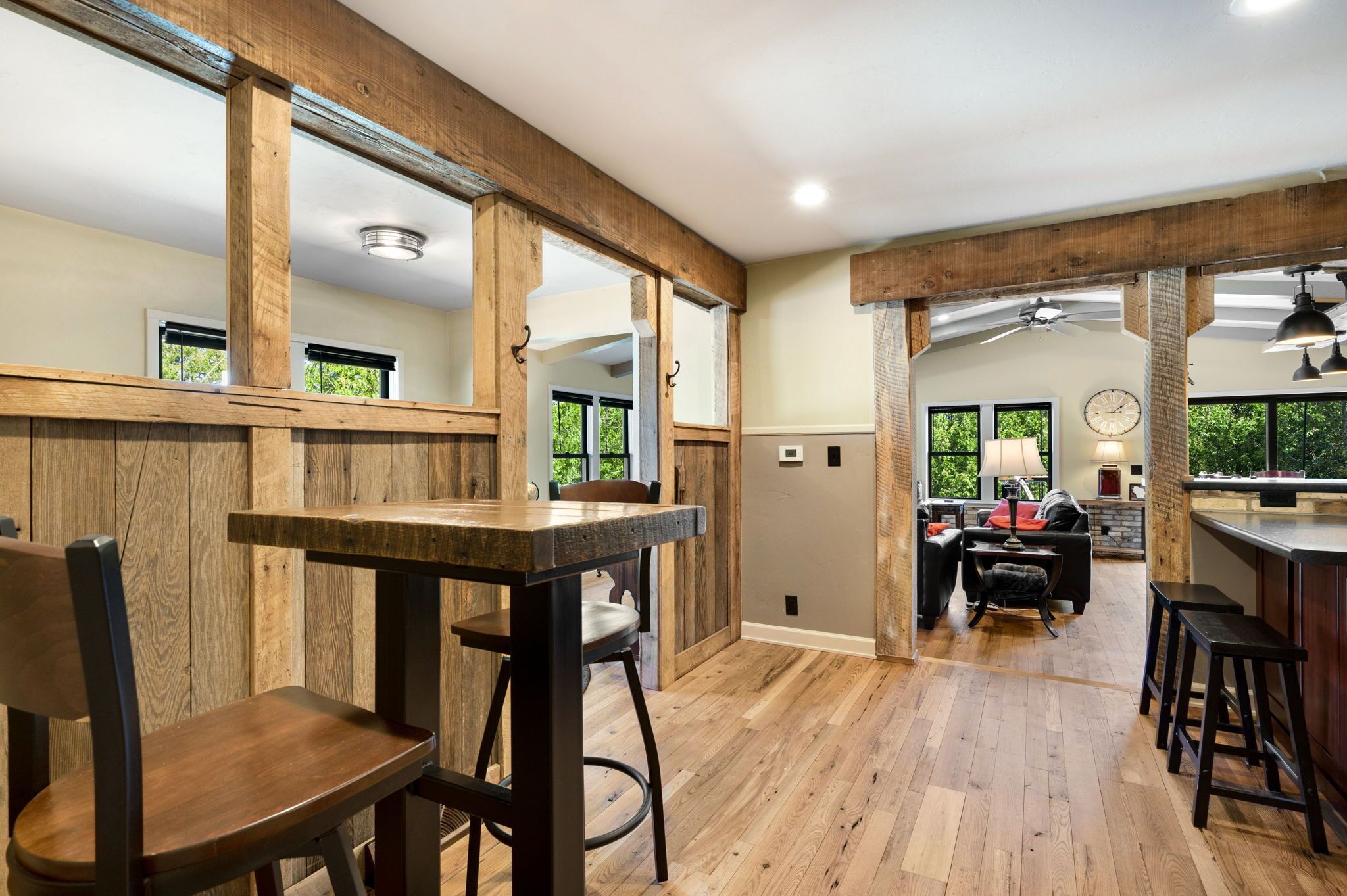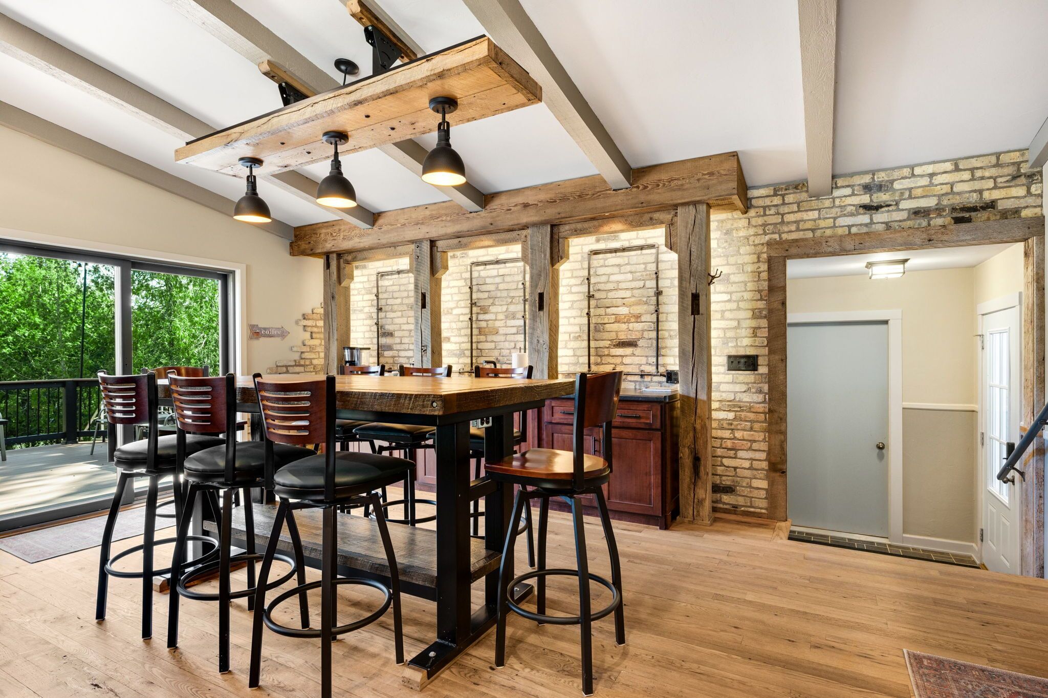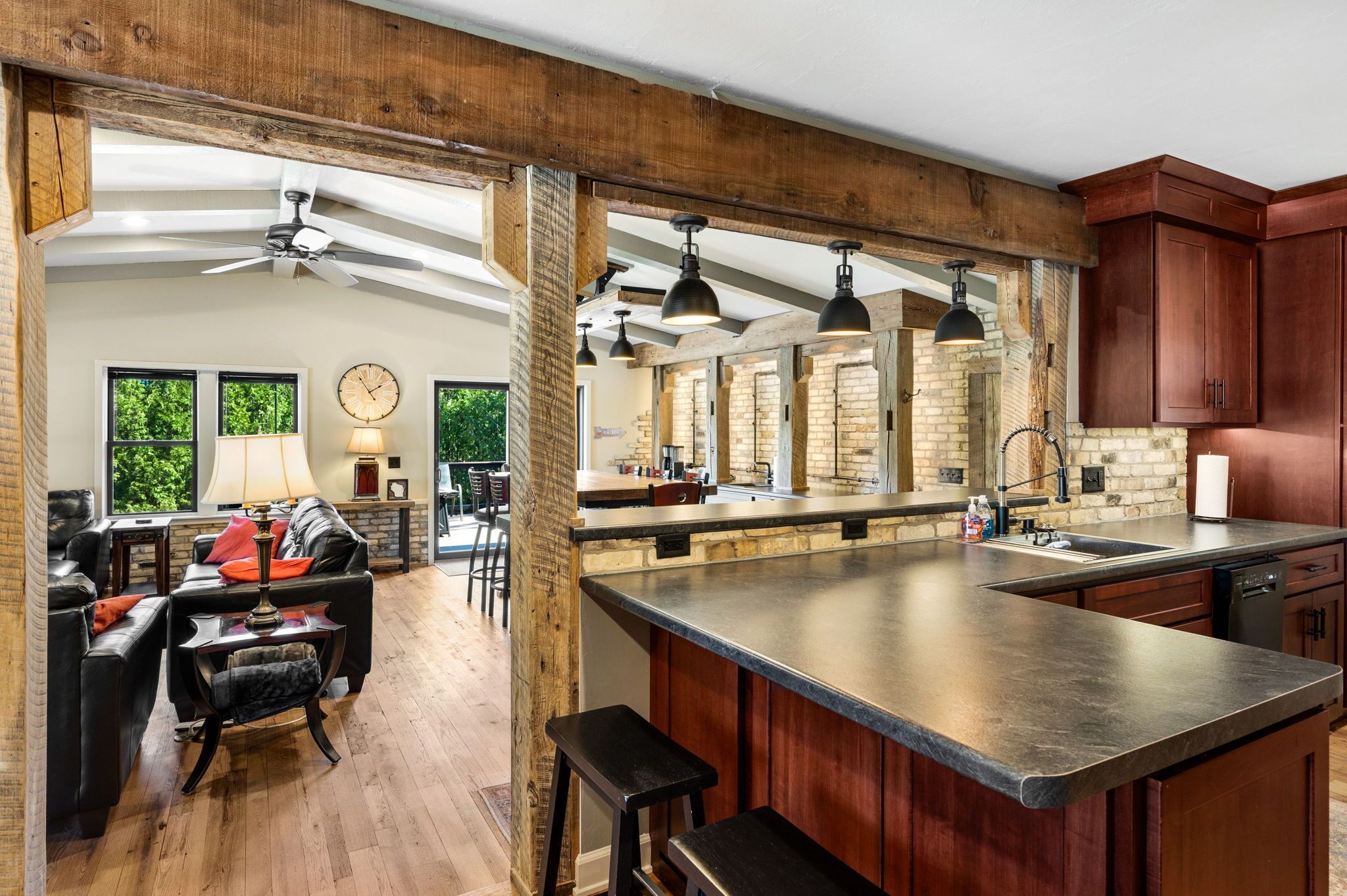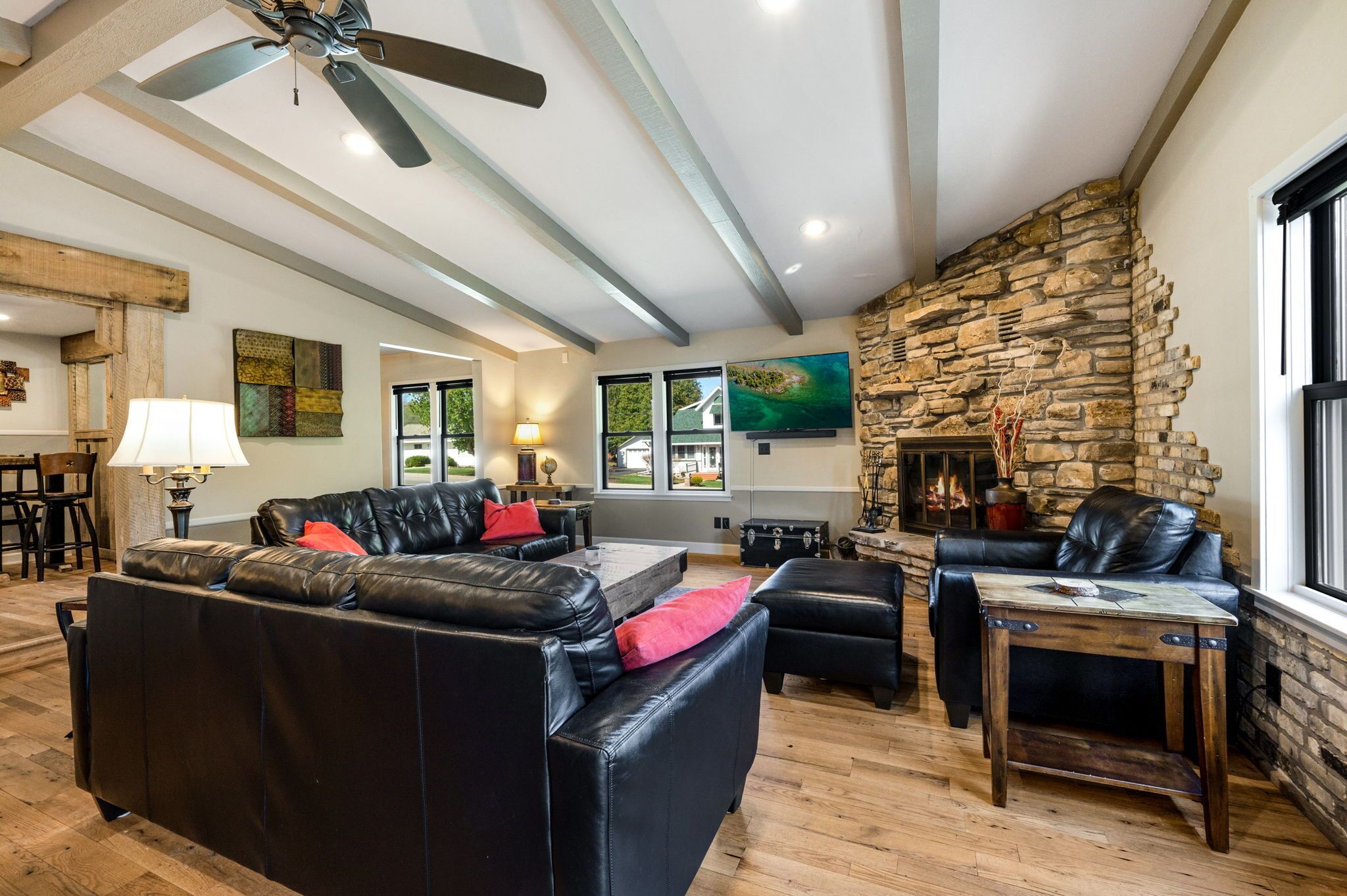 Perfect for families!!, Baileys Harbor 3 Bedroom House! Sleeps 6 plus 2 under 12 Kendall ParkA comfortable 3-bedroom, 2-bath home on the quiet side of Door County. Located in downtown Bailey's Harbor and one block in from the main street. This house is within walking distance to the Marina, The Ridges Environmental Center, Door County Brewery, Harbor Fish Market & Grille, Chives Restaurant, Bailey's 57, Anclam Beach, shops, and all that Bailey's has to offer. Yet the home offers privacy in a quiet, safe neighborhood. Located across from Kendall Park which is fun for the kids and convenient for the Sunday Farmers Market.The house was built in 1950 as a 3-bedroom, 1-bath home. In 1973 it received a major remodel which included a great room with a stone fireplace, and a master bedroom with a bath. Except for a few makeovers here and there, it remained that way for 46 years.It recently underwent a significant transformation. The house has been renovated using repurposed materials from industrial buildings and barns from around Wisconsin as well as Amish-made cabinets and furniture.The family room and the kitchen is generally one large area which is perfect for families. It has a stone, floor-to-ceiling fireplace surrounded by a comfortable seating area. There is a huge bar height table in front of a backlit timber and cream city brick wall with a coffee bar and sink. Patio doors lead to a private, spacious deck with ample seating and a gas fire table and grill. The kitchen overlooking the family room is set up with everything you need to enjoy family meals at home if you choose. On the other side of the house, down the hall, is where you will find the three bedrooms. The master bedroom has a queen bed and a full bath with a walk-in shower and walk-in closet. The remaining 2 bedrooms each have a queen bed and a twin-XL bed along with a closet. Both bedrooms share the main bath at the end of the hall. It is a full bath with a shower over the tub. Additionally, the master bedroom walk in closet has been converted into a laundry area with washer and dryer for guests to use.Bailey's Harbor is the perfect location in Door County! This house is the perfect location in Bailey's Harbor! Enjoy your stay!
