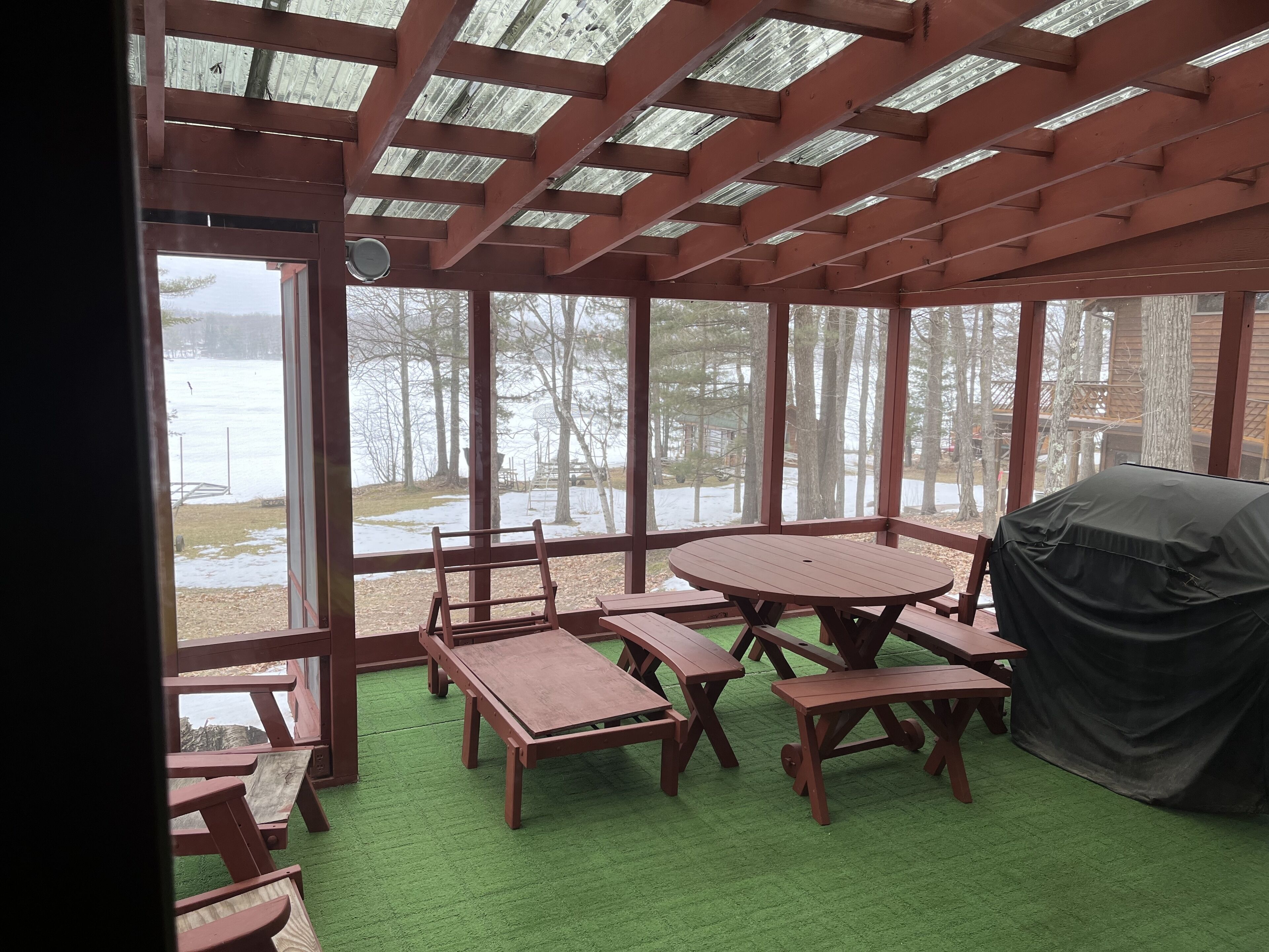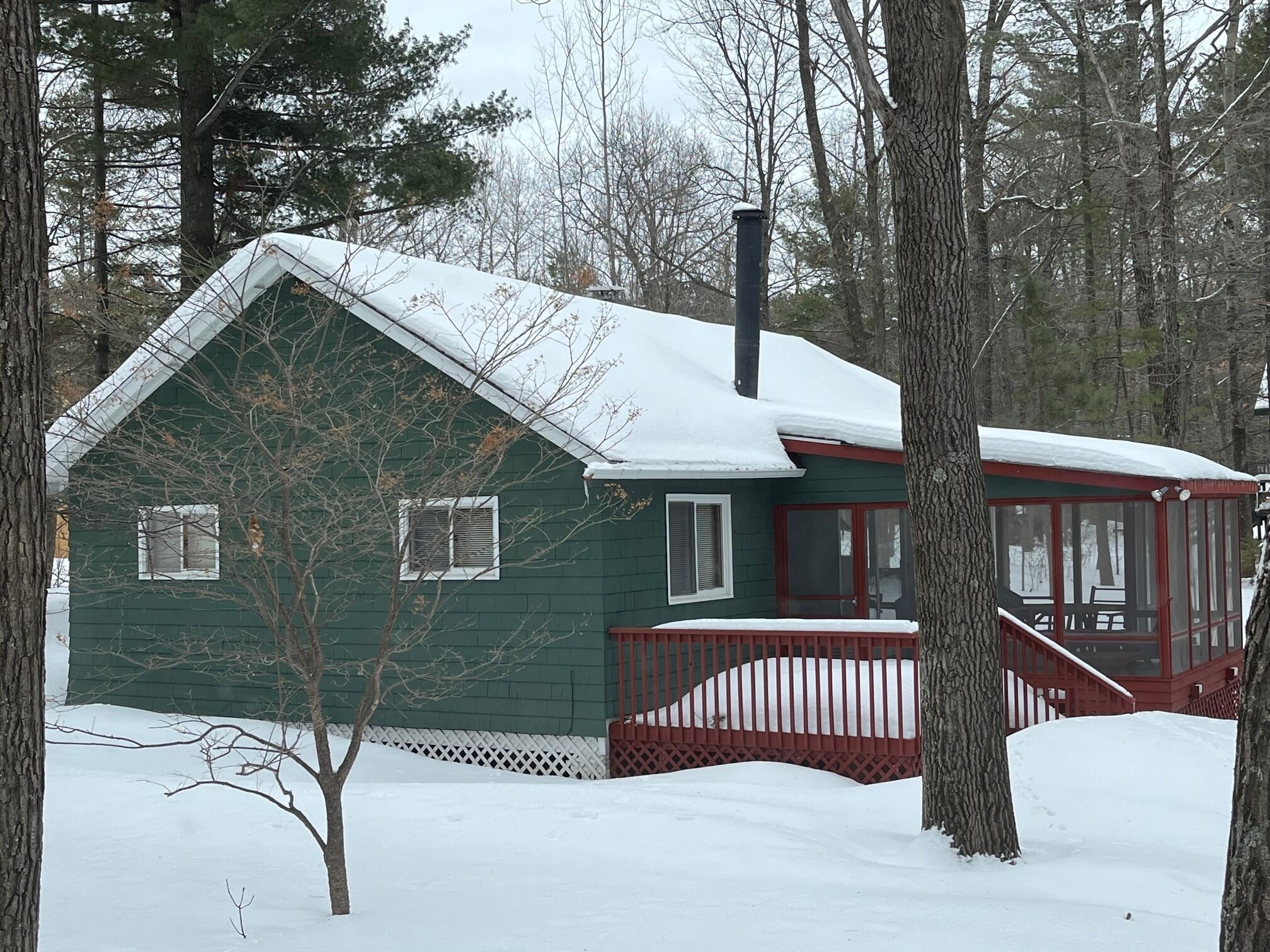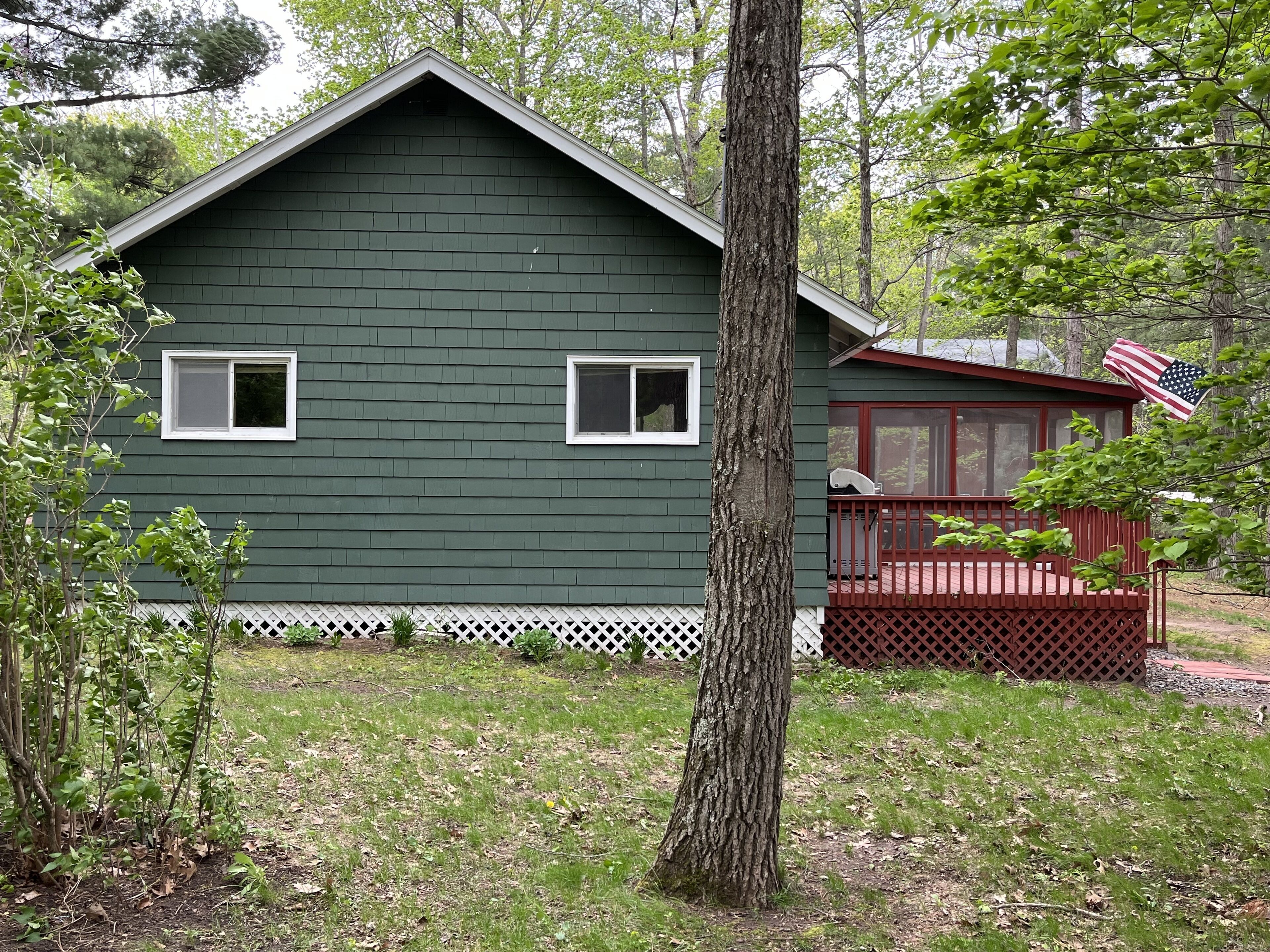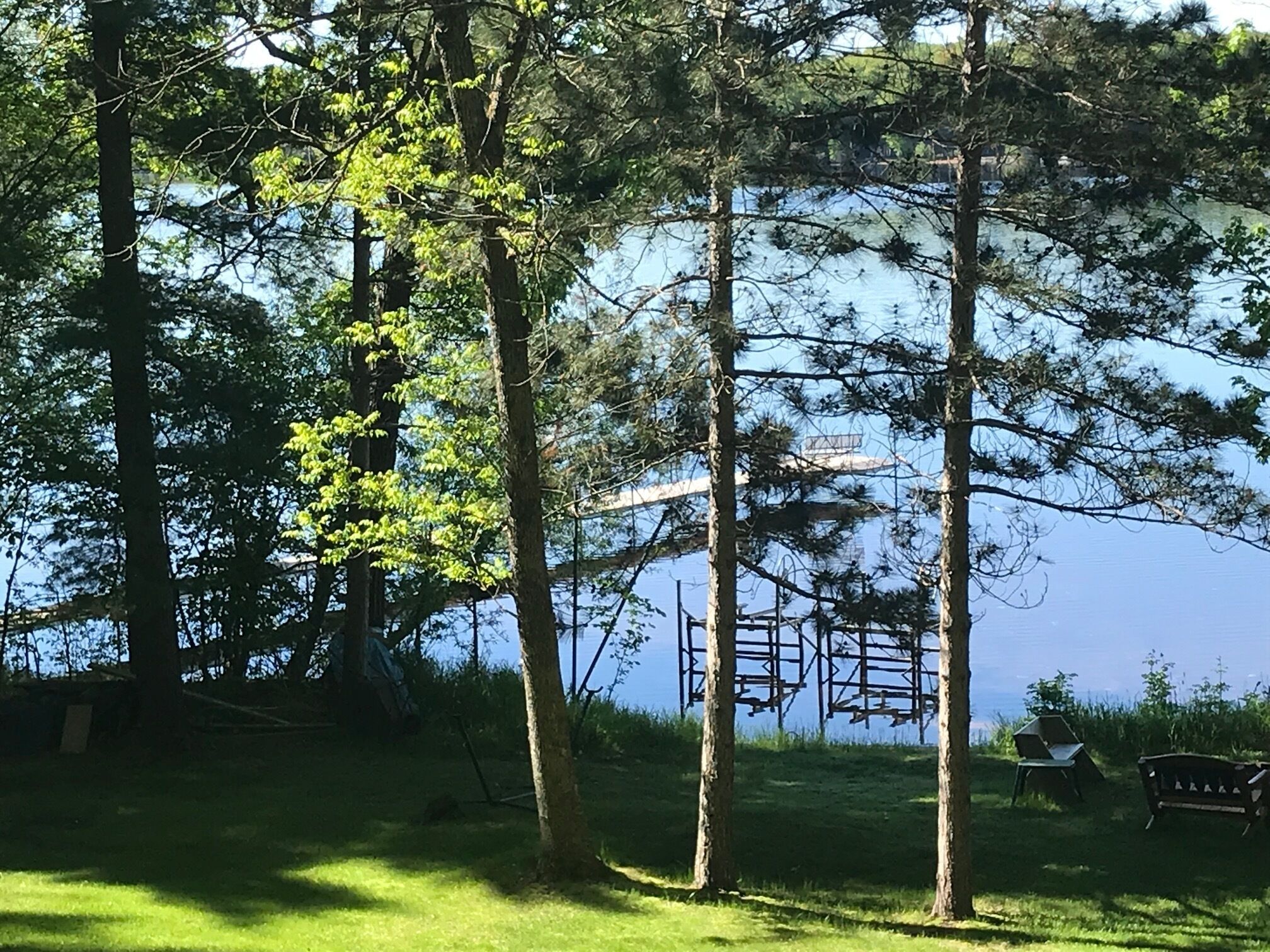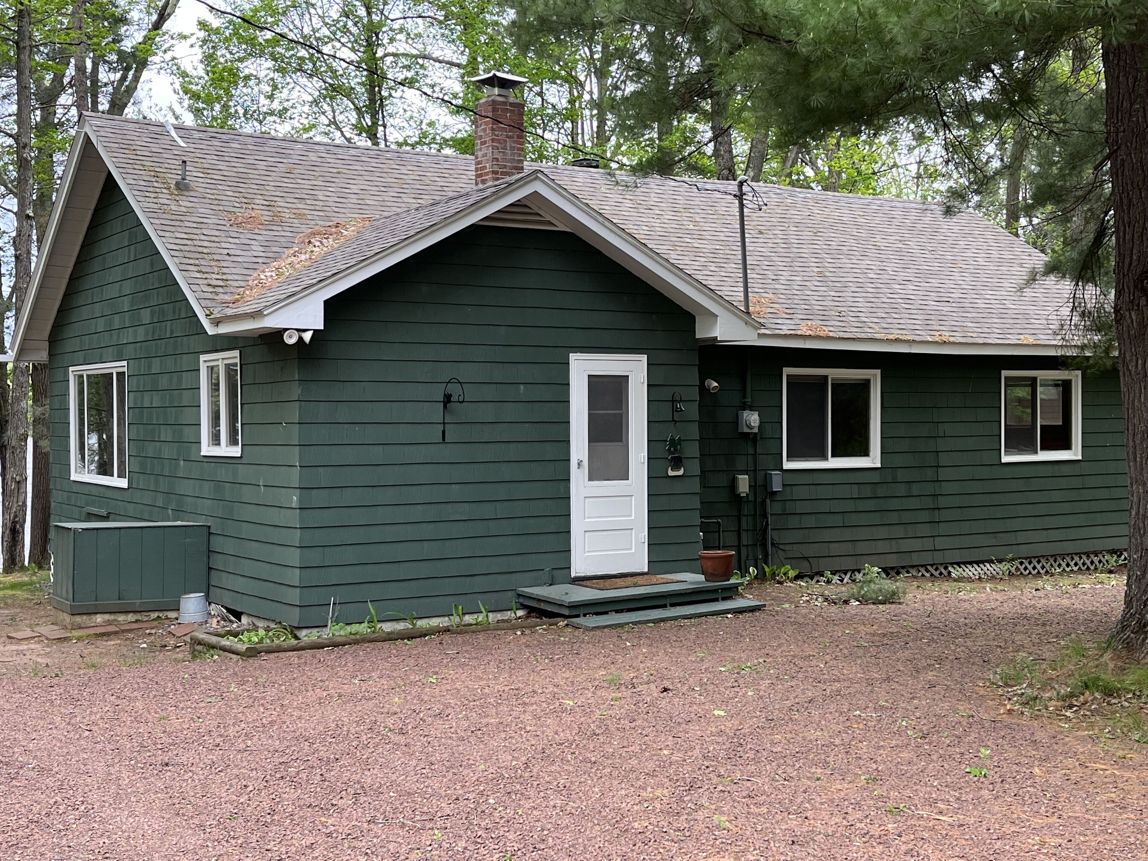 Lake Cottage with Great View and 100' Beachfront; Pontoon boat available. Lone Pine Cottage is located in northwest Wisconsin on 100' of lake shore; it has a hard sand beach and a dock for swimming, viewing and boating. This 3 season Cottage can sleep up to 8 people in 3 bedrooms and a pull-out couch. It also has a full kitchen, dining room, living room and bathroom. A screened porch and Bar-B-Q are ideal for grilling and dining with a beautiful lake view. Wifi and TV are included. A 20' pontoon boat is optional for a small additional rent and may be used for fishing, for touring the lake's 11 miles of shoreline and for boating to the Village General Store, the Dairy Queen and two restaurant/ bars.