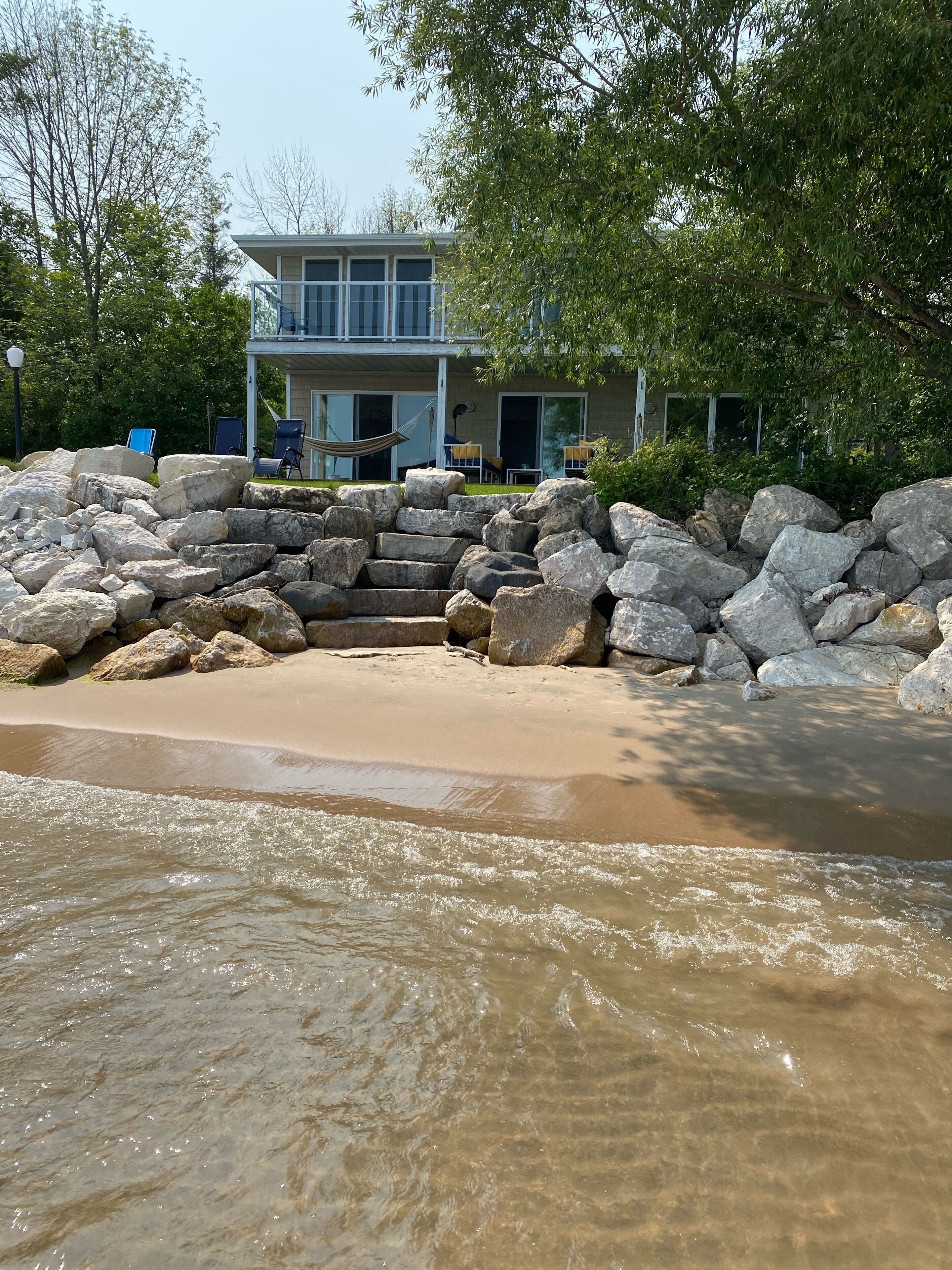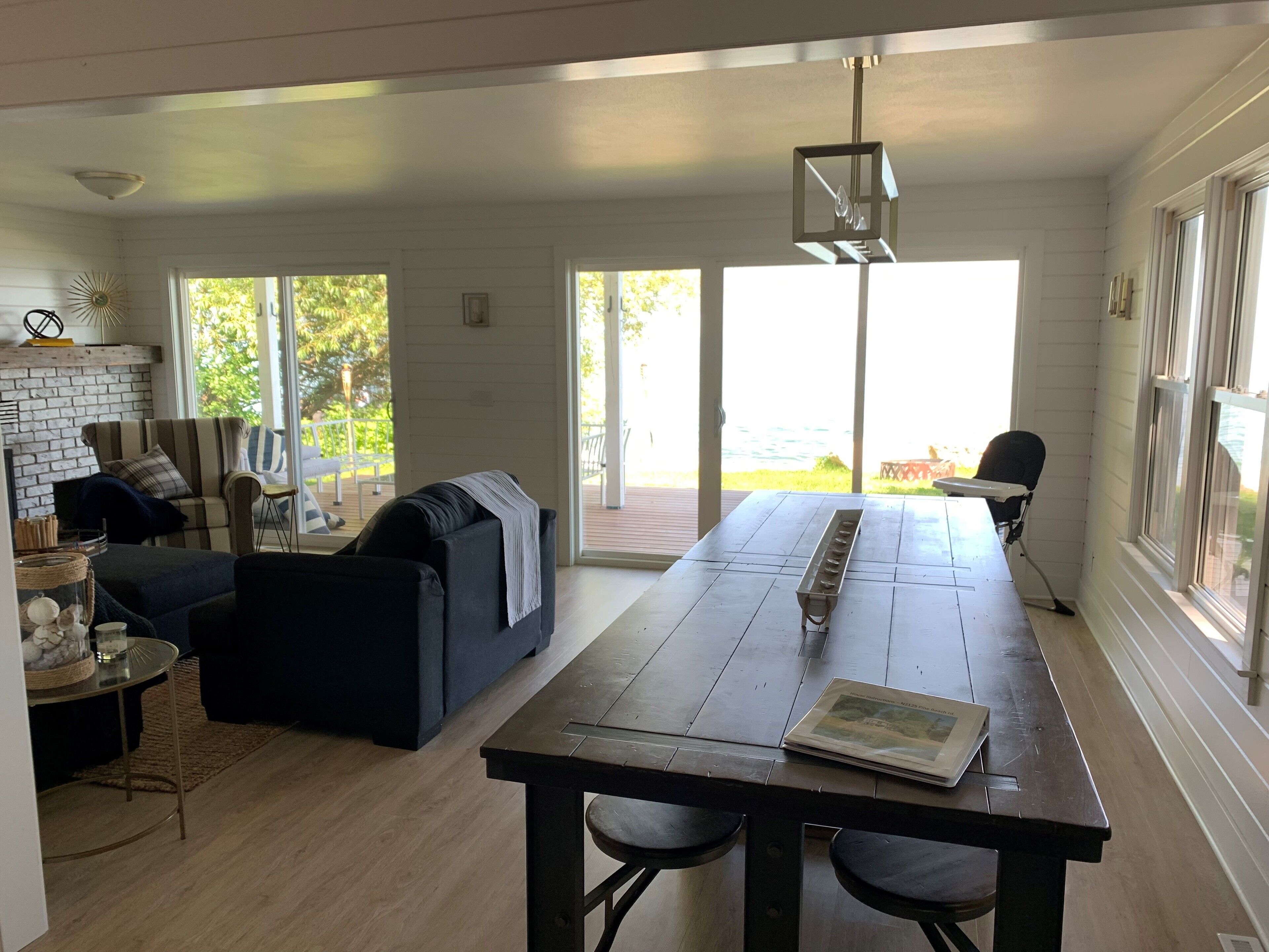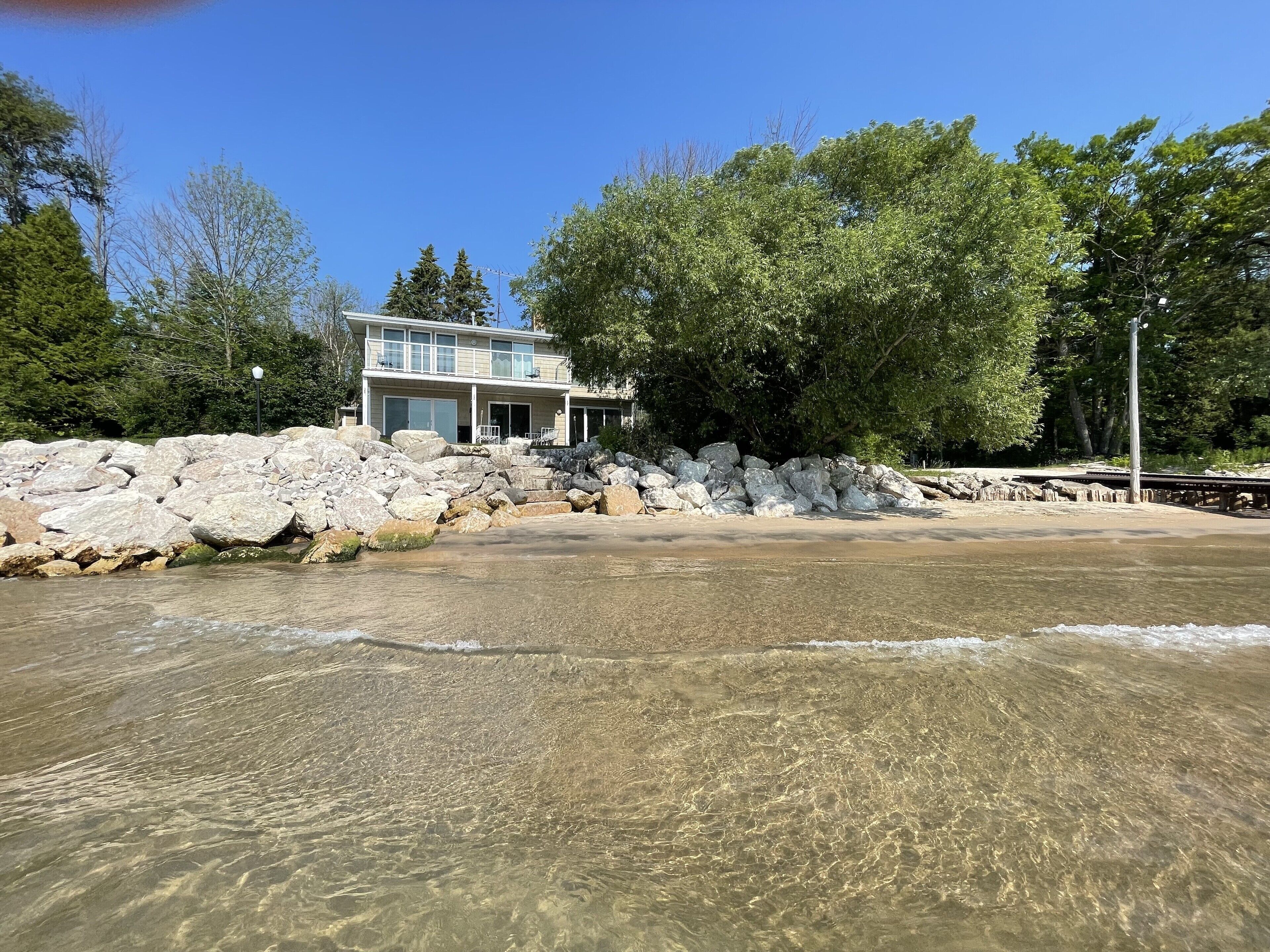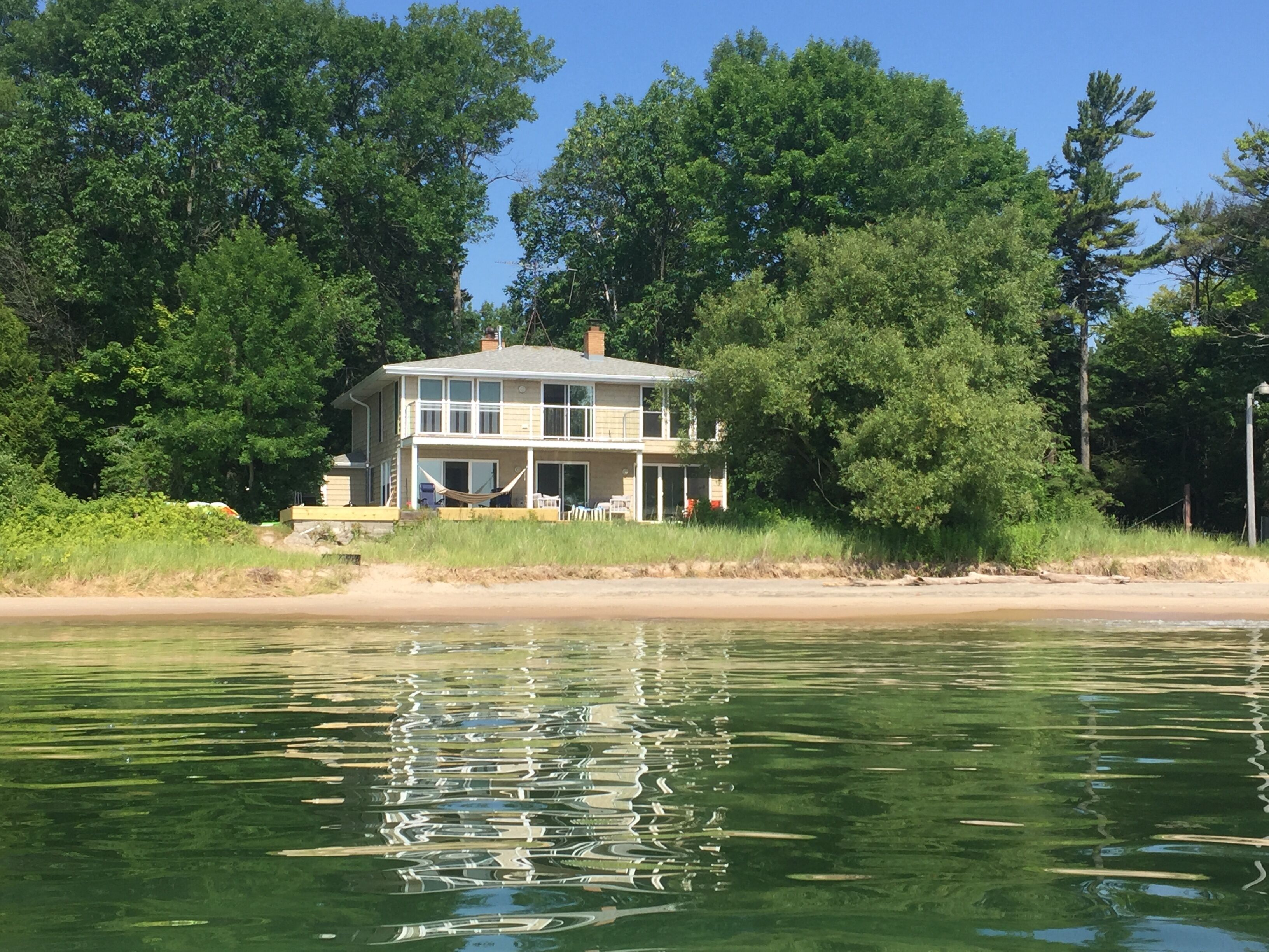 Newly Remodeled Beachfront Home This 6 bedroom, gut-remodeled home was designed to provide comfort and privacy with families in mind. With 3 completely separate two-bedroom suites (each with their own private bathroom) this house was laid out for large, extended family vacations or three families that enjoy vacationing together! Everything in this house is completely new. From the furniture and fixtures, down to the linens and kitchen; you'll find everything to be crisp, clean and new! Each suite has a king bed in one bedroom and two twin beds in the adjacent bedrooms. The 10ft dining room table easily seats 12 or more people. Walk right out from the living room to the large patio that overlooks the lake, or walk a few more steps down to the beach and enjoy the sand and surf. With an extra large lot and privacy in either direction, you will love the peaceful tranquility of life on the lake.