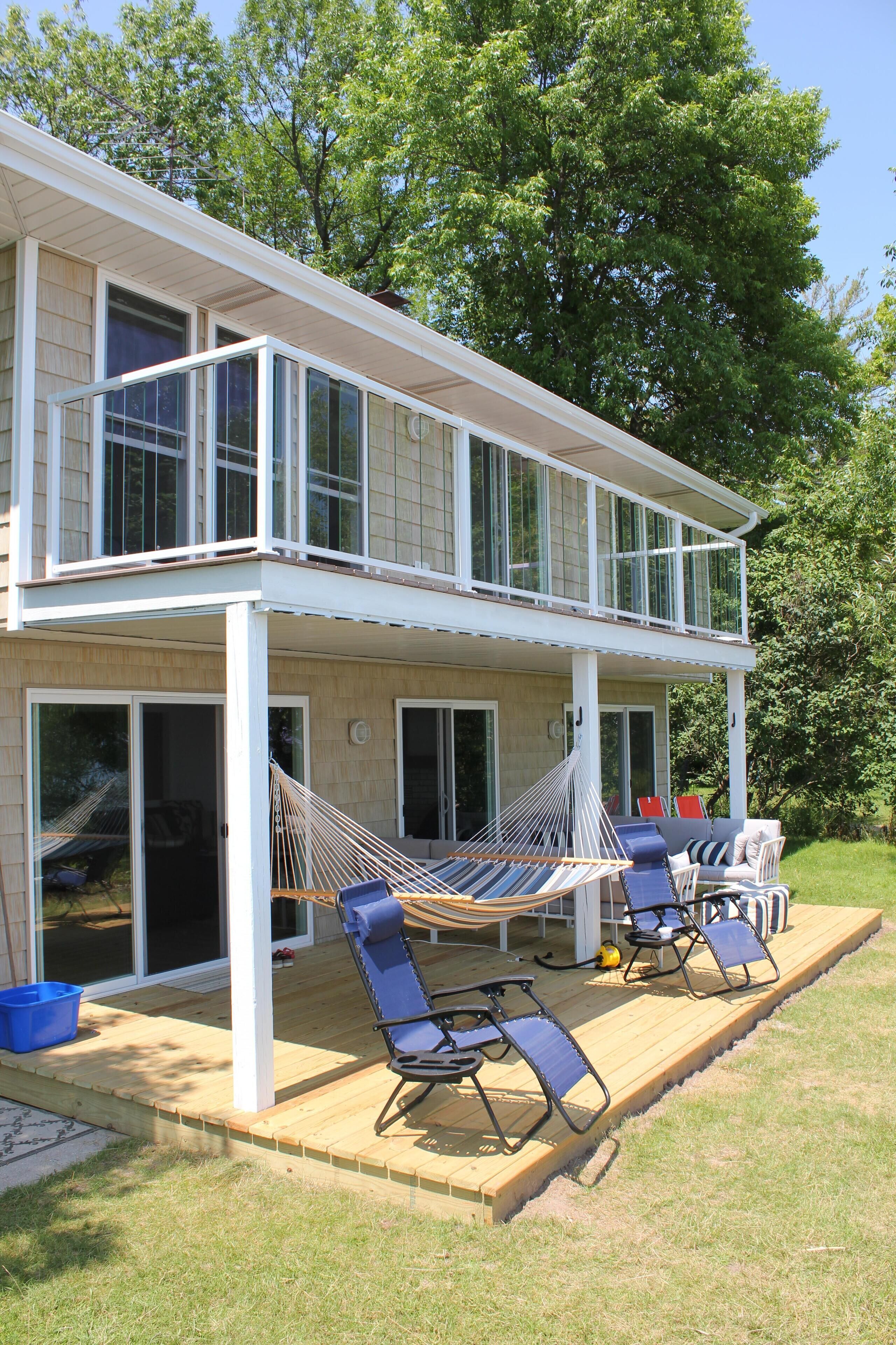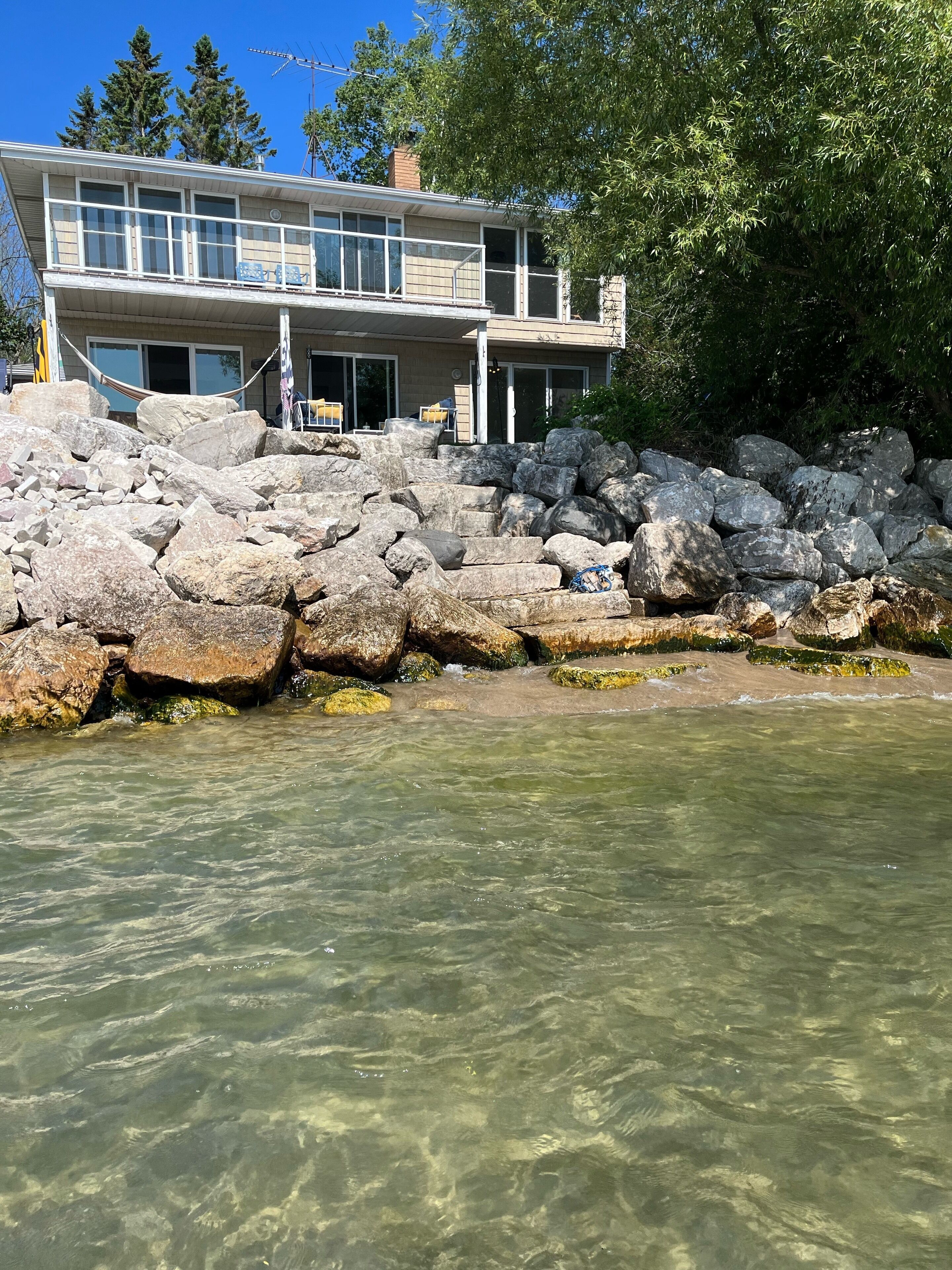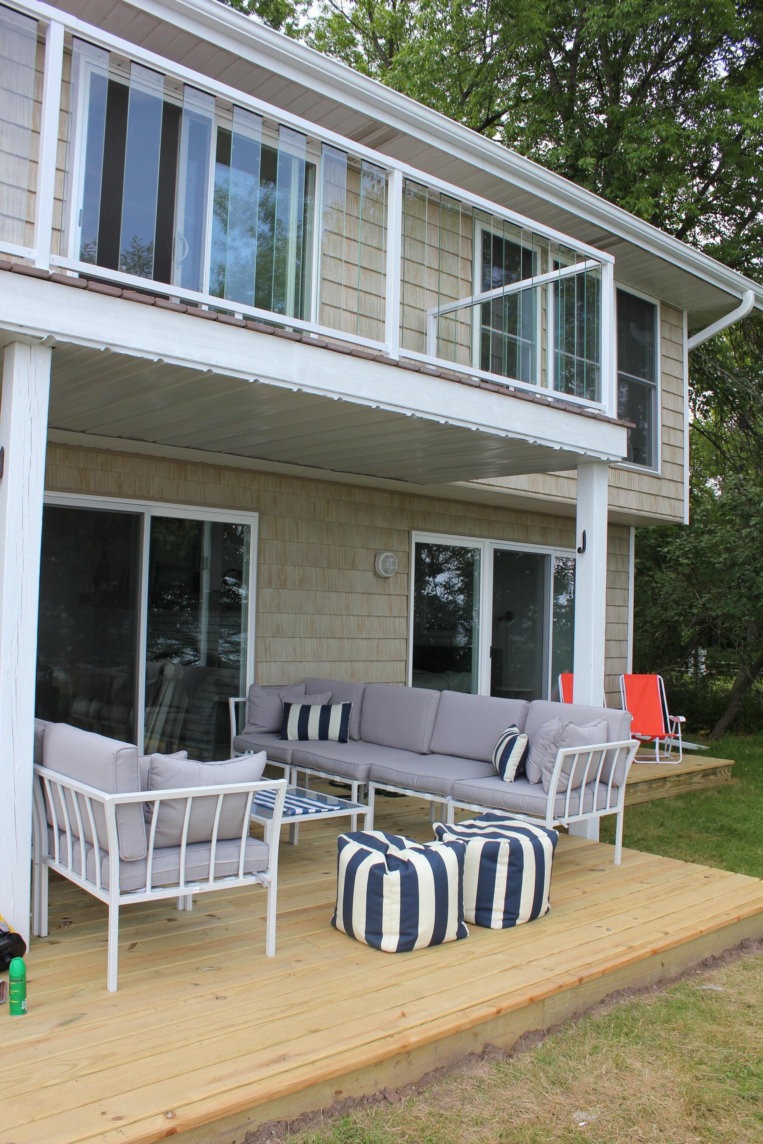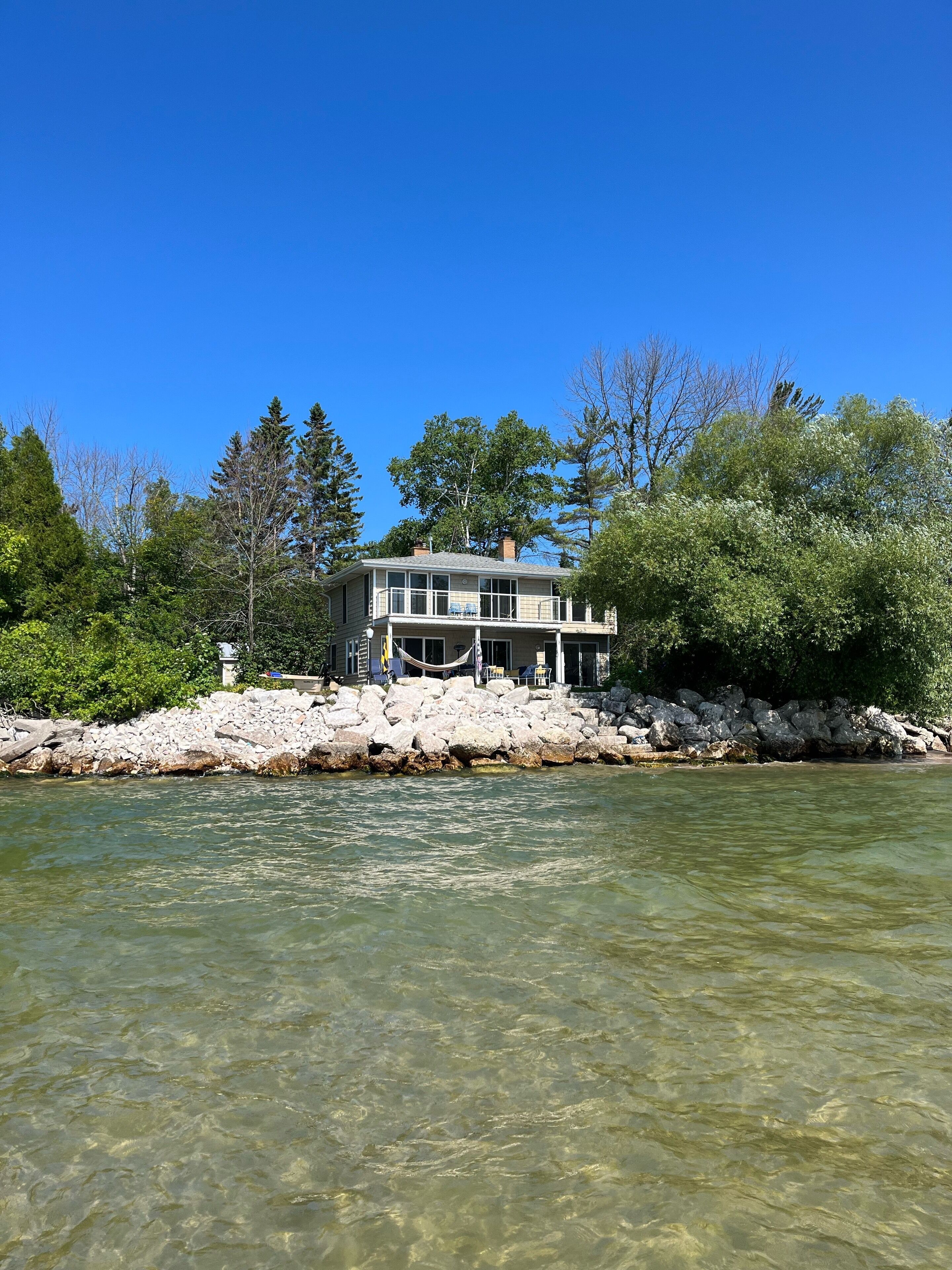 Newly Remodeled Beachfront Home This 6 bedroom, gut-remodeled home was designed to provide comfort and privacy with families in mind. With 3 completely separate two-bedroom suites (each with their own private bathroom) this house was laid out for large, extended family vacations or three families that enjoy vacationing together! Everything in this house is completely new. From the furniture and fixtures, down to the linens and kitchen; you'll find everything to be crisp, clean and new! Each suite has a king bed in one bedroom and two twin beds in the adjacent bedrooms. The 10ft dining room table easily seats 12 or more people. Walk right out from the living room to the large patio that overlooks the lake, or walk a few more steps down to the beach and enjoy the sand and surf. With an extra large lot and privacy in either direction, you will love the peaceful tranquility of life on the lake.