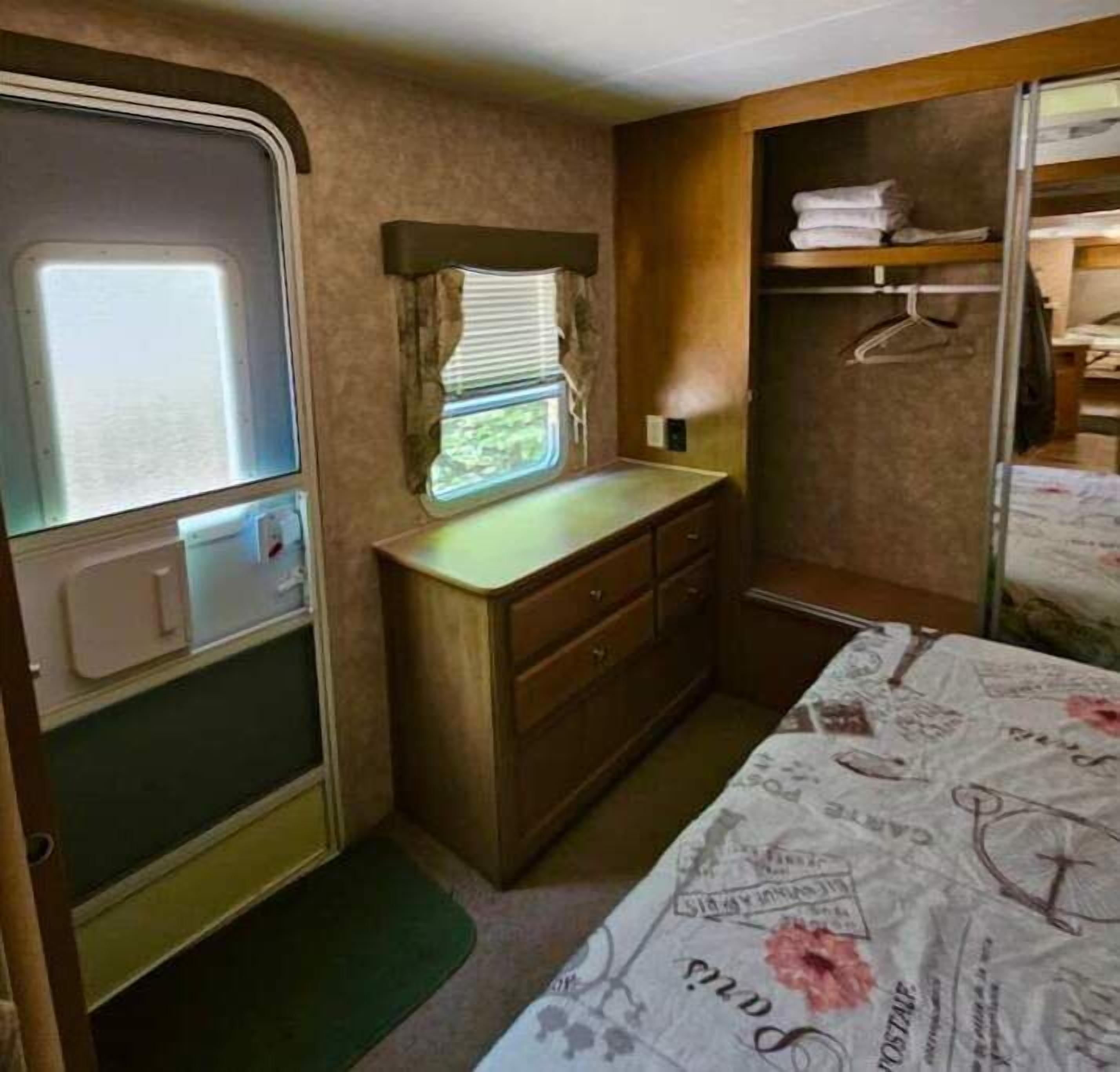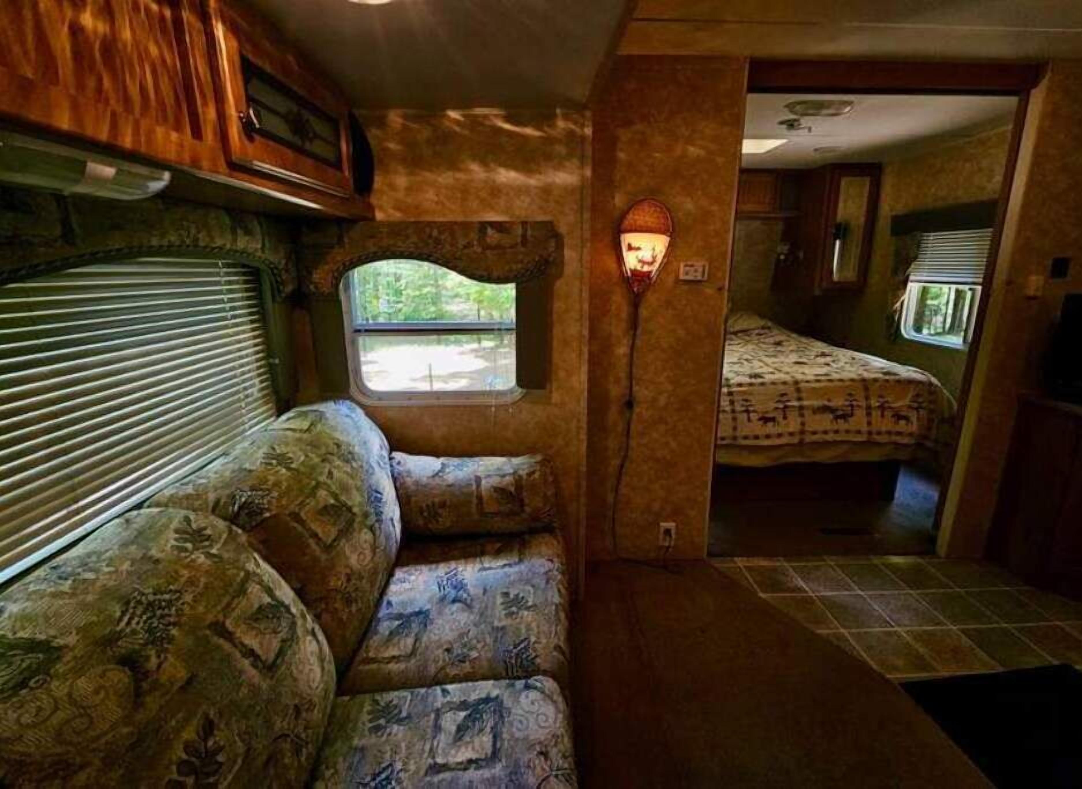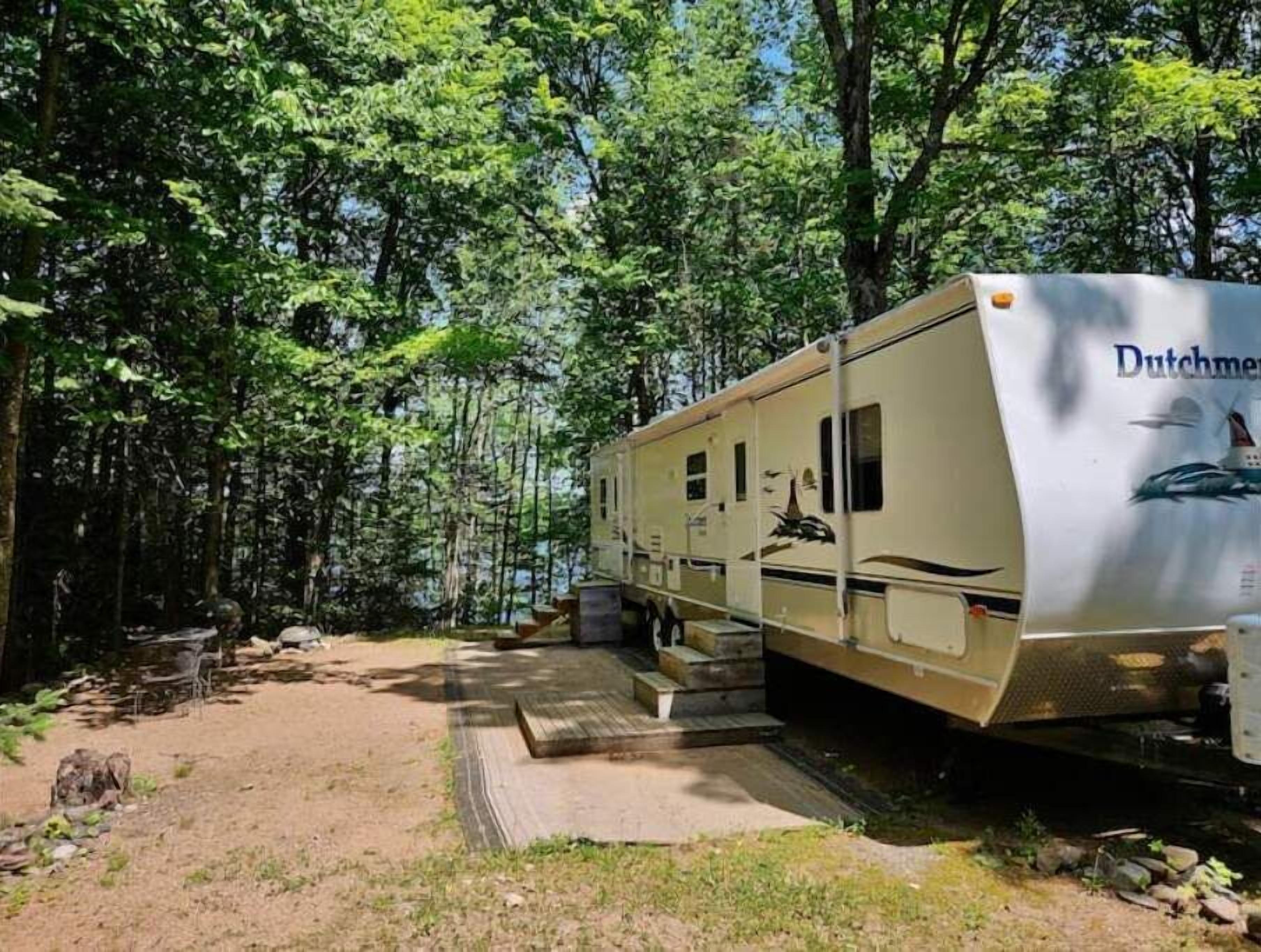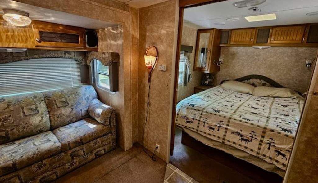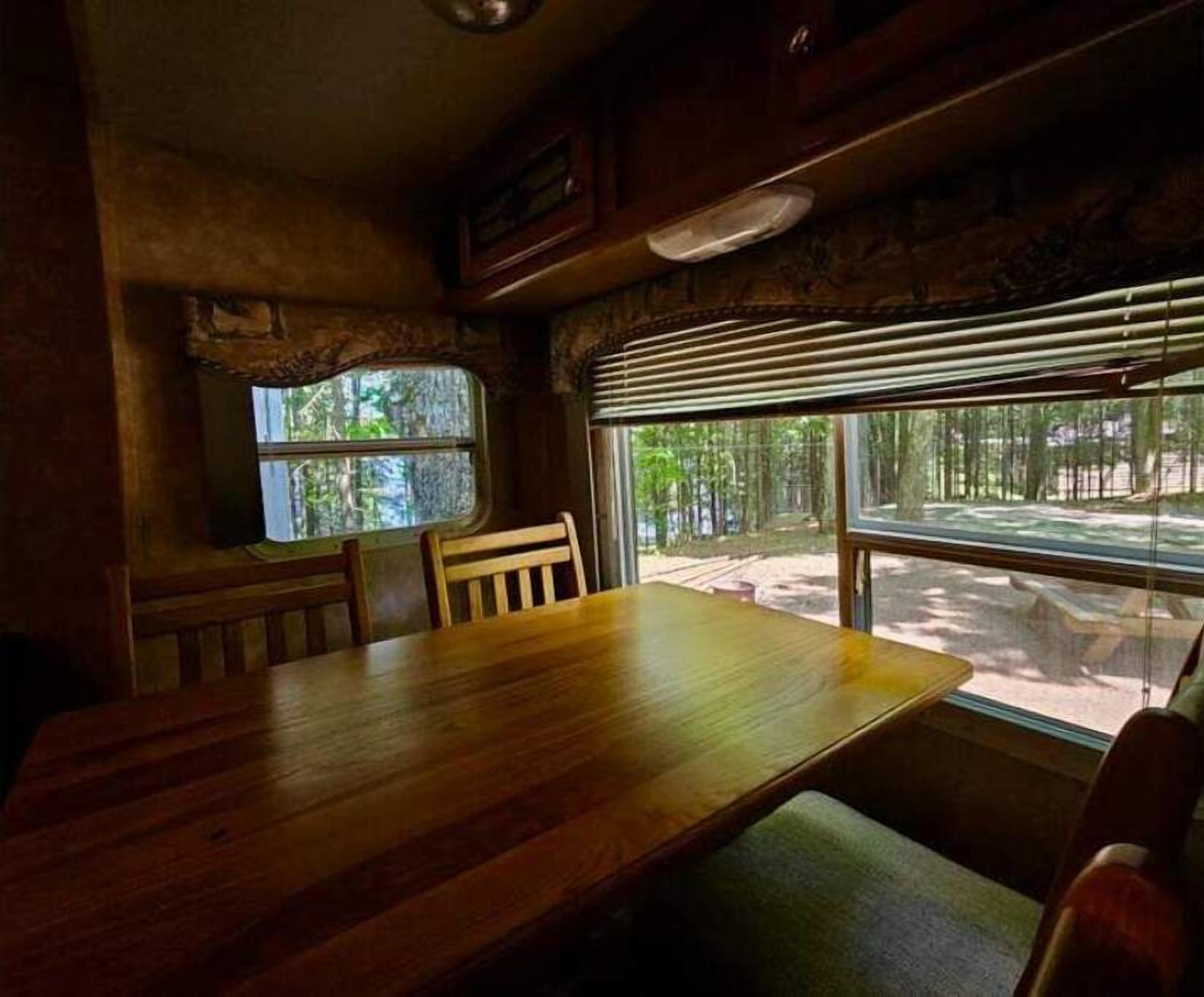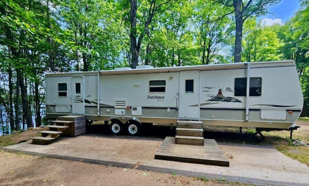 The Dutchman - Presque Isle Campground #3 This clean, spacious 38 ft Dutchman camper has two private bedrooms plus a sofa which converts in to a bed sleeping a total of 6 adults. Two slide-outs result in an open floorplan. The kitchen is well-furnished with plenty of room. In the dining area there is a table seating 4 plus an additional 2 stools at the kitchen bar countertop. The camper has air conditioning and two entry doors. It sits on a large campsite with a fire pit and picnic table. Linens provided.