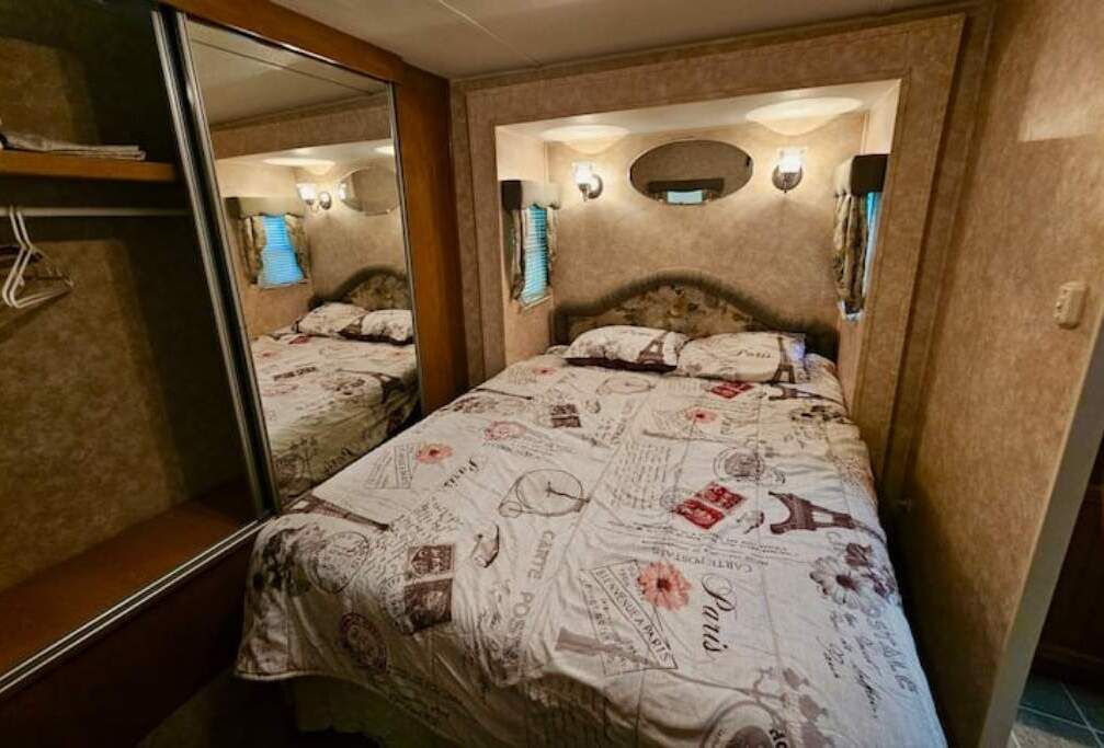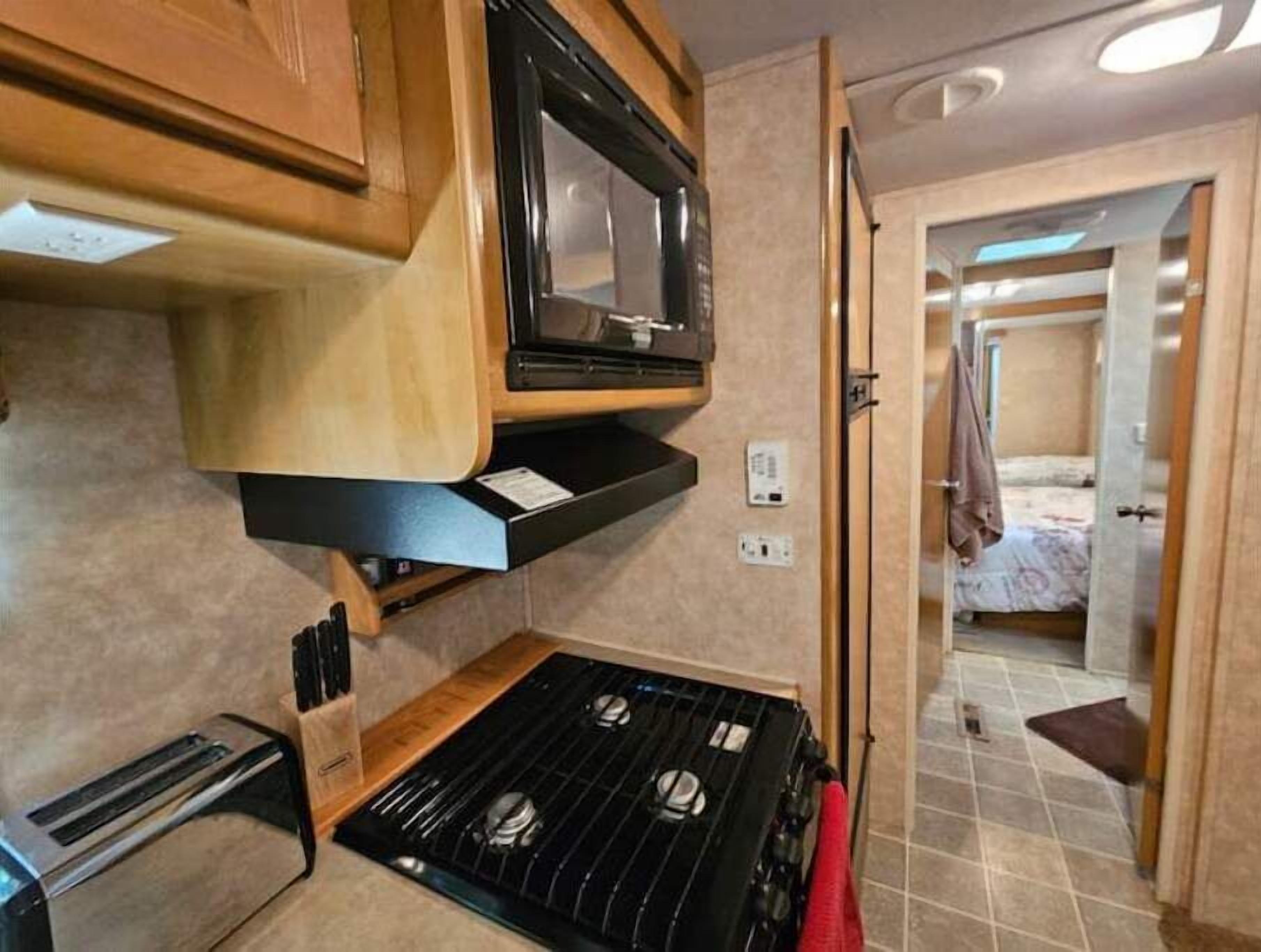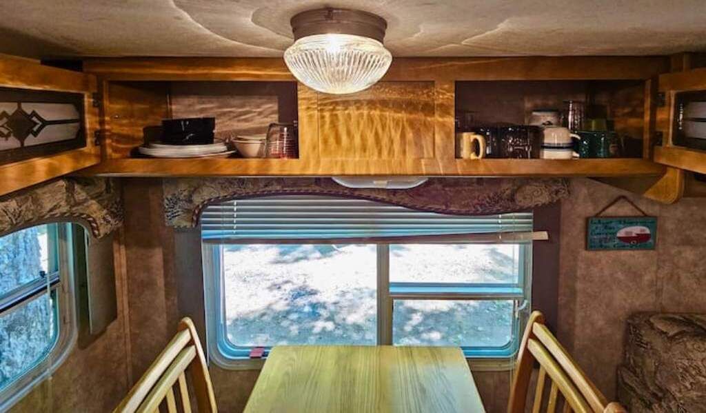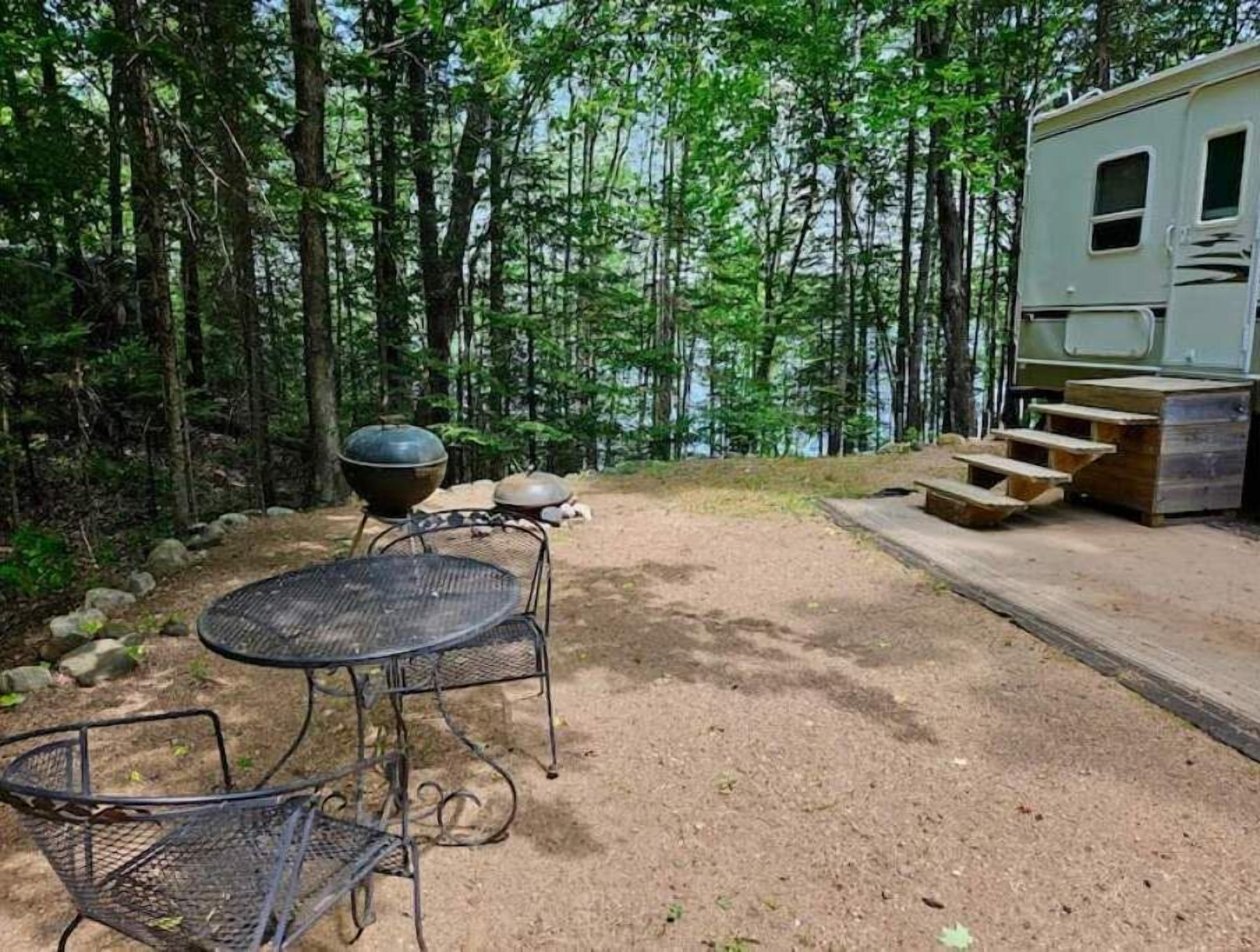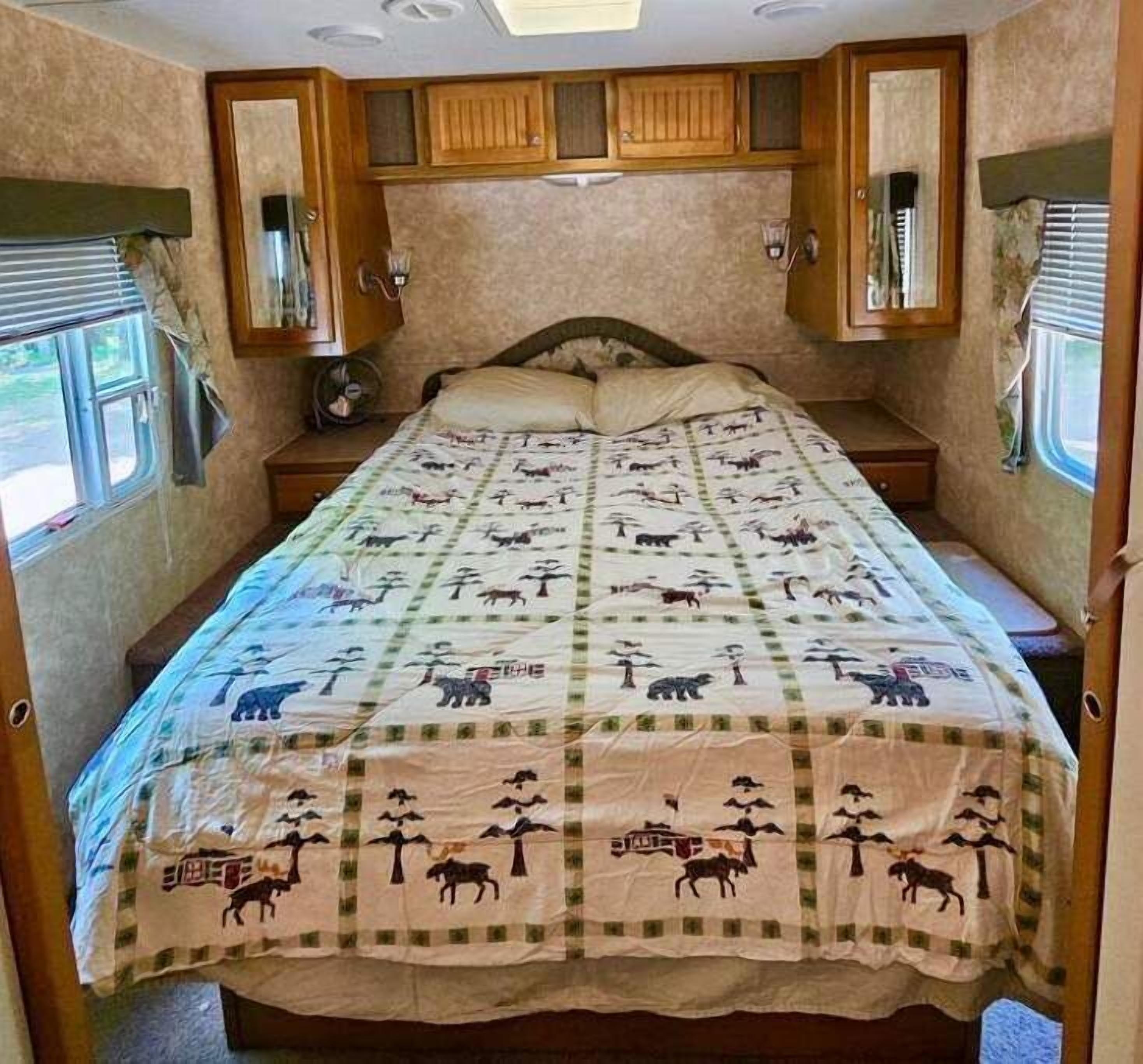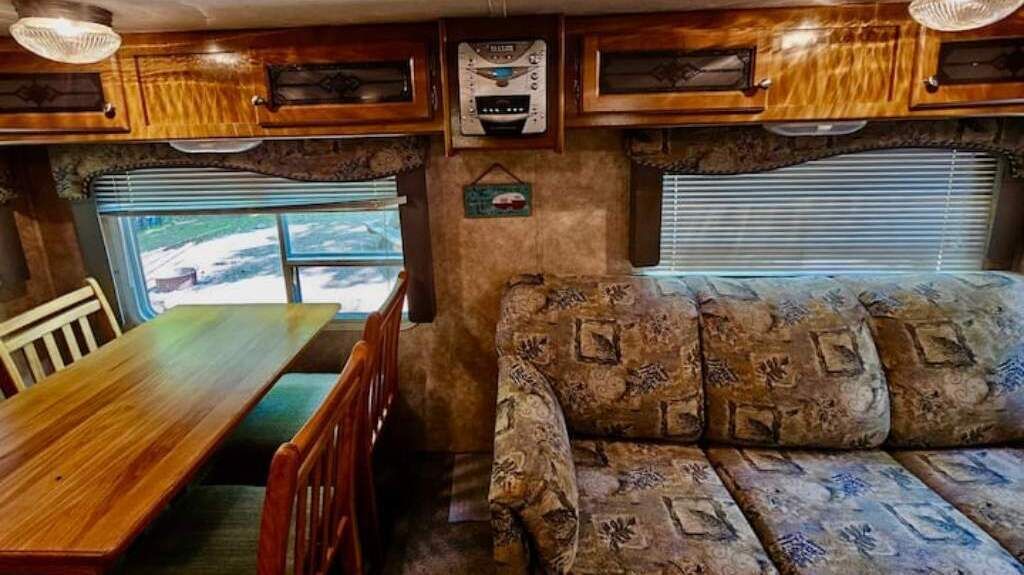 The Dutchman - Presque Isle Campground #3 This clean, spacious 38 ft Dutchman camper has two private bedrooms plus a sofa which converts in to a bed sleeping a total of 6 adults. Two slide-outs result in an open floorplan. The kitchen is well-furnished with plenty of room. In the dining area there is a table seating 4 plus an additional 2 stools at the kitchen bar countertop. The camper has air conditioning and two entry doors. It sits on a large campsite with a fire pit and picnic table. Linens provided.