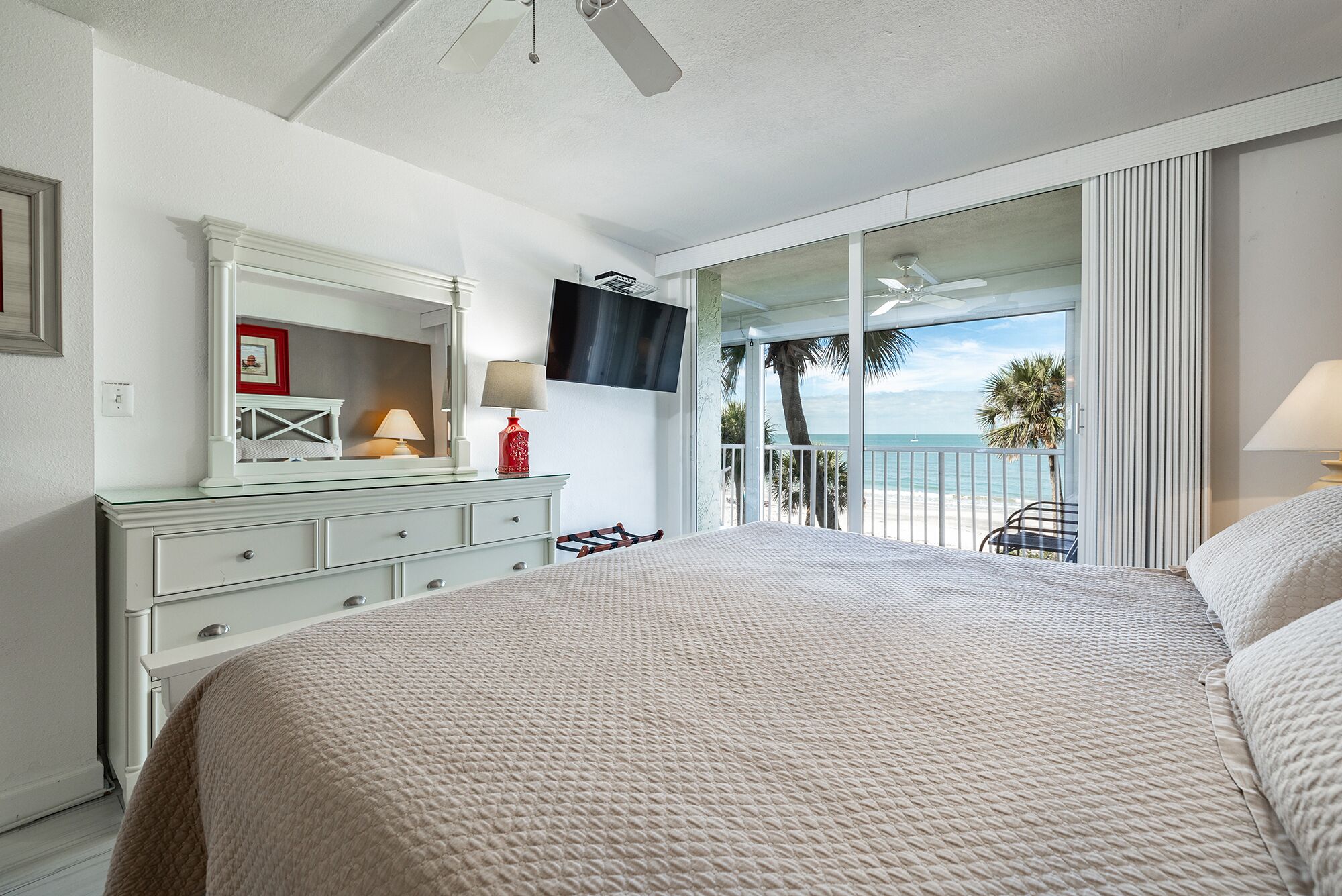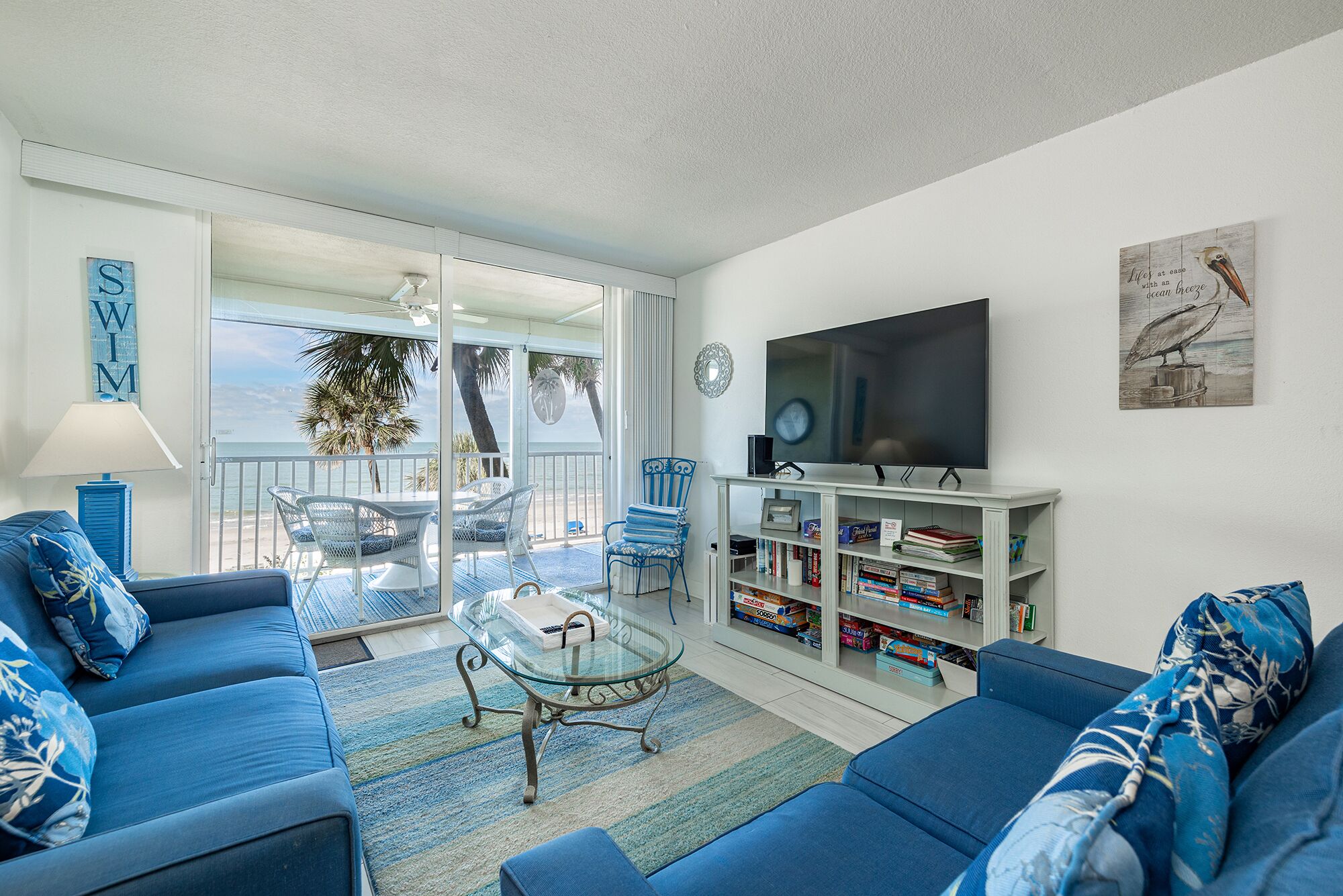 Direct Beachfront! Renovated! Amazing Views! SEE REVIEWS! CLEAN! SandCastle1 407 Condo, 3 Bedrooms, 2 Baths, (Sleeps 6)Our condo is a Saturday to Saturday rental See our virtual tour here: Copy and paste this: https://mls.immoviewer.com/portal/tour/1827319?accessKey=5e33The view from the extra large balcony located on the 4th floor will take your breath away whether from the living room or Master Bedroom. Watch the brilliant gulf waters with dolphins playing in plain sight and the white sand beach. Wake every morning with the sunrise streaming in the bedrooms overlooking the Inter-coastal and enjoy the quiet sunset dinners from the table for 4 and wicker seating while enjoying the breeze from the 2 ceiling fans outside on the balcony. You will feel like you are in tropical paradise with palm trees in every view.Upgraded beachfront condo with all the amenities of home. Master bedroom with King bed, 43" flatscreen TV and ensuite master bath. Second bedroom with 2 NEW Queen beds and 43" flatscreen TV Third bedroom with a Queen bed, 33" flatscreen TV.Entertainment center in living room with 55' HD Flatscreen TV, DVD player and IPAD / IPOD Compatible Stereo. Entertainment center includes a number of books and board games for your enjoyment!New open kitchen with granite countertops. Master and 2nd bathroom also updated with granite countertops. Newly painted throughout. CLEAN CLEAN CLEAN!!!New tile flooring and trim throughout and glass front door to brighten up the condo and provide cross breeze.Free wireless internet!This unit has access to two elevators! One covered parking space near the elevator comes with the unit!You won't find grounds like this anywhere on the gulf - beautiful gardens, fantastic heated outdoor pool and hot tub right on the beach, recreation room with ping pong table, foosball and library.Whether you are looking for a romantic getaway or spending a vacation with your family, this is the perfect location. Kids of all ages will find this to be the perfect spot. Whether young children want to build sand castles and body surf in the warm Gulf waters or swim in the clean warm waters of the very large swimming pool, they wont be disappointed. For sports enthusiasts, you can enjoy watching events on the 55' HD TV or travel a short distance to professional sporting events such as Major League Baseball, Basketball or Hockey games.If dining out is your favorite sport, the area is perfect for enjoying every type of cuisine you can imagine including many outdoor restaurants providing you with the true 'Florida' experience. Right across the street is 'The Pub' with dining and drinks right on the Intercoastal. You can watch the many watercraft using the Intercoastal or rent your own next door to 'The Pub'. Scooters and bikes also available.For shoppers, the choices are endless within a short drive.Finally, for those looking for nightlife, clubbing in Clearwater is only 15 minutes away. You can ride the Beach Trolley to Clearwater to the north or St. Pete Beach to the south or make the 35 minute drive into Tampa.Keywords: Condo, Indian Shores, Florida, Sand Castle 1, Heated Pool, Direct Beachfront, Gulf of Mexico, West Central Florida, Close to Clearwater, St. Pete, Tampa and only 90 minutes to Orlando, Disney, Universal, covered parking, beachfront, beach, gulf, sauna,sand castle,pool,updated,large balcony,condominium,apartment,near,tampa,orlando,disney,sea world, busch gardens,universal,grill,indian rocks,redington,33785,seasonal,rental,weekly,indoor laundry,3 bedroom,