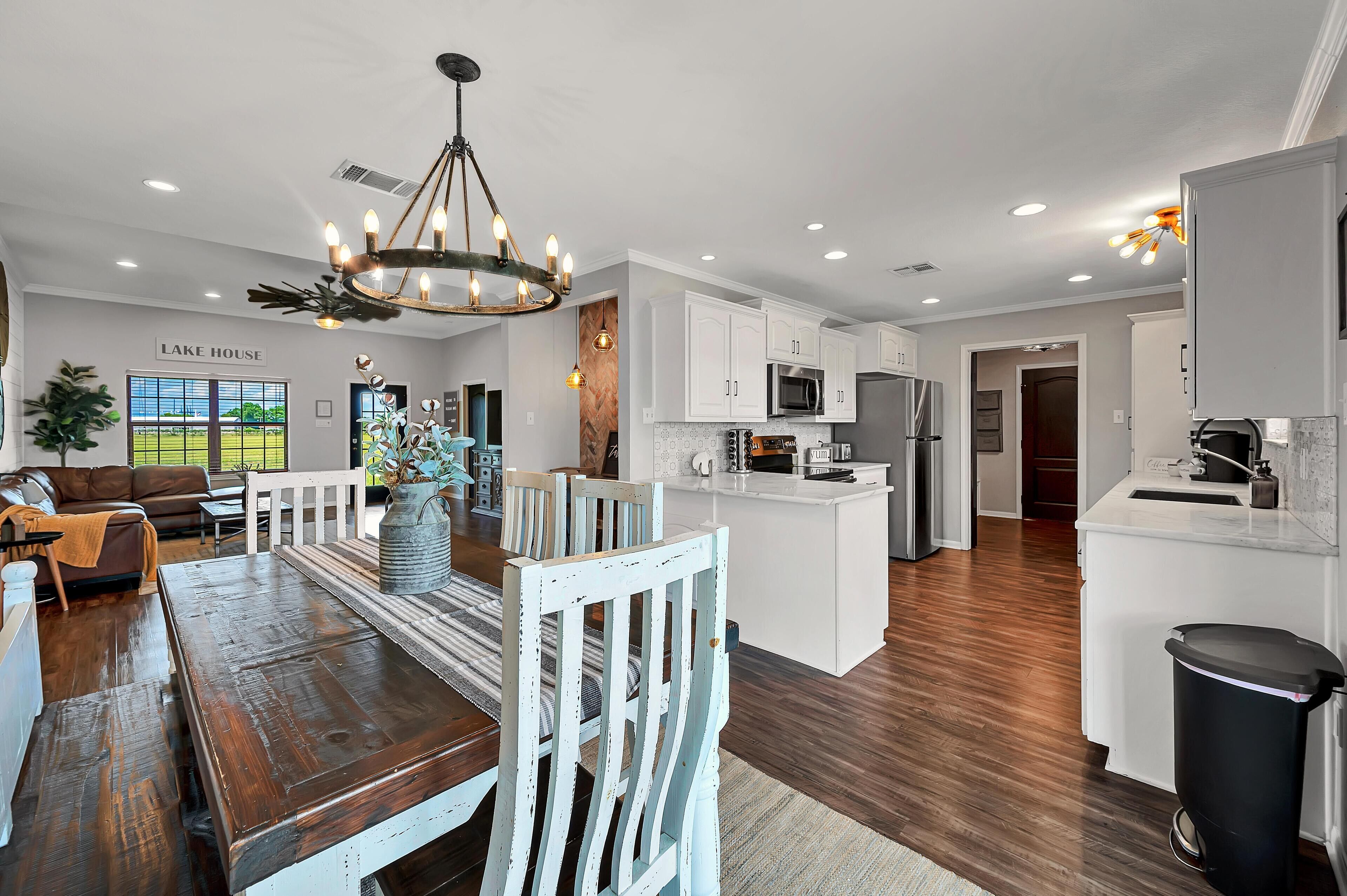 Tallulah Ann’s - Lakehouse Close proximity to Magnolia Silos, Magnolia Table, Baylor University, and everything else Waco has to offer. Enjoy fishing, kayaking, tubing (no recreational lake equipment is provided), and spectacular sunset at Tallulah Ann's. This unique vacation getaway will be a place you can share and enjoy with your family year after year on a gorgeous private lake that has a 20' X 13' dock. Great for fishing and enjoying the sunrise and sunset.Don't let the lack of reviews for this newly listed beautiful home keep you from booking. It is one of the nicest and most appealing properties we manage. I wouldn't hesitate booking for my own family or friends. It has everything you need to enjoy a wonderful stay.Donnie K. HallD&L Vacation RentalsThe home has been remodeled with beautiful finishings including carrara marble countertops, shiplap accented walls in every room, a fun and unique bunk room, office nook, open-concept kitchen/living/dining, stainless steel appliances, secluded master suite, huge front porch the length of the home, covered back patio, and much more.Sleeps 10 including 2 roll out bedsRoom 1 includes 1 queenRoom 2 is a bunk room with 4 twin bedsRoom 3 includes a kingGuests have access to entire property with the exception of one locked closet.Other things to noteAbsolutely no pets allowed. If we see or find evidence of a pet at the property after your departure, a minimum $500 cleaning fee will be charged to your stay. The reason we have this rule in place is that some people are allergic to pet dander. Our guest health are a top priority. This rule will be strictly enforced.Living room has a smart TV with streaming apps available. No cable.We provide both a regular coffee machine, as well as a Keurig and pods.Guest are responsible for bringing their own charcoal and starter fluid for charcoal grill.Must be 21 or older to book.